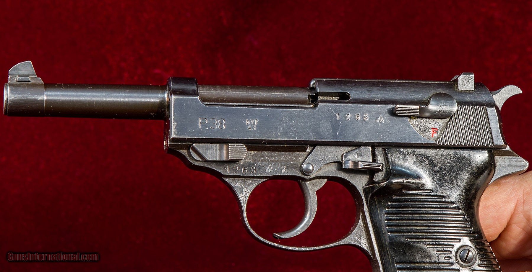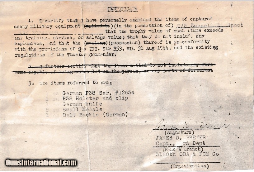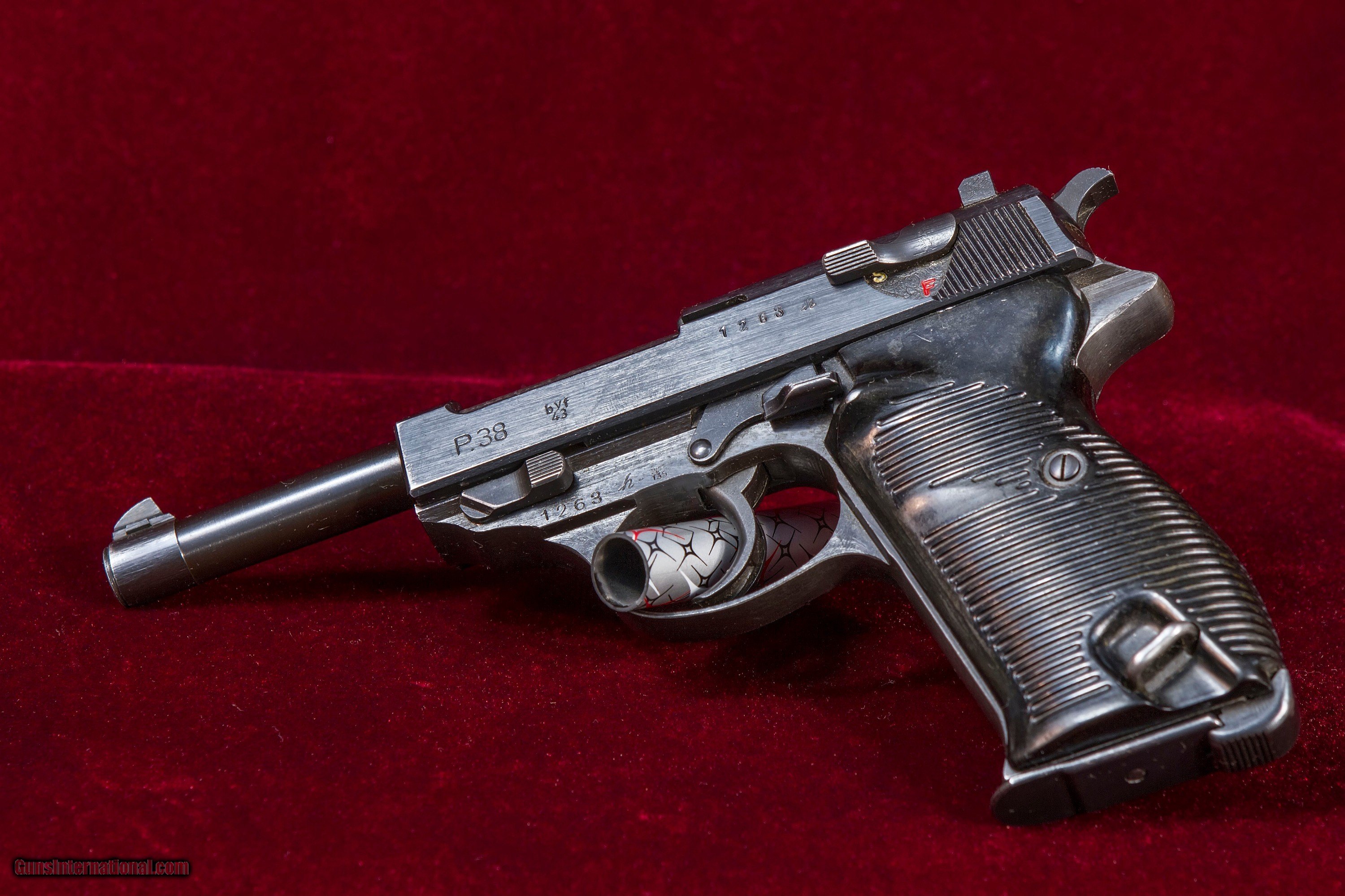 Description: 9 MM. SN: 1263 h. Second variation pistol w/ reinforcing hump at trigger pivot and shallow extractor cut. 4 ?” bbl. Right side of slide stamped w/ two eagle/135 proofs flanking an eagle/swastika military test proof. Matching serial number on frame, slide and barrel. Eagle/135 proofs also located on the left side of the frame and barrel lug. Brown bakelite grips. Proper magazines have eagle/359 proofed high on the spine and "P.38v" on left body. CONDITION: Excellent. Retains 90-95% original blue finish showing light edge and muzzle wear, with some thinning on the front grip frame strap. Crisp markings. Mechanically fine with bright strong bore. Accompanied by a very rare LEDERFABRIK NEUNER black hardshell holster w/ “9 in Oakleaf” /1943 logo, WaA 938 waffenamt and matching spare magazine. Inside flap is inscribed with G.I.’s name and postwar stateside address. Holster is excellent with only minor rubs at edges. Stitching is intact and sound. Unmarked black leather belt (approx 102 cm) mounted w/ later pattern, unmarked, steel box construction Luftwaffe NCO-EM buckle w/soldered hooking bar is Very Good. PROVENANCE: Capture Certificate identifies T/5 Russell D. Smoot (610 Ordnance Battalion / 3160 Co) in possession of: German P38 Ser. #1263(4); P38 Holster and clip; Belt Buckle (German). Signed: Capt. James D. Brewer (3160 OBA & FMC Co). Fresh Estate Items have been in possession of direct descendants until their offering here. REDUCED $2295 SOLD Curio/Relic: Yes Handgun Caliber: 9x19mm Parabellum (9mm Luger, 9x19mm NATO) |