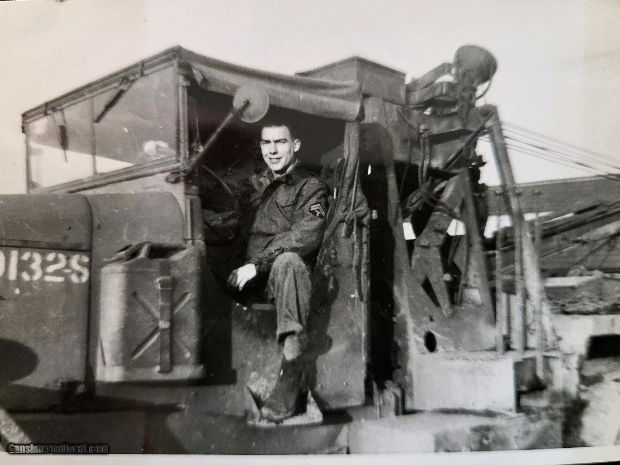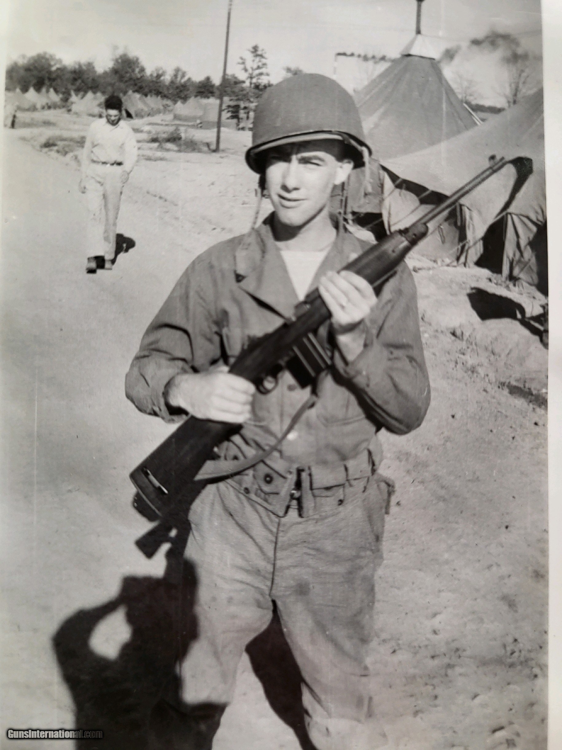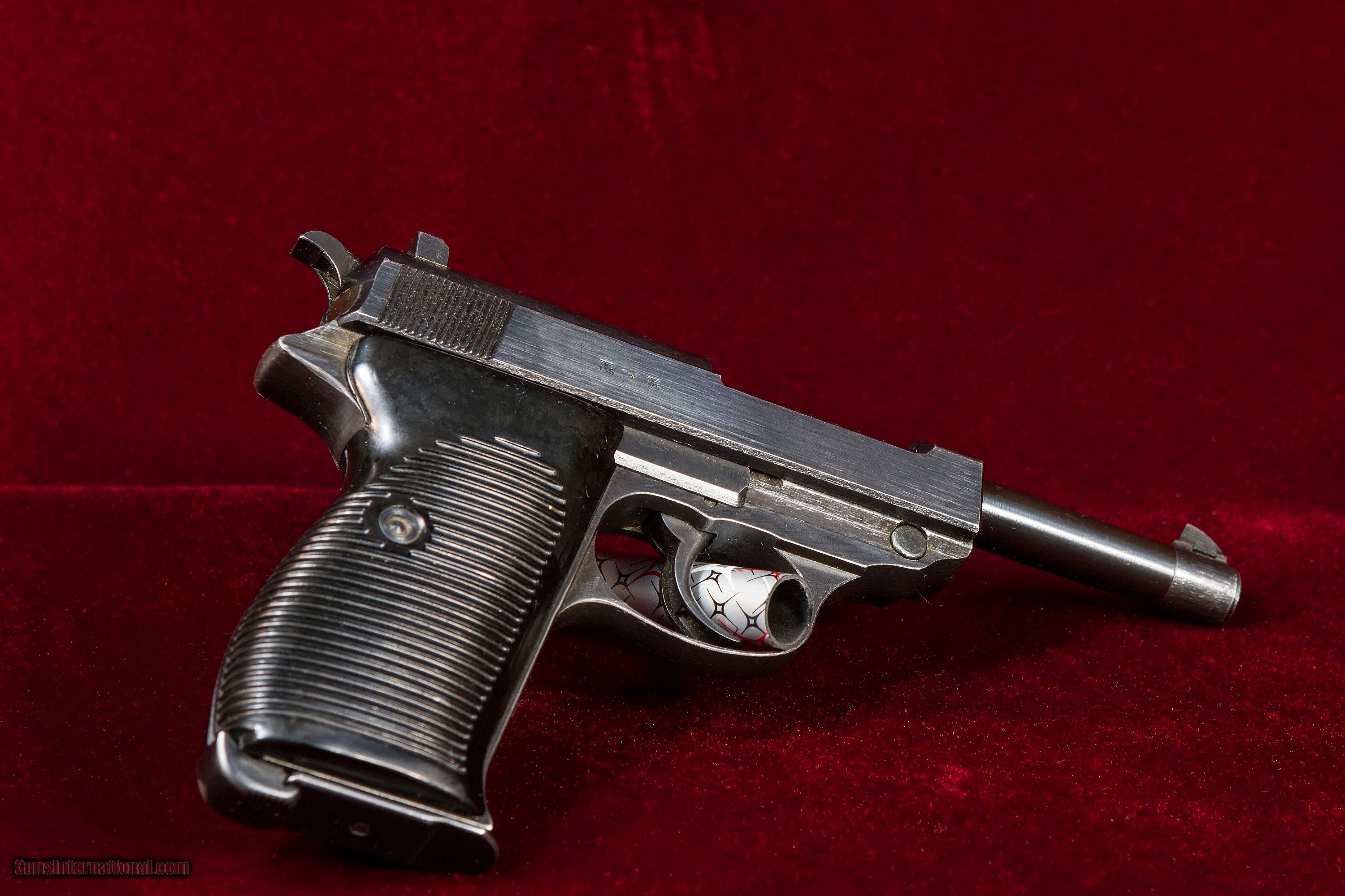 Description: 9 MM. SN: 1263 h. Second variation pistol w/ reinforcing hump at trigger pivot and shallow extractor cut. 4 ?” bbl. Right side of slide stamped w/ two eagle/135 proofs flanking an eagle/swastika military test proof. Matching serial number on frame, slide and barrel. Eagle/135 proofs also located on the left side of the frame and barrel lug. Brown bakelite grips. Proper magazines have eagle/359 proofed high on the spine and "P.38v" on left body. CONDITION: Excellent. Retains 90-95% original blue finish showing light edge and muzzle wear, with some thinning on the front grip frame strap. Crisp markings. Mechanically fine with bright strong bore. Accompanied by a very rare LEDERFABRIK NEUNER black hardshell holster w/ “9 in Oakleaf” /1943 logo, WaA 938 waffenamt and matching spare magazine. Inside flap is inscribed with G.I.’s name and postwar stateside address. Holster is excellent with only minor rubs at edges. Stitching is intact and sound. Unmarked black leather belt (approx 102 cm) mounted w/ later pattern, unmarked, steel box construction Luftwaffe NCO-EM buckle w/soldered hooking bar is Very Good. PROVENANCE: Capture Certificate identifies T/5 Russell D. Smoot (610 Ordnance Battalion / 3160 Co) in possession of: German P38 Ser. #1263(4); P38 Holster and clip; Belt Buckle (German). Signed: Capt. James D. Brewer (3160 OBA & FMC Co). Fresh Estate Items have been in possession of direct descendants until their offering here. REDUCED $2295 SOLD Curio/Relic: Yes Handgun Caliber: 9x19mm Parabellum (9mm Luger, 9x19mm NATO) |