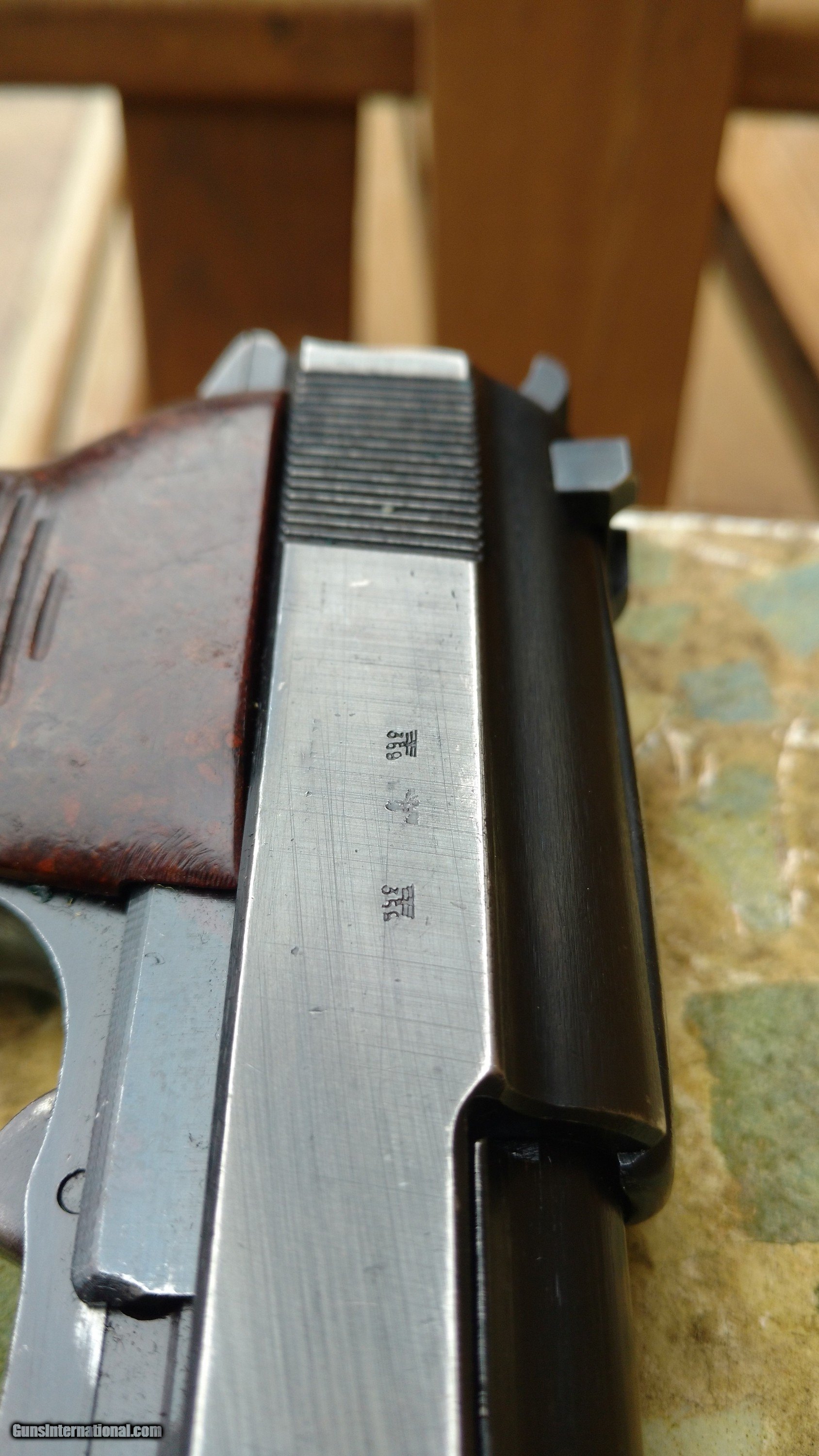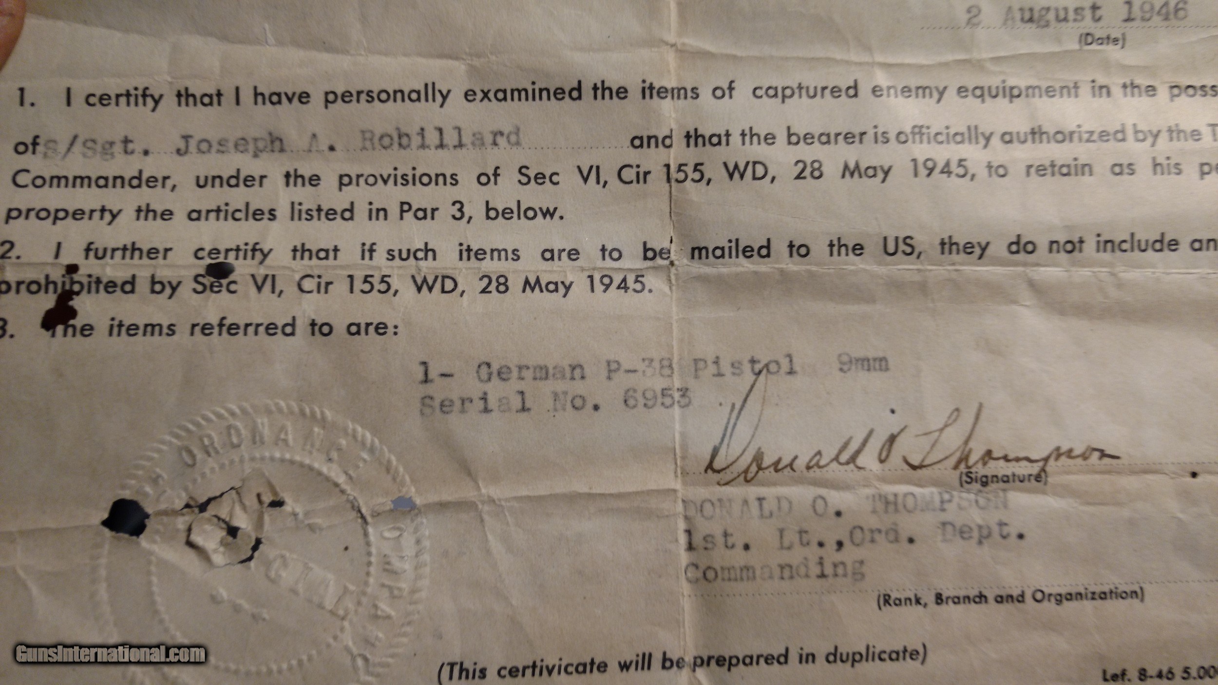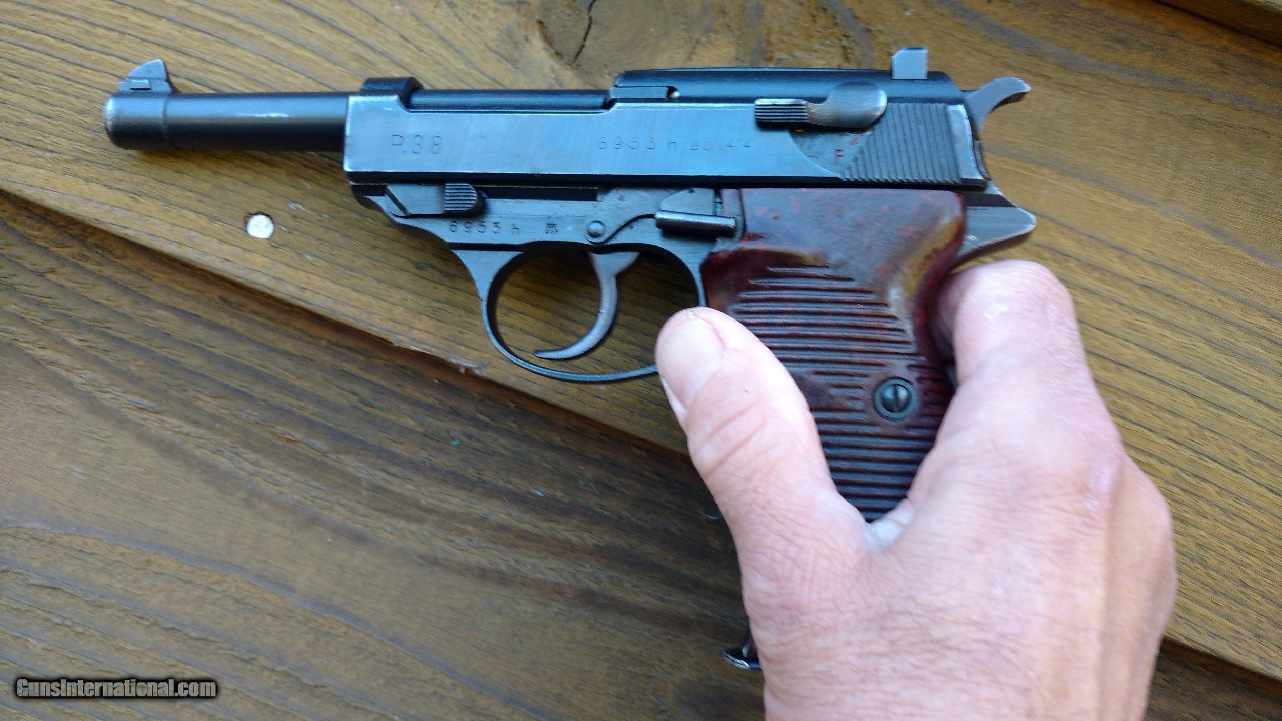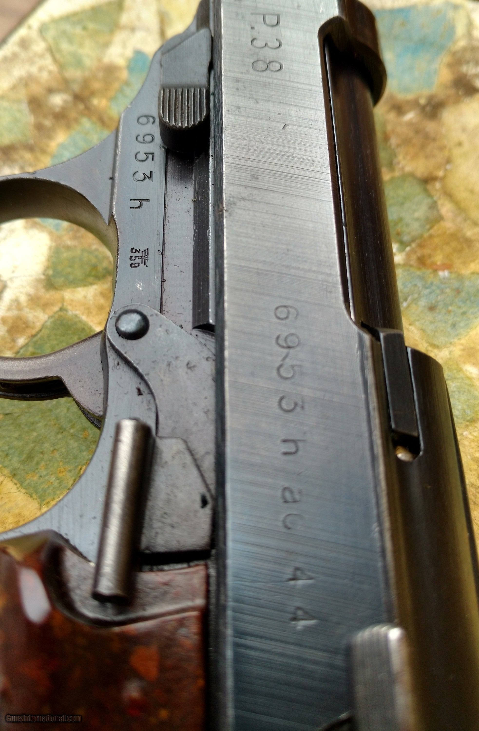 Description: WW2 P38 AC 44 serial number 6953h . Comes with Nazi Marked Original Holster Dated 43 with P38 markings and Nazi Inspector Markings. Also has original Capture Papers. Gun is in excellent original Condition . All numbers Match . Bore and Mechanics are excellent. 100 percent matching and correct Nazi Captured gun with Documention . Great piece of WW2 History .Please review my photos and email me with any questions ? 3 day Inspection. Thank you for looking , Little Jo SOLD Curio/Relic: Yes Serial Number: 6953h |