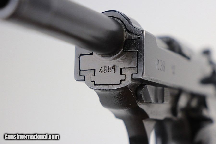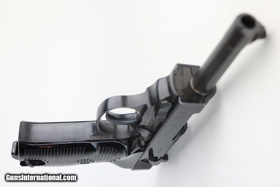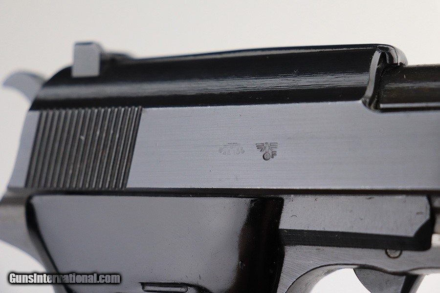 Description: This is a rare Mauser P.38 that was issued to the German Police in 1944. It's Eagle/F marked, one of only 1,500 produced. It's all matching numbers but the finish was re-done at some point as the pistol is all blued but these always featured dual-tone or phosphate finishes. It does not appear to be a dipped gun, however, as our magic cloth was unable to remove finish. The trigger spring is also in the white, but the locking block is blued, so a bit of an oddity. It's in great shape though, and fully functional. Excellent grips with only minor handling wear. Bore has a little frost in the grooves but shiny with strong rifling. Mauser magazine. SOLD Curio/Relic: Yes Handgun Caliber: 9x19mm Parabellum (9mm Luger, 9x19mm NATO) |