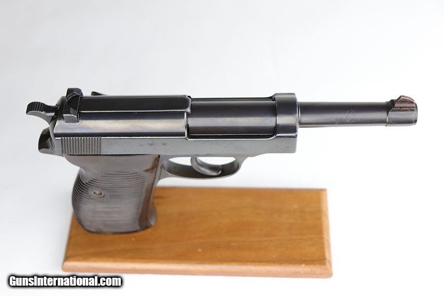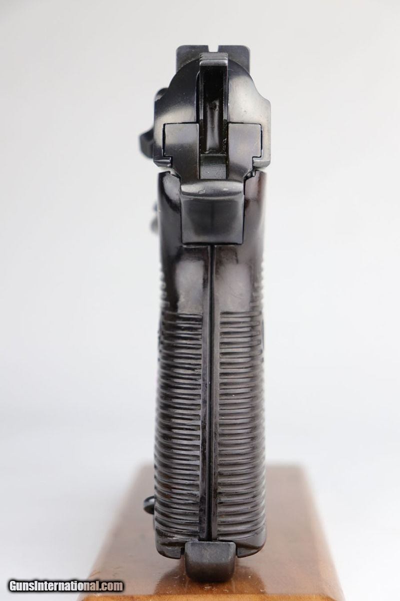 Description: This is an all matching example of a rare Walther P.38 with no date on slide. There were only about 2,600 of this variation produced, and in original condition can sell for $5000-6000. This finish was restored at some point, and there is some freckling under the finish. E/359 proofs on the grips and all parts aside from the firing pin cover. Bore has good rifling but some frost and freckling near the muzzle. Good mechanics, including de-cocker. SOLD Curio/Relic: Yes Manufacturer: Walther Model: P.38 Serial Number: 9825 Caliber Info: 9mm Condition: Restored Bore Condition: 7.5/10 Manufacture Date: ~1940 |