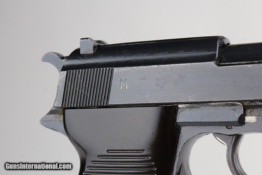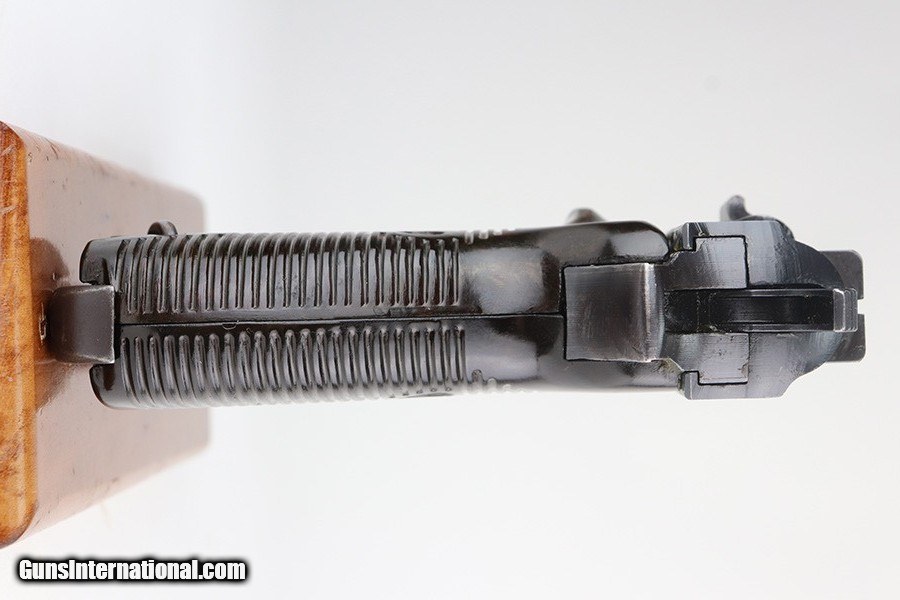 Description: This is an excellent example of a rare Spreewerk P.38, manufactured at the end of the war in 1945. This one is especially rare because it has a rare "ac 44" fn-made slide. The gun is all matching, but the waffen proofs have been peened. This is evidence the gun may have been reworked by the East German police after WW2. It has retained about 97% of its finish. Minor wear on the high edges of the slide and around the muzzle. Minor oxidation on the front strap. There are a few small areas of tiny pin-pricking here and there. Comes with nice grips and a period-correct magazine. The bore is mint. De-cocker is functional. SOLD Curio/Relic: Yes Handgun Caliber: 9x19mm Parabellum (9mm Luger, 9x19mm NATO) |