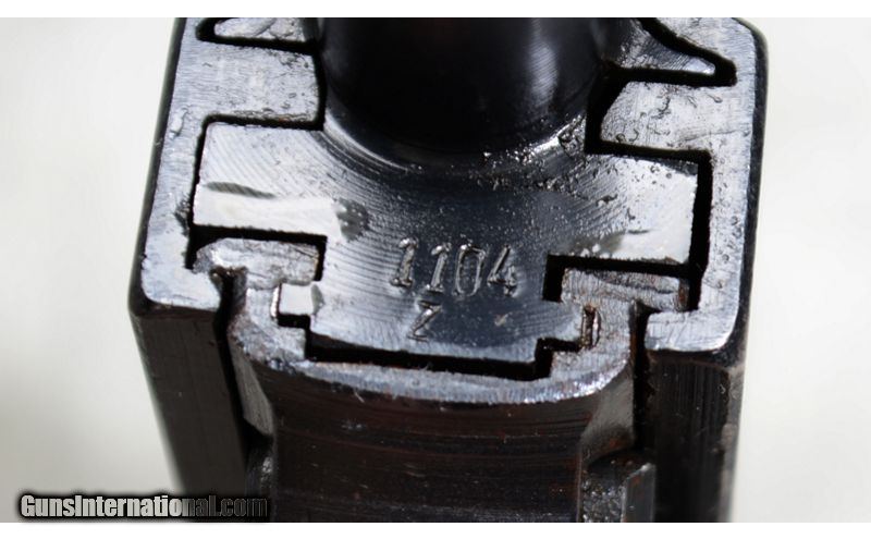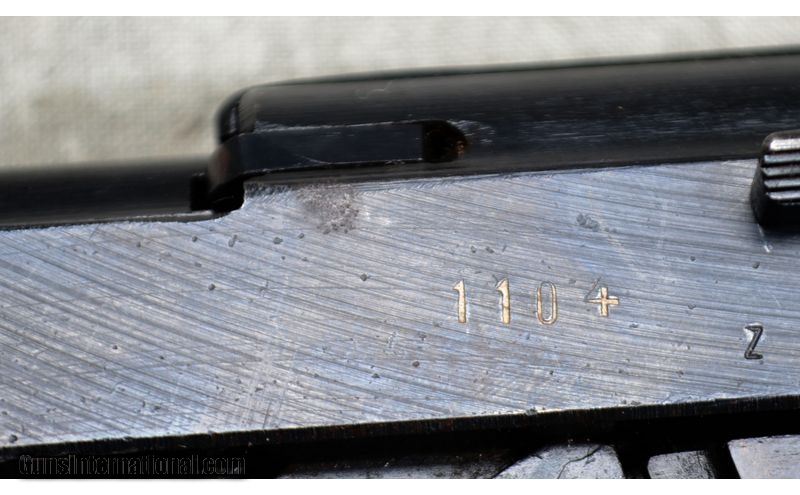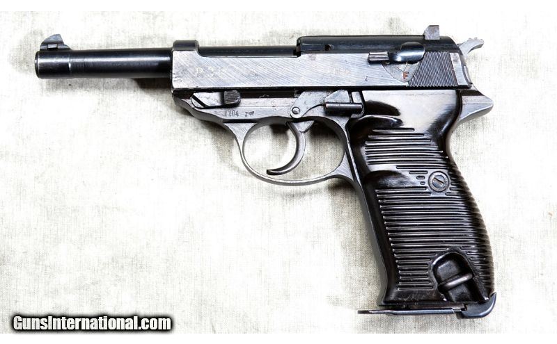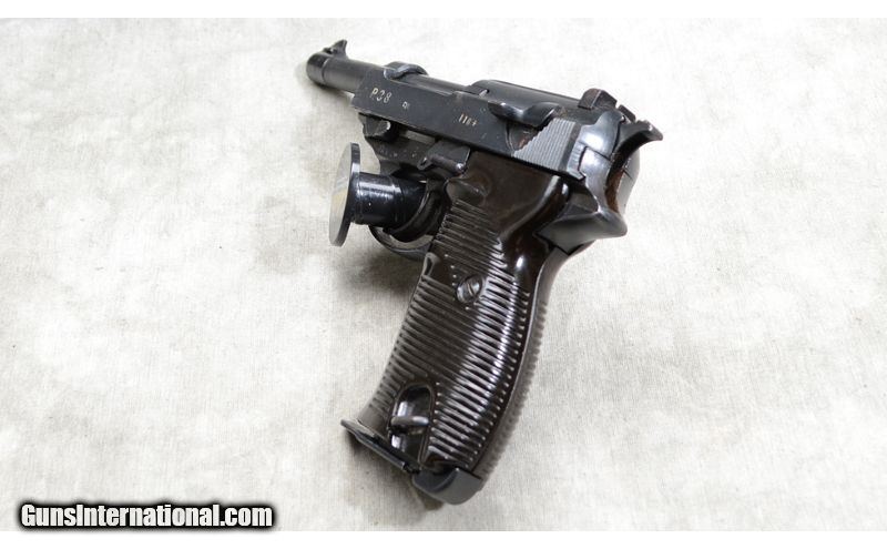 Description: This 1945 Spreewerk P38 features good maintenance, factory post and notch sights and trigger, plastic grips, five inch barrel and comes with one magazine. 9mm Luger SOLD Chambers: 7 + 1 capacity semiautomatic. Metal Condition: Very good to excellent. There is a small amount of bluing wear at the muzzle. Any defects on the rest of the gun could be attributed to the lowered quality standards in place at the end of WWII. Note the vise jaw marks on the slide in particular. Wood Condition: Very good. A few very light handling marks. Barrels: "5 inch - blue, with post sight. Triggers: Factory single/double action trigger. Sights: Fixed post and notch factory sights. Item Location: Rogers |