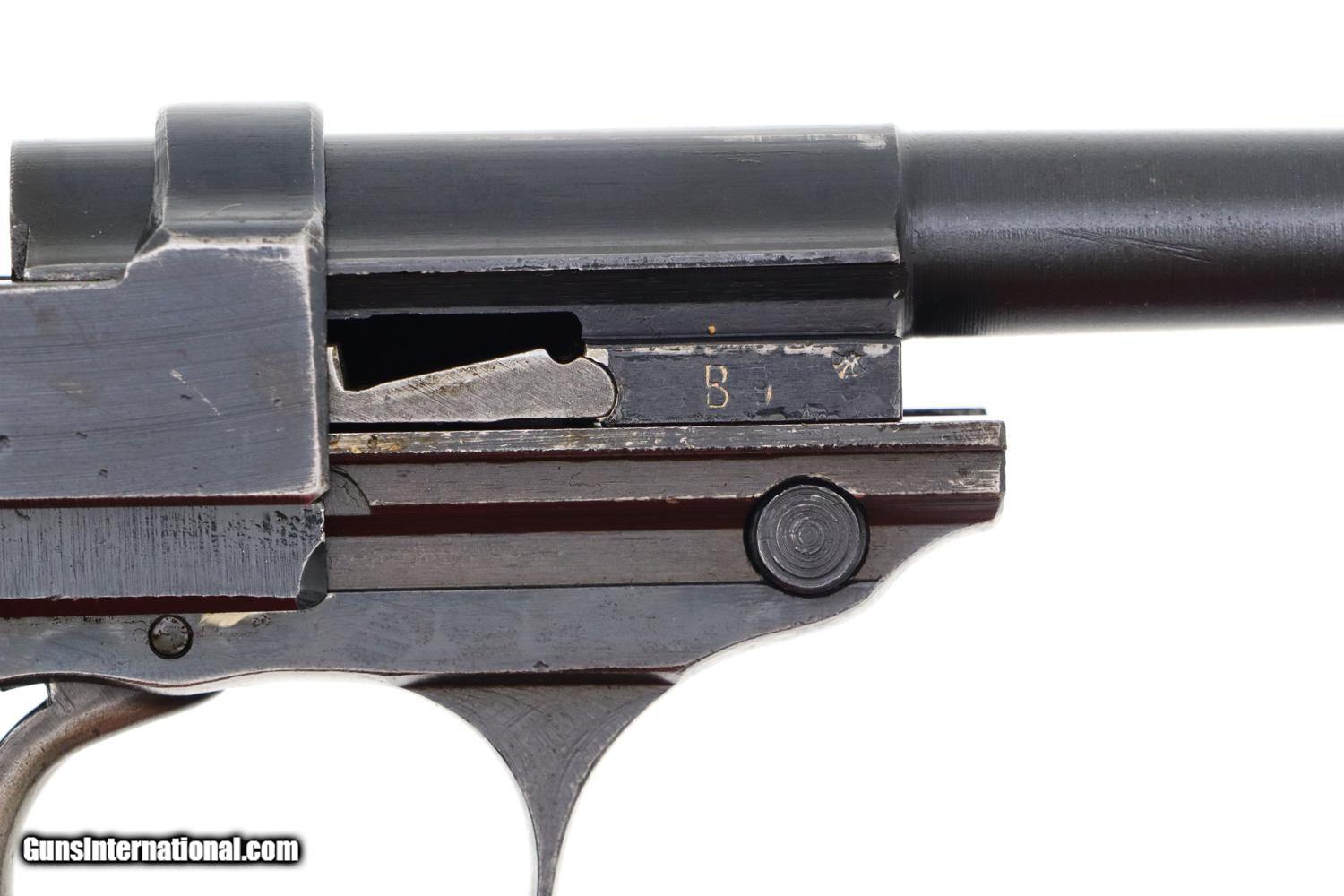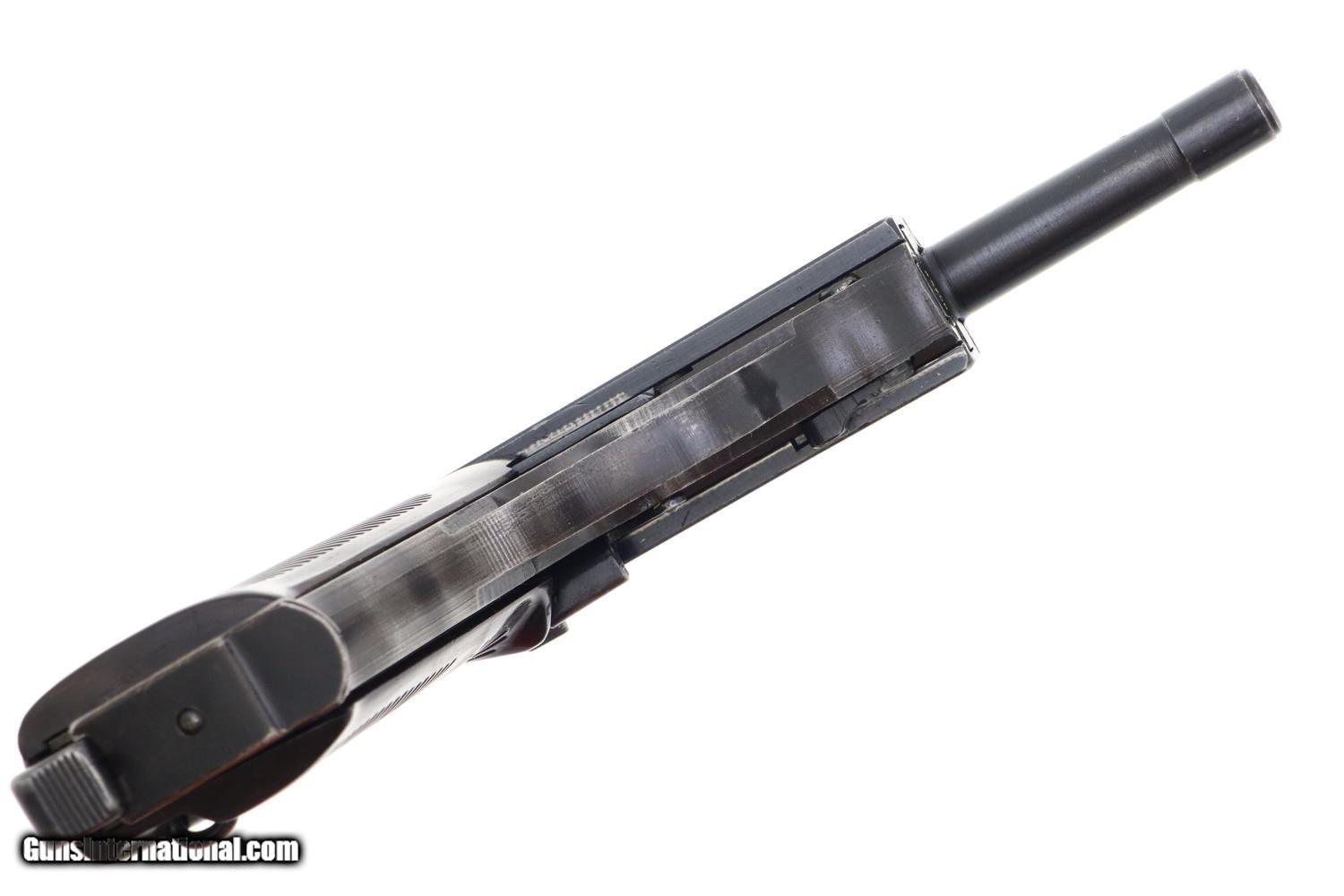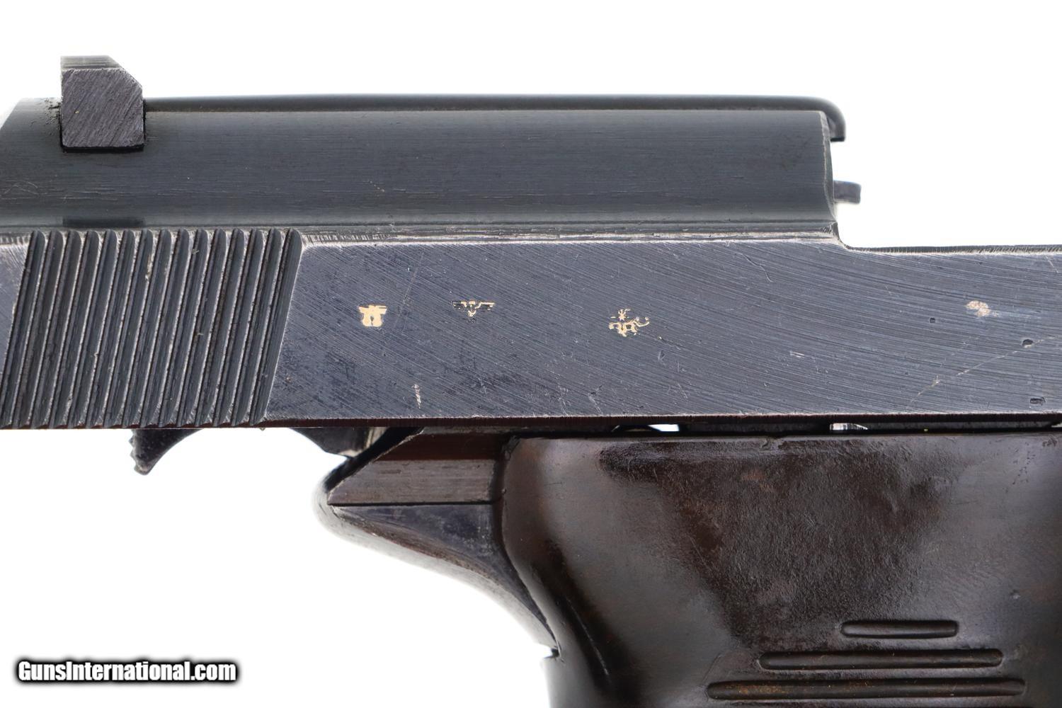 Description: Synopsis: Scarce late-war Spreewerk P38 with "broken die" cvq slide marking in "a" prefix serial number range, all-matching components with correct grips and a "jvd" coded magazine. A classic military pistol from the least known of the P38 pistol manufacturers. Description: Scarce, late war Spreewerk cvq P38 in the "a" prefix serial number range, all matching with correct grips and jvd coded magazine. Standard configuration P38 with 5" barrel, drift adjustable front sight and fixed rear sight. Left side of slide referencing model, manufacturer (broken die cvq code), and SN, the SN repeated under the barrel, left side of frame and on the locking block. Safety with standard S/F detents. Usual inspection/test proofs on right side of frame. Dark chocolate brown composition grips and "jvd" / "P38/U" marked magazine. Condition: VG finish with arguably redipped barrel based on very, very fine speckling under the finish. Slide and frame appear to have original finish, no paint in S/F safety detents, with thinning of front strap in the usual finger contact areas. Original near excellent grips. Magazine VG/EXC as redipped. Dull bore with shallow rifling. Correct manual mechanics though recoil springs sluggish. A nice looking and all-matching Spreework P-38 in the late "a" prefix serial range with correct magazine. Curio/Relic: Yes Manufacturer: Spreewerk Model: P38 Serial Number: a4758 Caliber Info: 9mm Condition: VG Price: $1,795.00 Contact Seller |
