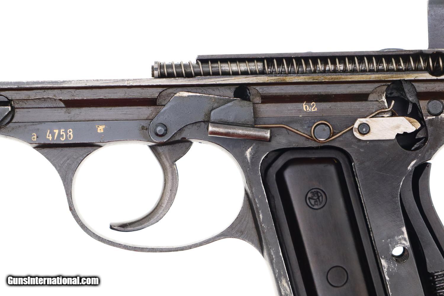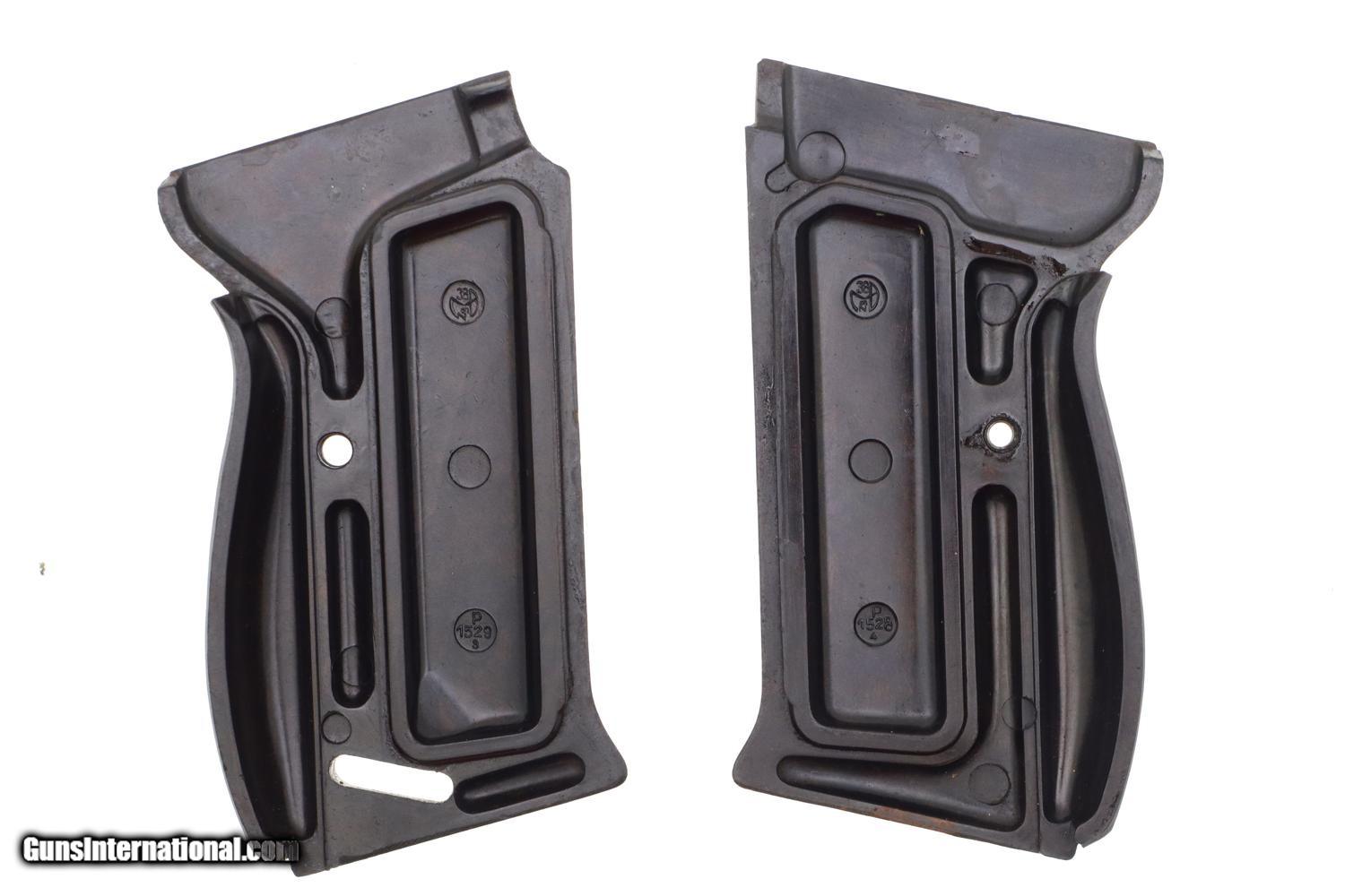VG finish with arguably redipped barrel based on very, very fine speckling under the finish. Slide and frame appear to have original finish, no paint in S/F safety detents, with thinning of front strap in the usual finger contact areas. Original near excellent grips. Magazine VG/EXC as redipped. Dull bore with shallow rifling. Correct manual mechanics though recoil springs sluggish. A nice looking and all-matching Spreework P-38 in the late "a" prefix serial range with correct magazine.
