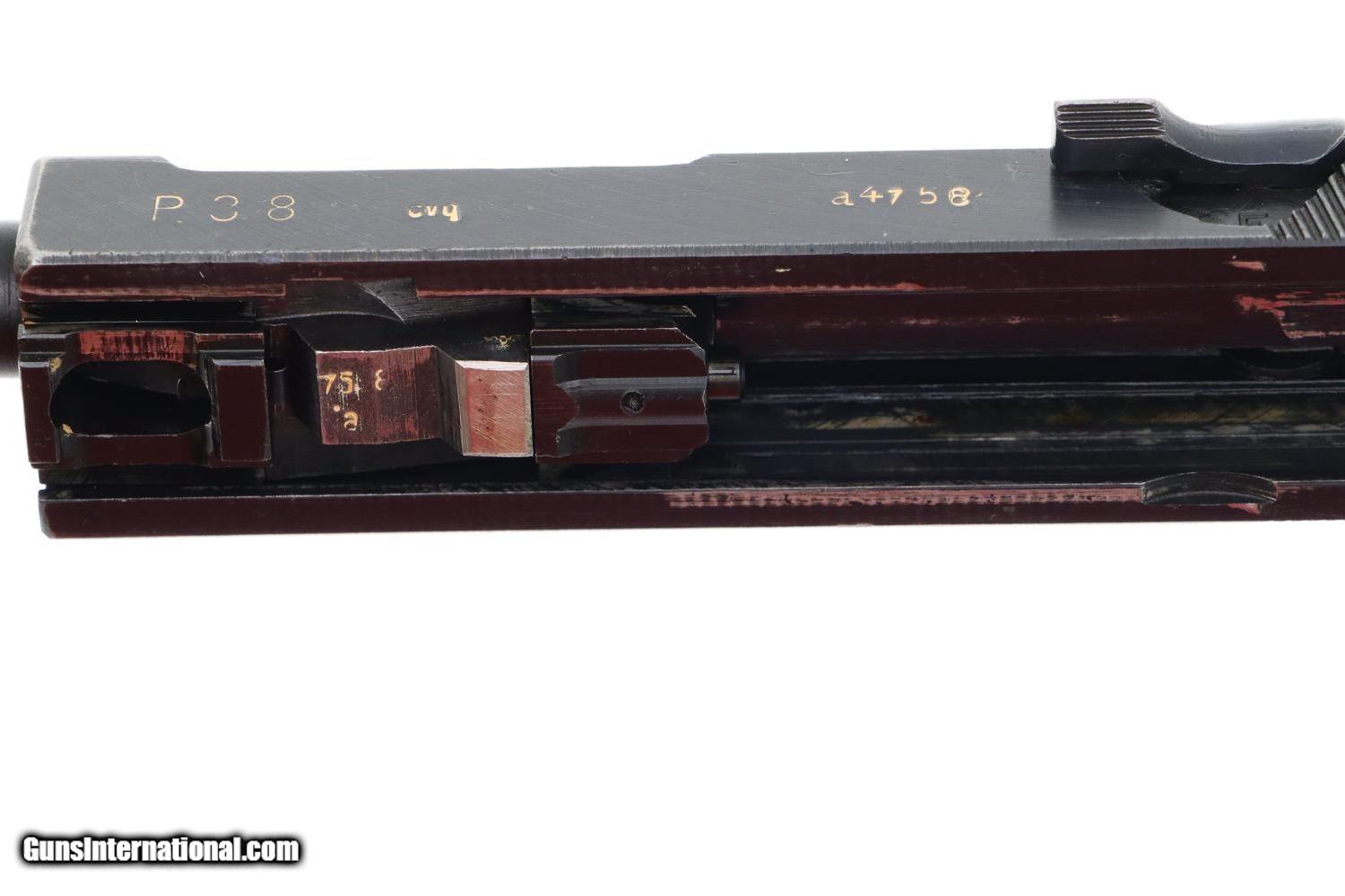 Scarce, late war Spreewerk cvq P38 in the "a" prefix serial number range, all matching with correct grips and jvd coded magazine. Standard configuration P38 with 5" barrel, drift adjustable front sight and fixed rear sight. Left side of slide referencing model, manufacturer (broken die cvq code), and SN, the SN repeated under the barrel, left side of frame and on the locking block. Safety with standard S/F detents. Usual inspection/test proofs on right side of frame. Dark chocolate brown composition grips and "jvd" / "P38/U" marked magazine.