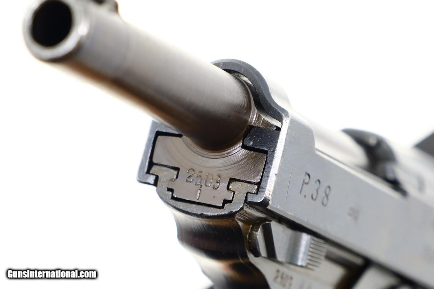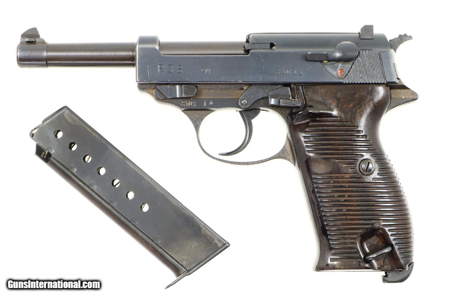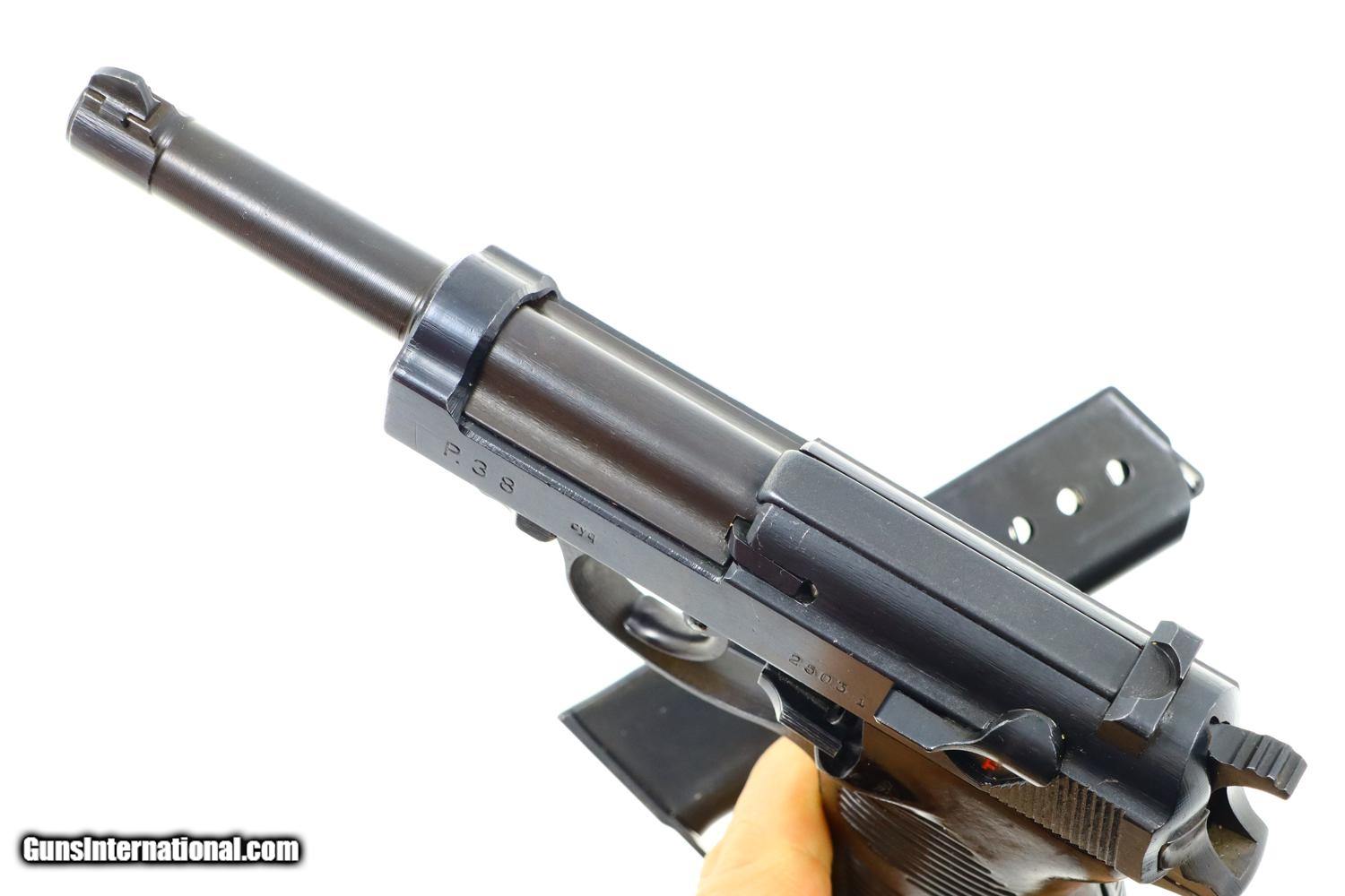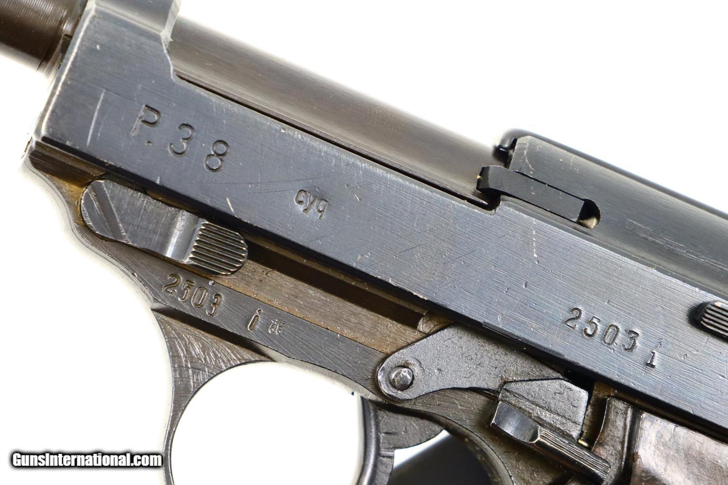 Description: Synopsis: Spreewerk, Walther P38, German Military, 2503i, FB00792 Description: Standard production and all matching Spreewerk P38 with 5” barrel, cog hammer, chocolate brown grips, and “P38” marked magazine with single E/359 on upper spine. Condition: This pistol retains virtually all of its redipped blue finish, no suggestion of previous polishing, replete with the usual crude Spreekwerk machine marks. The “S” and “F” have been correctly repainted. Locking block still blued from the redipped process. Mirror bore. Perfect manual mechanics. A beautiful looking late war P38 whose darker-than-usual finish and dipped locking block the only clues to its having been redipped. ~~Insured shipping fee of $45; most packages shipped using FedEx 2nd Day.~~ SOLD Manufacturer: Spreewerk Serial Number: 2503i Caliber Info: 9 Luger |