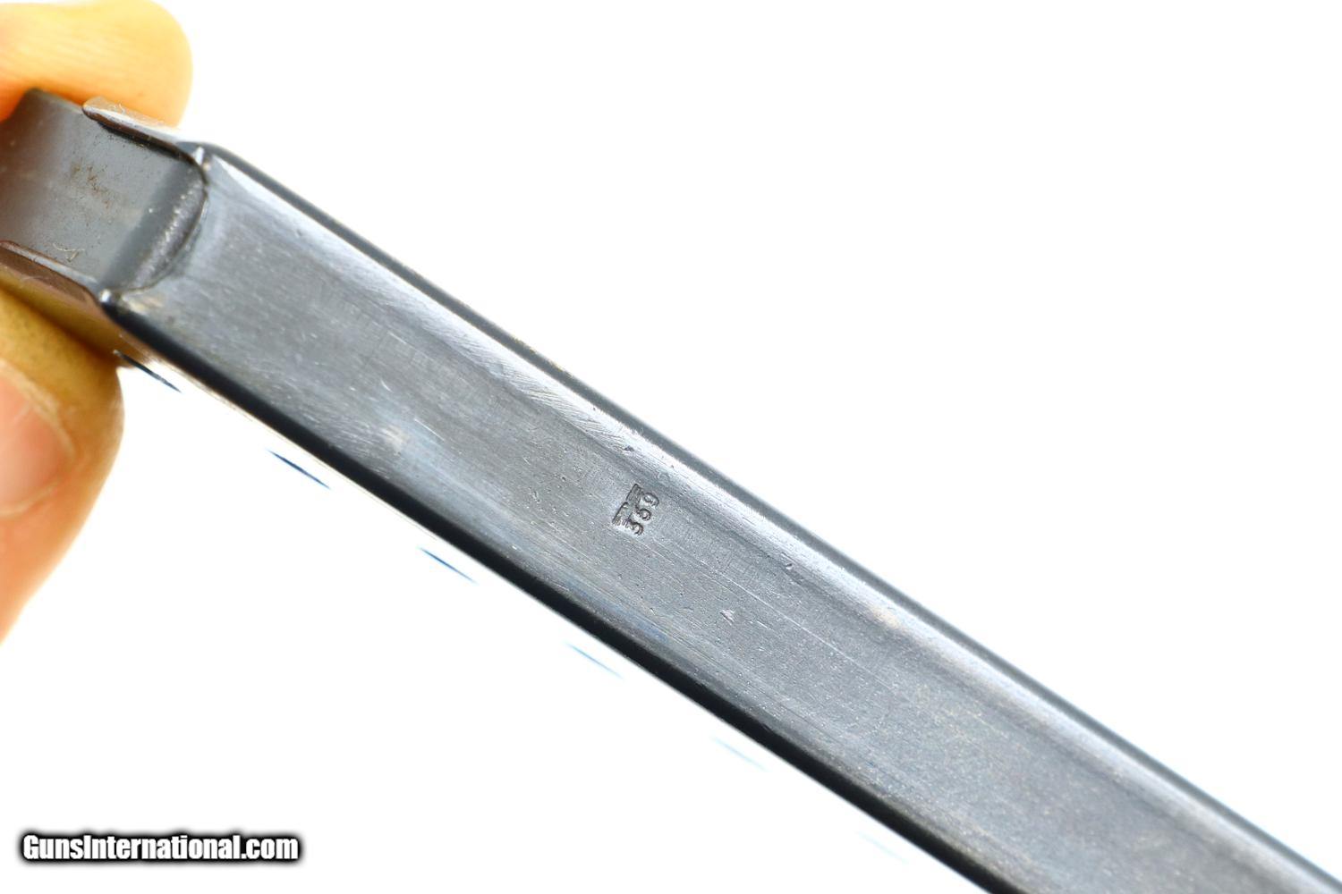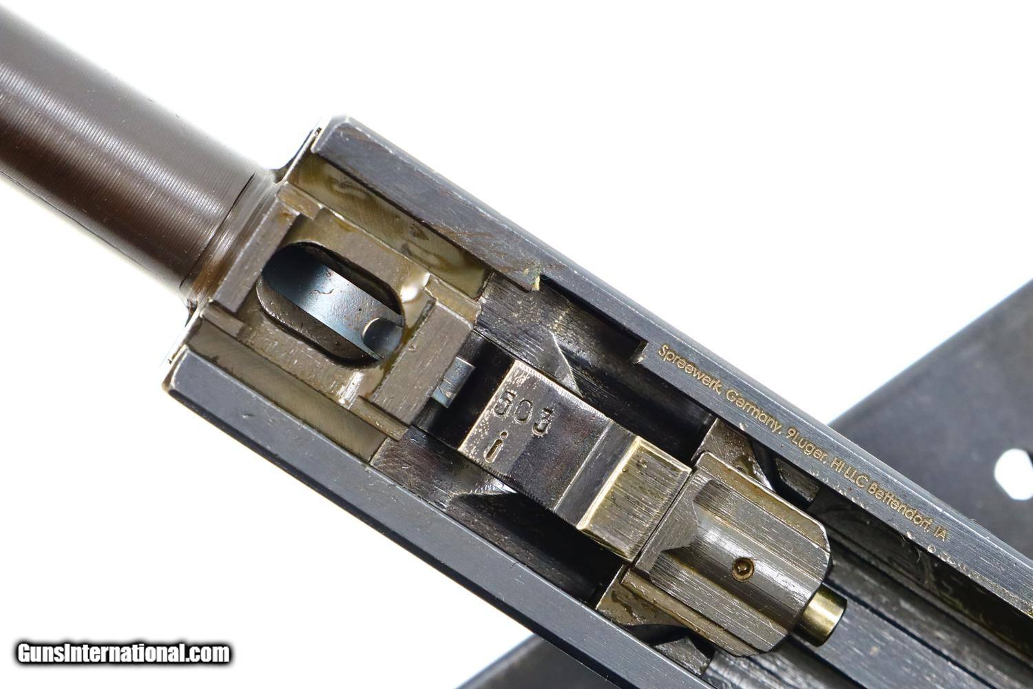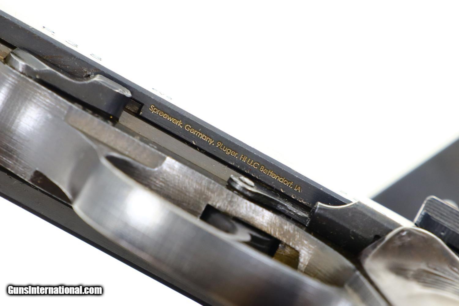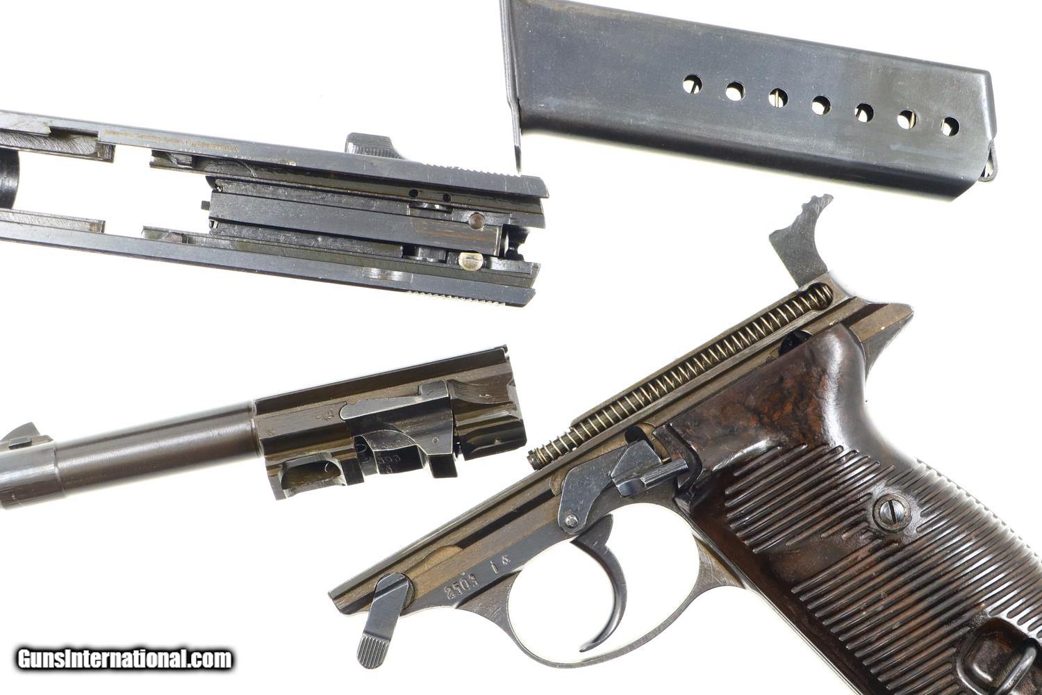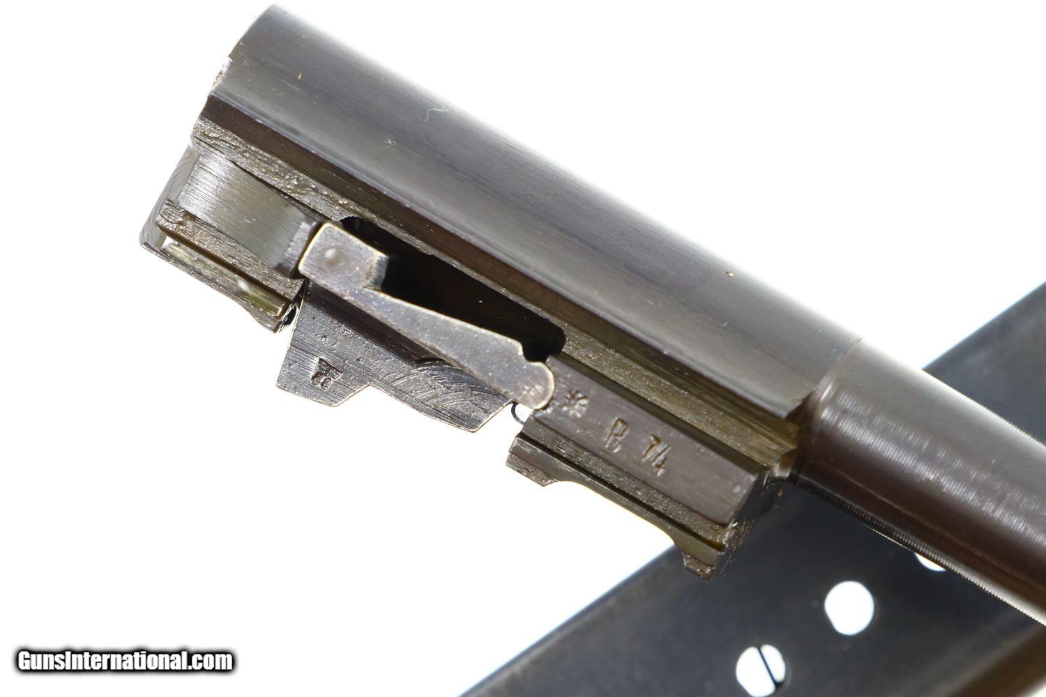 Description: Synopsis: Spreewerk, Walther P38, German Military, 2503i, FB00792 Description: Standard production and all matching Spreewerk P38 with 5” barrel, cog hammer, chocolate brown grips, and “P38” marked magazine with single E/359 on upper spine. Condition: This pistol retains virtually all of its redipped blue finish, no suggestion of previous polishing, replete with the usual crude Spreekwerk machine marks. The “S” and “F” have been correctly repainted. Locking block still blued from the redipped process. Mirror bore. Perfect manual mechanics. A beautiful looking late war P38 whose darker-than-usual finish and dipped locking block the only clues to its having been redipped. ~~Insured shipping fee of $45; most packages shipped using FedEx 2nd Day.~~ SOLD Manufacturer: Spreewerk Serial Number: 2503i Caliber Info: 9 Luger |
