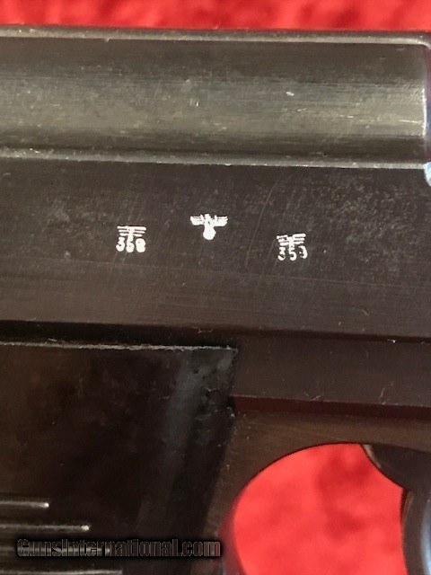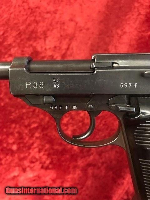 Description: This Walther P-38 in 9mm is in amazing shape for its age! Gun retains virtually all of its original wartime blue finish, with just a few tiny areas of high edge wear on the slide. Original dark brown bakelite grips are phenomenal as well, with no scratches, chips, cracks, or gouges. Slide is stamped on the left side with "ac 43" manufacturer code, and on the right side with two eagle over 358 waffenamts and an eagle over swastika. All numbered parts correctly match, but interestingly the barrel has been force matched, with the original number X-ed out and the correct number applied. Bore is good, with strong rifling its entire length and just a bit of frosting throughout. Comes with one original wartime magazine marked with the "ac" code. A great shape P-38 that will be right at home in any WWII collection! SOLD Manufacturer: Walther Model: P-38 Serial Number: 697f Caliber Info: 9mm |