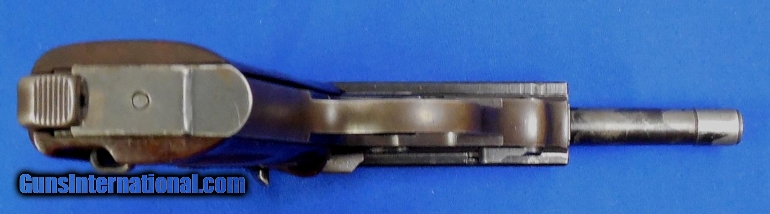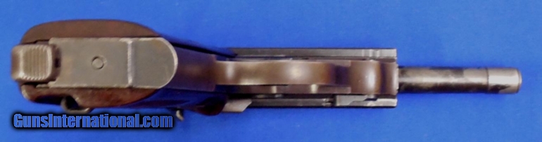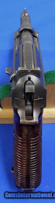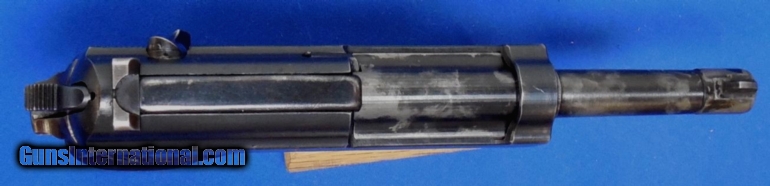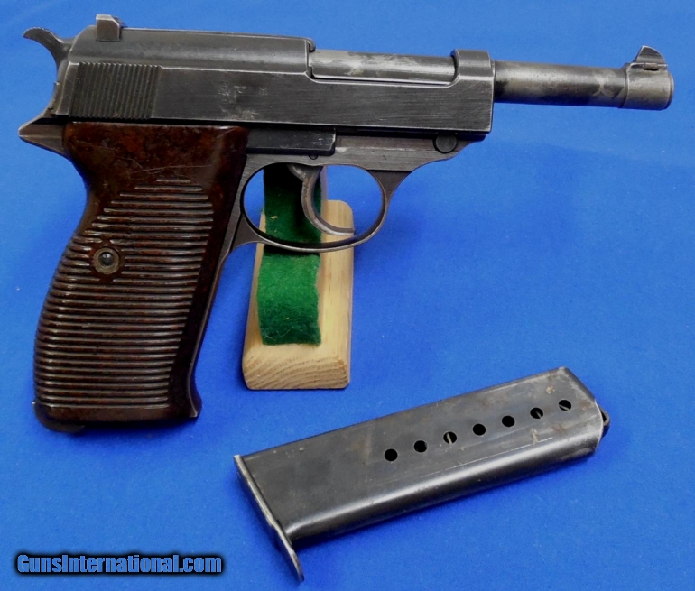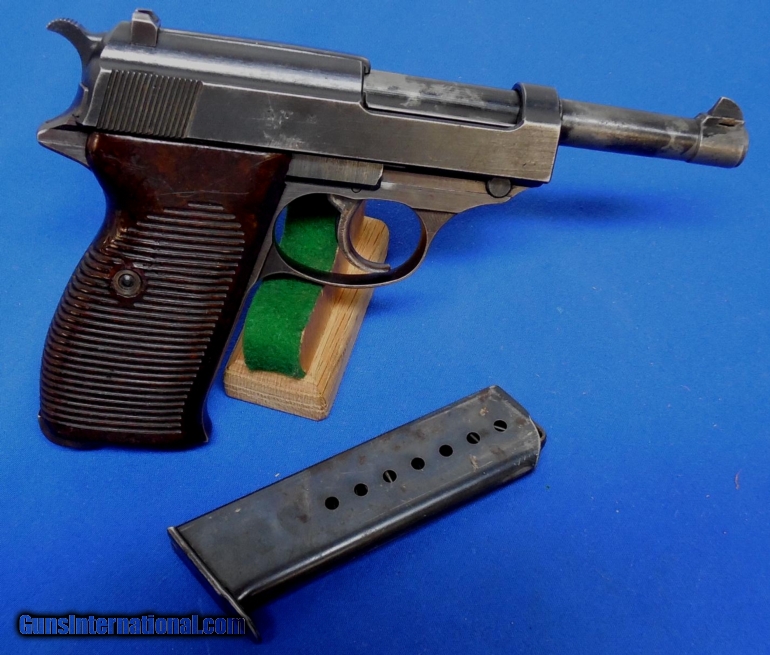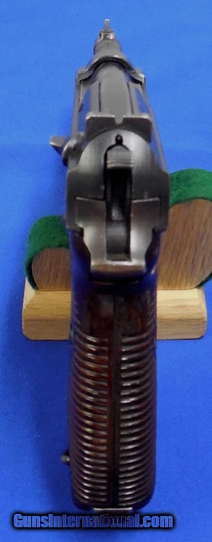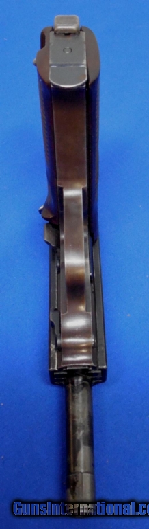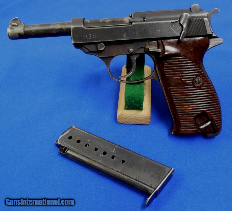 Description: Walther P.38 Semi-Auto Pistol, single line code: ac45 Walther, serial # 2362 (matching), cal. 9mm, has a 5" barrel with fair plus bore that’s worn with peppery pitted, pistol retains 80% finish with some tiinning on slide and at high points. Barrel exterior fair to good with mottled appearance of finish loss as if caused by chemical splatter, finish starting to lighten on front grip strap, nice brown plastic grooved grips, pistol is waffenampted E/359, magazine's spine is stamped E/359 and left side bottom is stamped P.38v/U, overall as described in good – good plus condition. Inv.: # 1-1274 SOLD Curio/Relic: Yes |