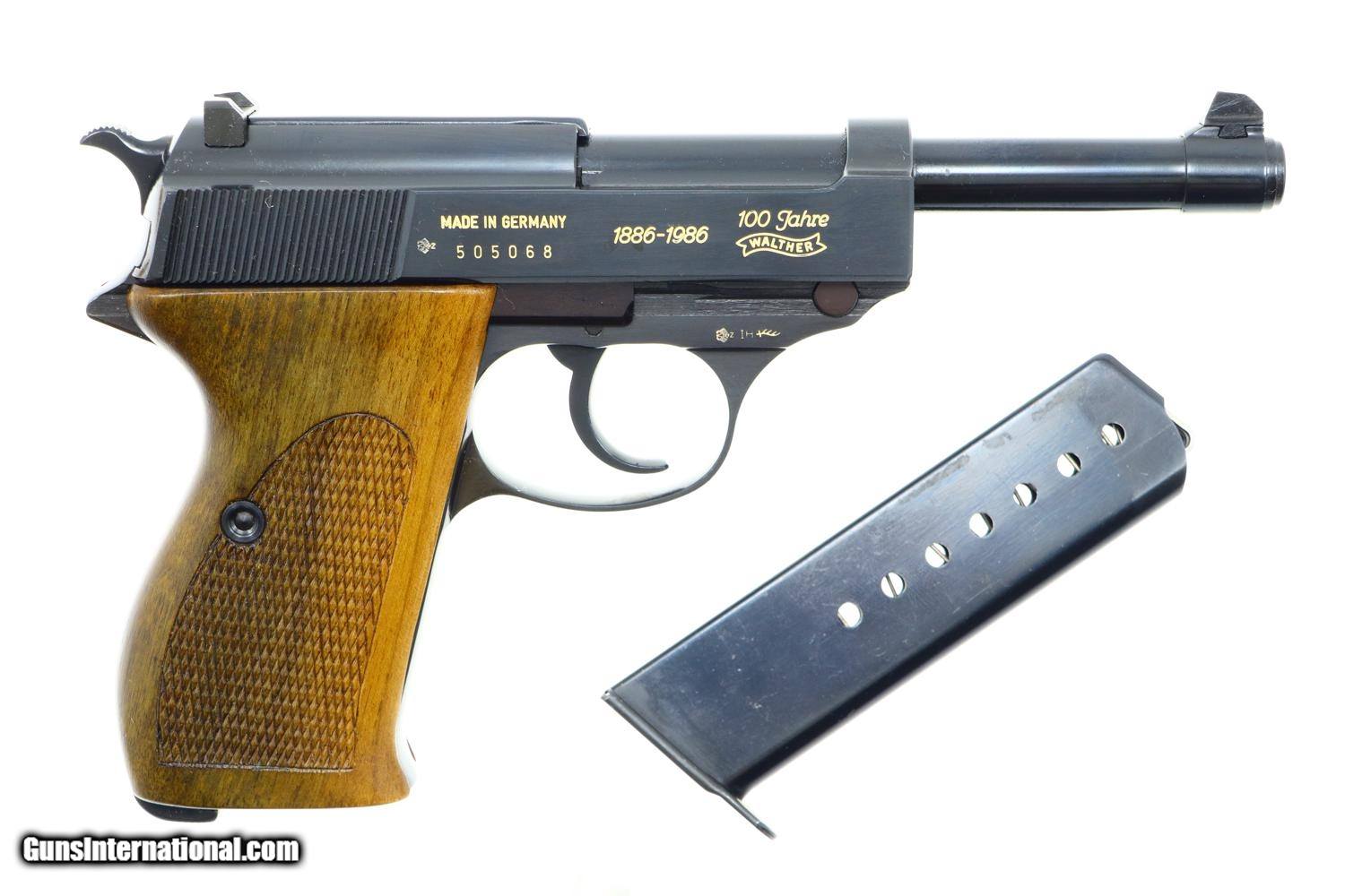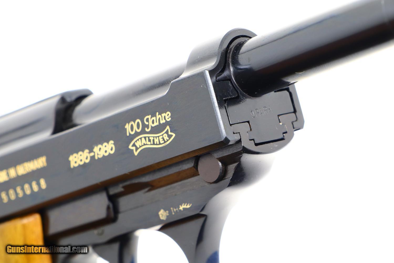 Standard configuration P38 with 5? barrel, drift adjustable front sight and separable rear sight, both with white factory highlights. Marked on left side of slide with Walther banner/P38. The full serial number is on the left side of the steel frame. Right side of slide is marked with the matching serial number, “Made in Germany”, and the “1886-1986” commemorative legend. Eagle/N proofing in usual locations. Wood checkered grips. Correct commerically marked magazine.