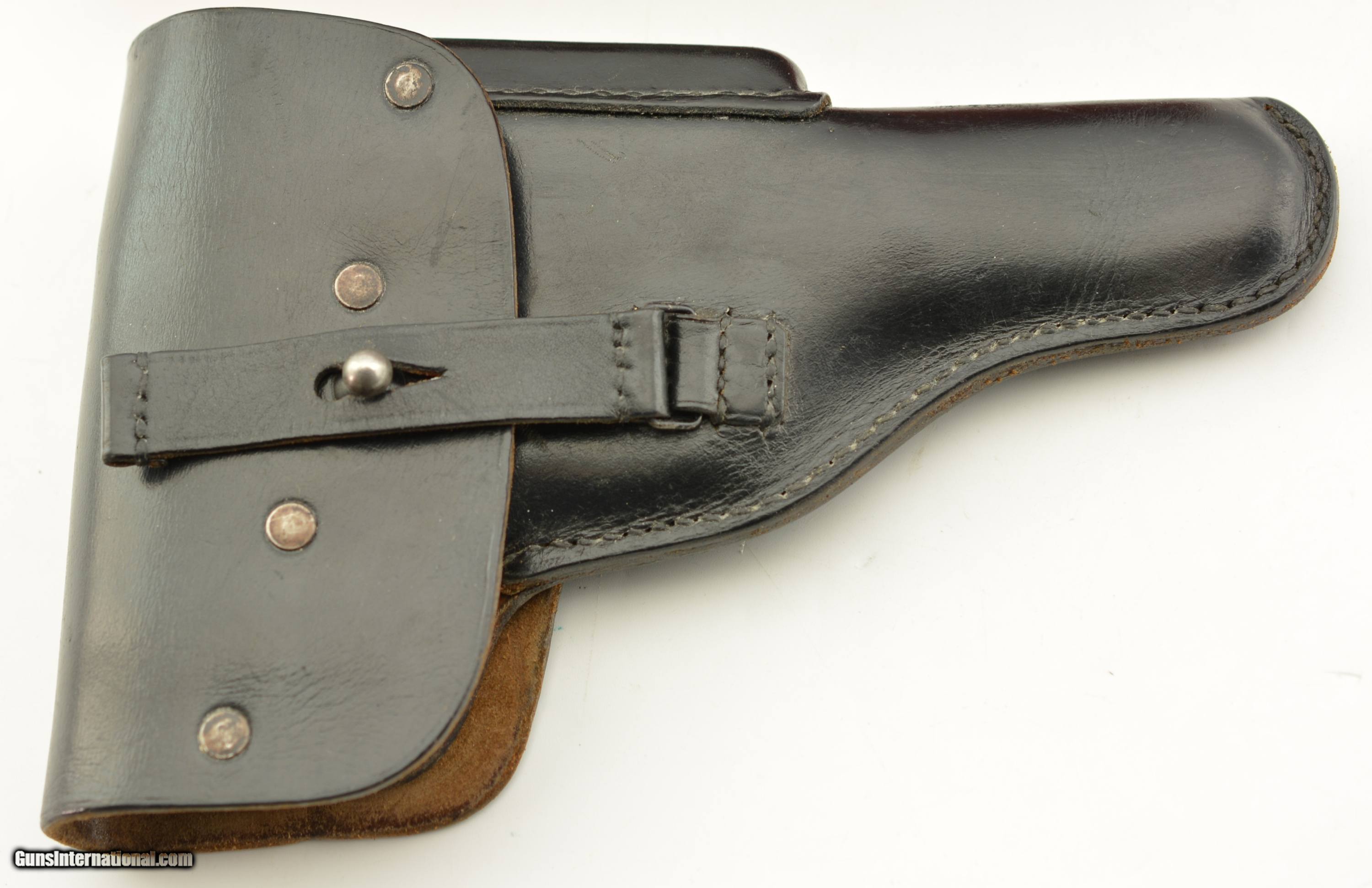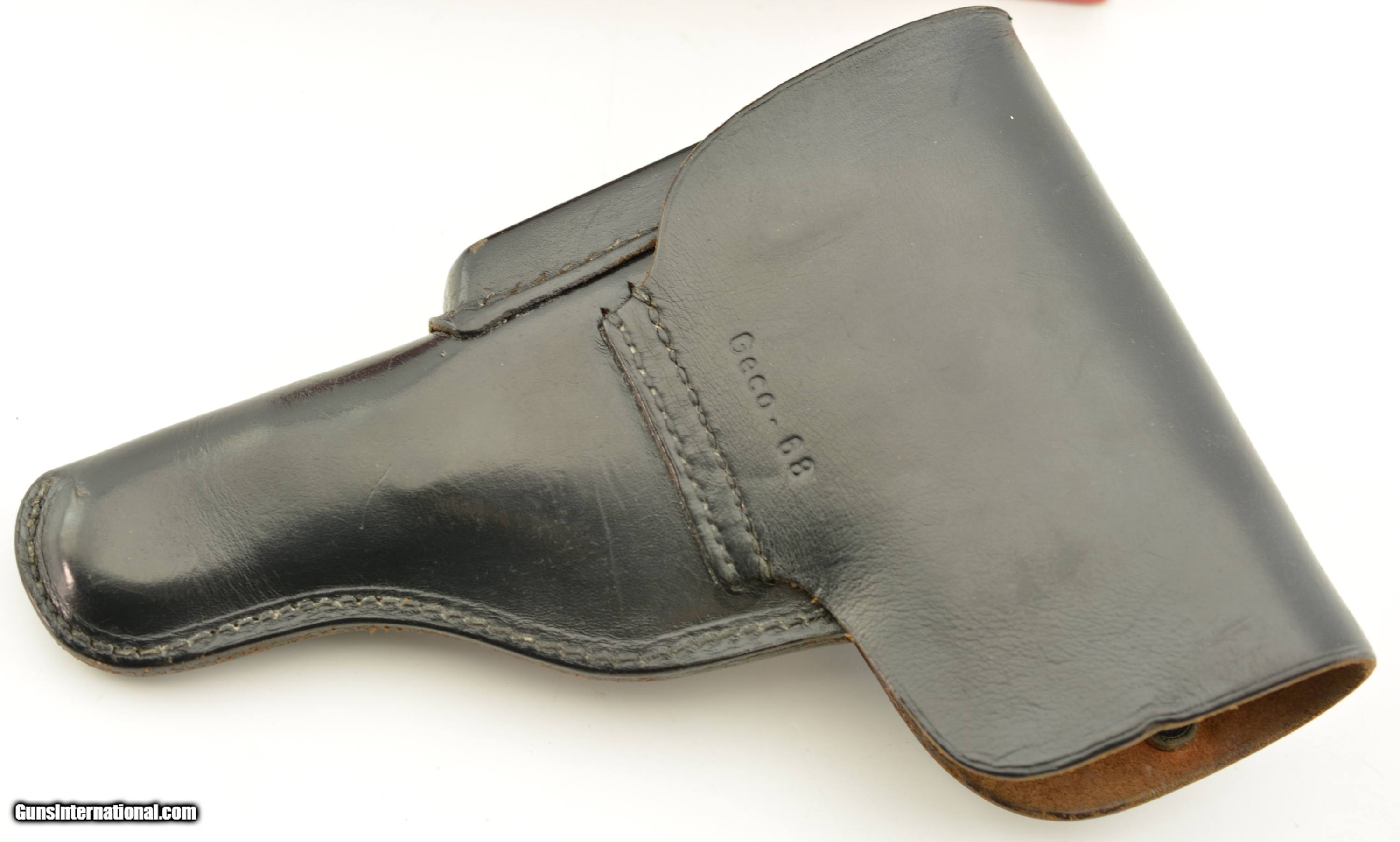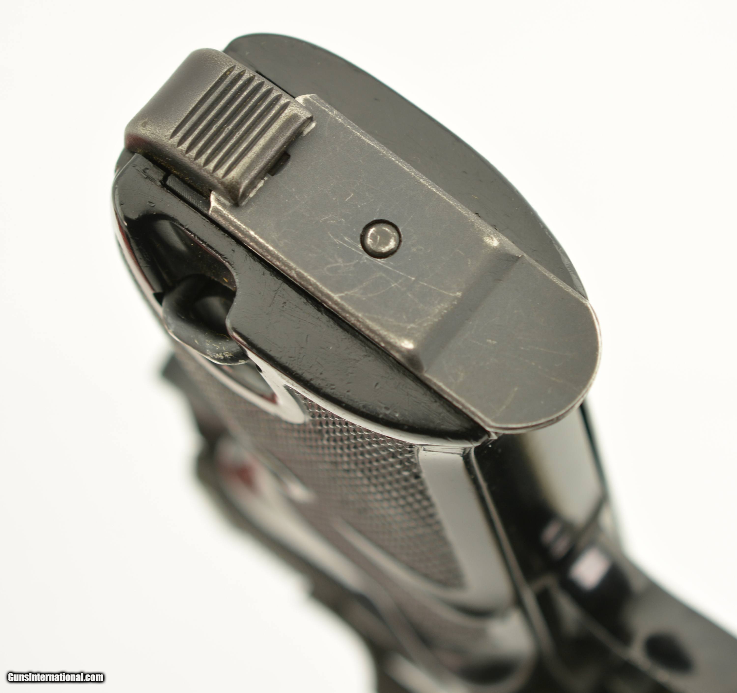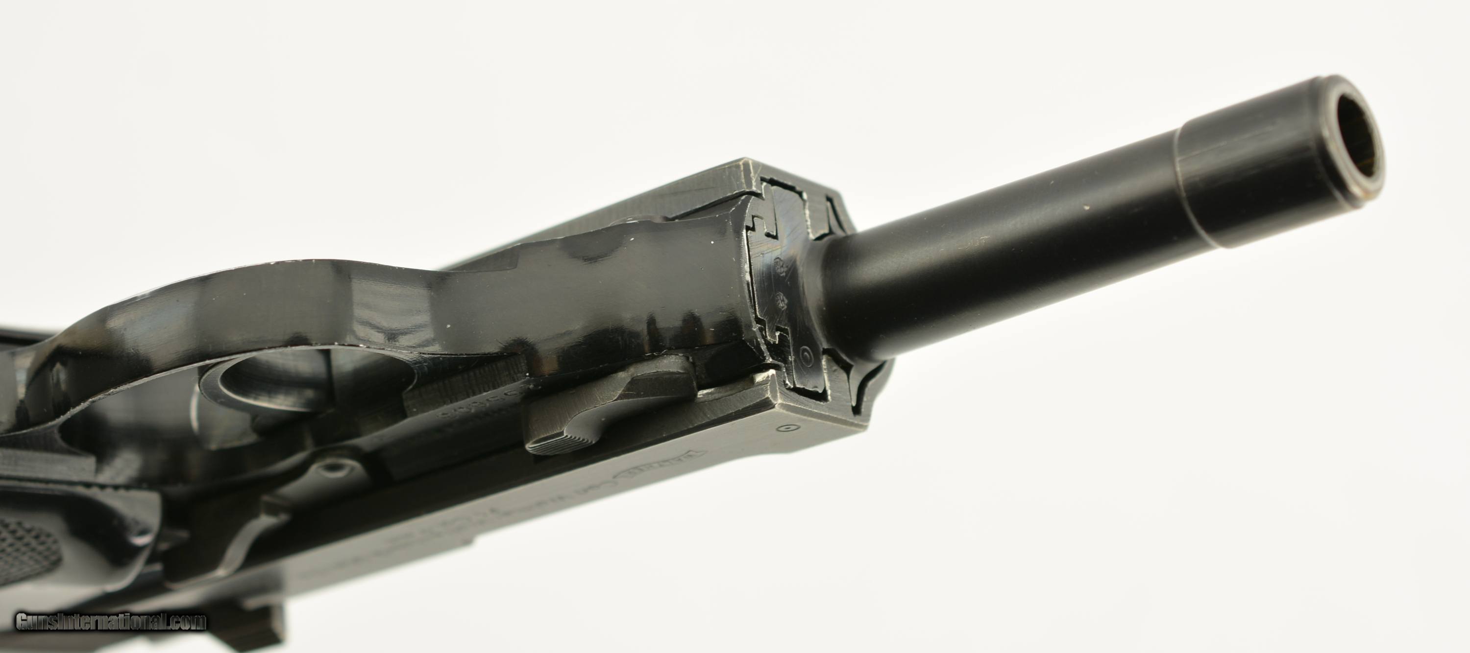 Description: Serial #255805, 9mm Luger, 5 inch barrel with a bright, excellent bore. This is the Interarms model P38 pistol, marked P1 on the slide as its the post-war commercial variation with steel slide and alloy frame with blue finish and black plastic grips manufactured in 1964. Imported by Interarms and marked as such on the frame the former West German police pistol comes with a black leather holster marked “Geco-68" on the back with initials written on the inside flap and has two unmarked, 8 round steel magazines. The pistol and holster are both in excellent condition with the slide retaining about 88-93% of the blue finish with silvering on the high edges and light scratches and the frame showing similar wear on the edges. Grips rate about excellent with light use marks and the holster has nice supple leather. With the original Interarms box numbered to the gun with manuals and box showing old tape repairs with very good exterior graphics. FFL or C&R SOLD Curio/Relic: Yes Manufacturer: Walther Model: P38 Serial Number: 255805 Caliber Info: 9mm Gauge Info: 9mm |