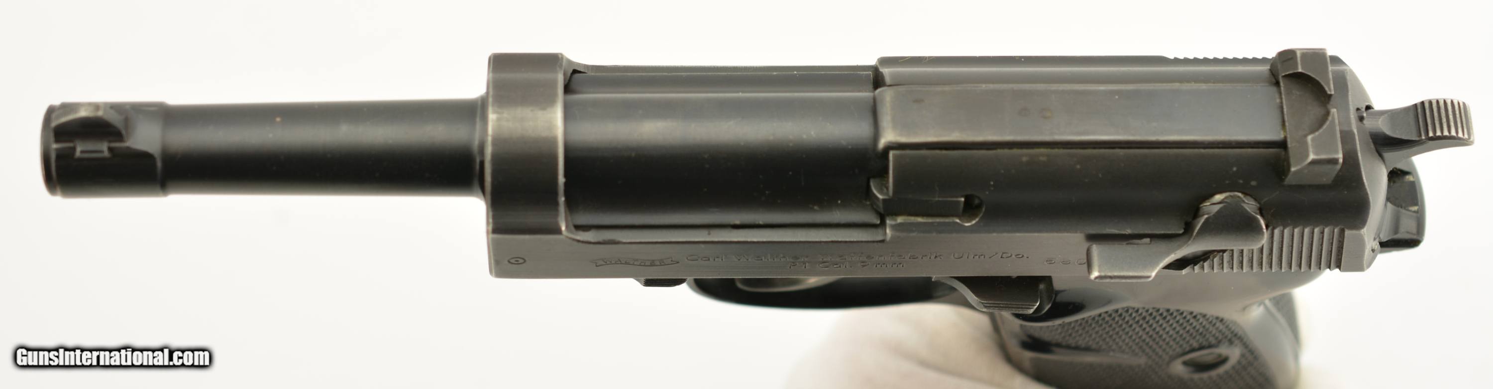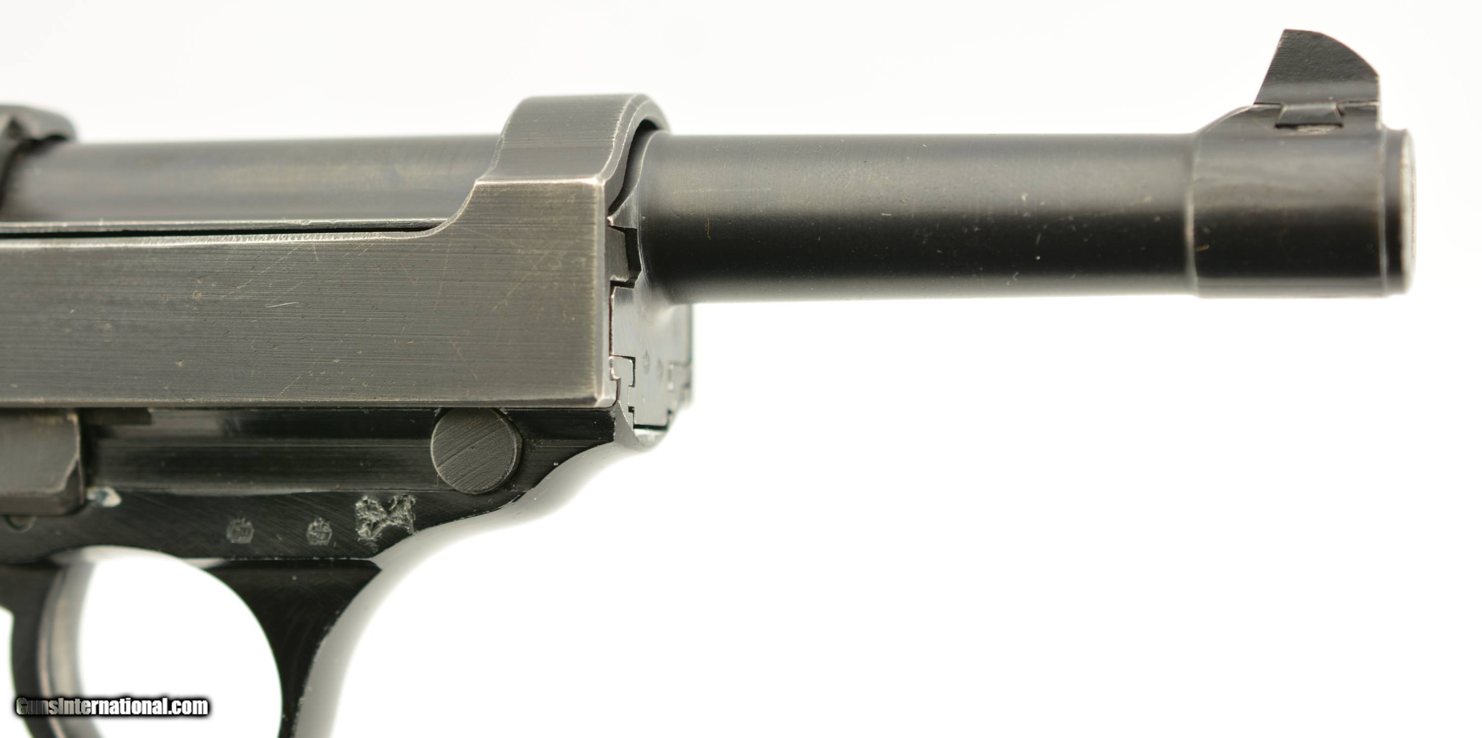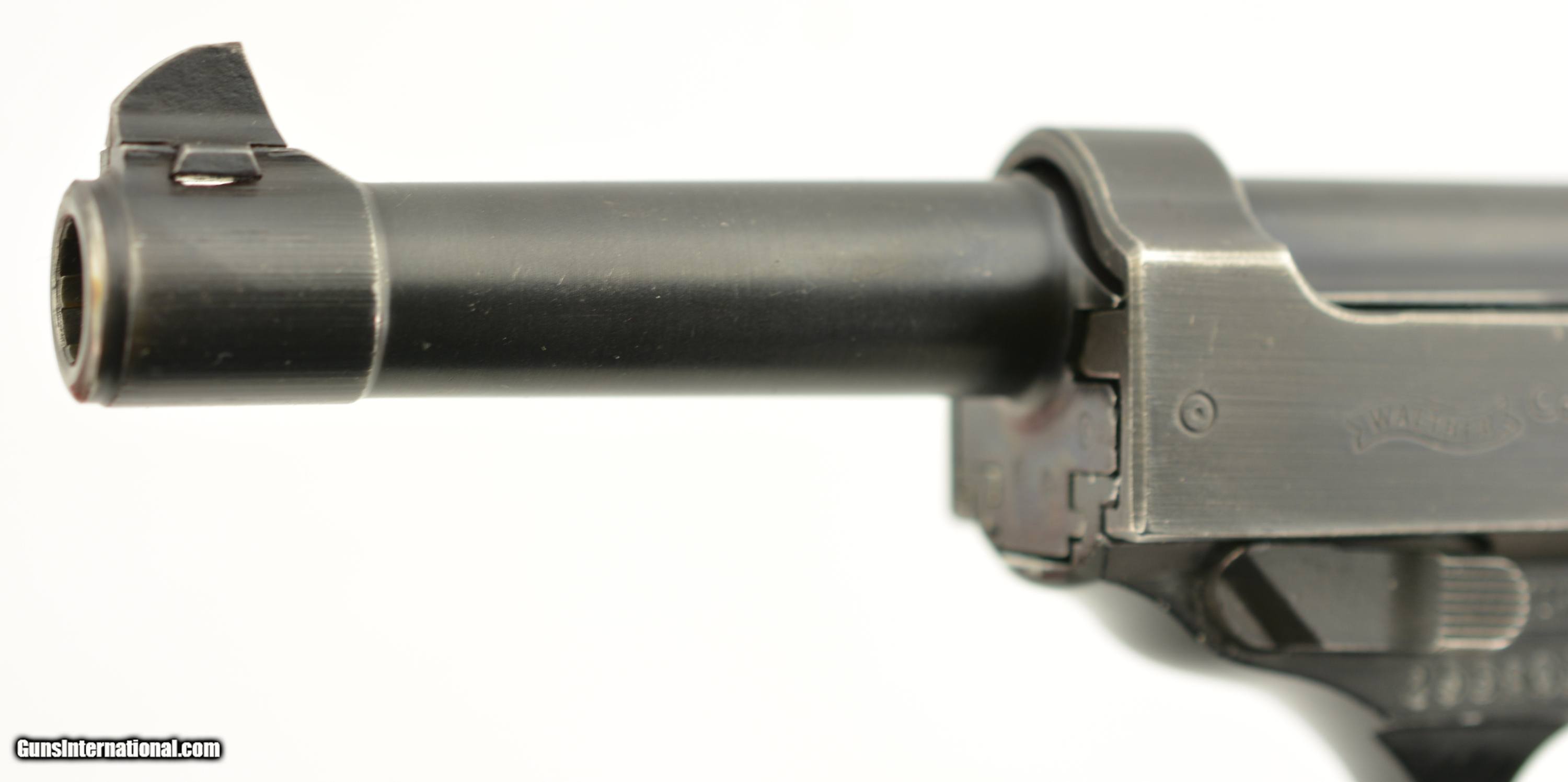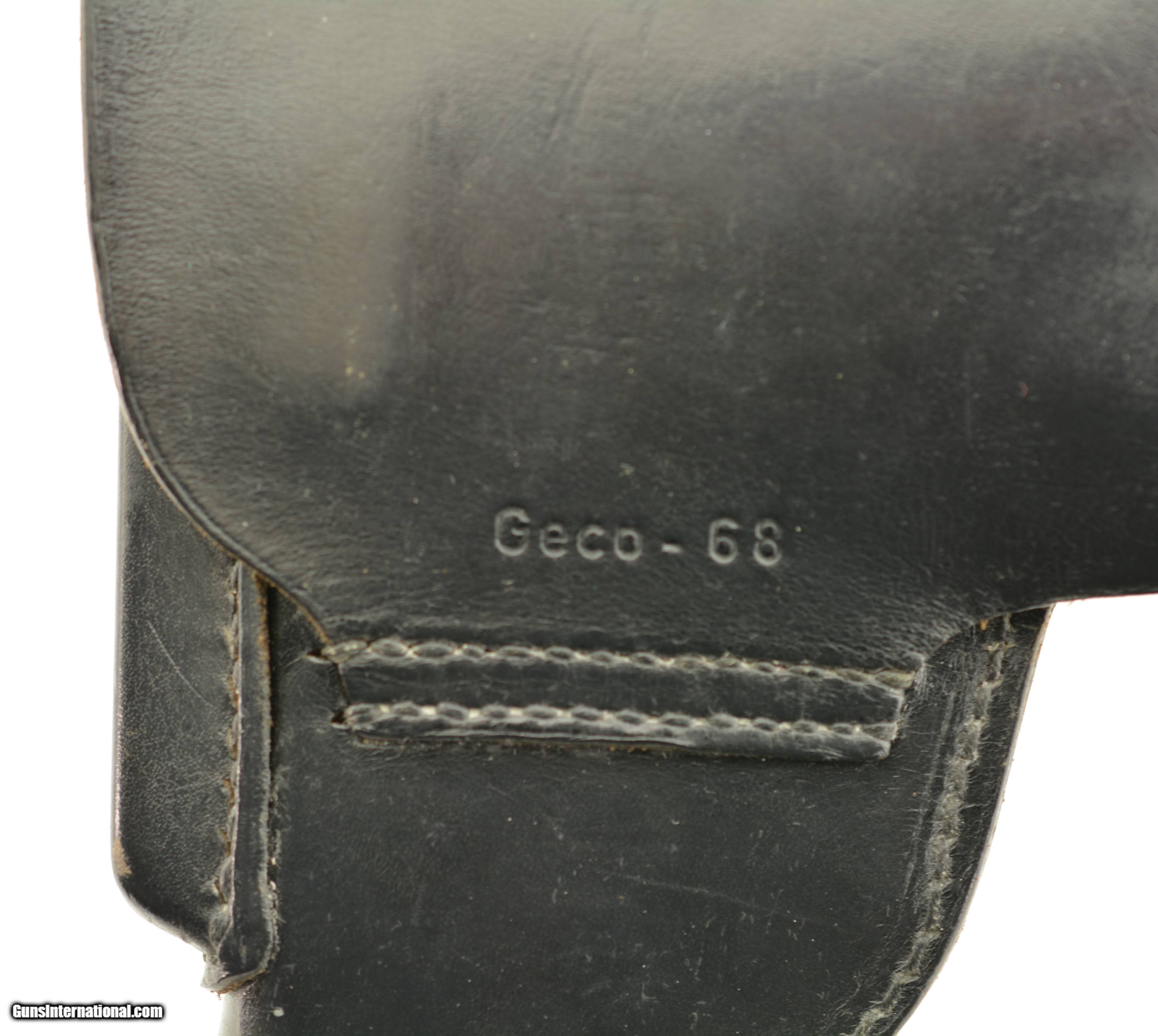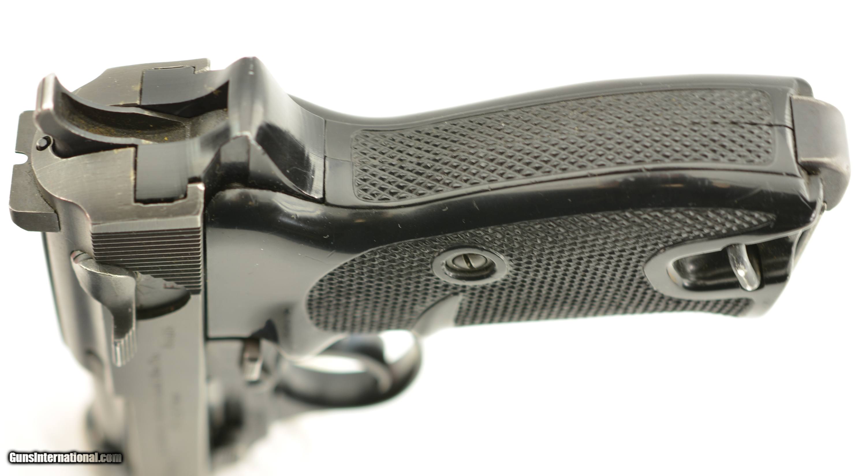 Description: Serial #255805, 9mm Luger, 5 inch barrel with a bright, excellent bore. This is the Interarms model P38 pistol, marked P1 on the slide as its the post-war commercial variation with steel slide and alloy frame with blue finish and black plastic grips manufactured in 1964. Imported by Interarms and marked as such on the frame the former West German police pistol comes with a black leather holster marked “Geco-68" on the back with initials written on the inside flap and has two unmarked, 8 round steel magazines. The pistol and holster are both in excellent condition with the slide retaining about 88-93% of the blue finish with silvering on the high edges and light scratches and the frame showing similar wear on the edges. Grips rate about excellent with light use marks and the holster has nice supple leather. With the original Interarms box numbered to the gun with manuals and box showing old tape repairs with very good exterior graphics. FFL or C&R SOLD Curio/Relic: Yes Manufacturer: Walther Model: P38 Serial Number: 255805 Caliber Info: 9mm Gauge Info: 9mm |