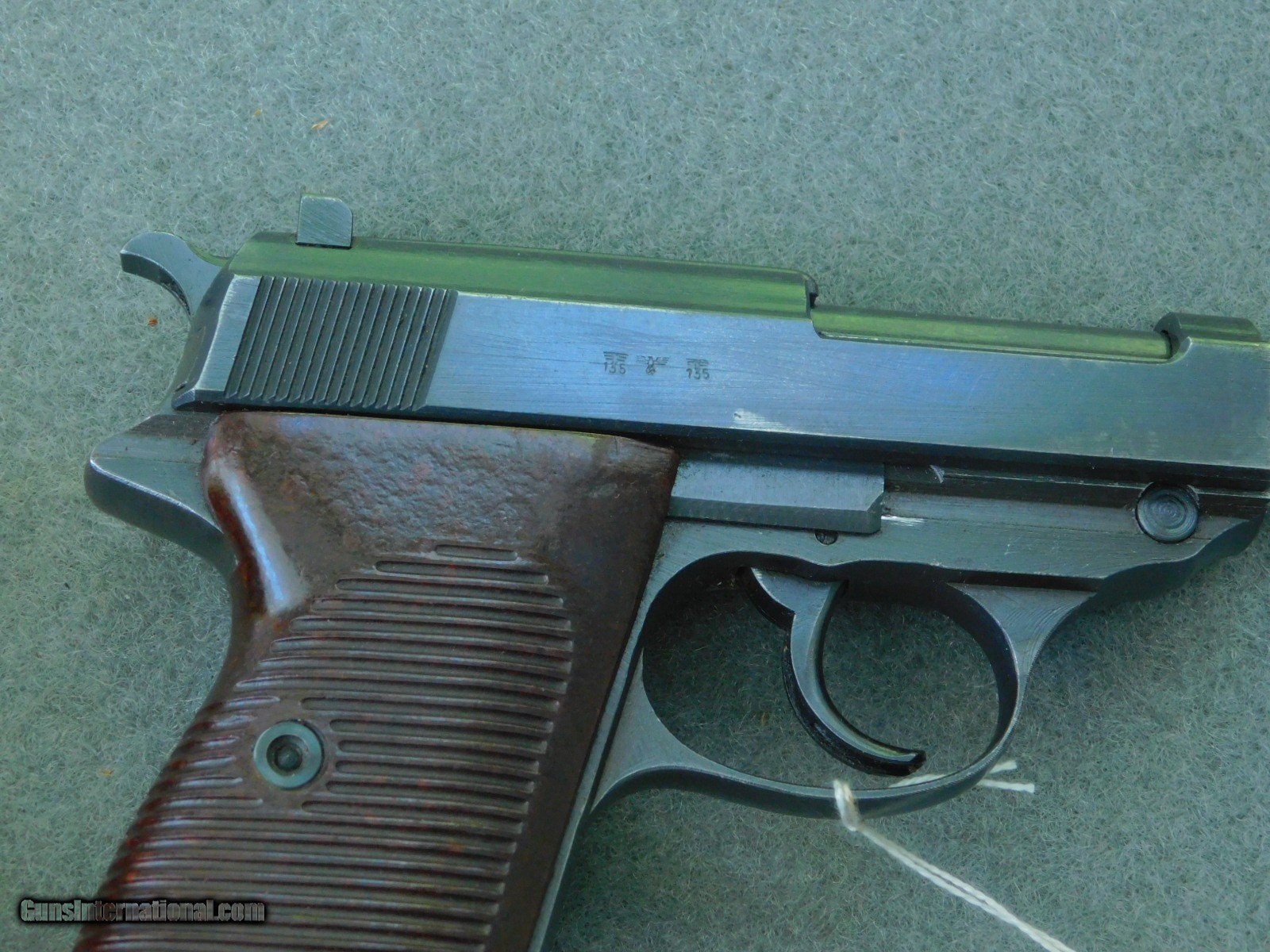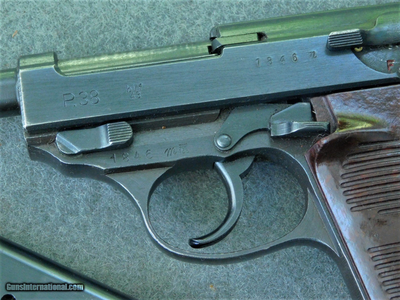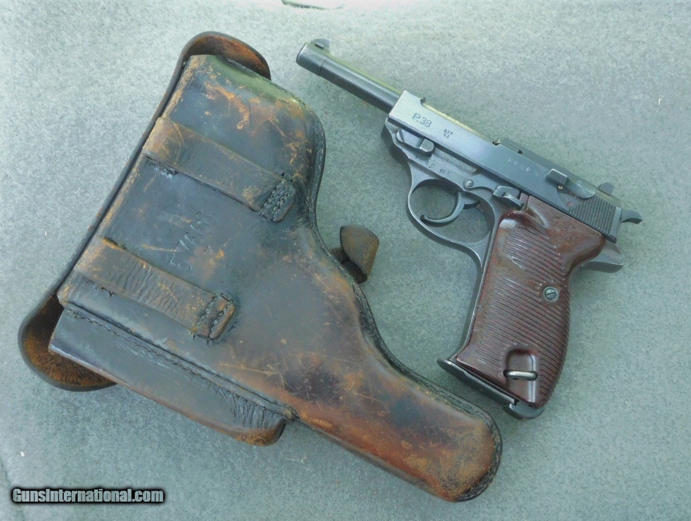Description: Mauser byf 43 m code 9mm WWII pistol with holster and capture papers May 1945. Finish is a 98% +. SN.1846 m. One of the byf 43 code m block with very early very sharp Blue finish, all matching with ex bore and red/brown grips. Two mags 9mm, one marked P.30v on side and waffen amp on edge WaA359, other mag is post war numbered and dated 8/58. Sharp and crisp collectors grade WWII P38. Holster is maker marked Joseph Moll, Goch/ RHI??? and waffen amp and numbered on the rear 57666 with a small eagle under number, overall condition is EX and solid with all tight stitching. The WWII veteran soldier that returned with it was in the 872nd Field Artillery Battery B which is a part of the 66th Infantry Division ( Black Panther Division) saw extream action at St. Nazarie and Lorient Pocket during WW2. I will supply with the P38 the with the original capture papers and copies of his DD-214 and Discharge. Sold as pictured and as described. More picture available if you need them Sold and shipped only to licensed FFL dealer and or C&R. Shipped only to their license address. IF using your C&R make sure this pistiol is allowed in your State. Shipped FedX 2nd day $45.00. Always open to reasonable offers. SOLD Curio/Relic: Yes Manufacturer: walther Model: P38 Serial Number: 1846 Barrel Length: STD. Condition: 98% Bore Condition: EX Finish: Blued Manufacture Date: 1943 |