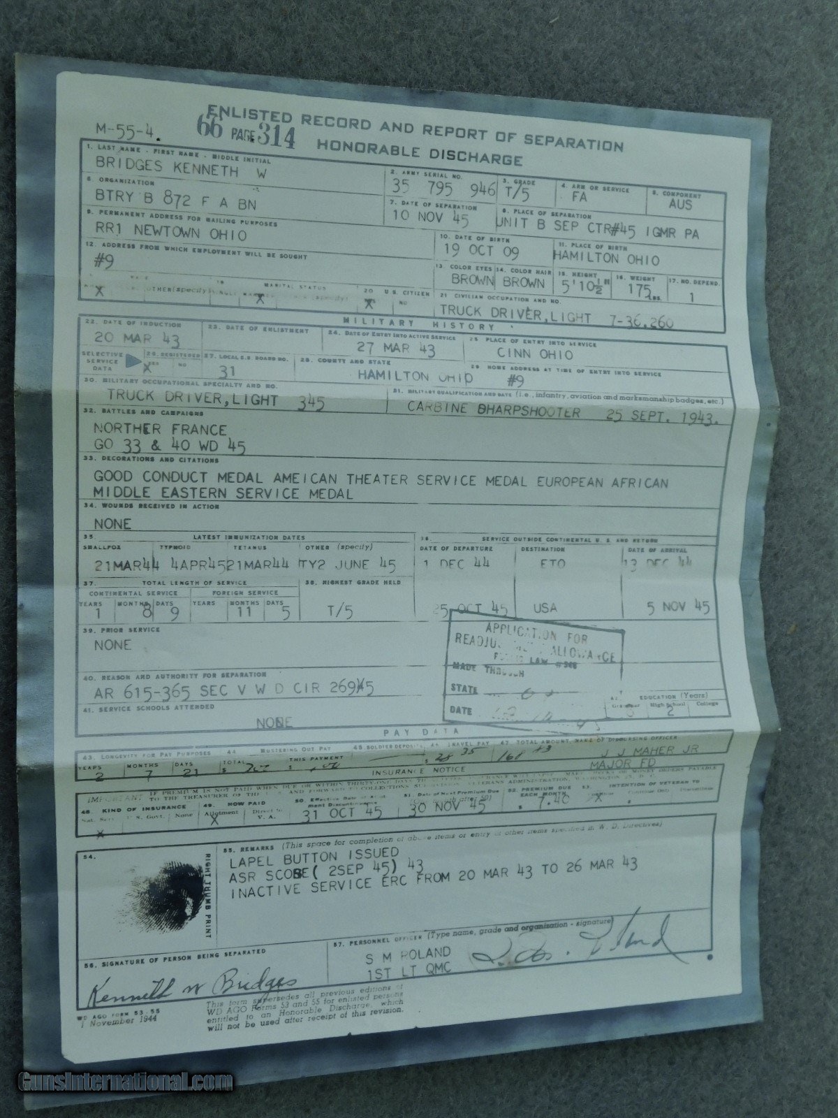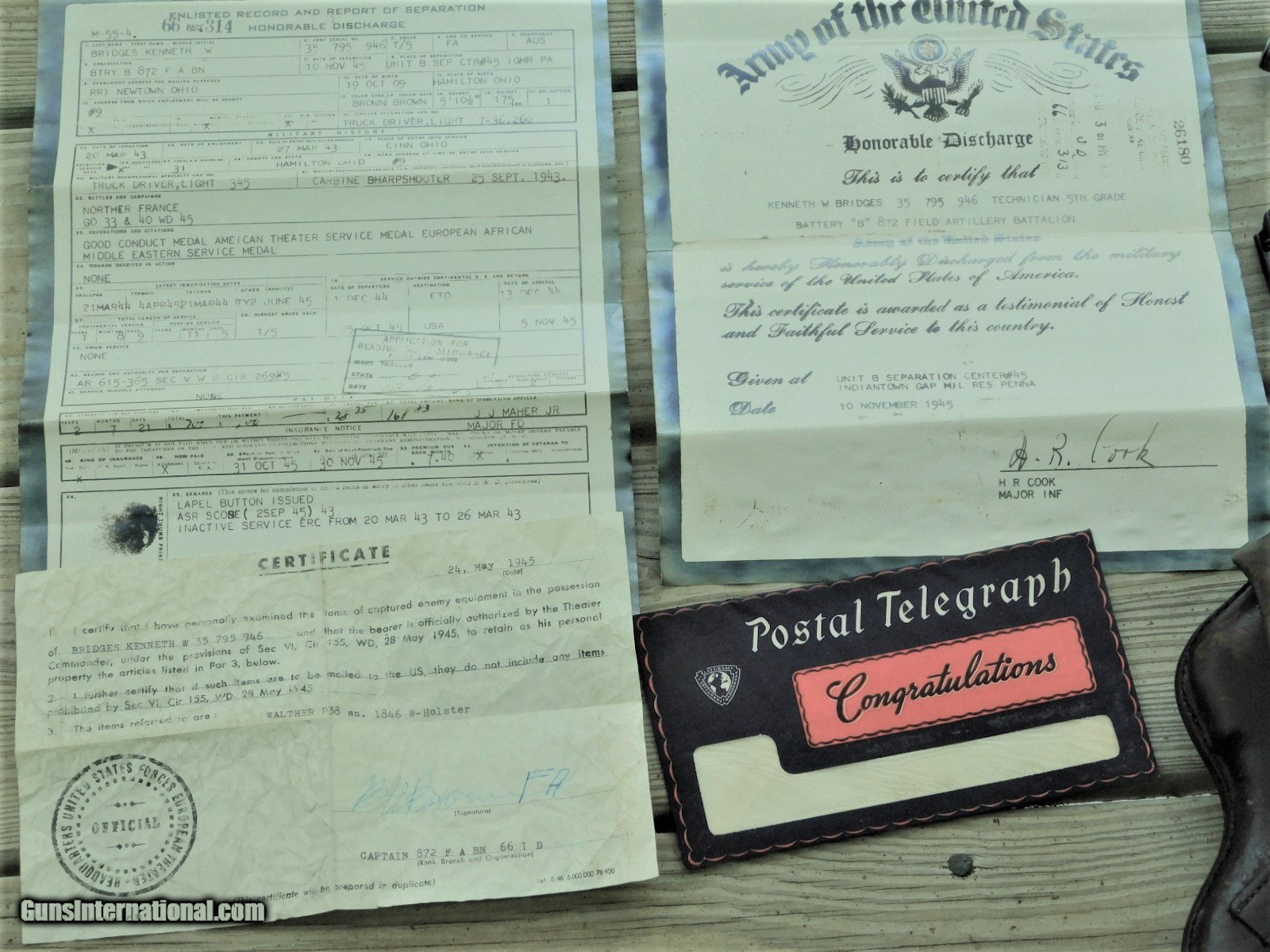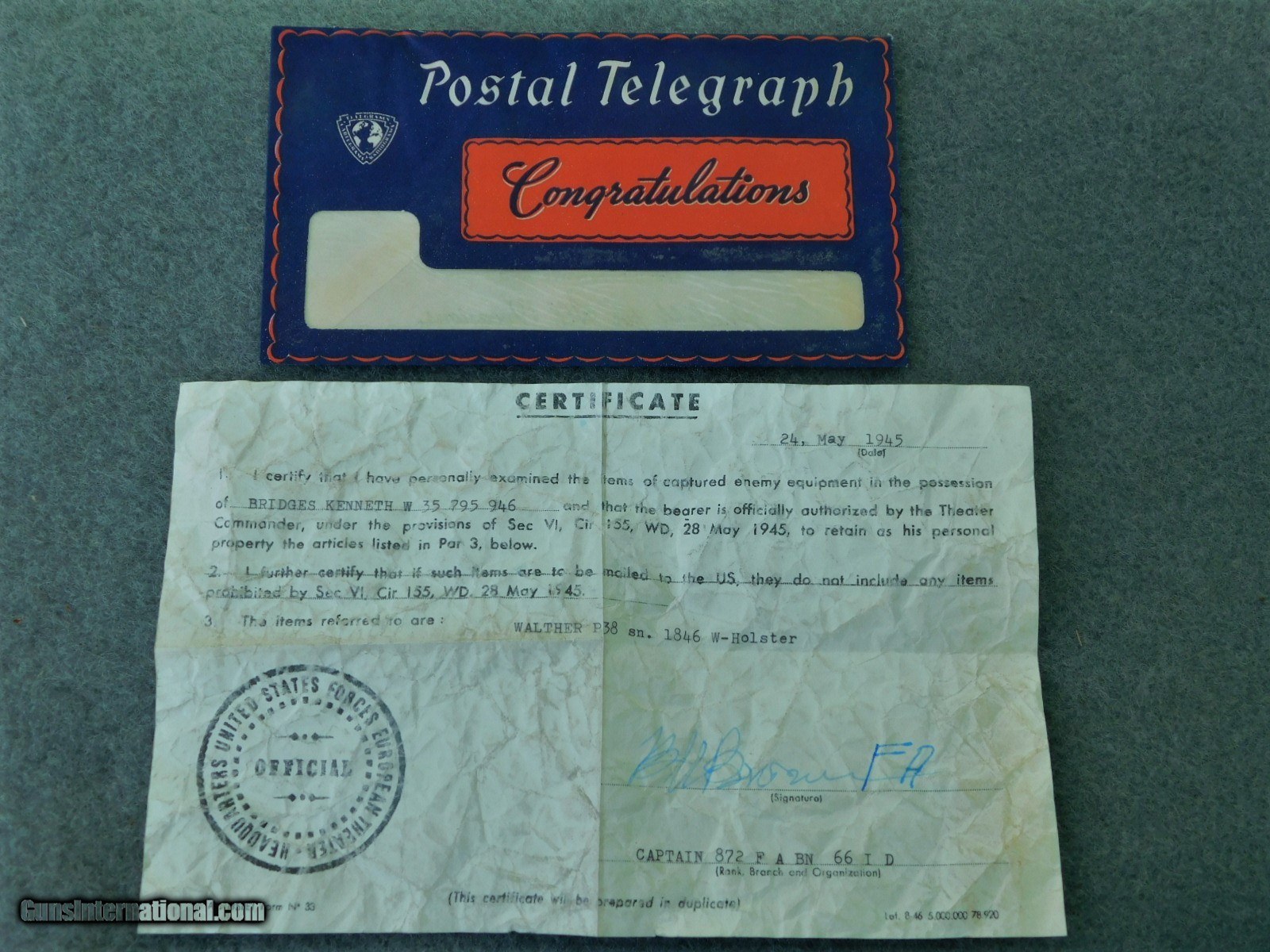 Description: Mauser byf 43 m code 9mm WWII pistol with holster and capture papers May 1945. Finish is a 98% +. SN.1846 m. One of the byf 43 code m block with very early very sharp Blue finish, all matching with ex bore and red/brown grips. Two mags 9mm, one marked P.30v on side and waffen amp on edge WaA359, other mag is post war numbered and dated 8/58. Sharp and crisp collectors grade WWII P38. Holster is maker marked Joseph Moll, Goch/ RHI??? and waffen amp and numbered on the rear 57666 with a small eagle under number, overall condition is EX and solid with all tight stitching. The WWII veteran soldier that returned with it was in the 872nd Field Artillery Battery B which is a part of the 66th Infantry Division ( Black Panther Division) saw extream action at St. Nazarie and Lorient Pocket during WW2. I will supply with the P38 the with the original capture papers and copies of his DD-214 and Discharge. Sold as pictured and as described. More picture available if you need them Sold and shipped only to licensed FFL dealer and or C&R. Shipped only to their license address. IF using your C&R make sure this pistiol is allowed in your State. Shipped FedX 2nd day $45.00. Always open to reasonable offers. SOLD Curio/Relic: Yes Manufacturer: walther Model: P38 Serial Number: 1846 Barrel Length: STD. Condition: 98% Bore Condition: EX Finish: Blued Manufacture Date: 1943 |