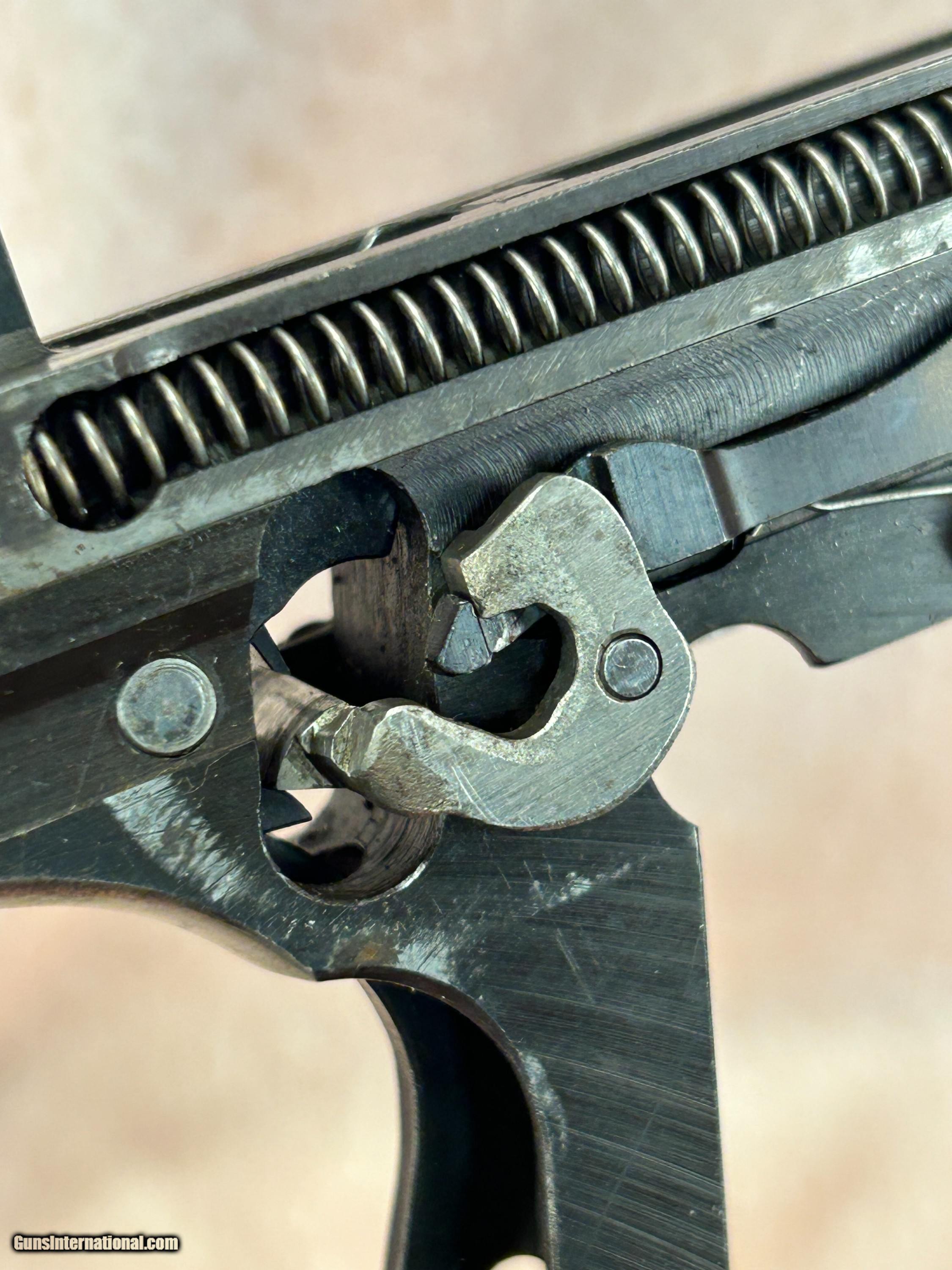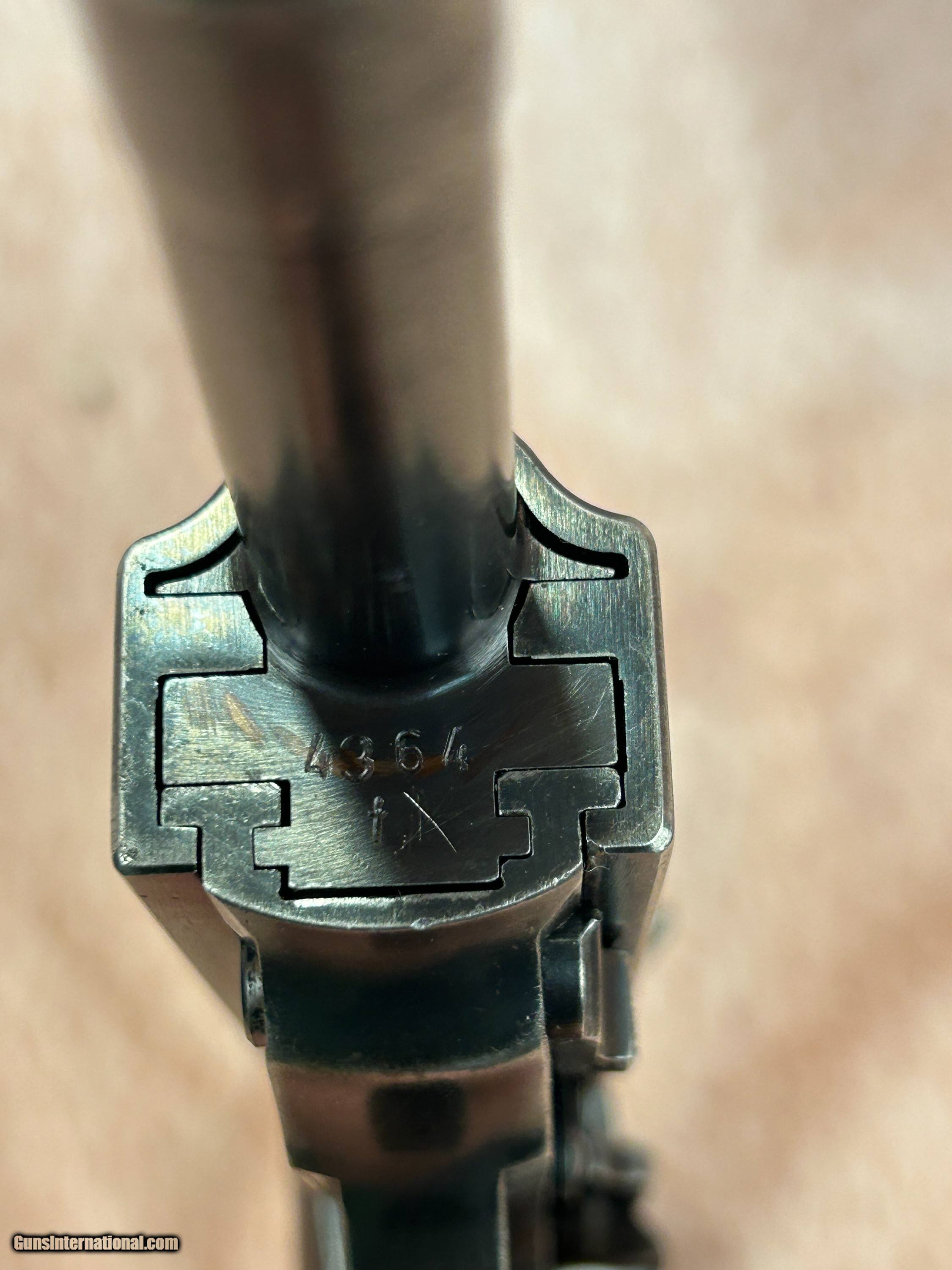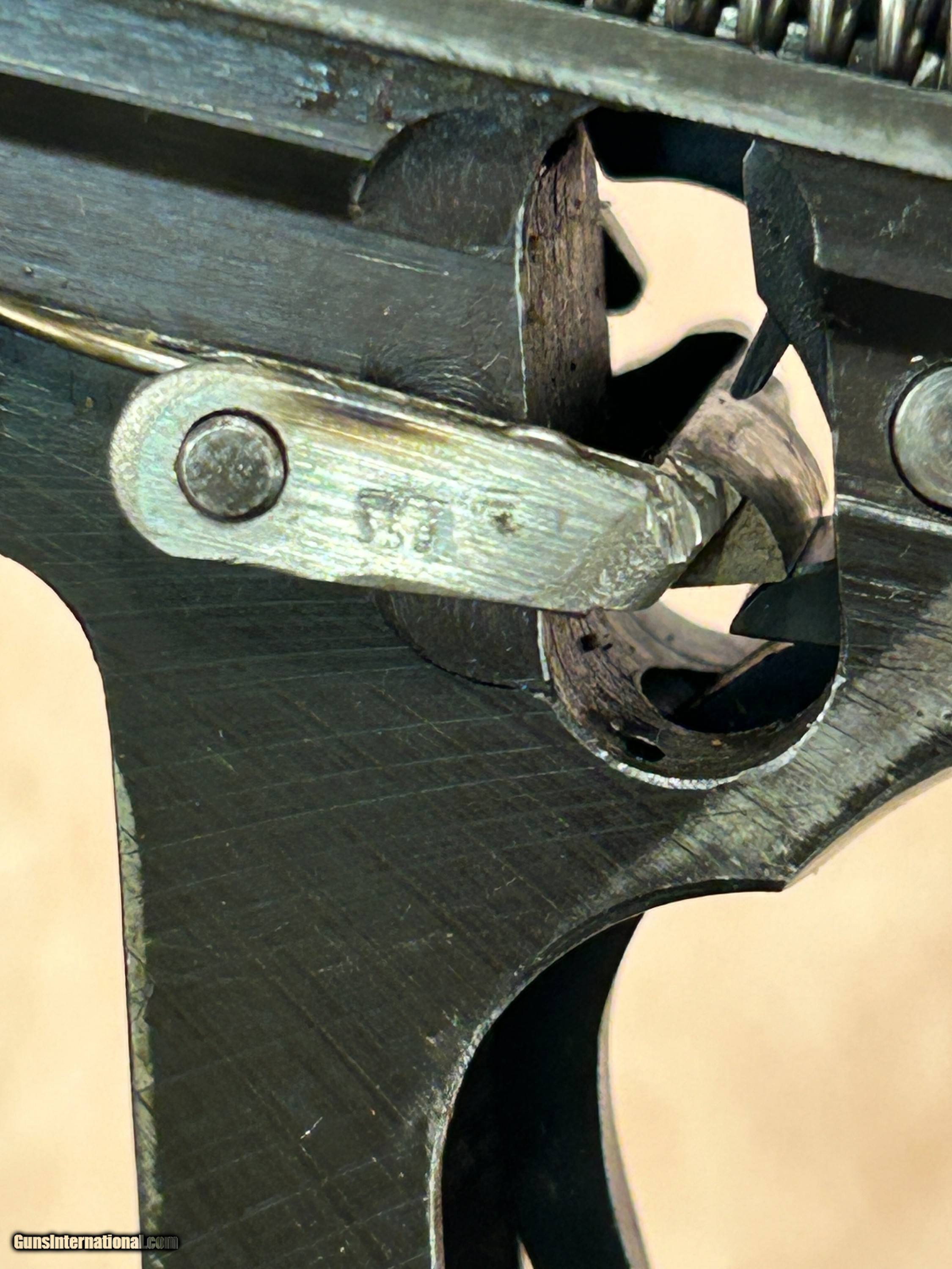 Description: For your consideration is a Walther P.38 AC41 pistol, serial number 4364f, manufactured in August 1941. The AC41 Second Variation was the last to have the high polish blue finish. The main noticeable difference from the First Variation was the omission of the company code “ac” from the front left trigger guard and barrel flat. This pistol also exhibits the rare “open” or “horseshoe” sear. These were made sporadically throughout the AC41 into early AC42 production. According to Buxton (see The P.38 Pistol, Volume 1, p171-172 and figure 4-67K) these sears were leftover experimental stock from the Zero-Series P.38s and later cycled into production. This one has the stamped E/359 Waffenamt, some were etched or engraved. This pistol features: