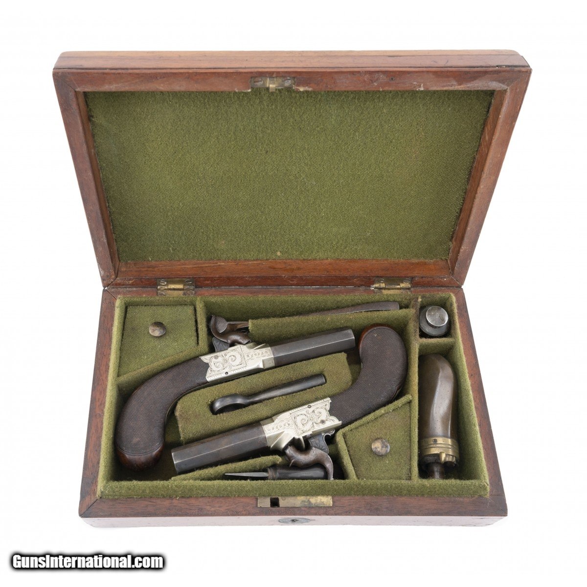 Pistols are percussion and have Birmingham proofs. Both pistols function perfectly. The cocks hold on full cock and the folding triggers extend and close properly. The frames are silver color and are likely and amalgam of what used to be referred to as ""German silver"". The frames are very nicely engraved in floral motifs. The left side of the pistols are marked ""Bentley"" and the right side ""London"". The wooden grips are finely checkered. The backs of the grips have inlaid silver diamonds with no initial or crest. The case contains a bullet mold, and a very dainty screwdriver. Very beautifully made. Barrels measure 2.25"" and overall length 6.25"". Very good plus to fine condition overall. A very fine set of muff pistols.