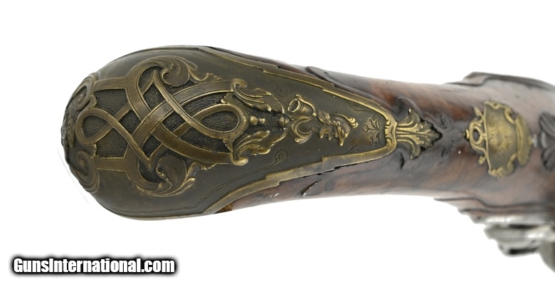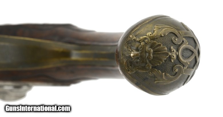 Description: " Pair of German Flintlock Pistol. Fine pair of Royal flintlock pistols. Marked “Walther a. Wasungen" on the locks. He is listed in Stockel as working in Wasungen (Thuringia) Germany 1710-1750 and a separate listing as Walter in 1735 also in Wasungen. The makers sink at the breech end of the barrels is Walter which would be the 1735 year listing. Bores are approximately .55 caliber. Barrel lengths are 12 inches overall length is 16 ½". The brass furniture is all engraved and chiseled not the less desirable casting method of metal embellishment. The top of the grip area is inlaid with a shield atop of which is a crown with a very small mother of pearl cross inlaid. The sideplate features a raised figure of a dog facing a fantasy figure of a sea creature also raised. Both of these figures are in excellent detail. The barrels are engraved with figures of a helmeted man and woman in the roman manner. The barrels, cocks and locks are “in the white". These pistols are superb examples of German craftmanship from the chiseling to the engraving to the carving. SOLD Antique: Yes |