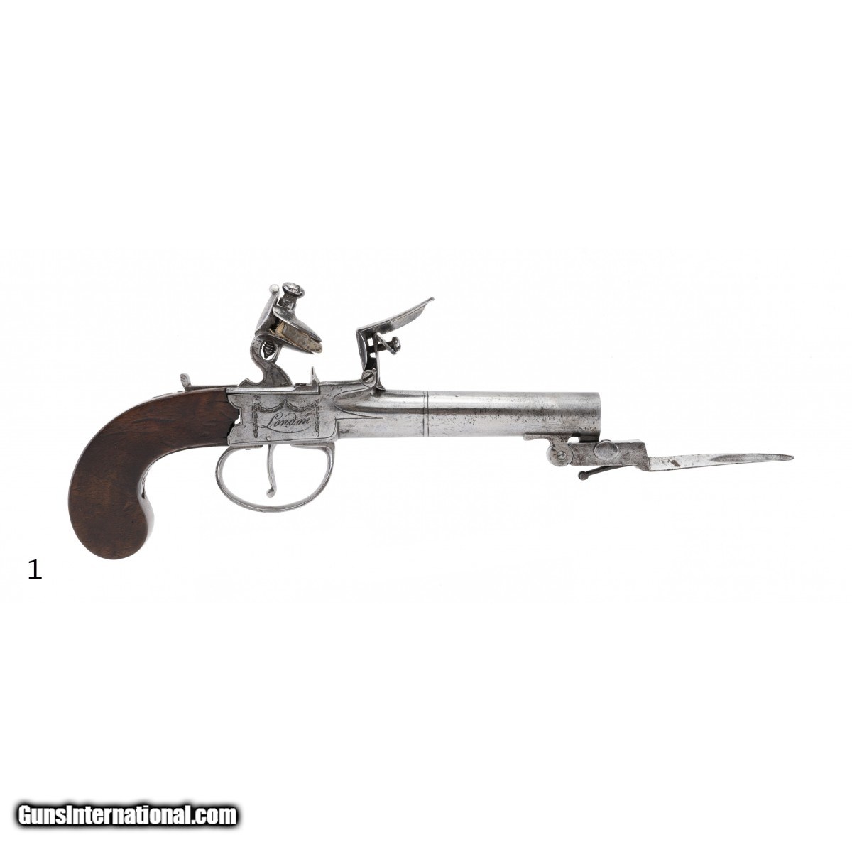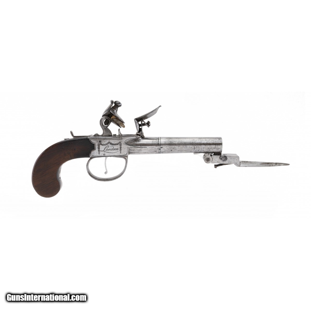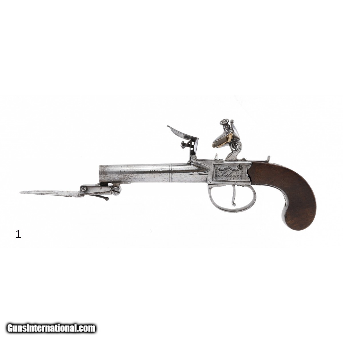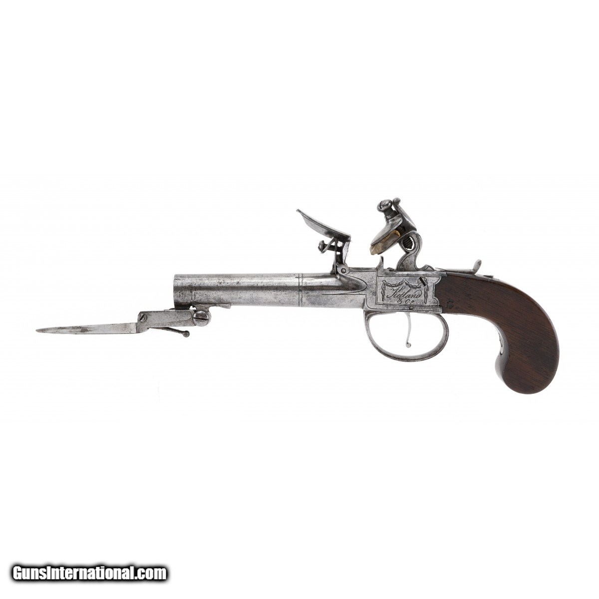 Description: " Pistols are marked ""Ketland & Company, London"". Barrels are 2.5"" and the overall length is 8"". Actions work perfectly including the sliding hammer safeties. Both bayonets work perfectly. Ketland & Co. was a prolific maker and seller of a wide variety of arms from 1785 to 1806. The stocks are both excellent. A very fine pair. Note: Use caution when operating the spring bayonets and be aware that they spring forward with some intensity. SOLD Antique: Yes |