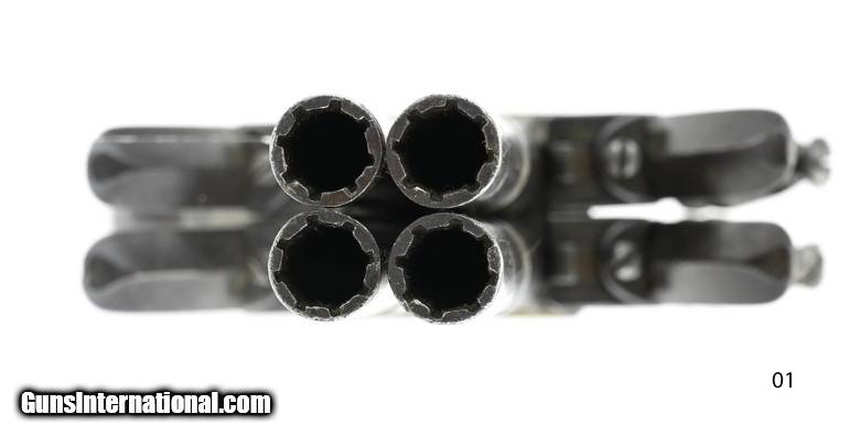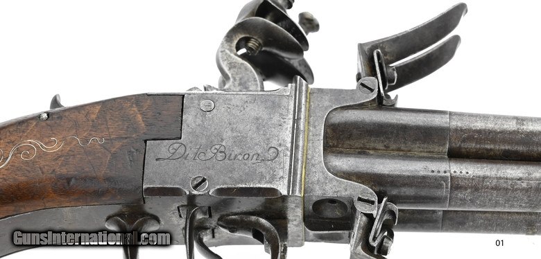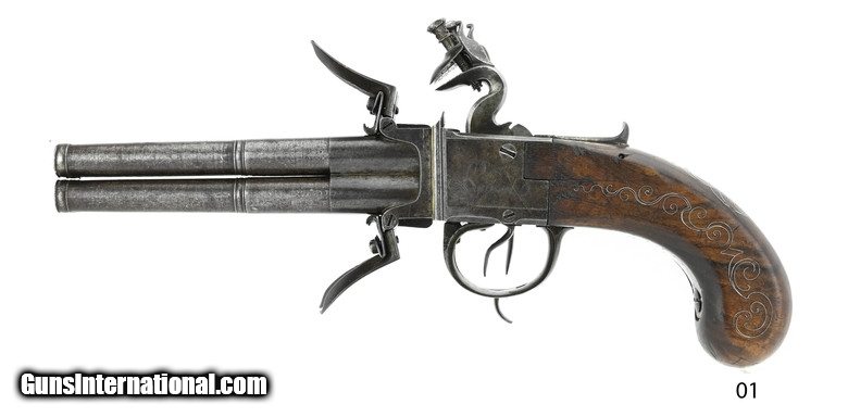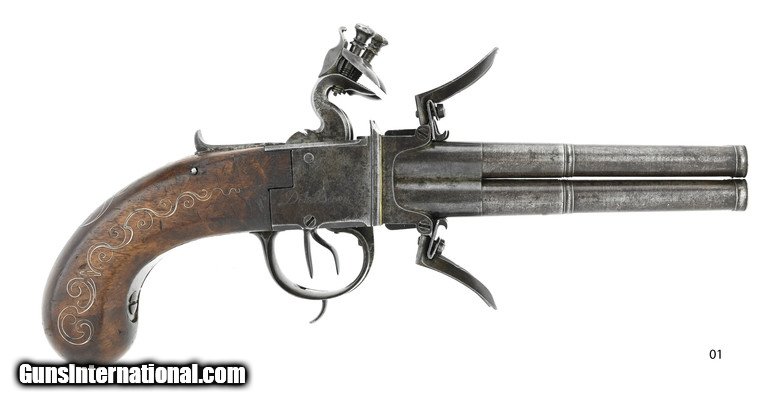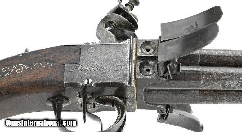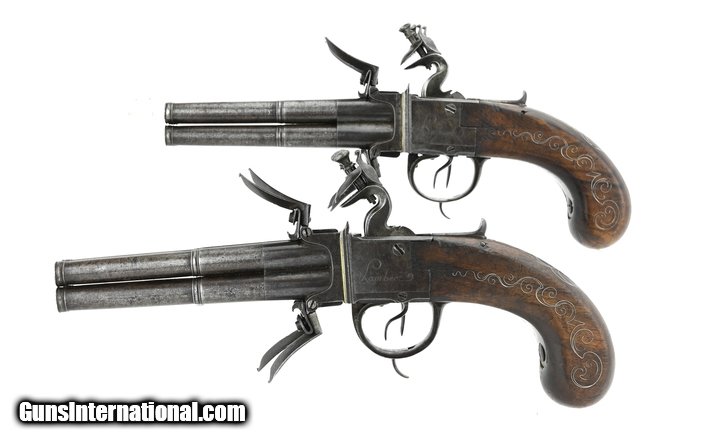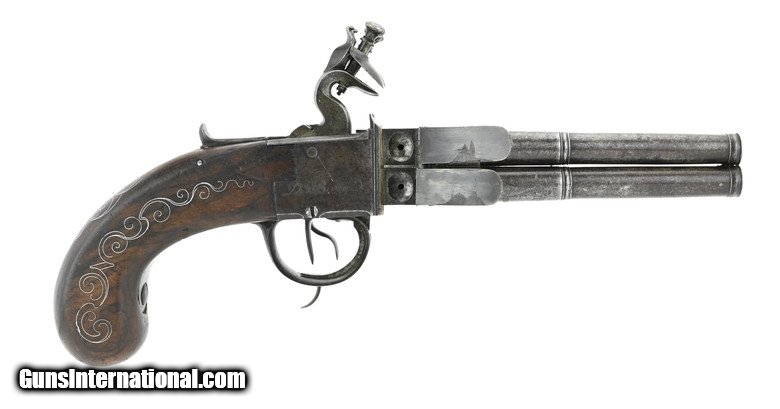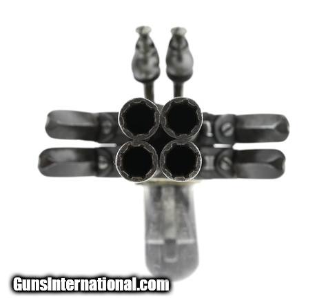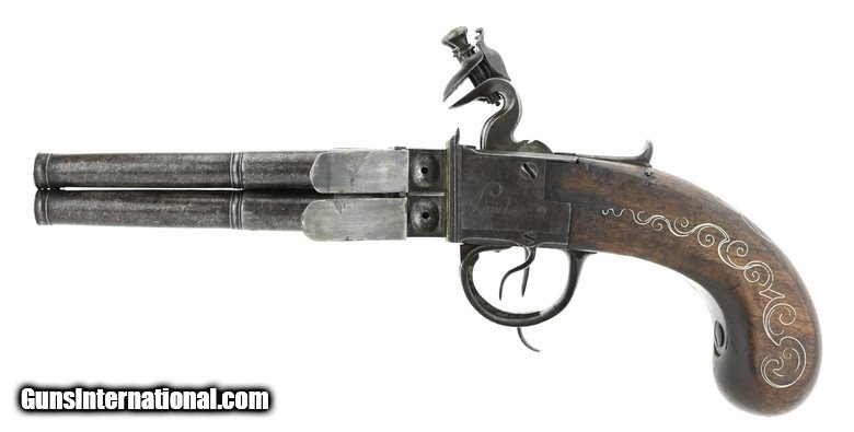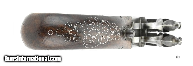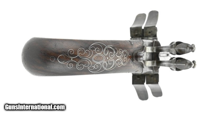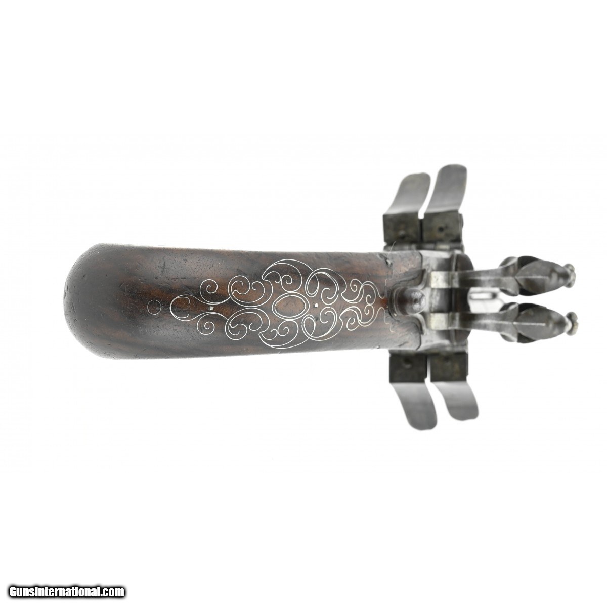 Description: " Rare Pair of Massive 4 Barrel Rotating Cluster Flintlock Pistols. By Lambert of Dit Biron Belgium. These pistols were in the collection of Harold Club Casino in Reno Nevada. In the photos of the gun collection the pair of Lambert pistols are featured in the catalog. Each pistol has 4 barrels and 4 Frizzlens. The barrels rotate by pushing a lever in the Trigger guard which allows the barrels to be manually rotated. Barrel clusters are 6 ¼" long. Overall length is 12 ¼". Barrels are .40 caliber each. Barrels are turn off type. Cocks have sliding safeties that range both cocks. Stocks are very good plus with silver wire inlays. These pistols are rare and possibly unique. We have not owned pistols such as these in 50 years of gun dealing. They are marvelous and would be a proud addition to any antique gun collection SOLD |