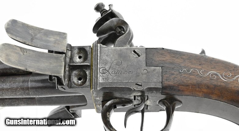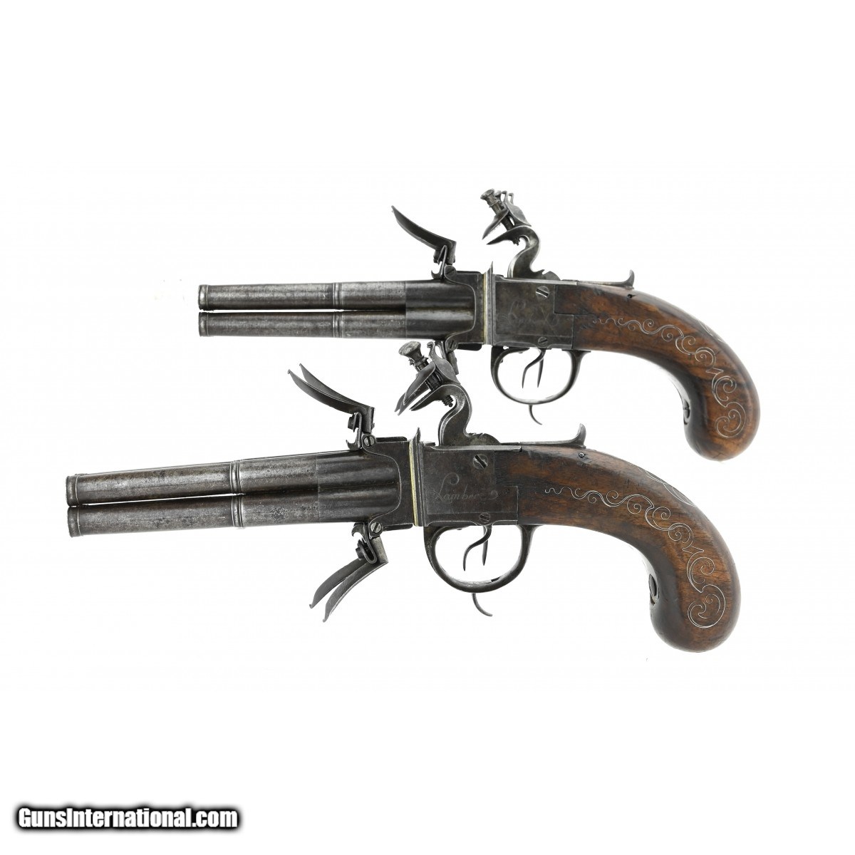 Rare Pair of Massive 4 Barrel Rotating Cluster Flintlock Pistols. By Lambert of Dit Biron Belgium. These pistols were in the collection of Harold Club Casino in Reno Nevada. In the photos of the gun collection the pair of Lambert pistols are featured in the catalog. Each pistol has 4 barrels and 4 Frizzlens. The barrels rotate by pushing a lever in the Trigger guard which allows the barrels to be manually rotated. Barrel clusters are 6 ¼" long. Overall length is 12 ¼". Barrels are .40 caliber each. Barrels are turn off type. Cocks have sliding safeties that range both cocks. Stocks are very good plus with silver wire inlays. These pistols are rare and possibly unique. We have not owned pistols such as these in 50 years of gun dealing. They are marvelous and would be a proud addition to any antique gun collection