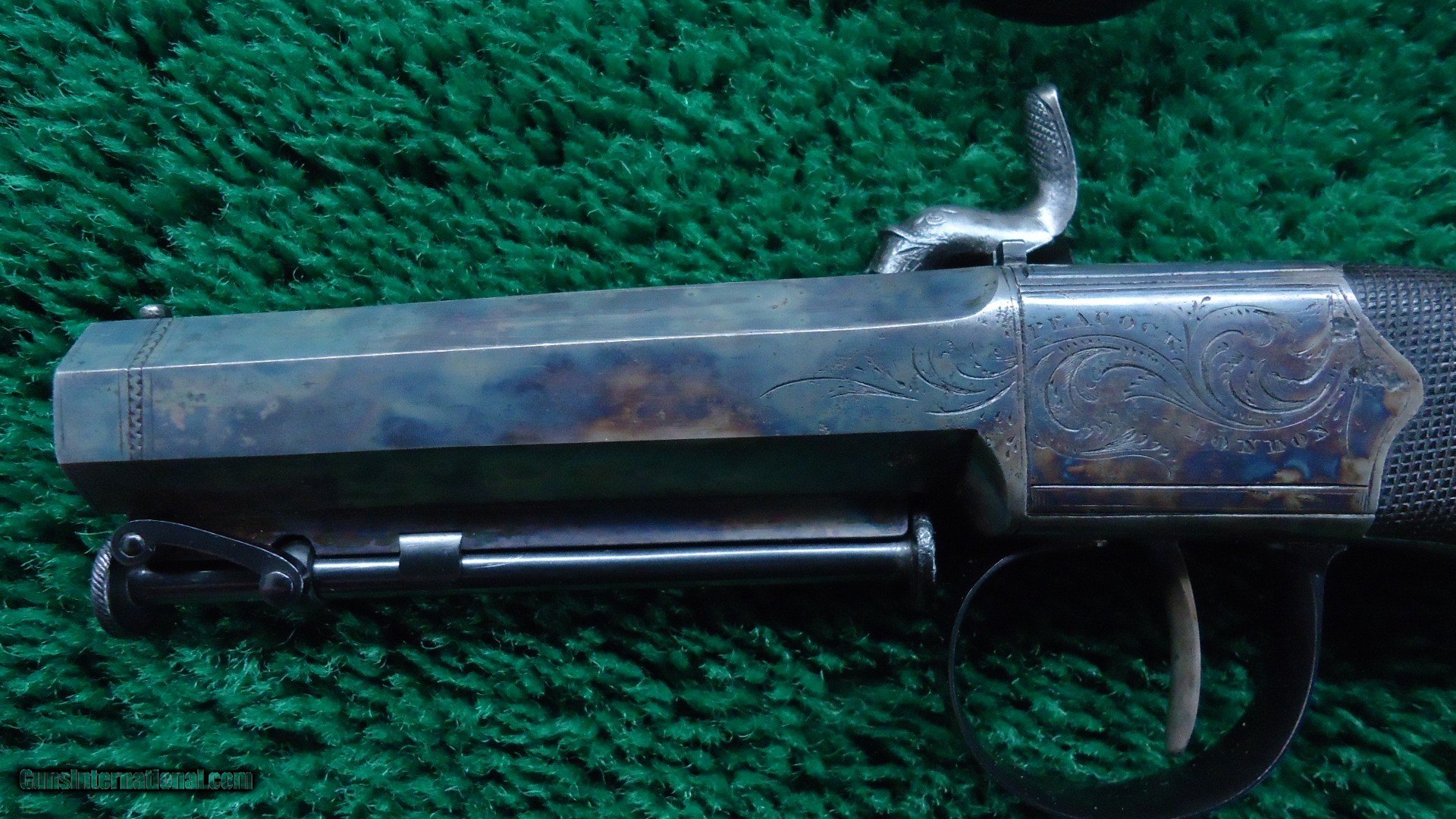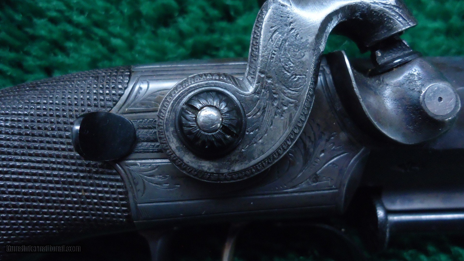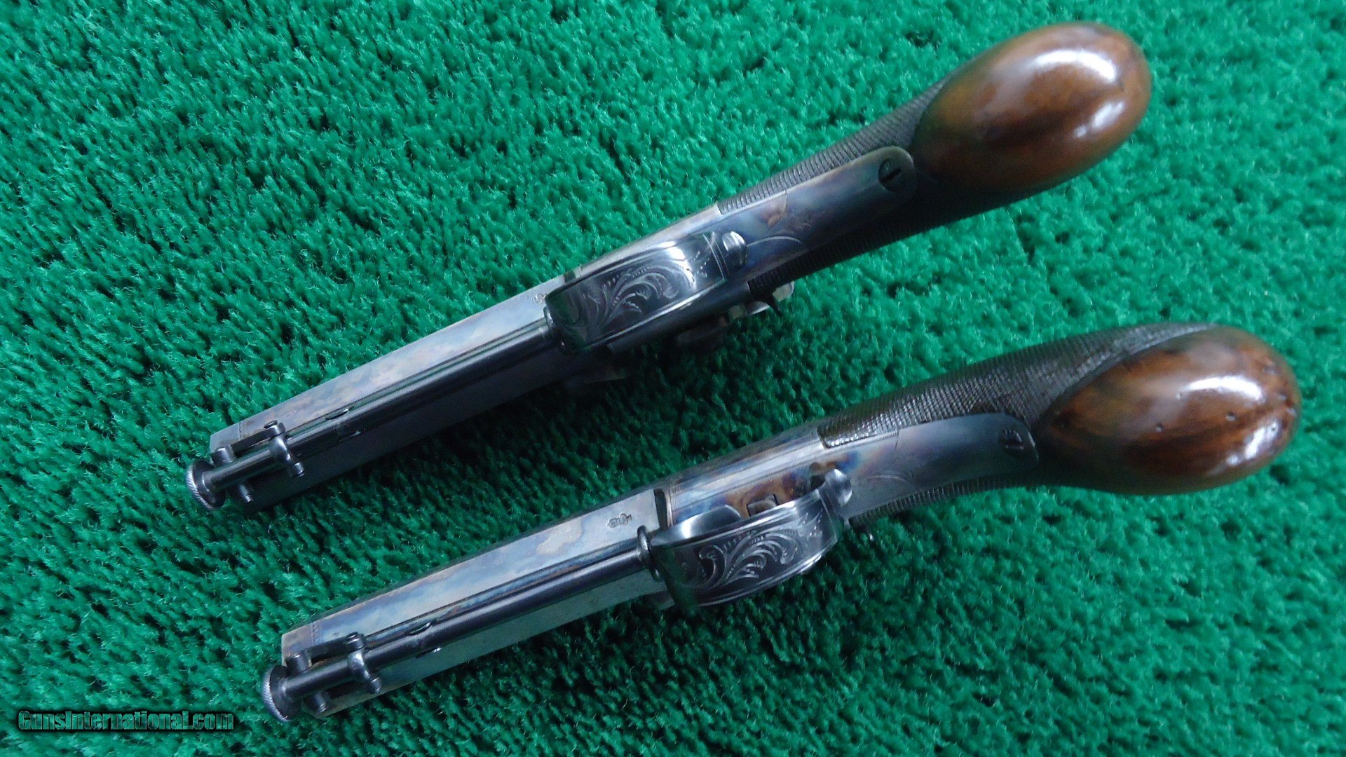 Description: 3-1/2 inch octagon barrels with dimming case colors and delicate engraving. Case colored frame is nicely engraved with most finish remaining. Engraved trigger guard is blued with most of that finish remaining. Nice checkered grips. Both have a swivel ramrod. Actions are excellent. These are fitted in a correct case with accoutrements. Case shows some minor wear. This is a nice pair of pistols. Leroy Merz Antique Firearms specializes in antique and vintage Winchesters and other fine American firearms. Since 1965 Mr. Merz has taken part in the world of firearms and has been a contributor to many well known reference books. We have hundreds of additional guns in every price range at our home online. Search for Merz Antiques in google. SOLD Antique: Yes |