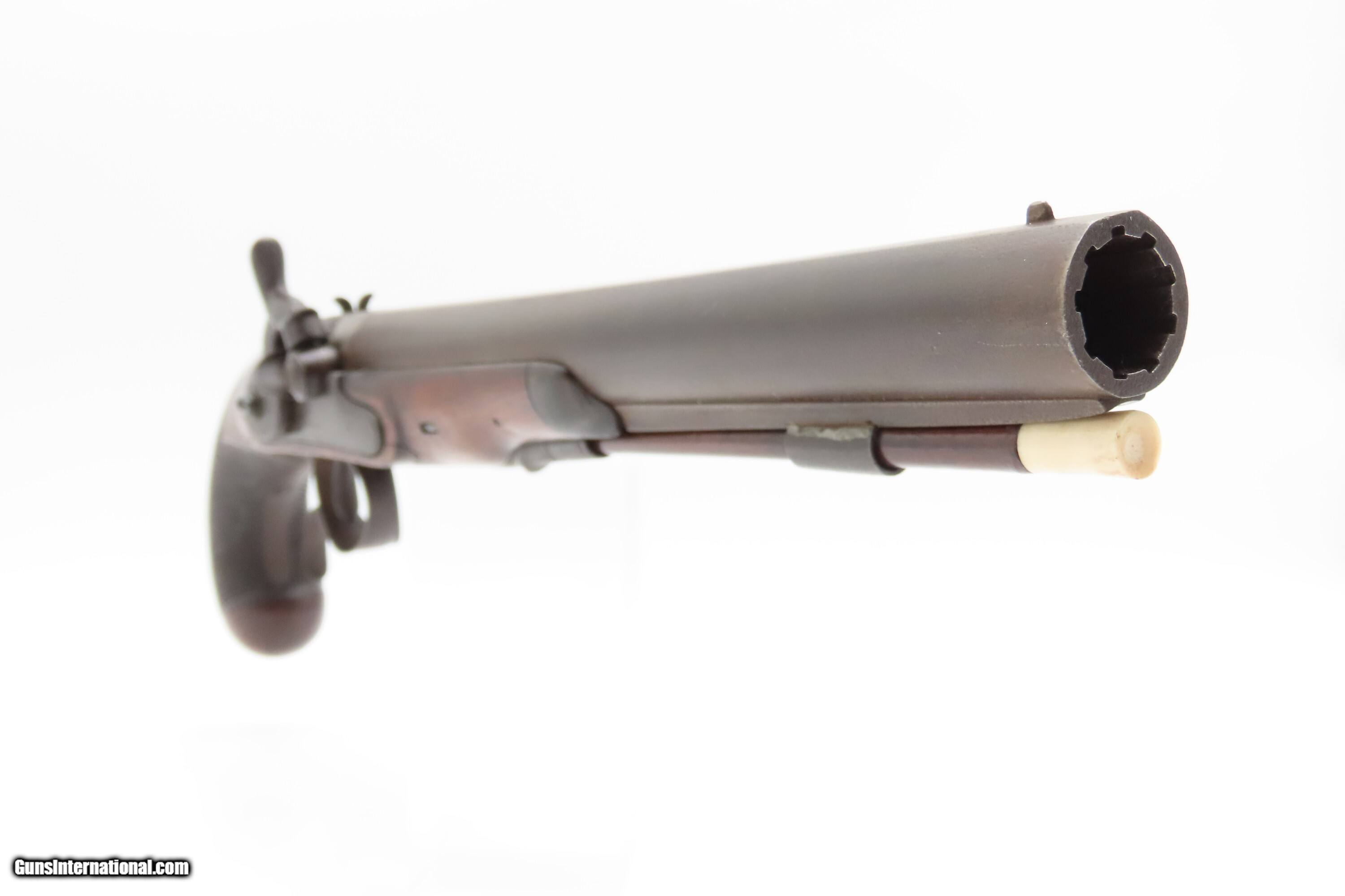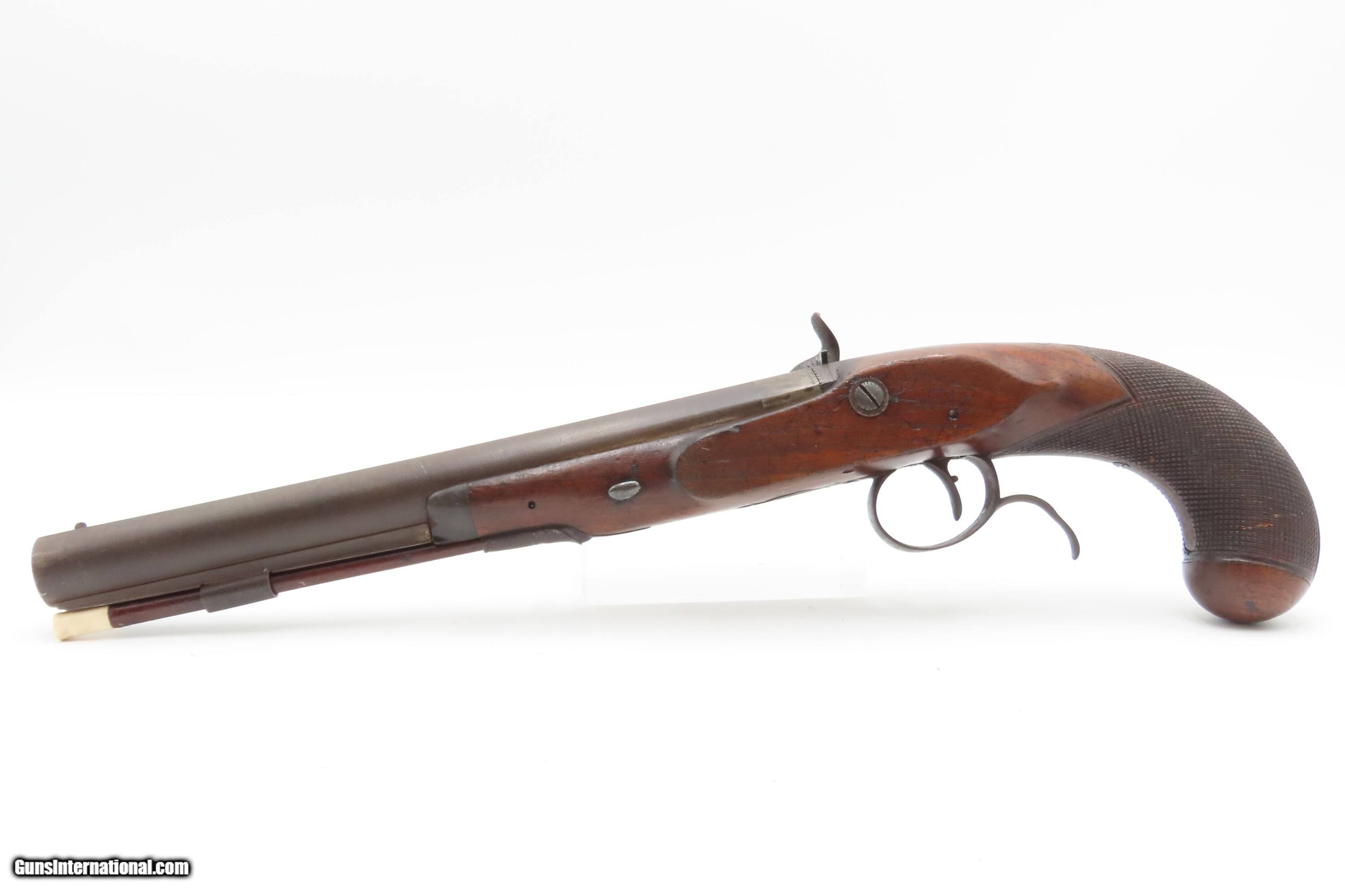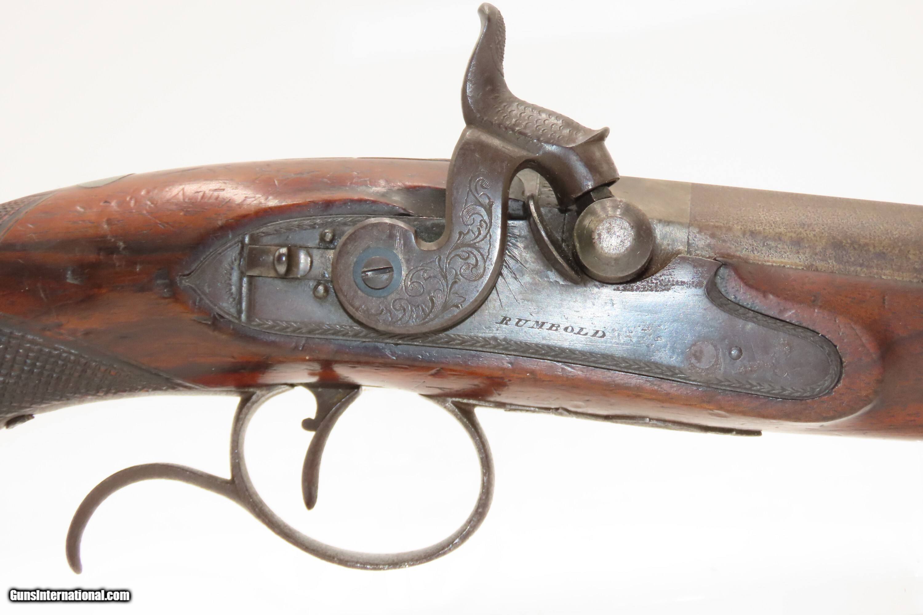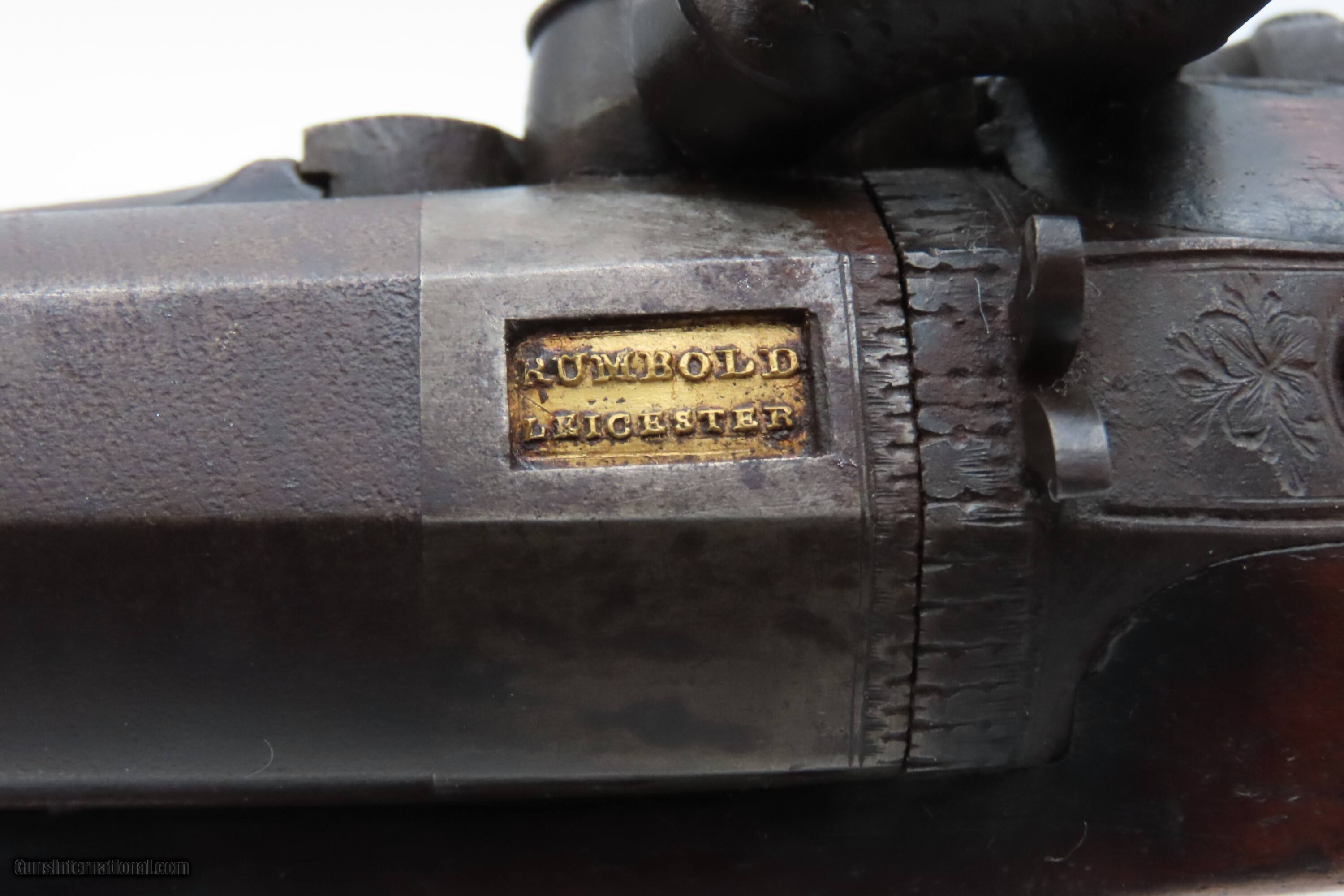 Description: Antique ENGRAVED PAIR British RUMBOLD Percussion DUELING/OFFICER’S Pistols Inscribed GOLD & SILVER ACCENTED Conversion Pistols Here Ancestry Guns presents an antique Engraved Pair of Gold and Silver Accented Rumbold Percussion Conversion Dueling Pistols, made circa the late 1700s to the early 1800s in Leicester, England. These would have started out life as flintlocks and converted when the more reliable percussion firing system was introduced, likely somewhere around the 1830s to the 1840s. Dueling pistols have a long history, symbolizing a time when honor was what people based their lives on. These pistols were designed for one purpose, which was deciding disputes when words failed. Throughout Europe and early America, dueling was a deadly tradition that truly shaped history. The pistols themselves became legendary, often linked to dramatic confrontations where skill, nerve, and fate collided. Each of these played a role in moments where lives and reputations hung in the balance, leaving a lasting mark on history. For a great example, look how United States history was impacted by Alexander Hamilton. Purpose-built dueling pistols have various improvements to make them more reliable and accurate, such as longer and heavier barrels, spurs on the trigger guards, saw handles, platinum-lined touch-holes on the flintlock, and hair triggers. All component parts were manufactured, hand-finished and then adjusted with great care and precision, which made dueling pistols much more costly than standard firearms of the period. Special care was taken when molding the lead bullets to ensure that there were no voids which would affect accuracy. Pistols were carefully and identically loaded, and each duelist was offered his choice of the indistinguishable loaded pistols. As duels were generally fought at short distances which were paced out, typically 35 to 45 feet between stationary opponents, extreme accuracy was not required. Here are two nice examples of British craftsmanship. Both of these pistols are matching and nicely engraved, with gold & silver accents, and checkered grips. There are gold lined sunken “RUMBOLD/ LEICESTER” maker's mark on the breech plugs, and the locks are signed “RUMBOLD.” The silver wrist escutcheons are inscribed “JB”. The overall condition of both pistols is fine. Both actions are strong. Original dark patinas. Both bores have dimmed but retain some shimmer and hold strong rifling. Markings are legible. Sharply checkering grips. The wood is in good shape with average wear, cracks, and dings. Own the original! This is a legitimate antique and not a reproduction. Barrels are 9-1/2 inches. Caliber: .65 Percussion Conversion Overall condition as seen in photos. Very Fast. Very Safe. FREE SHIPPING WORLDWIDE. Delivered directly to your door by express mail! Guaranteed AUTHENTIC & Includes CERTIFICATE OF AUTHENTICITY. $5100 #259660 Antique: Yes Price: $5,100.00 Buy Now Pay with