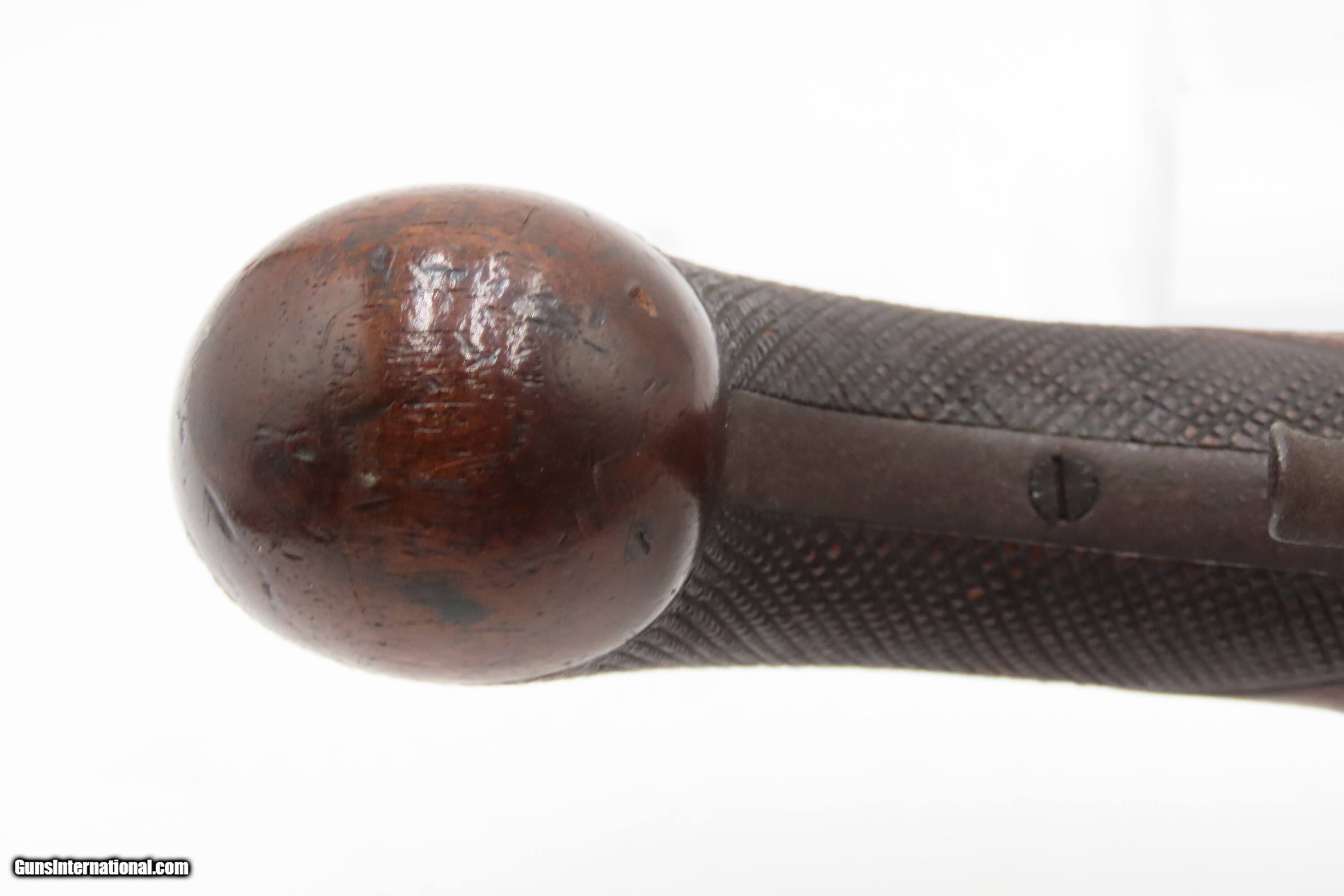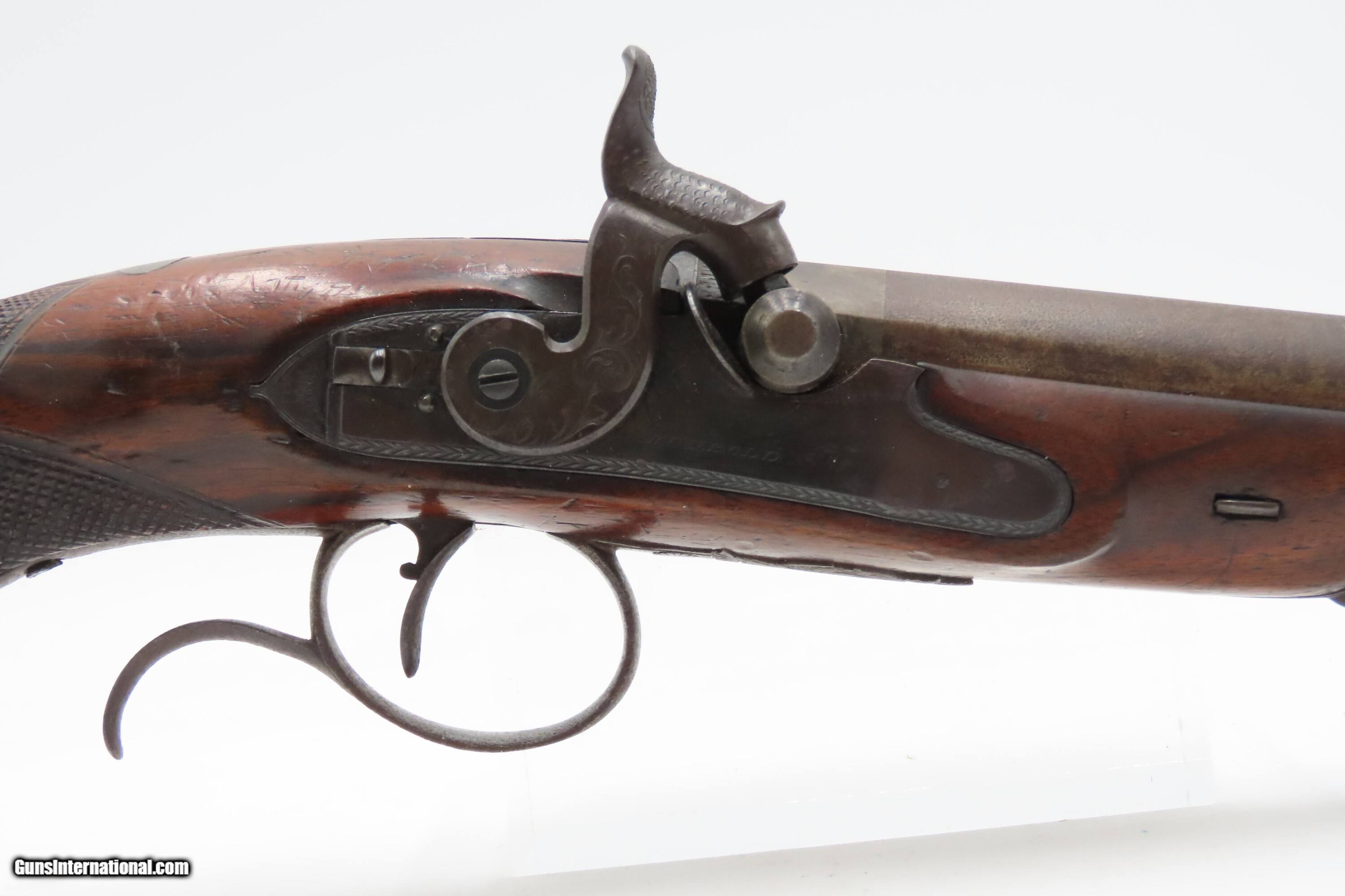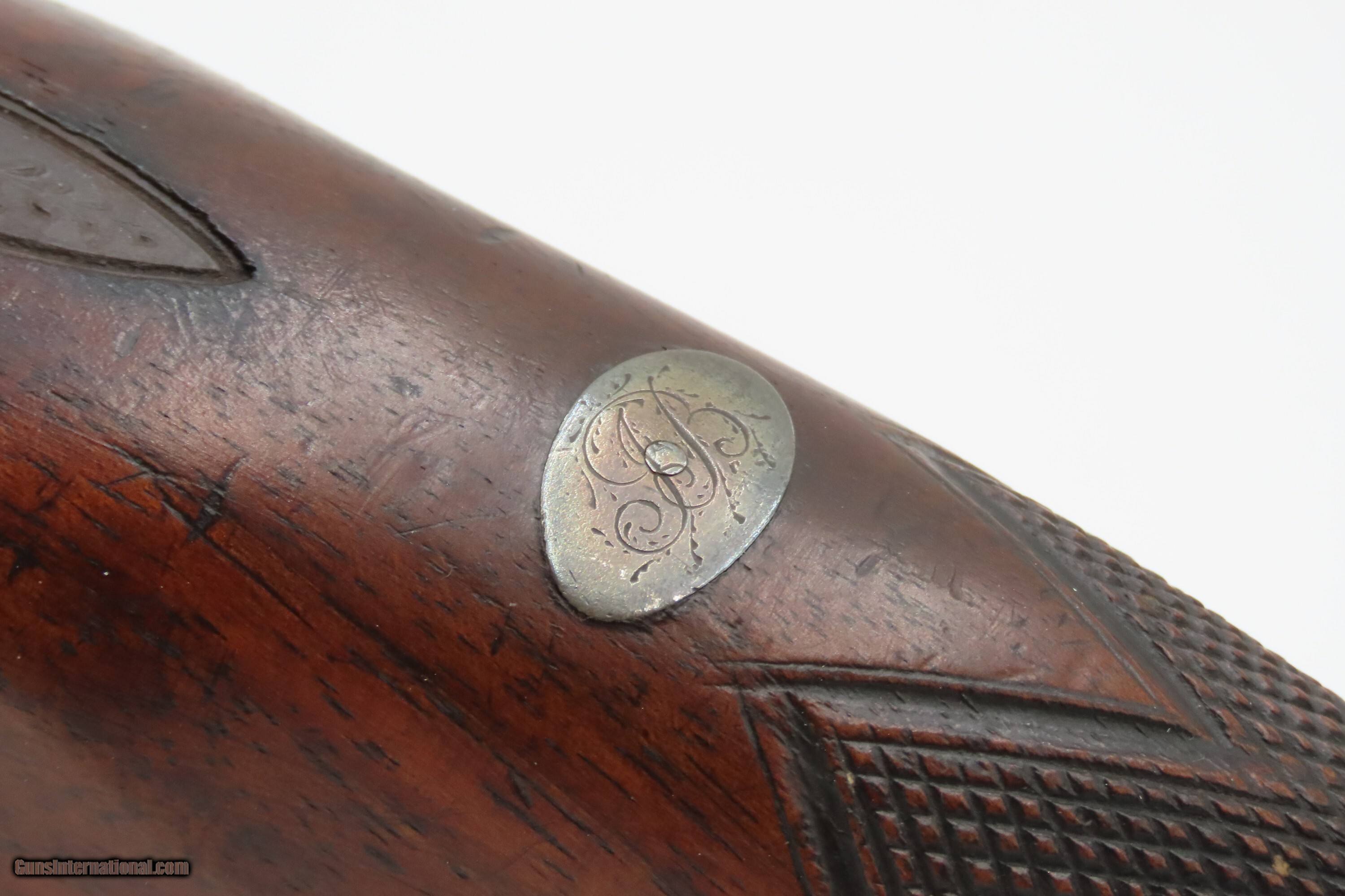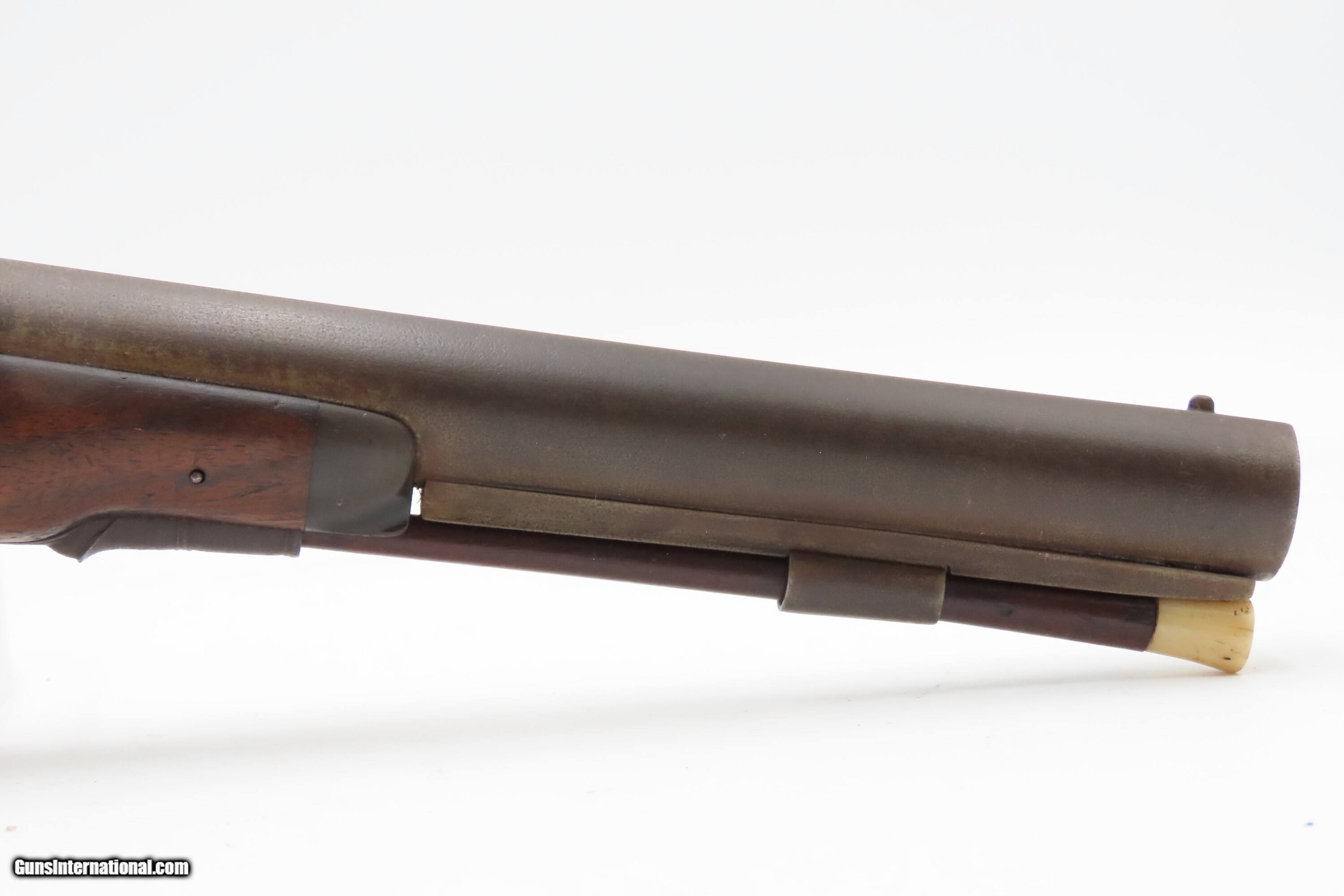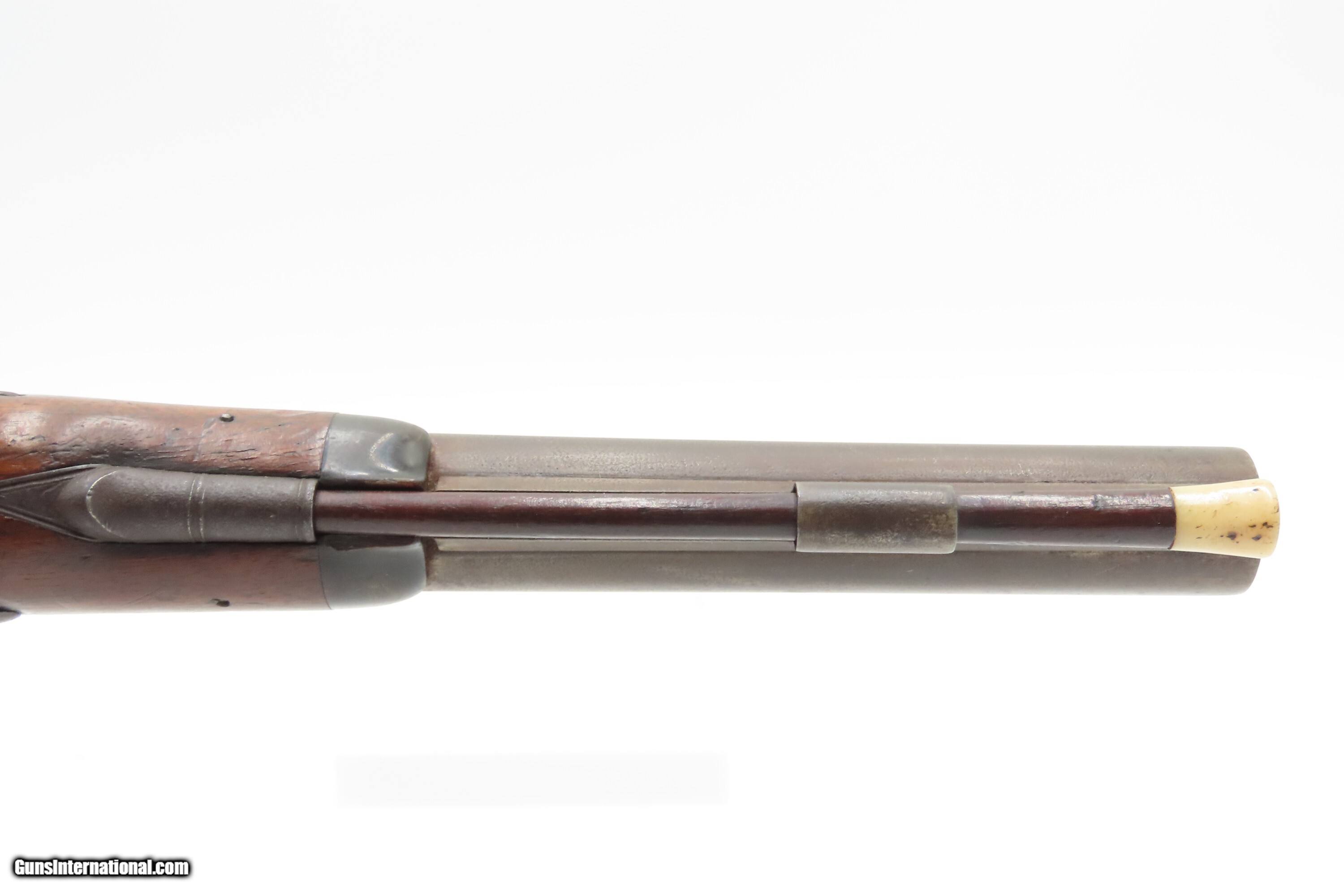 Description: Antique ENGRAVED PAIR British RUMBOLD Percussion DUELING/OFFICER’S Pistols Inscribed GOLD & SILVER ACCENTED Conversion Pistols Here Ancestry Guns presents an antique Engraved Pair of Gold and Silver Accented Rumbold Percussion Conversion Dueling Pistols, made circa the late 1700s to the early 1800s in Leicester, England. These would have started out life as flintlocks and converted when the more reliable percussion firing system was introduced, likely somewhere around the 1830s to the 1840s. Dueling pistols have a long history, symbolizing a time when honor was what people based their lives on. These pistols were designed for one purpose, which was deciding disputes when words failed. Throughout Europe and early America, dueling was a deadly tradition that truly shaped history. The pistols themselves became legendary, often linked to dramatic confrontations where skill, nerve, and fate collided. Each of these played a role in moments where lives and reputations hung in the balance, leaving a lasting mark on history. For a great example, look how United States history was impacted by Alexander Hamilton. Purpose-built dueling pistols have various improvements to make them more reliable and accurate, such as longer and heavier barrels, spurs on the trigger guards, saw handles, platinum-lined touch-holes on the flintlock, and hair triggers. All component parts were manufactured, hand-finished and then adjusted with great care and precision, which made dueling pistols much more costly than standard firearms of the period. Special care was taken when molding the lead bullets to ensure that there were no voids which would affect accuracy. Pistols were carefully and identically loaded, and each duelist was offered his choice of the indistinguishable loaded pistols. As duels were generally fought at short distances which were paced out, typically 35 to 45 feet between stationary opponents, extreme accuracy was not required. Here are two nice examples of British craftsmanship. Both of these pistols are matching and nicely engraved, with gold & silver accents, and checkered grips. There are gold lined sunken “RUMBOLD/ LEICESTER” maker's mark on the breech plugs, and the locks are signed “RUMBOLD.” The silver wrist escutcheons are inscribed “JB”. The overall condition of both pistols is fine. Both actions are strong. Original dark patinas. Both bores have dimmed but retain some shimmer and hold strong rifling. Markings are legible. Sharply checkering grips. The wood is in good shape with average wear, cracks, and dings. Own the original! This is a legitimate antique and not a reproduction. Barrels are 9-1/2 inches. Caliber: .65 Percussion Conversion Overall condition as seen in photos. Very Fast. Very Safe. FREE SHIPPING WORLDWIDE. Delivered directly to your door by express mail! Guaranteed AUTHENTIC & Includes CERTIFICATE OF AUTHENTICITY. $5100 #259660 Antique: Yes Price: $5,100.00 Buy Now Pay with