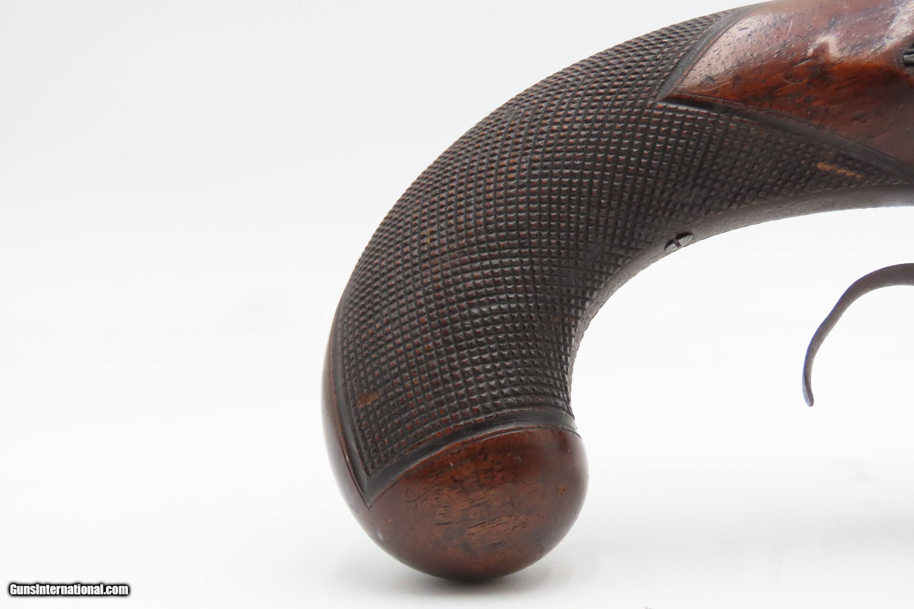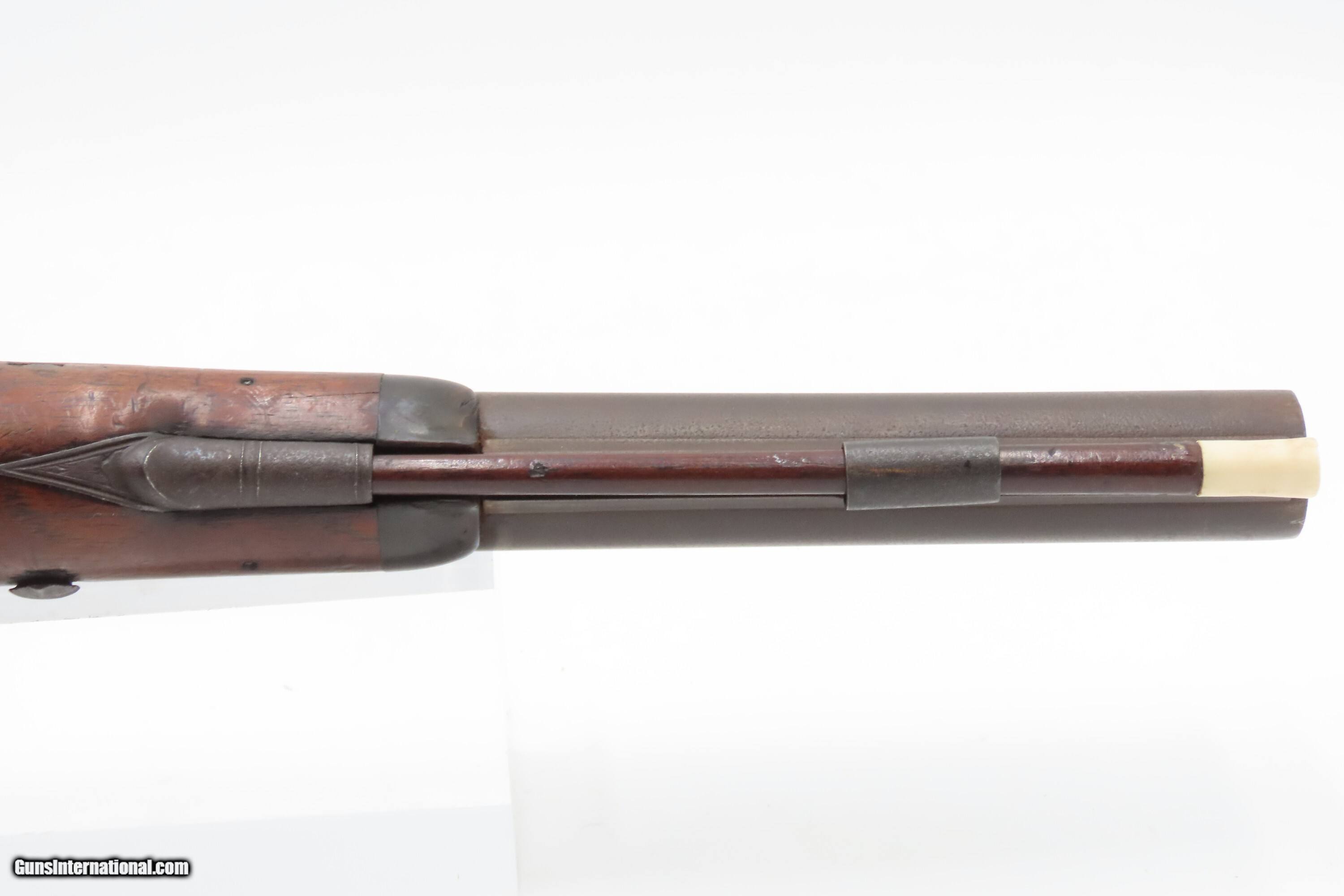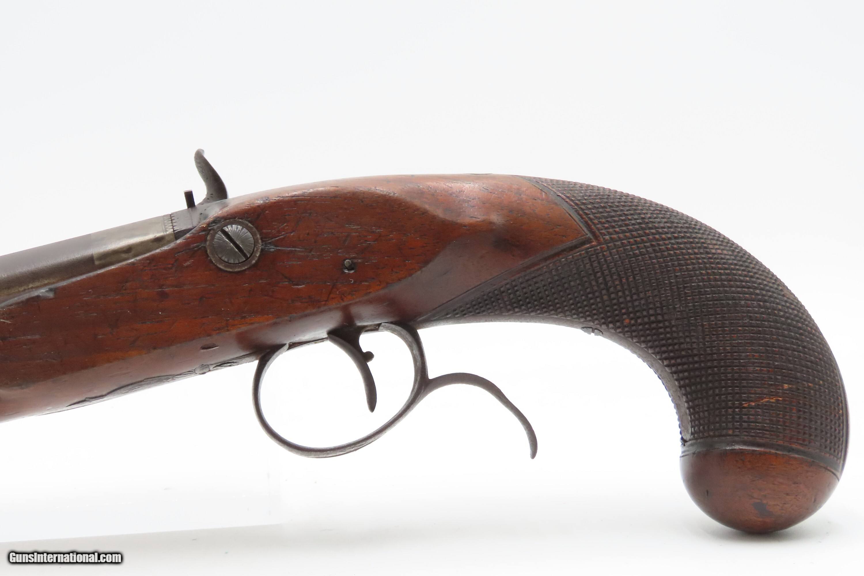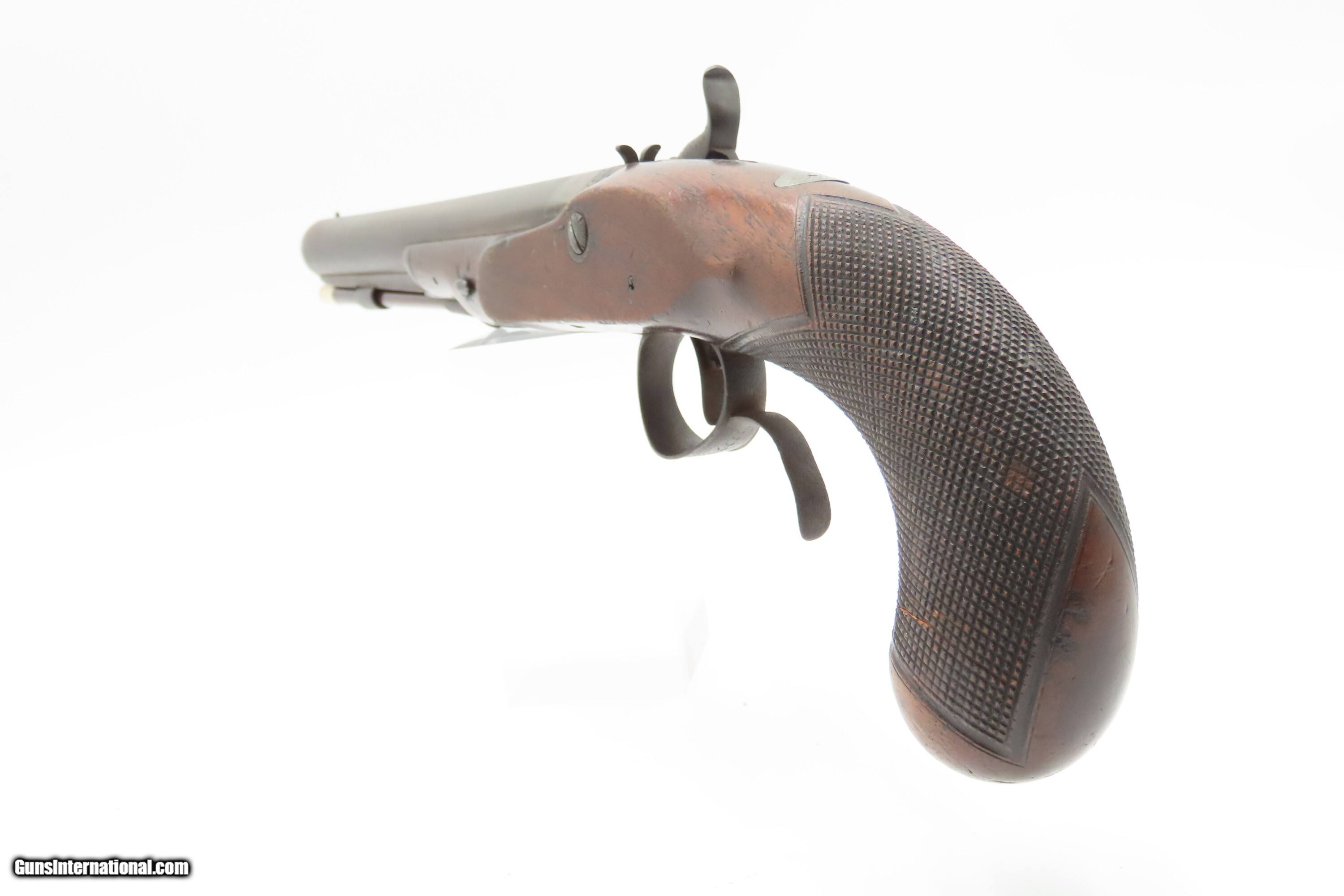 Description: Antique ENGRAVED PAIR British RUMBOLD Percussion DUELING/OFFICER’S Pistols Inscribed GOLD & SILVER ACCENTED Conversion Pistols Here Ancestry Guns presents an antique Engraved Pair of Gold and Silver Accented Rumbold Percussion Conversion Dueling Pistols, made circa the late 1700s to the early 1800s in Leicester, England. These would have started out life as flintlocks and converted when the more reliable percussion firing system was introduced, likely somewhere around the 1830s to the 1840s. Dueling pistols have a long history, symbolizing a time when honor was what people based their lives on. These pistols were designed for one purpose, which was deciding disputes when words failed. Throughout Europe and early America, dueling was a deadly tradition that truly shaped history. The pistols themselves became legendary, often linked to dramatic confrontations where skill, nerve, and fate collided. Each of these played a role in moments where lives and reputations hung in the balance, leaving a lasting mark on history. For a great example, look how United States history was impacted by Alexander Hamilton. Purpose-built dueling pistols have various improvements to make them more reliable and accurate, such as longer and heavier barrels, spurs on the trigger guards, saw handles, platinum-lined touch-holes on the flintlock, and hair triggers. All component parts were manufactured, hand-finished and then adjusted with great care and precision, which made dueling pistols much more costly than standard firearms of the period. Special care was taken when molding the lead bullets to ensure that there were no voids which would affect accuracy. Pistols were carefully and identically loaded, and each duelist was offered his choice of the indistinguishable loaded pistols. As duels were generally fought at short distances which were paced out, typically 35 to 45 feet between stationary opponents, extreme accuracy was not required. Here are two nice examples of British craftsmanship. Both of these pistols are matching and nicely engraved, with gold & silver accents, and checkered grips. There are gold lined sunken “RUMBOLD/ LEICESTER” maker's mark on the breech plugs, and the locks are signed “RUMBOLD.” The silver wrist escutcheons are inscribed “JB”. The overall condition of both pistols is fine. Both actions are strong. Original dark patinas. Both bores have dimmed but retain some shimmer and hold strong rifling. Markings are legible. Sharply checkering grips. The wood is in good shape with average wear, cracks, and dings. Own the original! This is a legitimate antique and not a reproduction. Barrels are 9-1/2 inches. Caliber: .65 Percussion Conversion Overall condition as seen in photos. Very Fast. Very Safe. FREE SHIPPING WORLDWIDE. Delivered directly to your door by express mail! Guaranteed AUTHENTIC & Includes CERTIFICATE OF AUTHENTICITY. $5100 #259660 Antique: Yes Price: $5,100.00 Buy Now Pay with