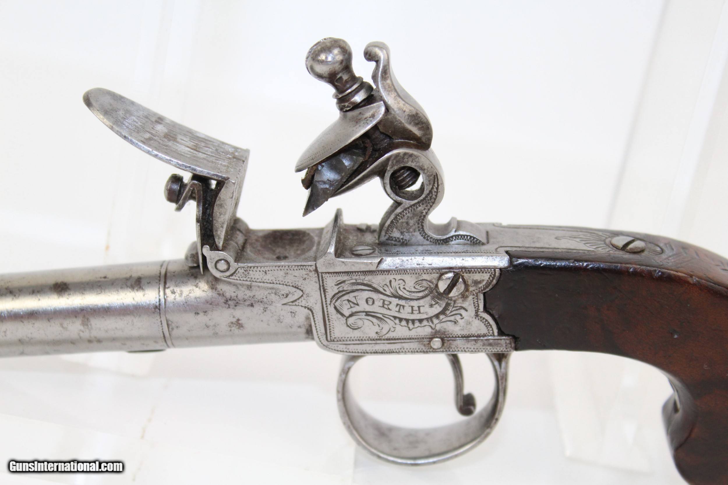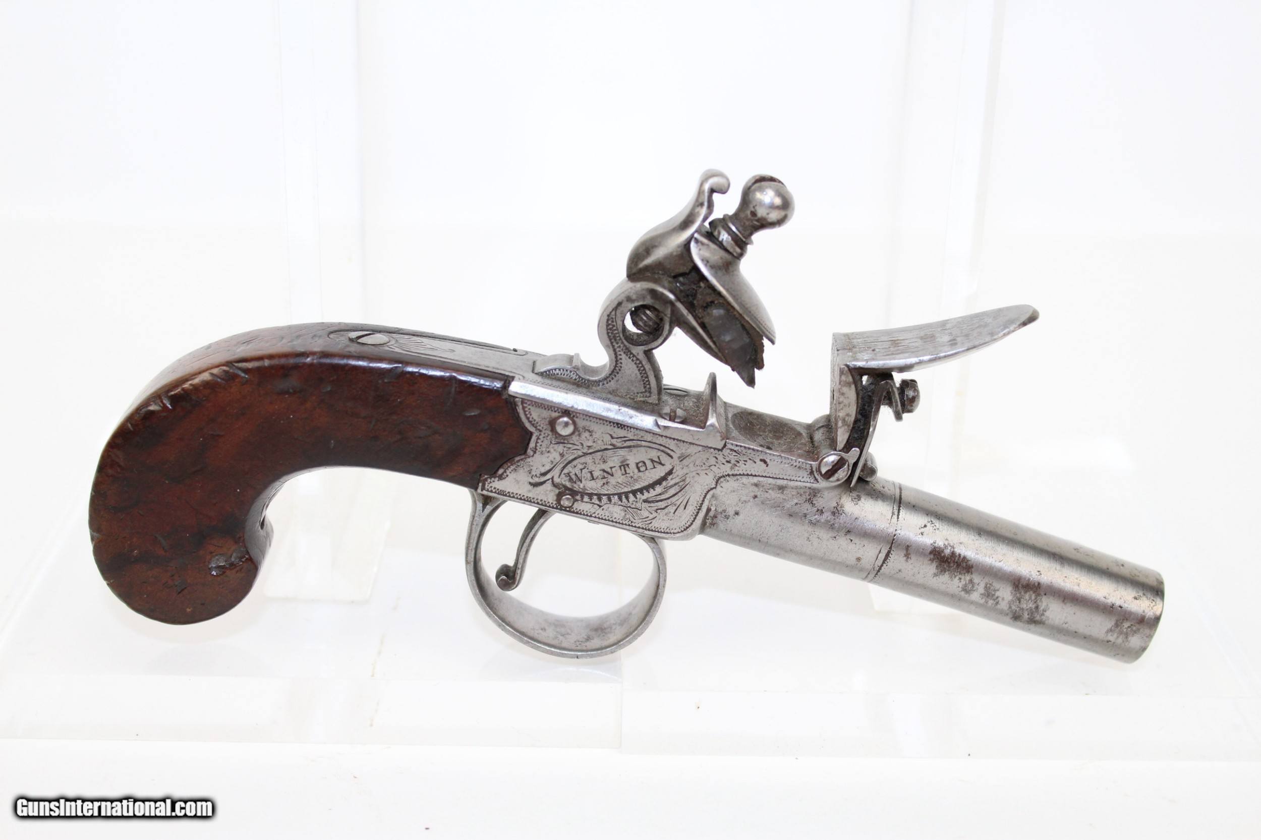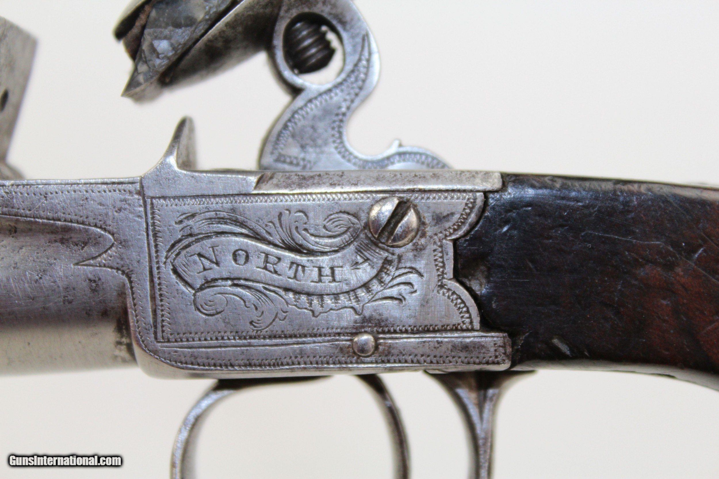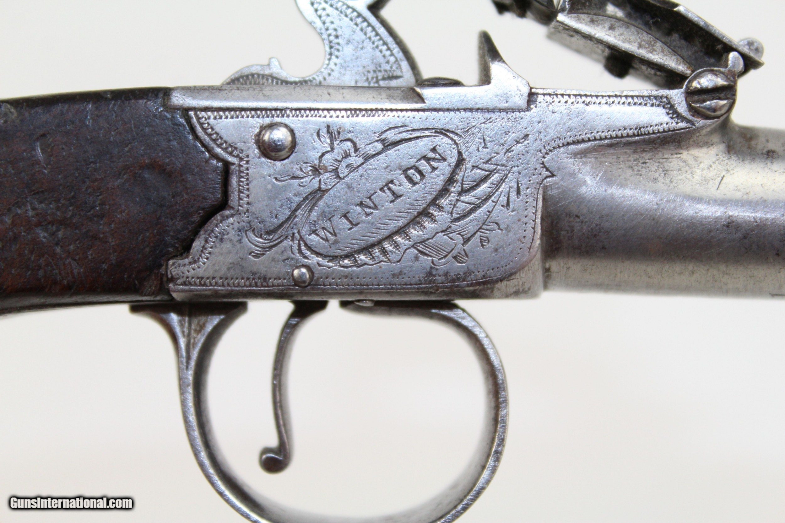 Description: BRACE of BRITISH Antique FLINTLOCK .44 Cal Pistols Made by North and Winton Here we present a Brace of Antique North Winton Flintlock Pistols, made England circa the early-19th Century. These pistols are small, light and simple. They would have been concealable in a pocket or a fur muff and been used for self defense on the streets of London. Bores are a large .44 caliber. The maker likely had the surname “North” and was in Winton in Southern England. On both of these pistols, the left side of the frame is marked “NORTH” and the right side is marked “WINTON”. The overall condition of both is good. The metal surfaces have a light gray patina. The markings are clear and legible. The grips are in good shape. The bores are clear and smooth. The action on these pistols are both strong. Own the original! This is a legitimate antique and not a reproduction. Barrel is 1-3/4 inches. Caliber: .44 Percussion Overall condition as seen in photos. Very Fast. Very Safe. FREE SHIPPING WORLDWIDE. Delivered directly to your door by express mail! Guaranteed AUTHENTIC & Includes CERTIFICATE OF AUTHENTICITY. ancestryguns $2100 #7423 SOLD Antique: Yes |