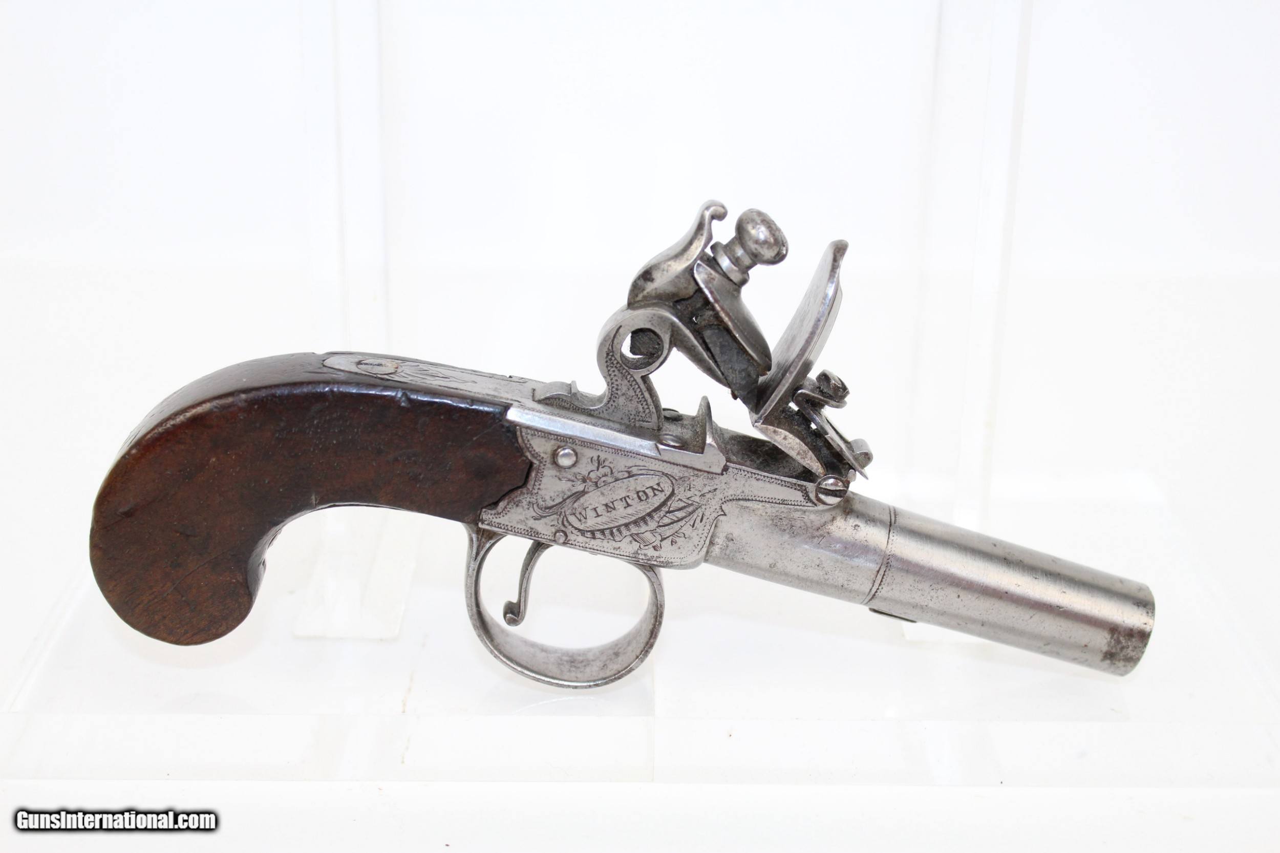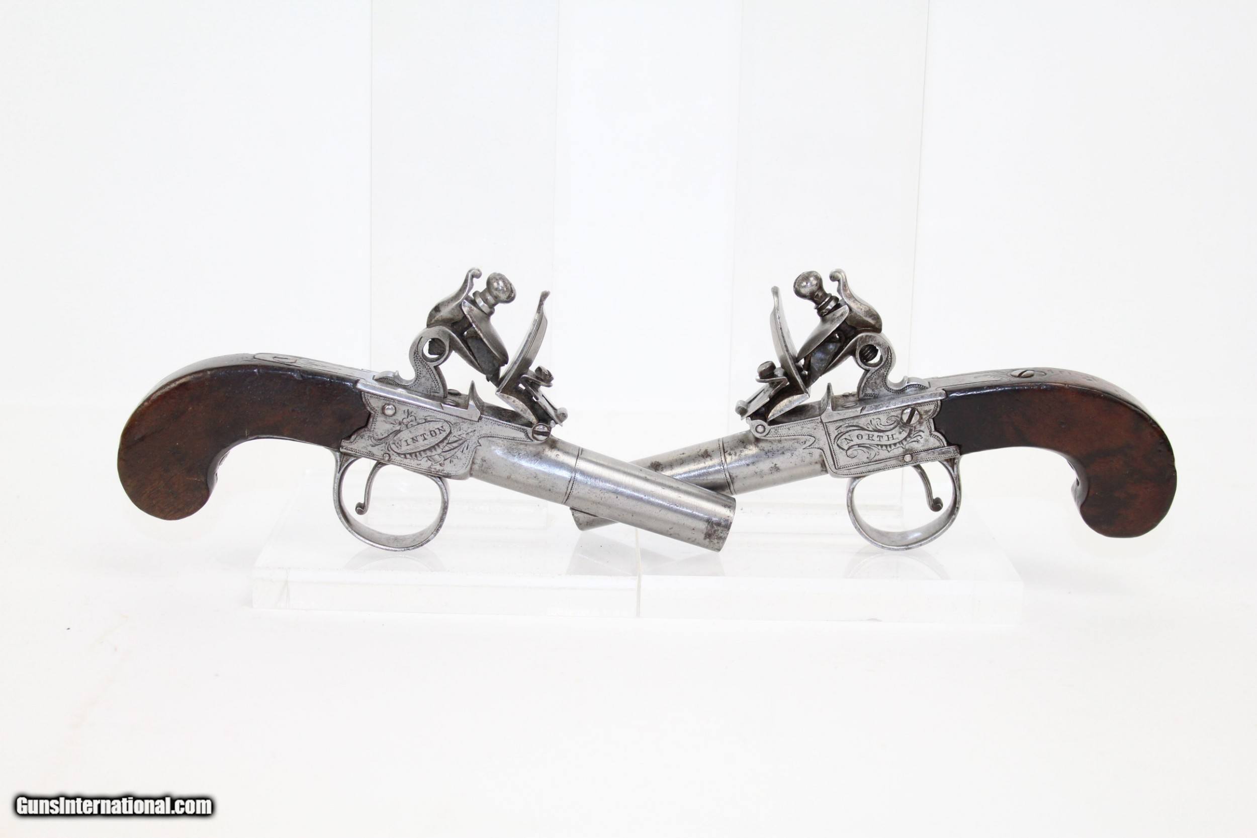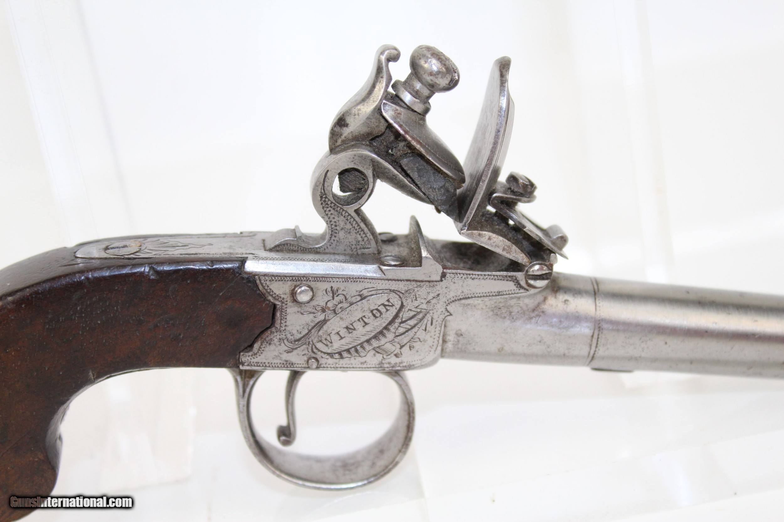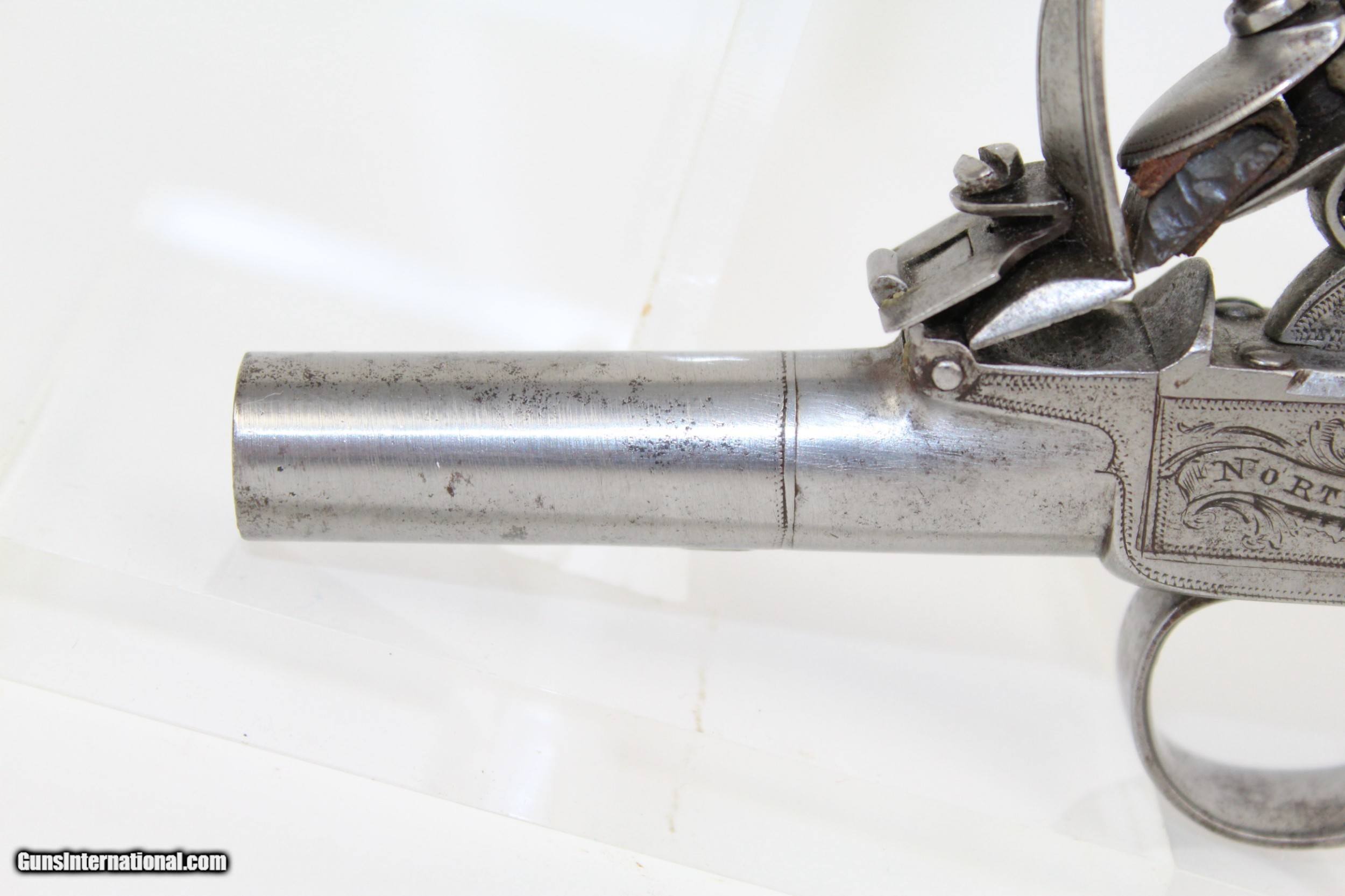 Description: BRACE of BRITISH Antique FLINTLOCK .44 Cal Pistols Made by North and Winton Here we present a Brace of Antique North Winton Flintlock Pistols, made England circa the early-19th Century. These pistols are small, light and simple. They would have been concealable in a pocket or a fur muff and been used for self defense on the streets of London. Bores are a large .44 caliber. The maker likely had the surname “North” and was in Winton in Southern England. On both of these pistols, the left side of the frame is marked “NORTH” and the right side is marked “WINTON”. The overall condition of both is good. The metal surfaces have a light gray patina. The markings are clear and legible. The grips are in good shape. The bores are clear and smooth. The action on these pistols are both strong. Own the original! This is a legitimate antique and not a reproduction. Barrel is 1-3/4 inches. Caliber: .44 Percussion Overall condition as seen in photos. Very Fast. Very Safe. FREE SHIPPING WORLDWIDE. Delivered directly to your door by express mail! Guaranteed AUTHENTIC & Includes CERTIFICATE OF AUTHENTICITY. ancestryguns $2100 #7423 SOLD Antique: Yes |