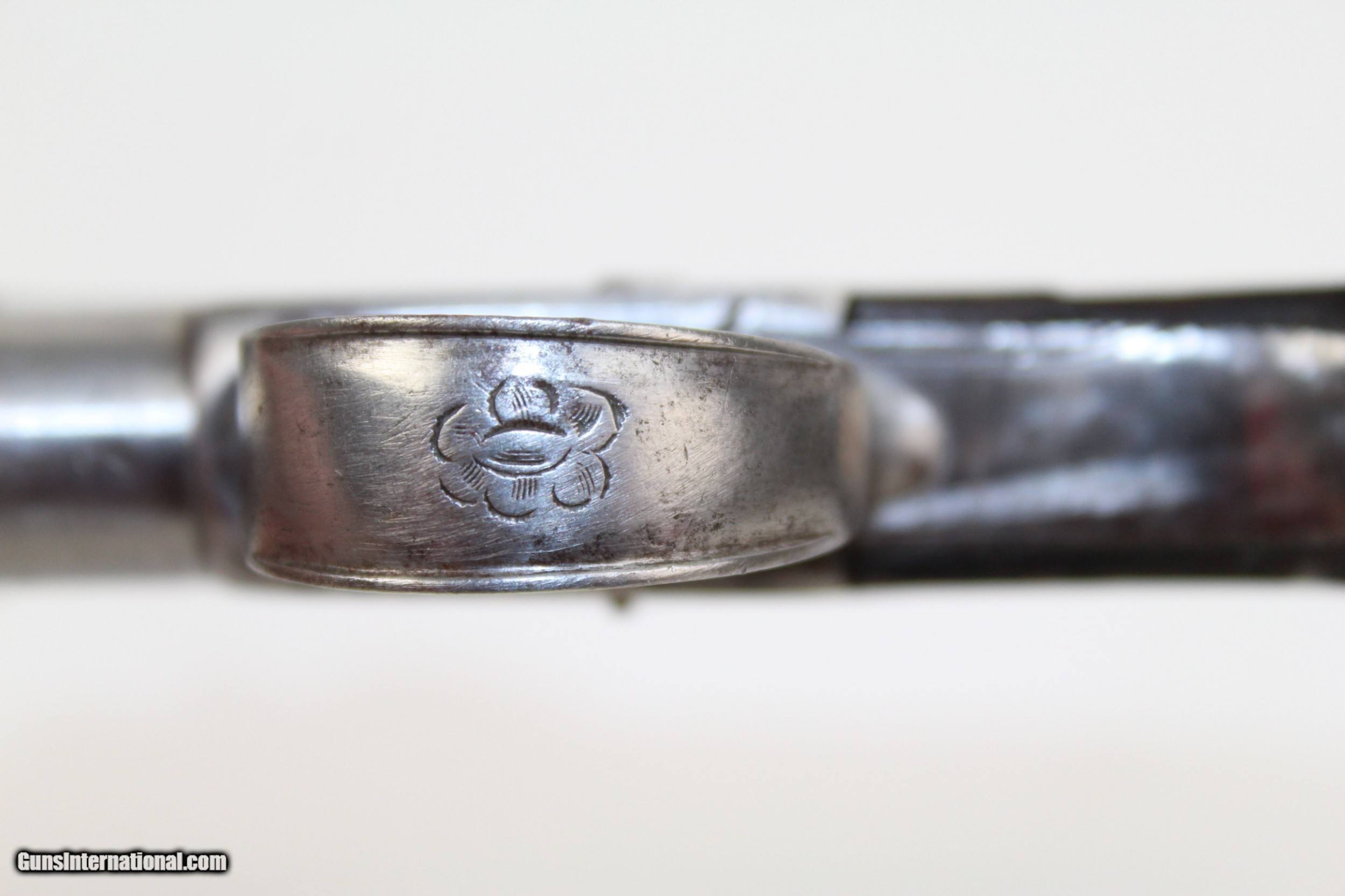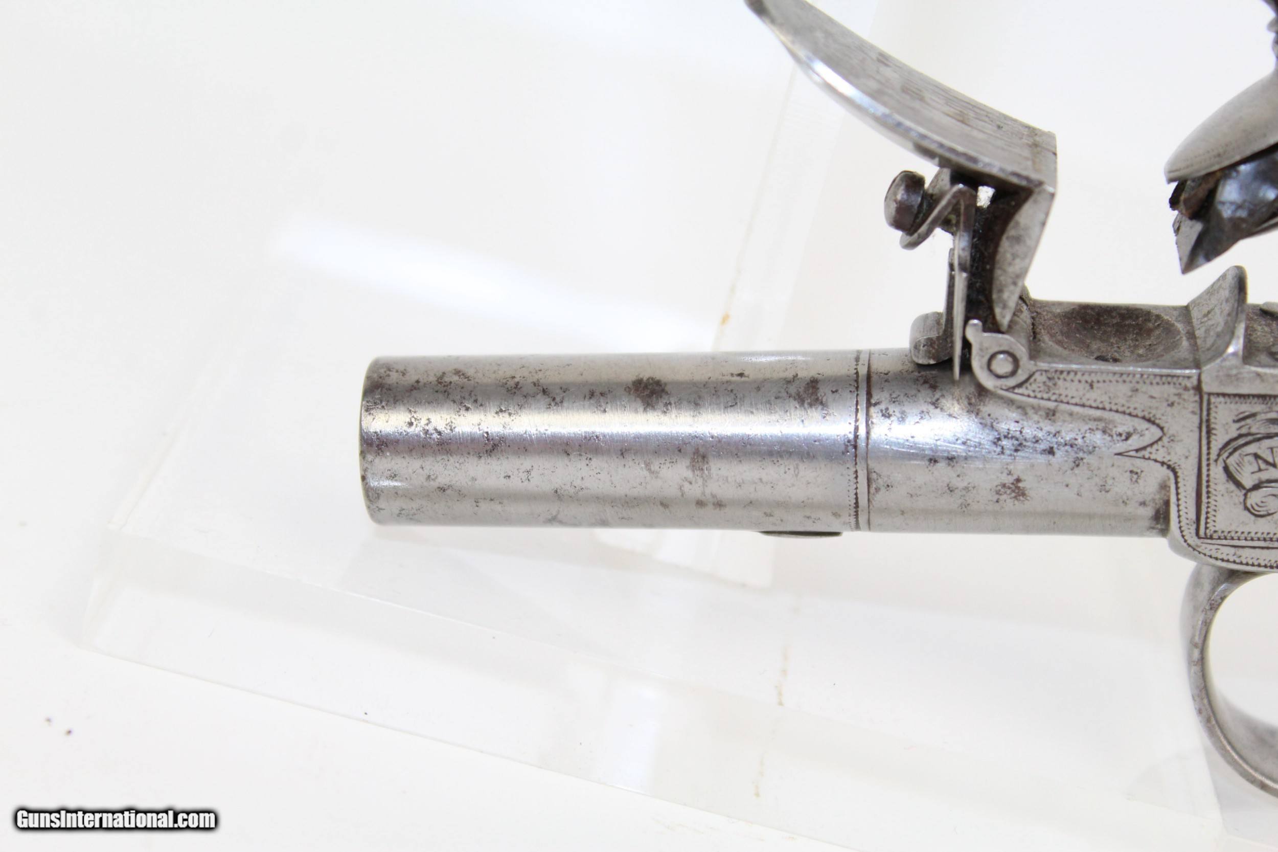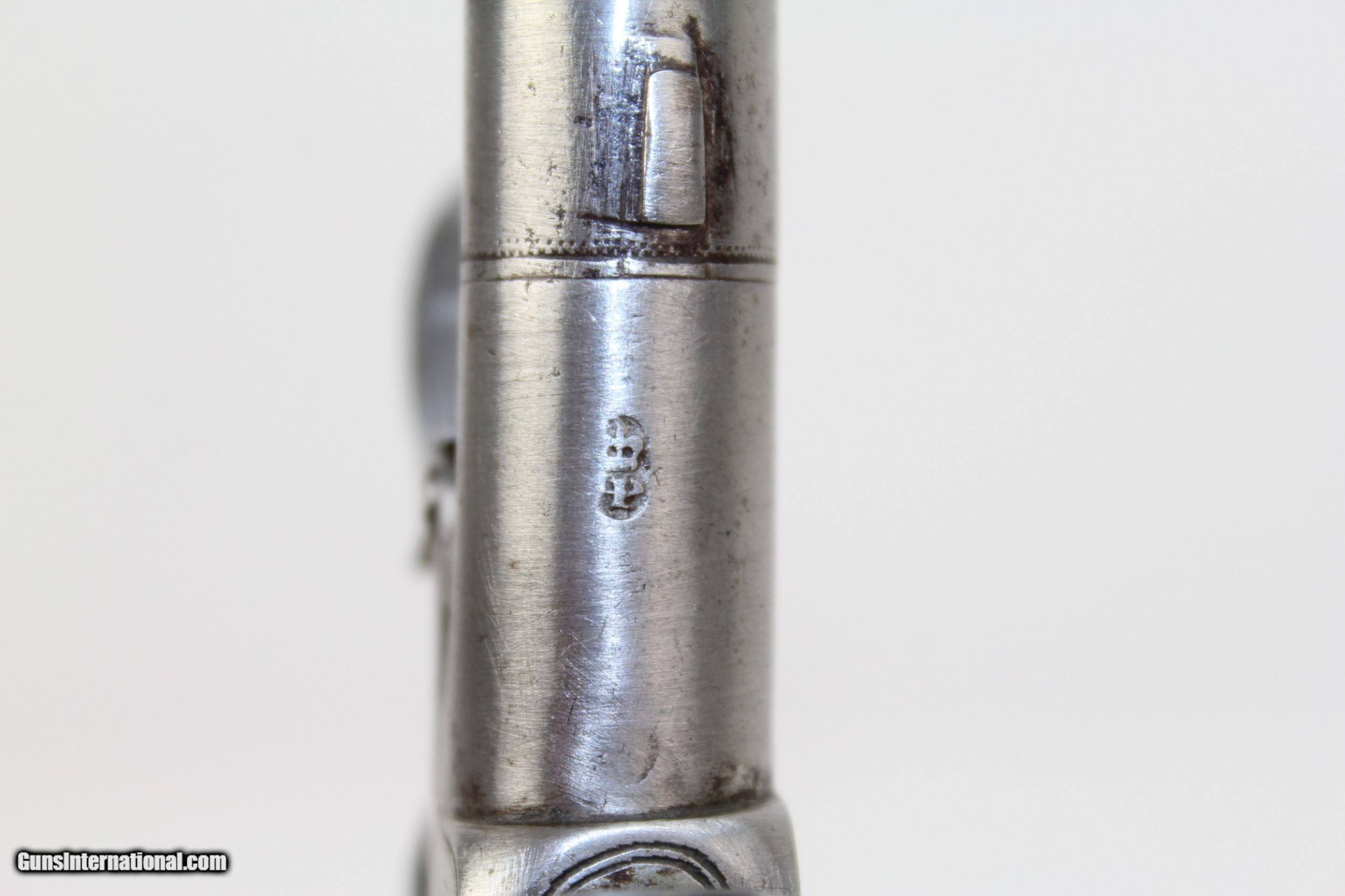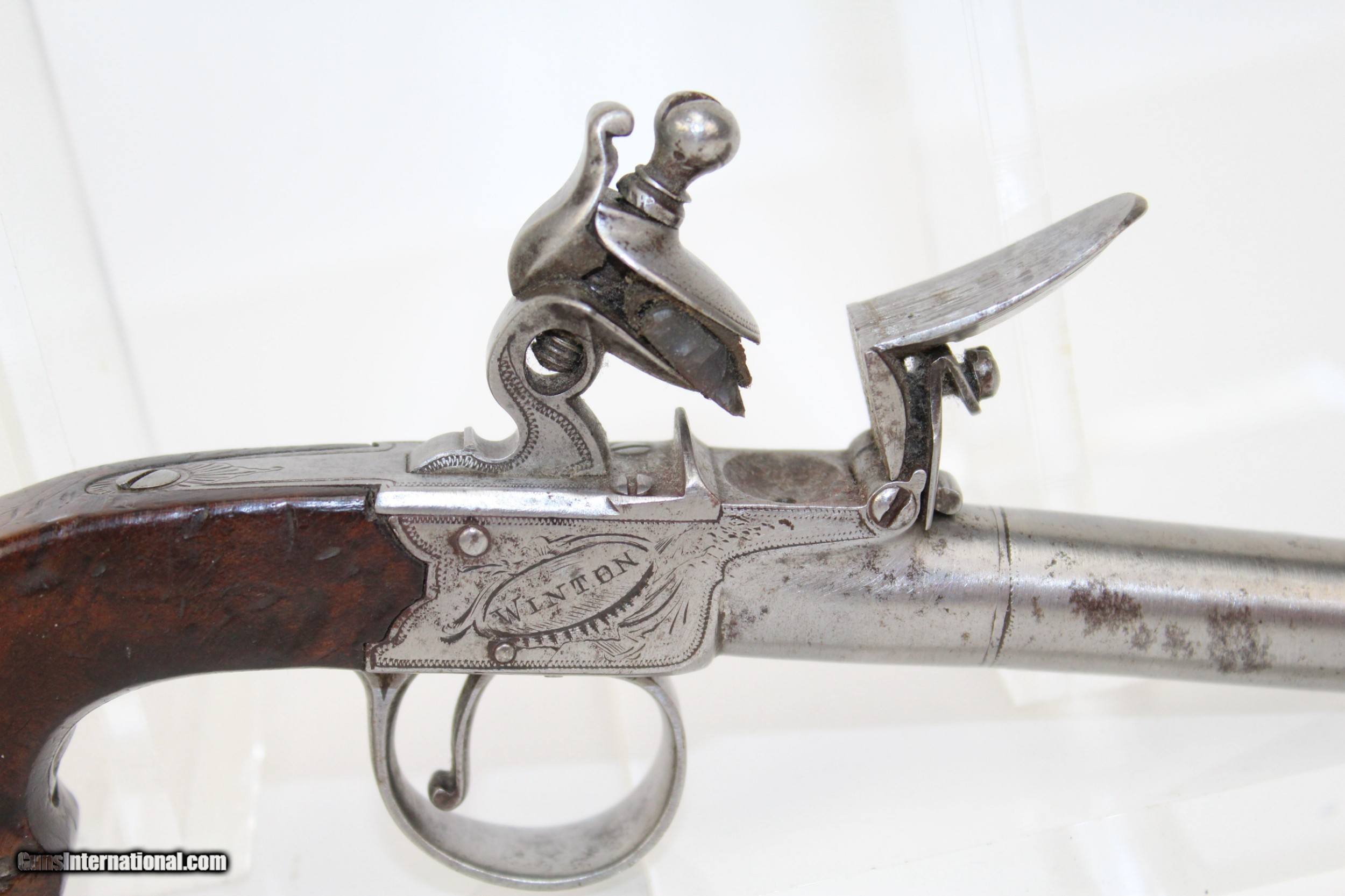 Description: BRACE of BRITISH Antique FLINTLOCK .44 Cal Pistols Made by North and Winton Here we present a Brace of Antique North Winton Flintlock Pistols, made England circa the early-19th Century. These pistols are small, light and simple. They would have been concealable in a pocket or a fur muff and been used for self defense on the streets of London. Bores are a large .44 caliber. The maker likely had the surname “North” and was in Winton in Southern England. On both of these pistols, the left side of the frame is marked “NORTH” and the right side is marked “WINTON”. The overall condition of both is good. The metal surfaces have a light gray patina. The markings are clear and legible. The grips are in good shape. The bores are clear and smooth. The action on these pistols are both strong. Own the original! This is a legitimate antique and not a reproduction. Barrel is 1-3/4 inches. Caliber: .44 Percussion Overall condition as seen in photos. Very Fast. Very Safe. FREE SHIPPING WORLDWIDE. Delivered directly to your door by express mail! Guaranteed AUTHENTIC & Includes CERTIFICATE OF AUTHENTICITY. ancestryguns $2100 #7423 SOLD Antique: Yes |