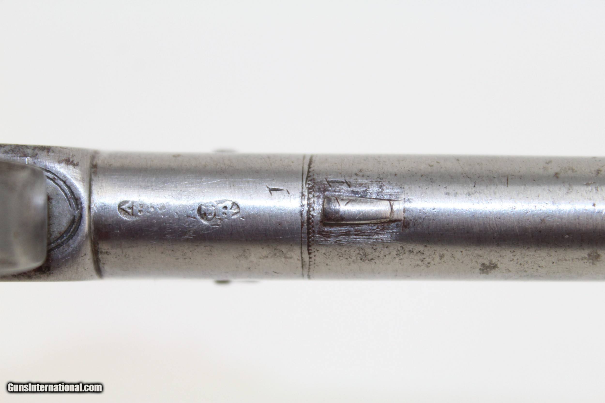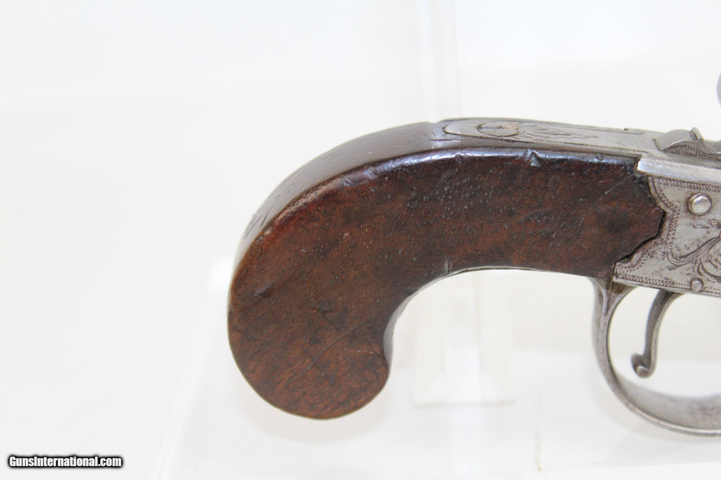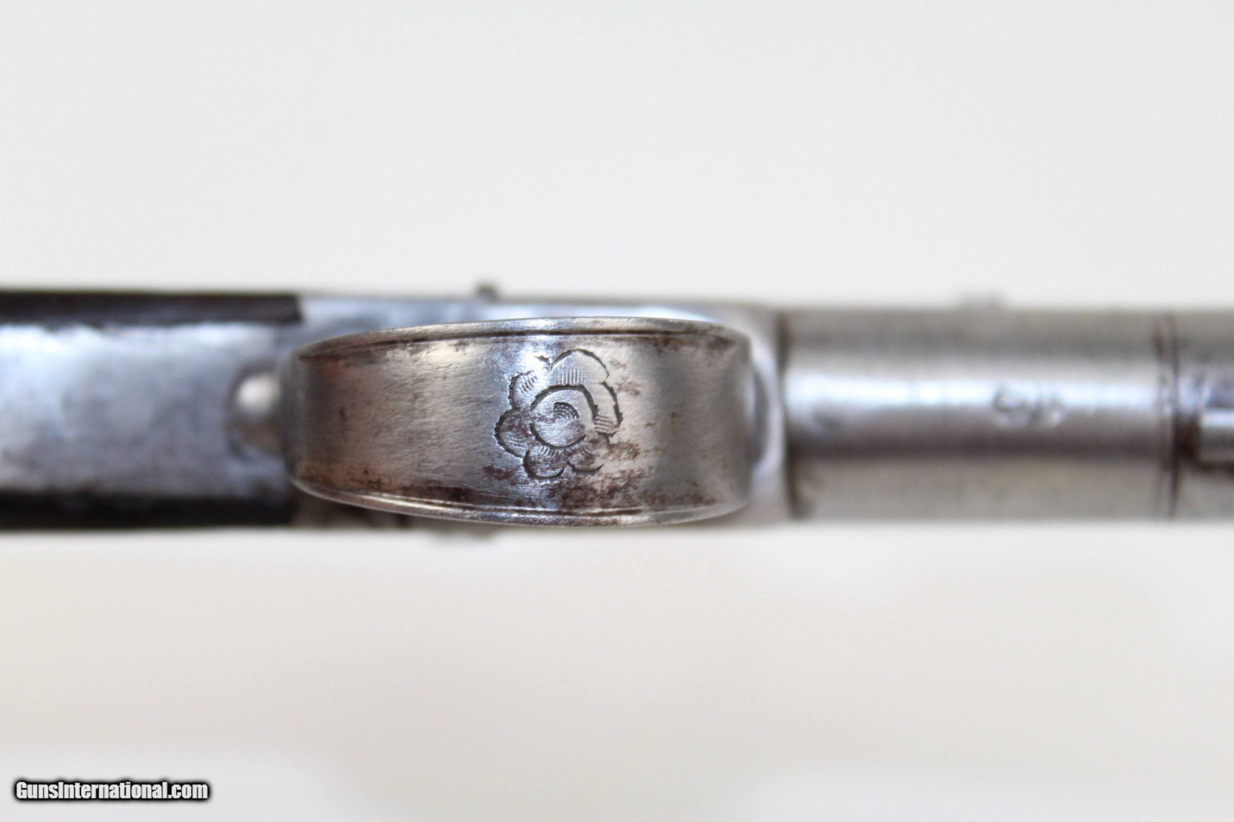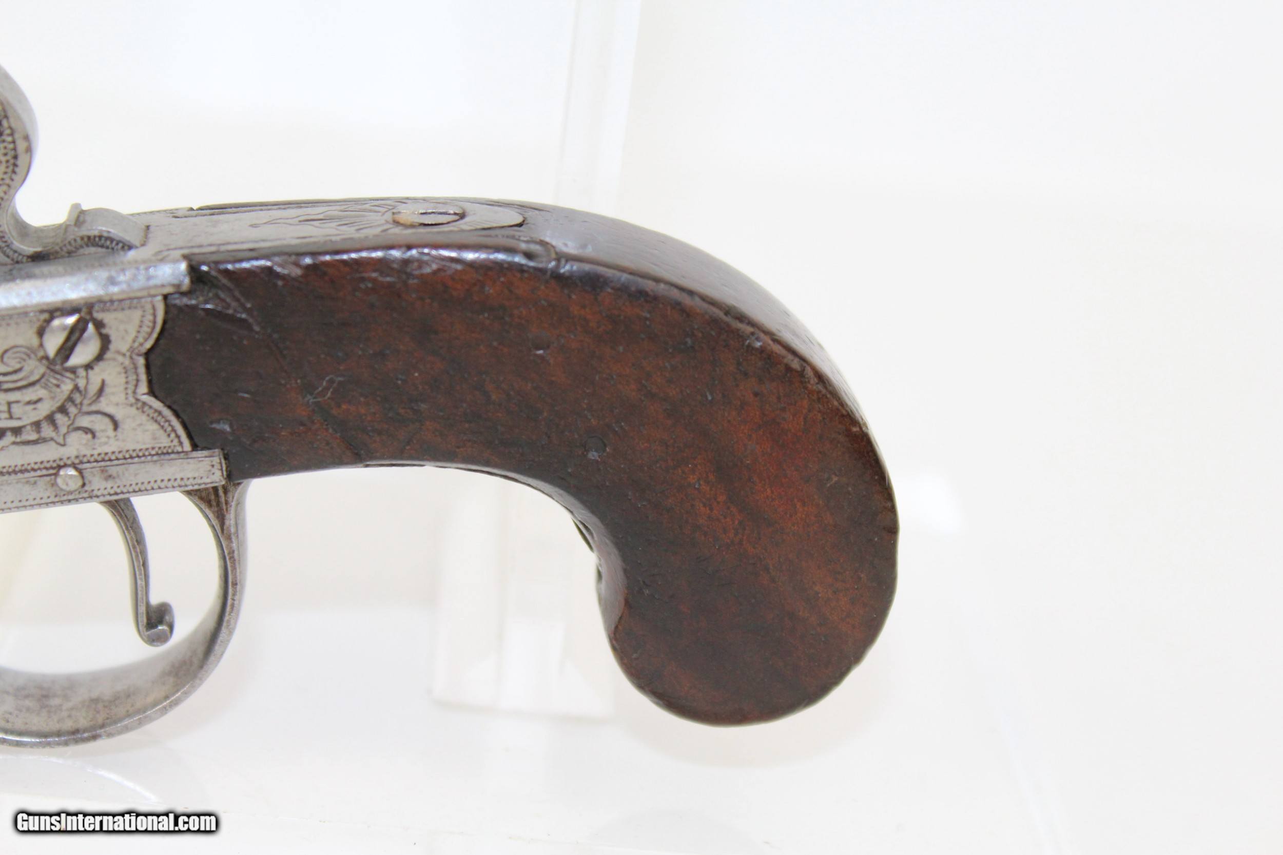 Description: BRACE of BRITISH Antique FLINTLOCK .44 Cal Pistols Made by North and Winton Here we present a Brace of Antique North Winton Flintlock Pistols, made England circa the early-19th Century. These pistols are small, light and simple. They would have been concealable in a pocket or a fur muff and been used for self defense on the streets of London. Bores are a large .44 caliber. The maker likely had the surname “North” and was in Winton in Southern England. On both of these pistols, the left side of the frame is marked “NORTH” and the right side is marked “WINTON”. The overall condition of both is good. The metal surfaces have a light gray patina. The markings are clear and legible. The grips are in good shape. The bores are clear and smooth. The action on these pistols are both strong. Own the original! This is a legitimate antique and not a reproduction. Barrel is 1-3/4 inches. Caliber: .44 Percussion Overall condition as seen in photos. Very Fast. Very Safe. FREE SHIPPING WORLDWIDE. Delivered directly to your door by express mail! Guaranteed AUTHENTIC & Includes CERTIFICATE OF AUTHENTICITY. ancestryguns $2100 #7423 SOLD Antique: Yes |