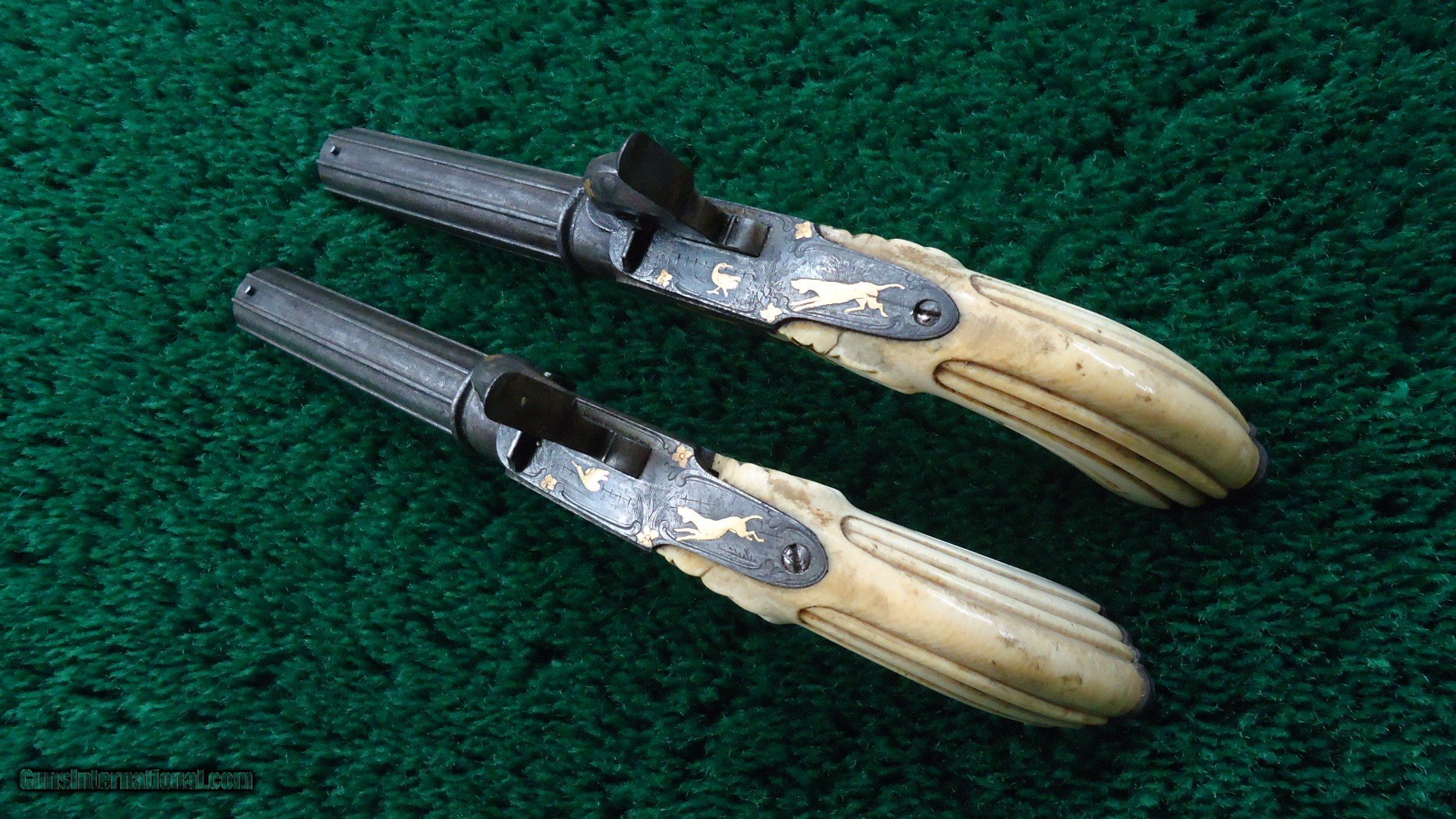 CASED PAIR GOLD INLAID BELGIAN SINGLE SHOT PERCUSSION PISTOLS