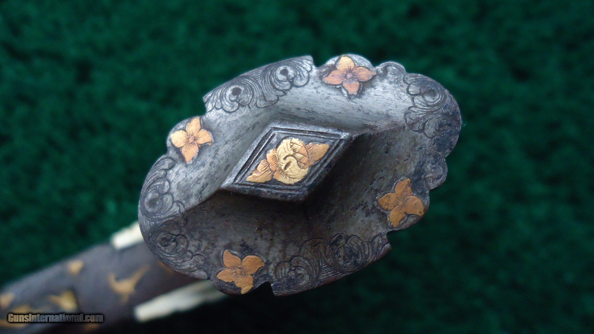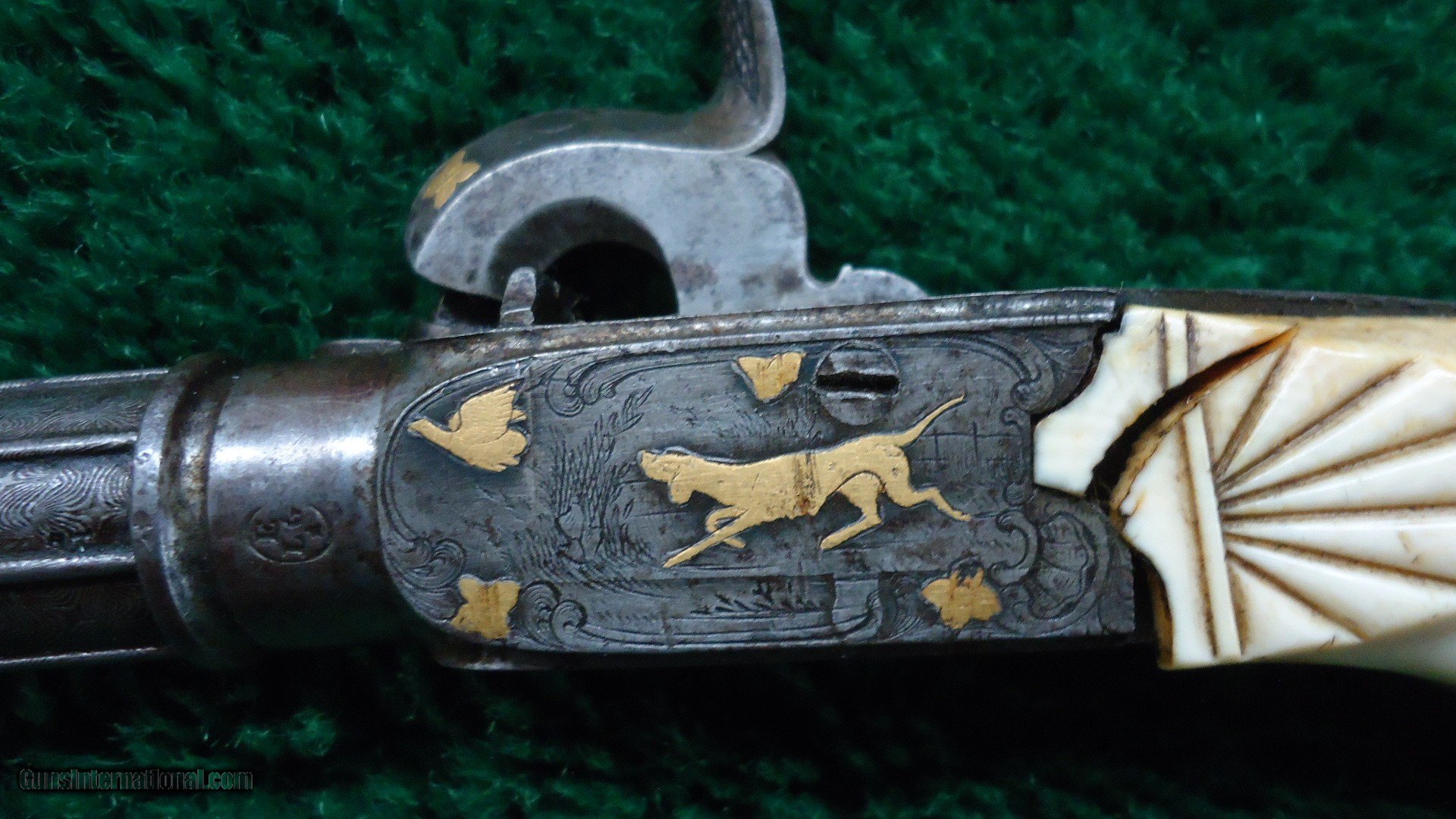 Description: Very decorative with 28 gold & precious metal inlays depicting birds, animals and floral. They have fluted ivory grips. There are some cracks and chips next to the action. Case hardened frames still show some color. Barrels are fluted Damascus and are 3-1/2 inches long. These are in a French style case with blue velveteen lining. Comes with ivory handled nipple wrench, ivory oil bottle and patch box. Also included is a single cavity mold. On the bottom of the case is marked "Un paire de pistolet appartenant a la succession de feu Pierre Manafe". This is a highly decorative pair of guns in a rosewood case. Leroy Merz Antique Firearms specializes in antique and vintage Winchesters and other fine American firearms. Since 1965 Mr. Merz has taken part in the world of firearms and has been a contributor to many well known reference books. We have hundreds of additional guns in every price range at our home online. Search for Merz Antiques in google. SOLD Antique: Yes |