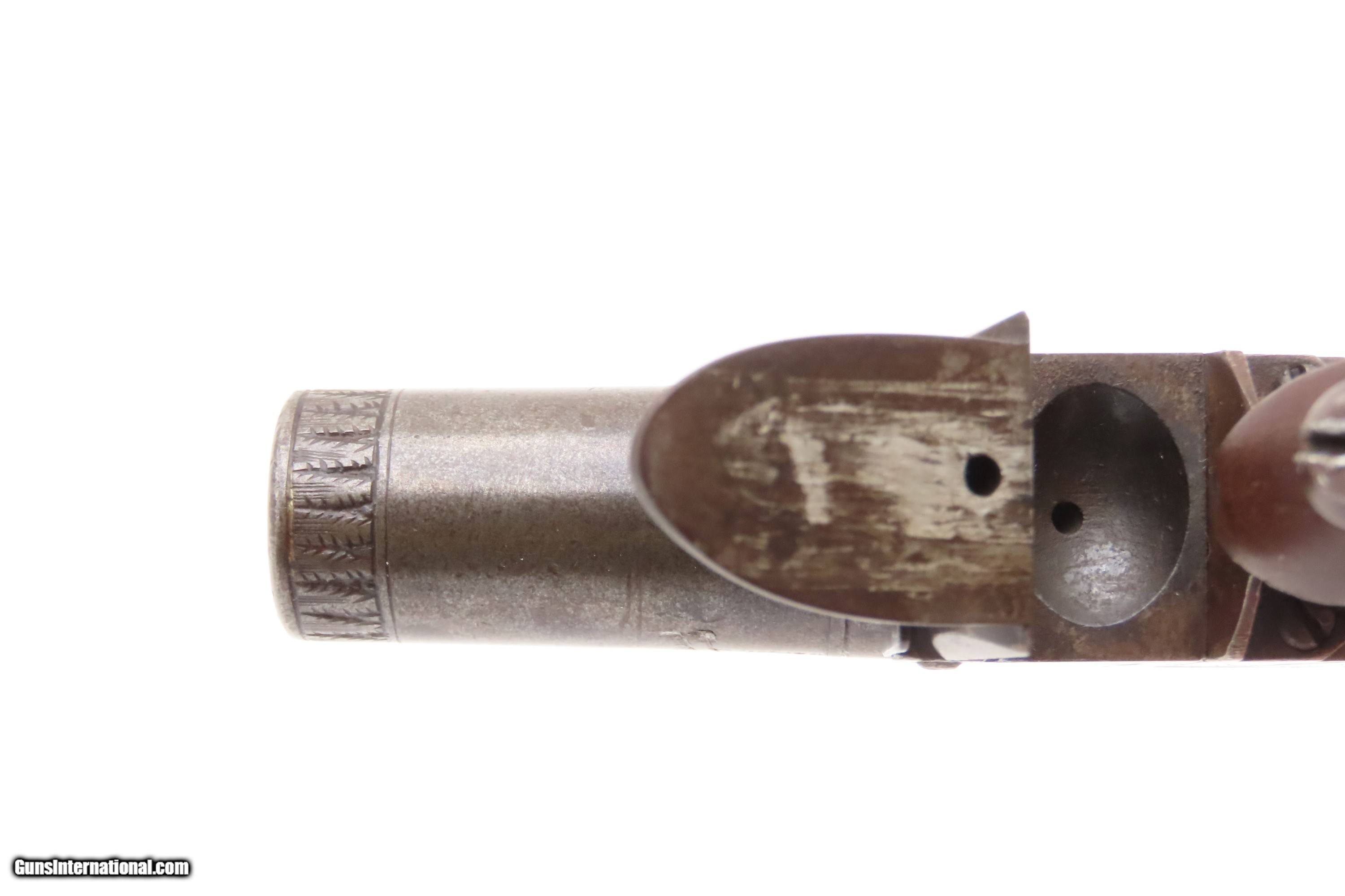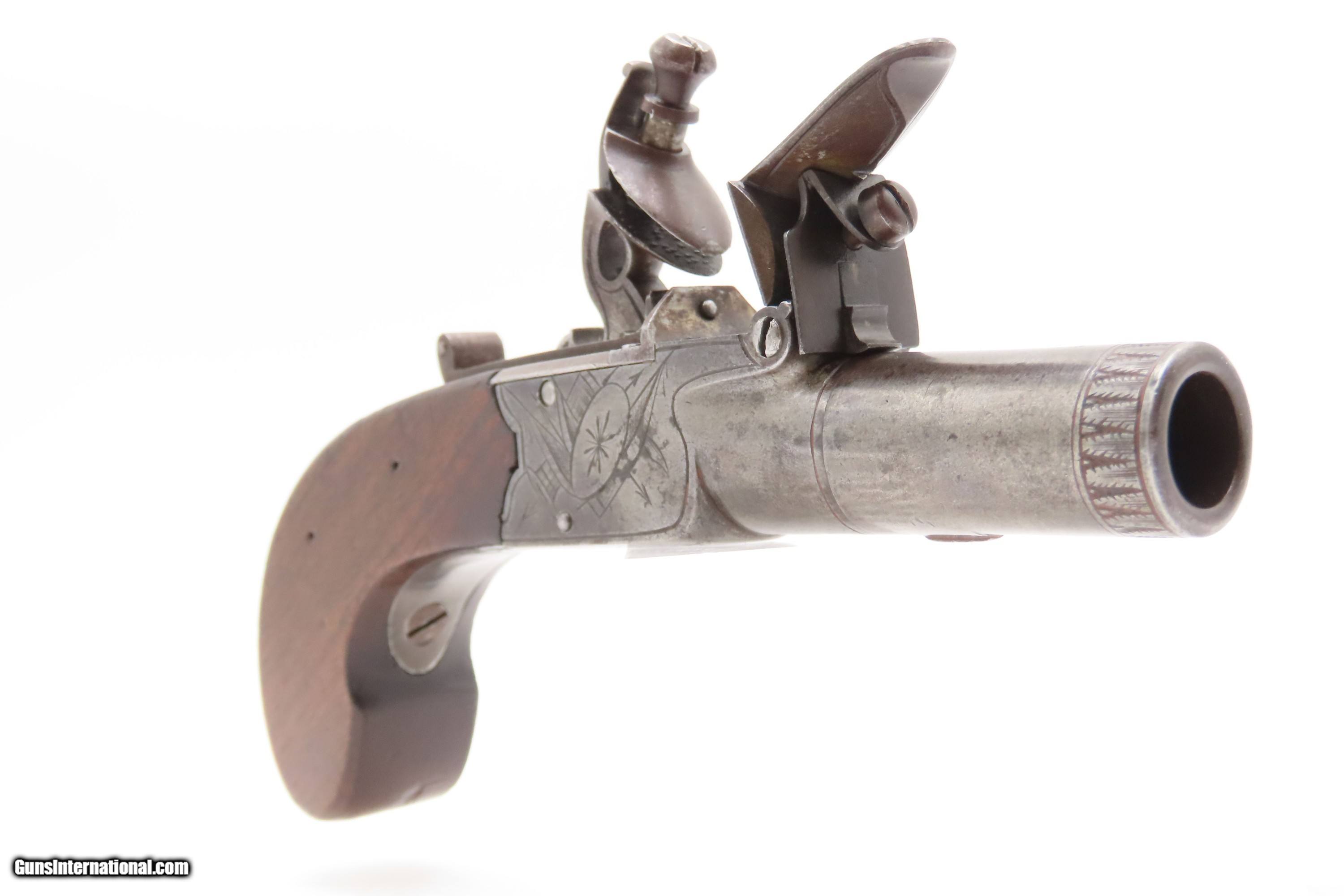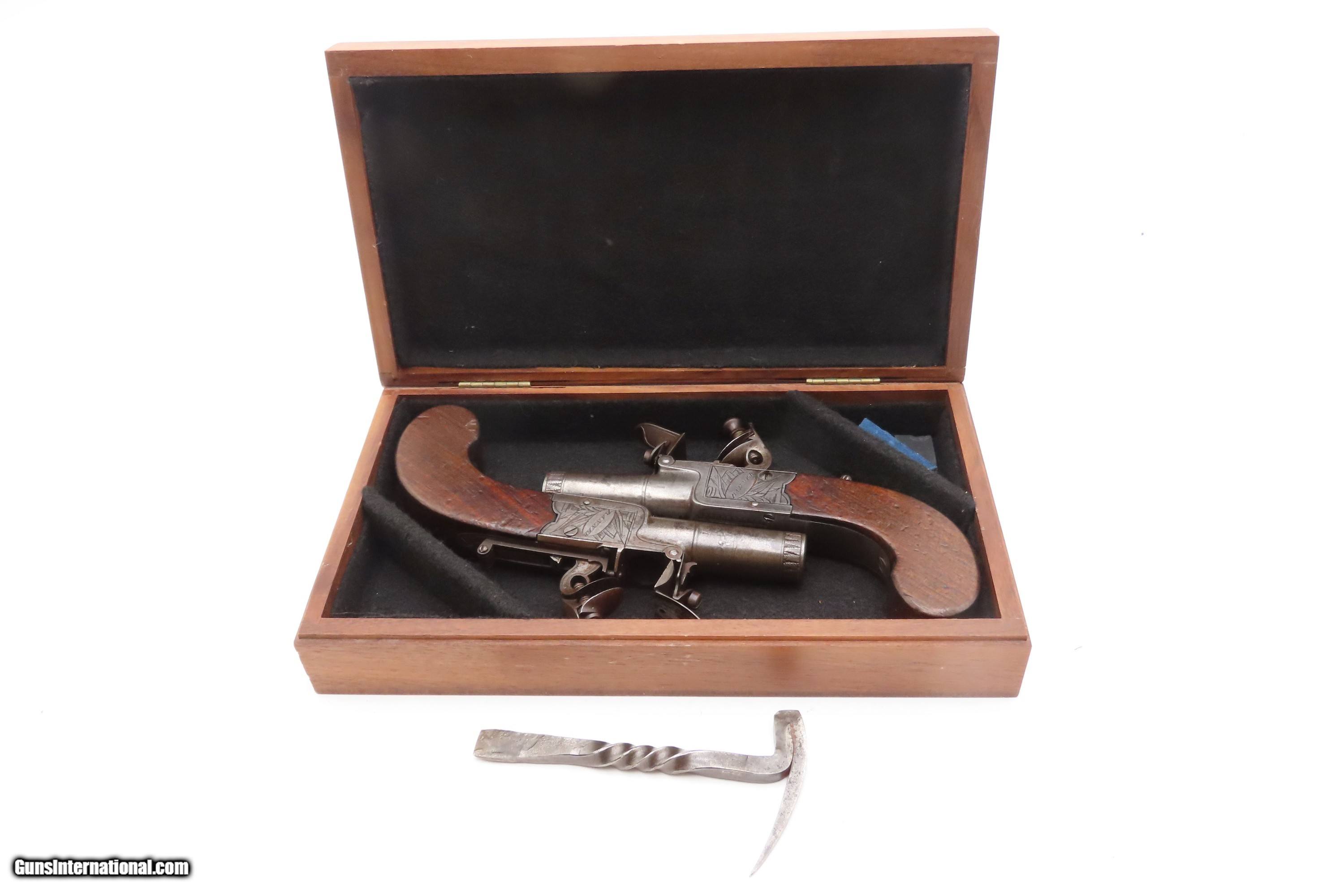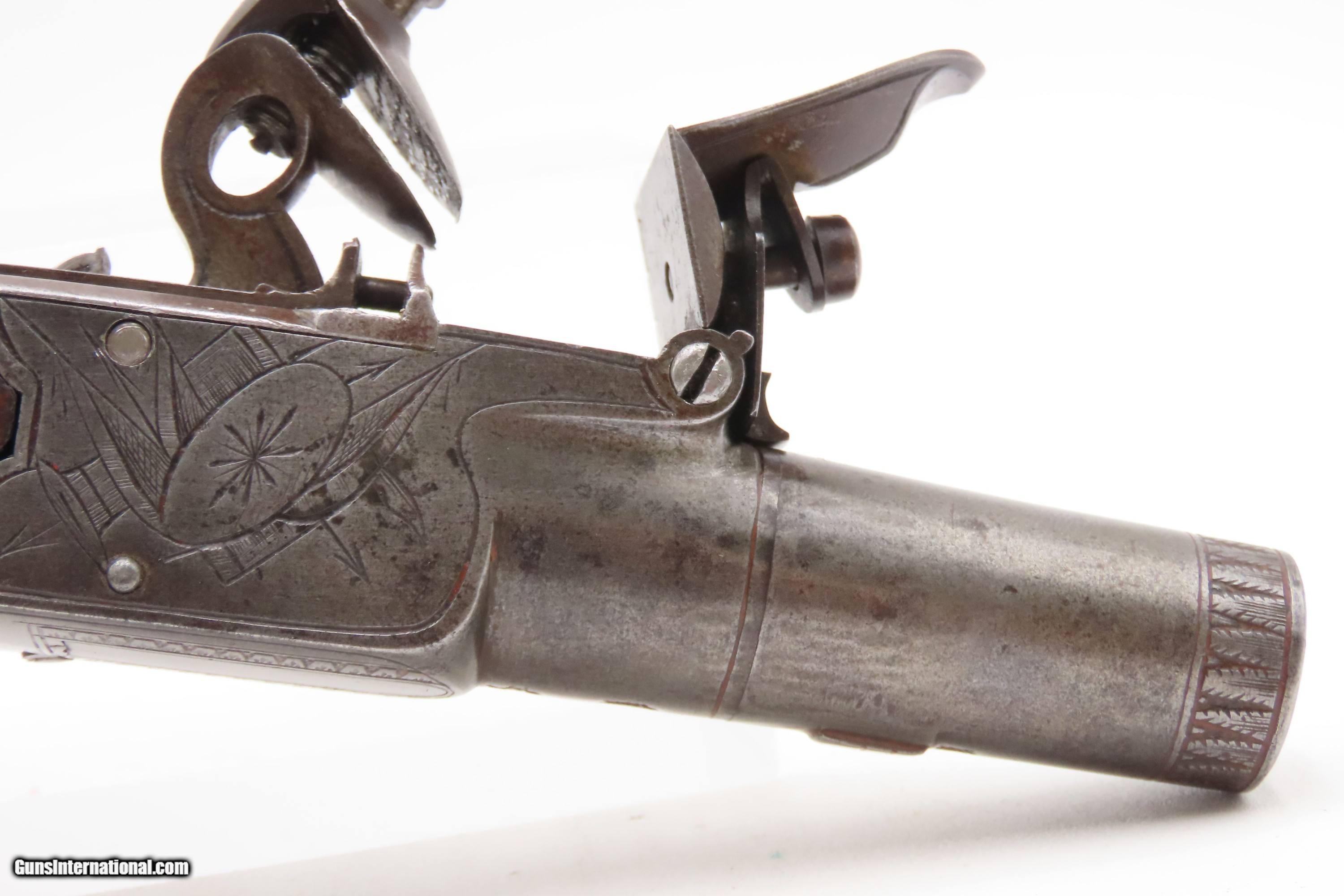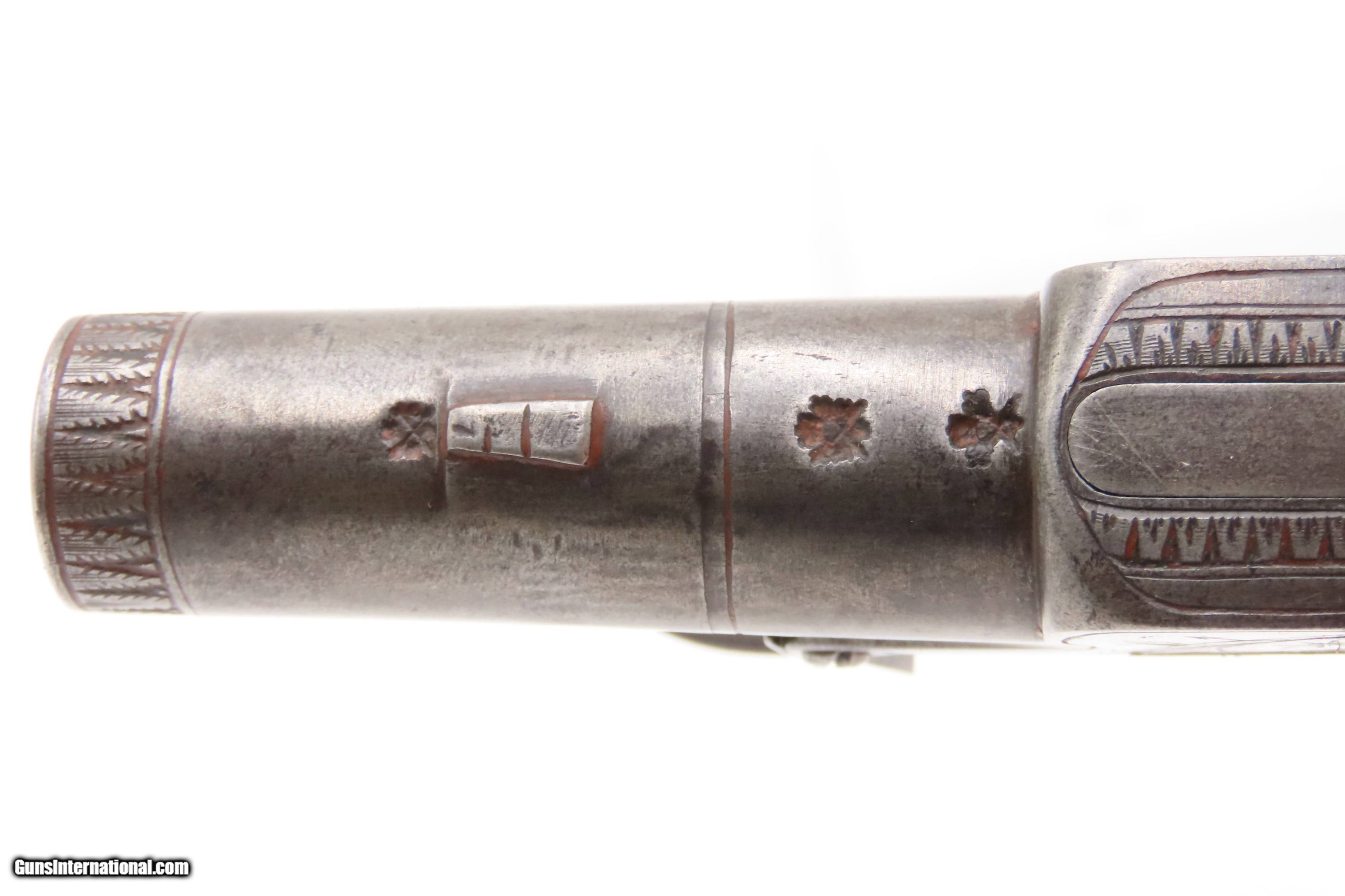 Description: Engraved CASED BRACE of British BANNER Antique Boxlock FLINTLOCK Pistols With WOODEN CASE, TWO FLINTS, & PICK/SCREWDRIVER Here Ancestry Guns presents an antique Engraved and Cased Matching Pair of British Banner Marked Boxlock Flintlock Coat Pocket/Boot Pistols, made circa the early 1800s likely in London or Birmingham, England. Though these pistols have “Banner” marked on the lock, they are very similar to those manufactured by Samuel Nock from the same era. Samuel Nock was the nephew of famed innovative gunmaker Henry Nock and apprenticed under him. Samuel was first listed as a gunmaker in 1804 at Hawkesbury Place in London before moving to 180 Fleet Street between 1806 and 1822, and then between 1823 and 1852 he was in business at Regents Circus. After he died in 1851, the business was carried on by the executors from 1853 to 1858. He was also an accomplished gunmaker and worked through the transitional period from flintlocks to percussion systems. He served as a royal gunmaker to the English monarchy from King George III in 1805 up to Queen Victoria starting in 1837. These self-defense pistols would have been most at home in the coat pocket of anyone in the busy cities of London, Paris and Liege during the early to mid-1800s. These style pistols are light and simple. The “Coat/Pocket Pistol” name says it all. They were the "Saturday Night Specials" of the 18th-19th century. Before the Deringer, they were "Gentleman's" or "Muff Pistols", typically, a smaller pistol that was easily concealed. They were favored among the gentry and women because of these traits. Men would carry them concealed in a waistcoat pocket and women would hide them in a hand muff. The overall conditions are good. Original gray patinas. Both actions are strong. The bores are smooth and remain in good shape for their ages. Markings are legible. Both grips are in good shape with average wear, dings and scuffs. The modern case is fine. Also includes two flints, and a combination pick/screwdriver. Own the original! This is a legitimate antique and not a reproduction. Barrels are 2-1/4 inches. Calibers are .54 Flintlock Overall condition as seen in photos. Very Fast. Very Safe. FREE SHIPPING WORLDWIDE. Delivered directly to your door by express mail! Guaranteed AUTHENTIC & Includes CERTIFICATE OF AUTHENTICITY. $2000 #259724 Antique: Yes Price: $2,000.00 Buy Now Pay with