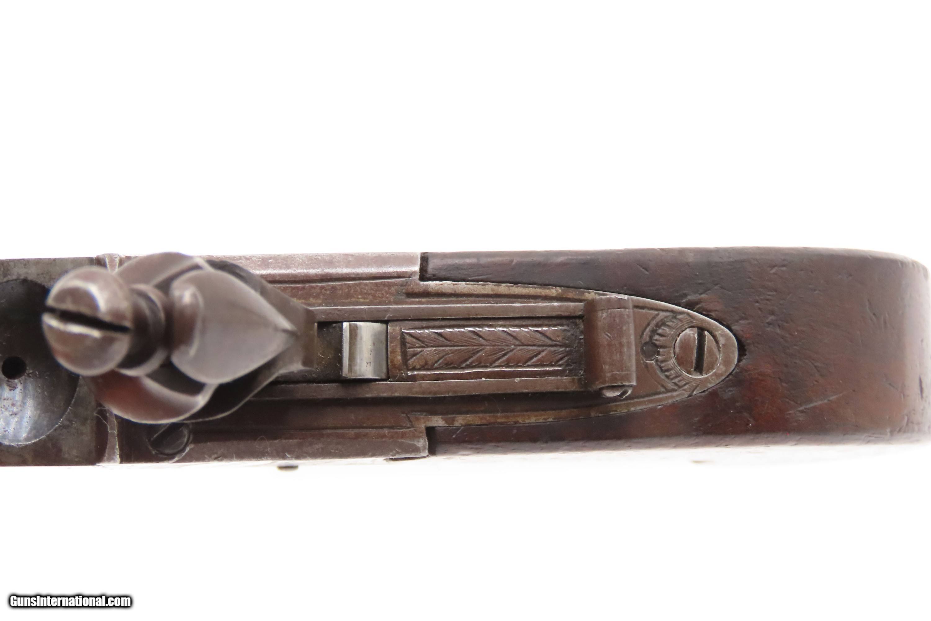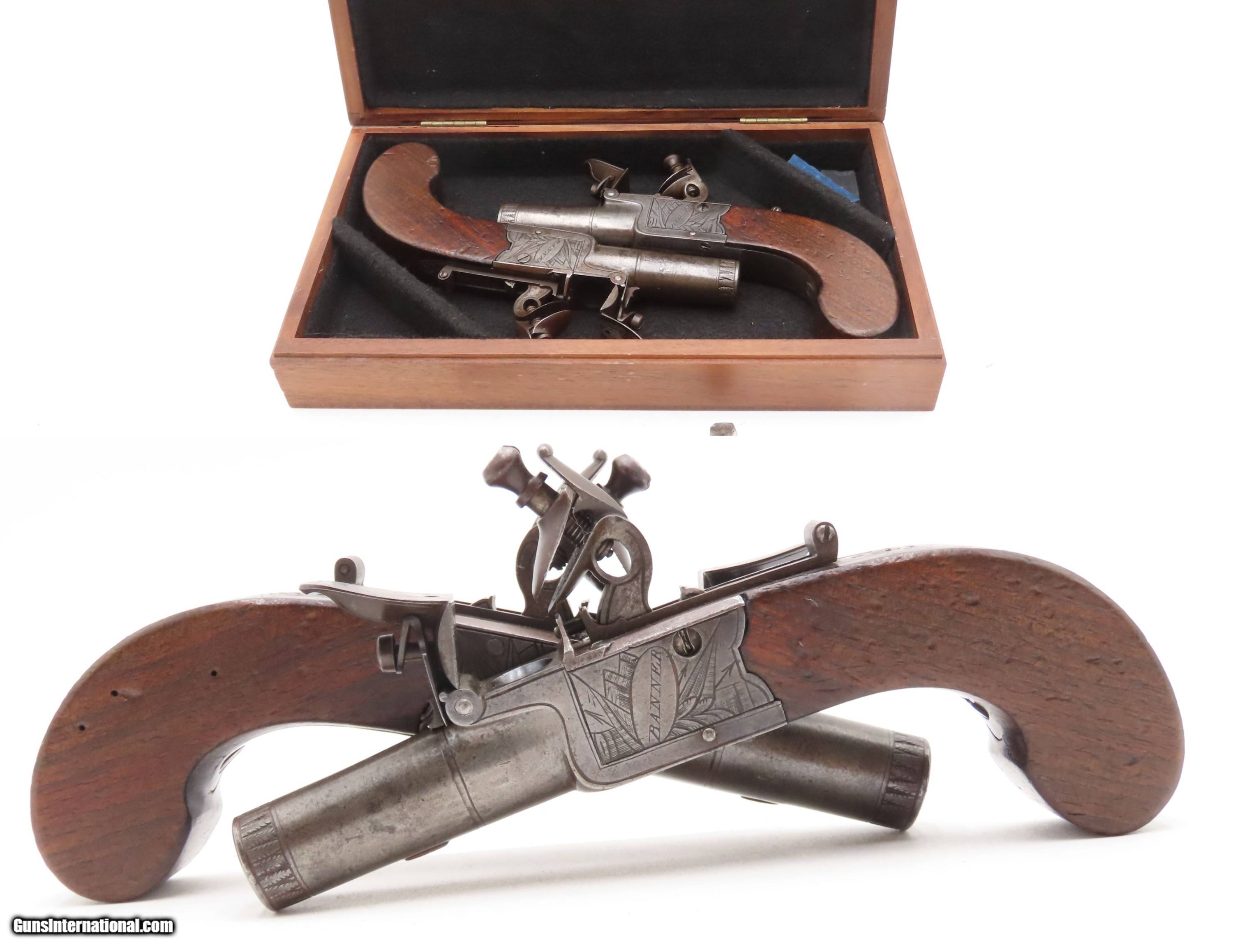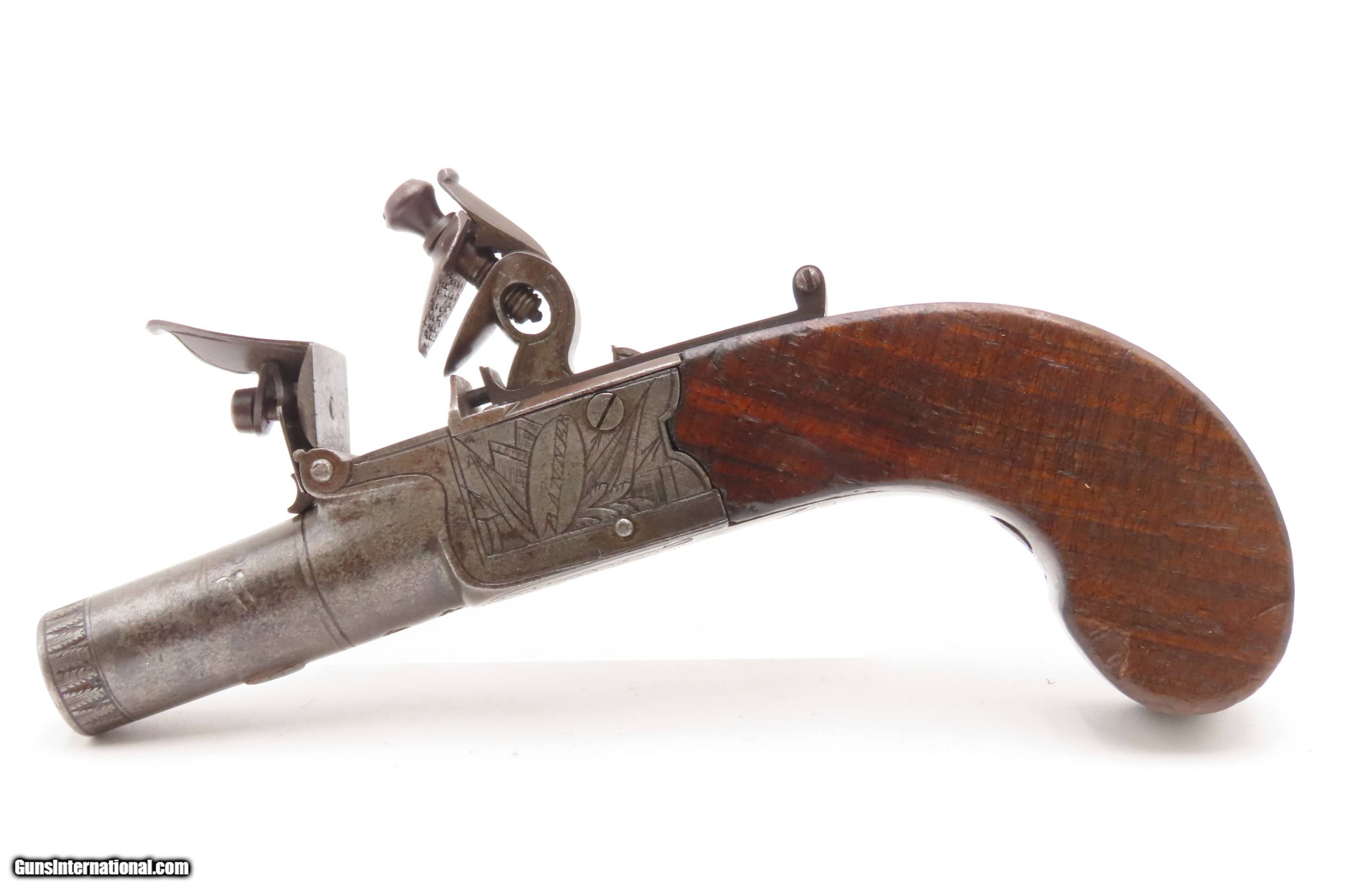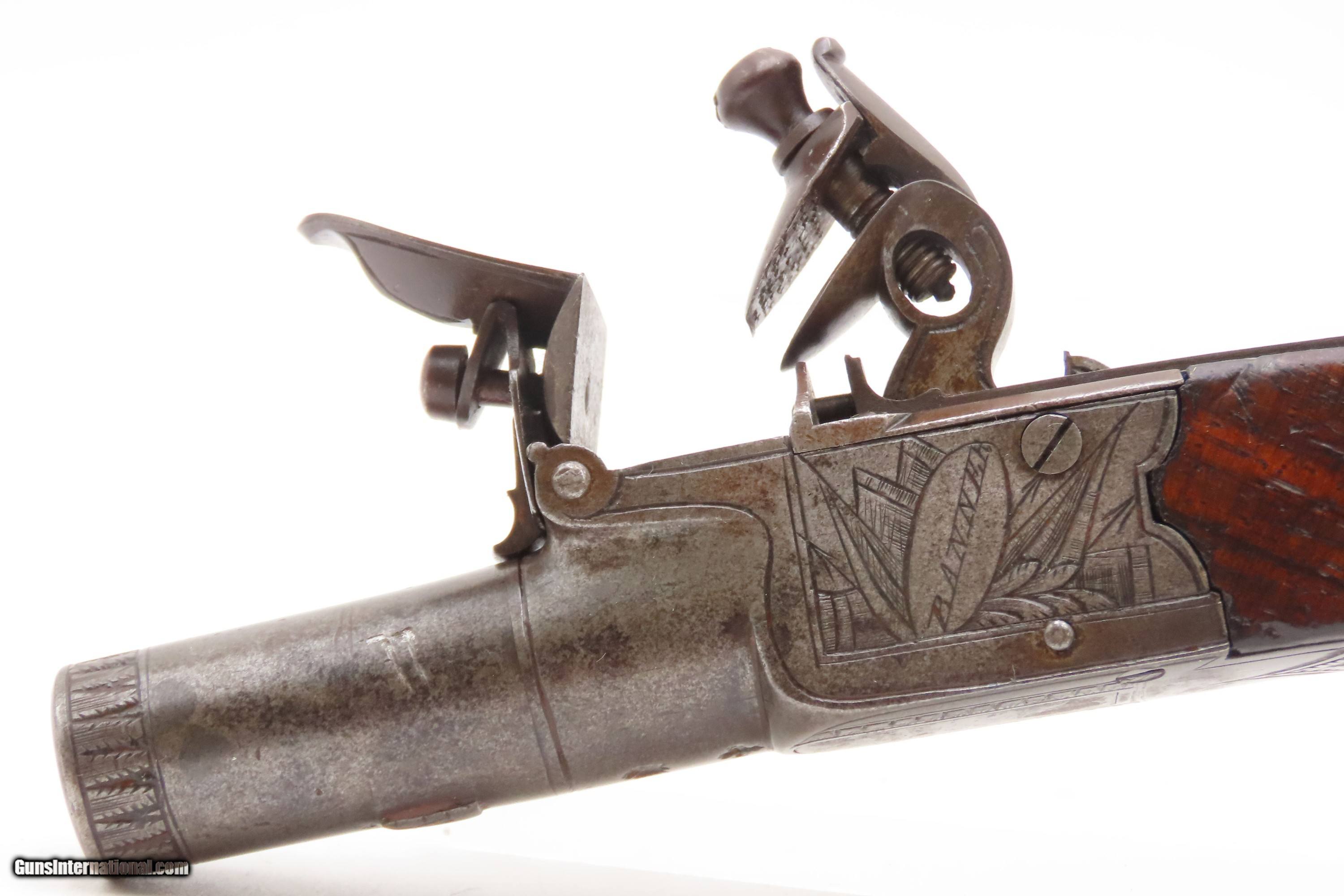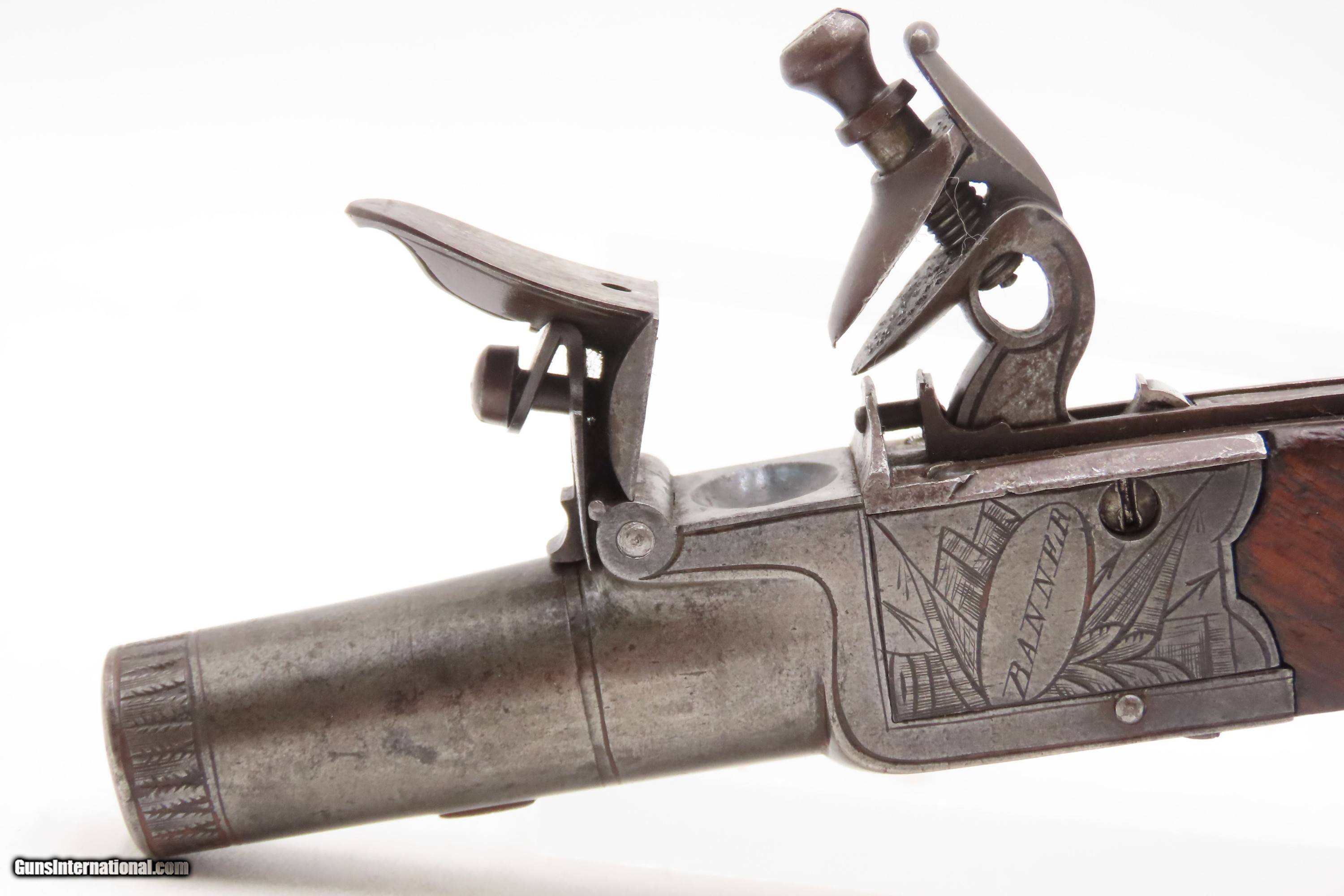 Description: Engraved CASED BRACE of British BANNER Antique Boxlock FLINTLOCK Pistols With WOODEN CASE, TWO FLINTS, & PICK/SCREWDRIVER Here Ancestry Guns presents an antique Engraved and Cased Matching Pair of British Banner Marked Boxlock Flintlock Coat Pocket/Boot Pistols, made circa the early 1800s likely in London or Birmingham, England. Though these pistols have “Banner” marked on the lock, they are very similar to those manufactured by Samuel Nock from the same era. Samuel Nock was the nephew of famed innovative gunmaker Henry Nock and apprenticed under him. Samuel was first listed as a gunmaker in 1804 at Hawkesbury Place in London before moving to 180 Fleet Street between 1806 and 1822, and then between 1823 and 1852 he was in business at Regents Circus. After he died in 1851, the business was carried on by the executors from 1853 to 1858. He was also an accomplished gunmaker and worked through the transitional period from flintlocks to percussion systems. He served as a royal gunmaker to the English monarchy from King George III in 1805 up to Queen Victoria starting in 1837. These self-defense pistols would have been most at home in the coat pocket of anyone in the busy cities of London, Paris and Liege during the early to mid-1800s. These style pistols are light and simple. The “Coat/Pocket Pistol” name says it all. They were the "Saturday Night Specials" of the 18th-19th century. Before the Deringer, they were "Gentleman's" or "Muff Pistols", typically, a smaller pistol that was easily concealed. They were favored among the gentry and women because of these traits. Men would carry them concealed in a waistcoat pocket and women would hide them in a hand muff. The overall conditions are good. Original gray patinas. Both actions are strong. The bores are smooth and remain in good shape for their ages. Markings are legible. Both grips are in good shape with average wear, dings and scuffs. The modern case is fine. Also includes two flints, and a combination pick/screwdriver. Own the original! This is a legitimate antique and not a reproduction. Barrels are 2-1/4 inches. Calibers are .54 Flintlock Overall condition as seen in photos. Very Fast. Very Safe. FREE SHIPPING WORLDWIDE. Delivered directly to your door by express mail! Guaranteed AUTHENTIC & Includes CERTIFICATE OF AUTHENTICITY. $2000 #259724 Antique: Yes Price: $2,000.00 Buy Now Pay with