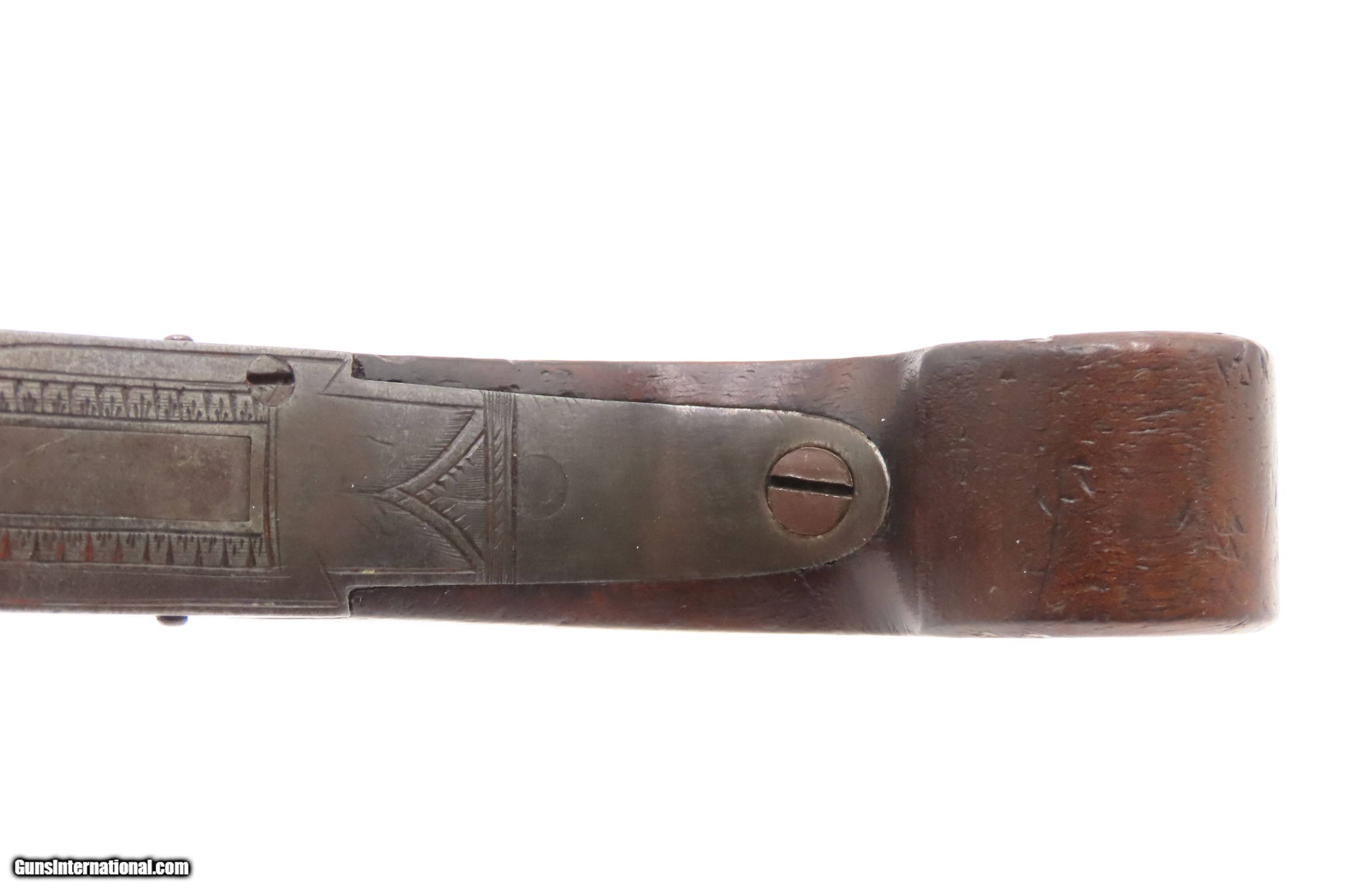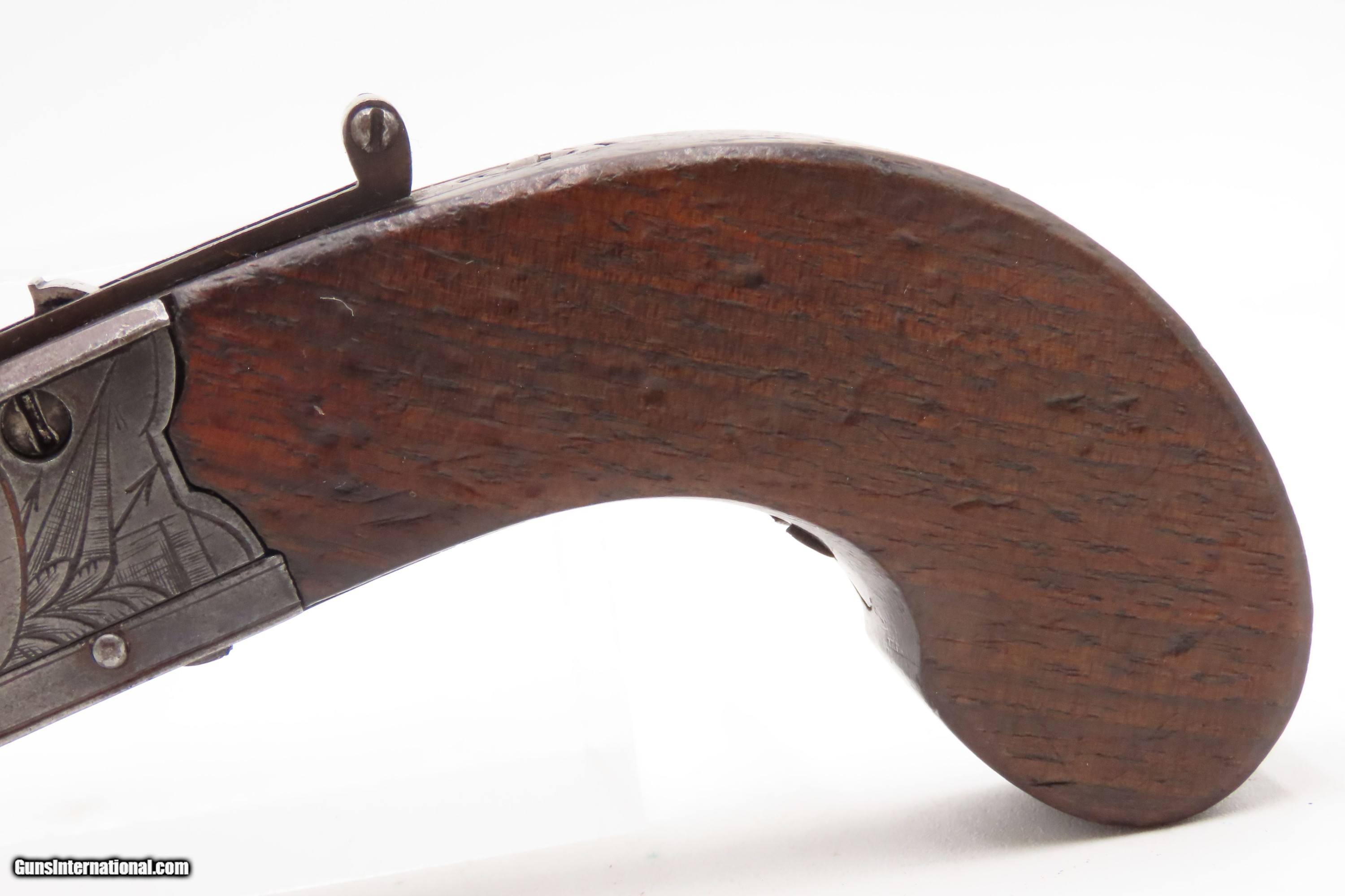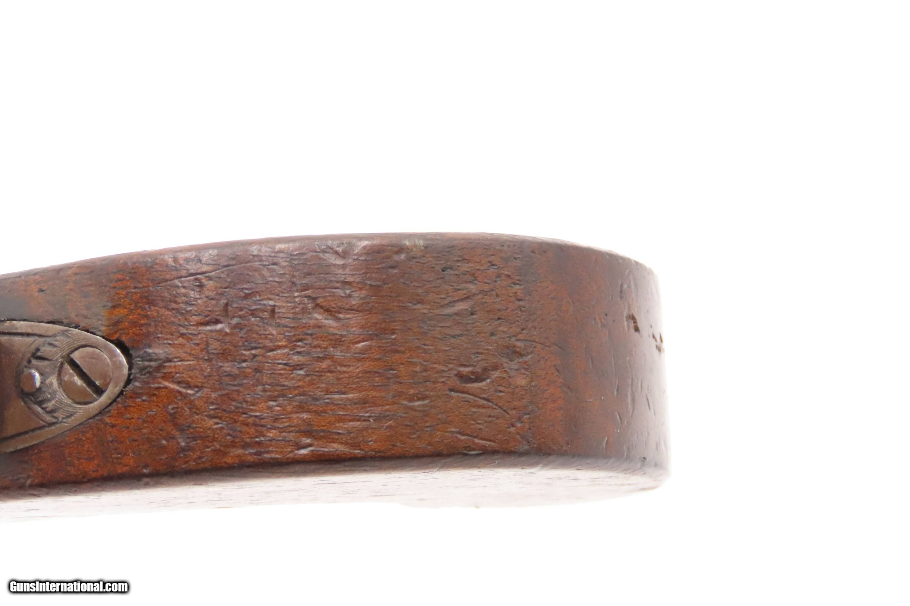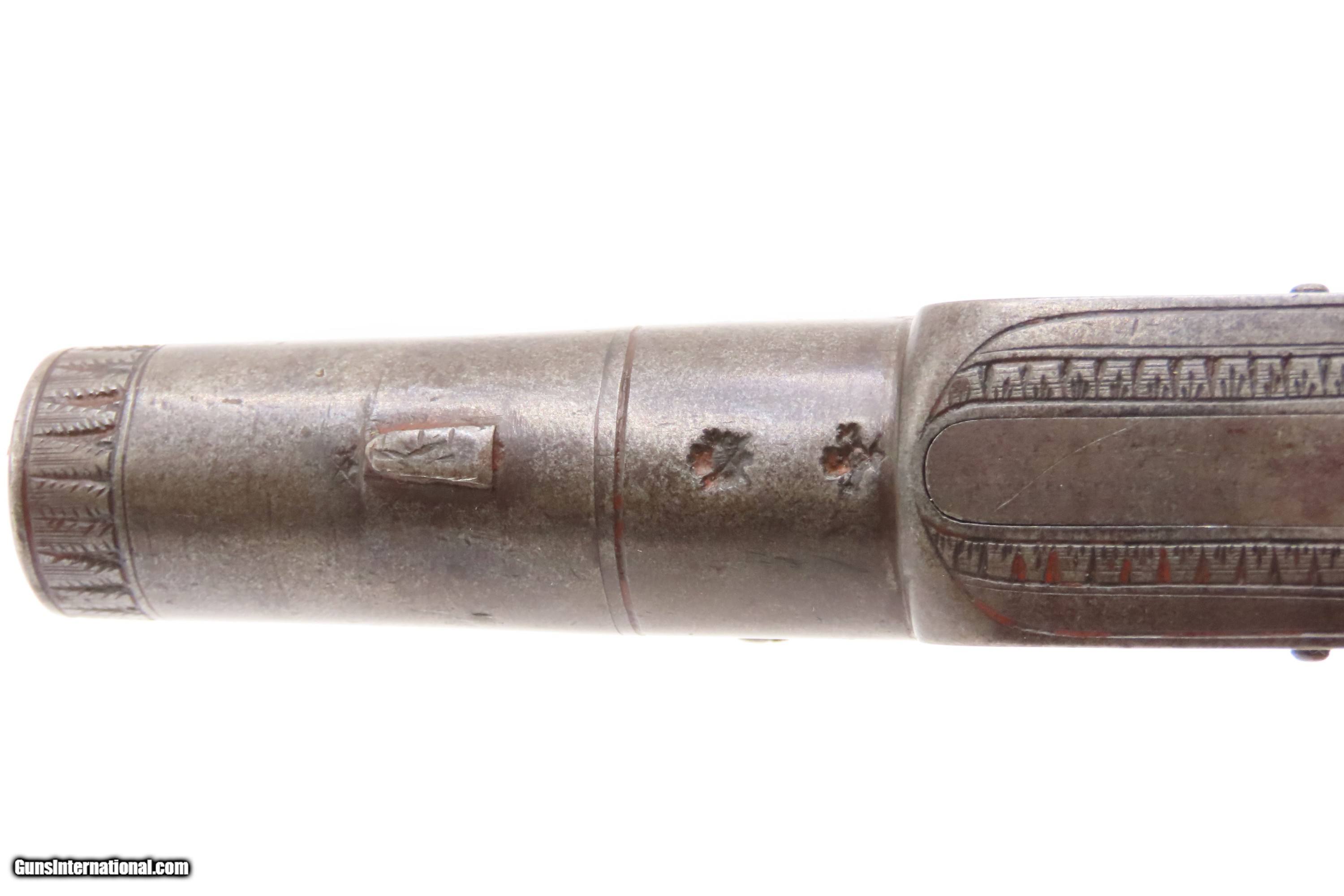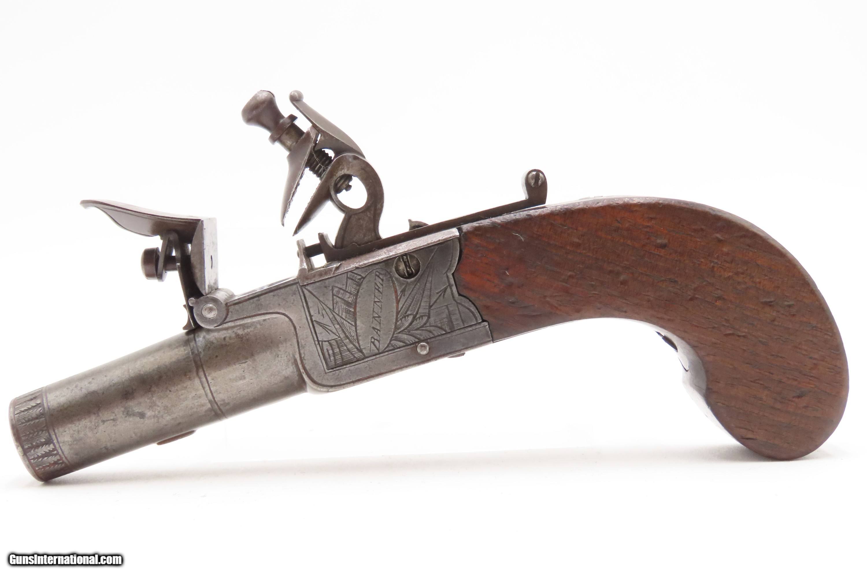 Description: Engraved CASED BRACE of British BANNER Antique Boxlock FLINTLOCK Pistols With WOODEN CASE, TWO FLINTS, & PICK/SCREWDRIVER Here Ancestry Guns presents an antique Engraved and Cased Matching Pair of British Banner Marked Boxlock Flintlock Coat Pocket/Boot Pistols, made circa the early 1800s likely in London or Birmingham, England. Though these pistols have “Banner” marked on the lock, they are very similar to those manufactured by Samuel Nock from the same era. Samuel Nock was the nephew of famed innovative gunmaker Henry Nock and apprenticed under him. Samuel was first listed as a gunmaker in 1804 at Hawkesbury Place in London before moving to 180 Fleet Street between 1806 and 1822, and then between 1823 and 1852 he was in business at Regents Circus. After he died in 1851, the business was carried on by the executors from 1853 to 1858. He was also an accomplished gunmaker and worked through the transitional period from flintlocks to percussion systems. He served as a royal gunmaker to the English monarchy from King George III in 1805 up to Queen Victoria starting in 1837. These self-defense pistols would have been most at home in the coat pocket of anyone in the busy cities of London, Paris and Liege during the early to mid-1800s. These style pistols are light and simple. The “Coat/Pocket Pistol” name says it all. They were the "Saturday Night Specials" of the 18th-19th century. Before the Deringer, they were "Gentleman's" or "Muff Pistols", typically, a smaller pistol that was easily concealed. They were favored among the gentry and women because of these traits. Men would carry them concealed in a waistcoat pocket and women would hide them in a hand muff. The overall conditions are good. Original gray patinas. Both actions are strong. The bores are smooth and remain in good shape for their ages. Markings are legible. Both grips are in good shape with average wear, dings and scuffs. The modern case is fine. Also includes two flints, and a combination pick/screwdriver. Own the original! This is a legitimate antique and not a reproduction. Barrels are 2-1/4 inches. Calibers are .54 Flintlock Overall condition as seen in photos. Very Fast. Very Safe. FREE SHIPPING WORLDWIDE. Delivered directly to your door by express mail! Guaranteed AUTHENTIC & Includes CERTIFICATE OF AUTHENTICITY. $2000 #259724 Antique: Yes Price: $2,000.00 Buy Now Pay with