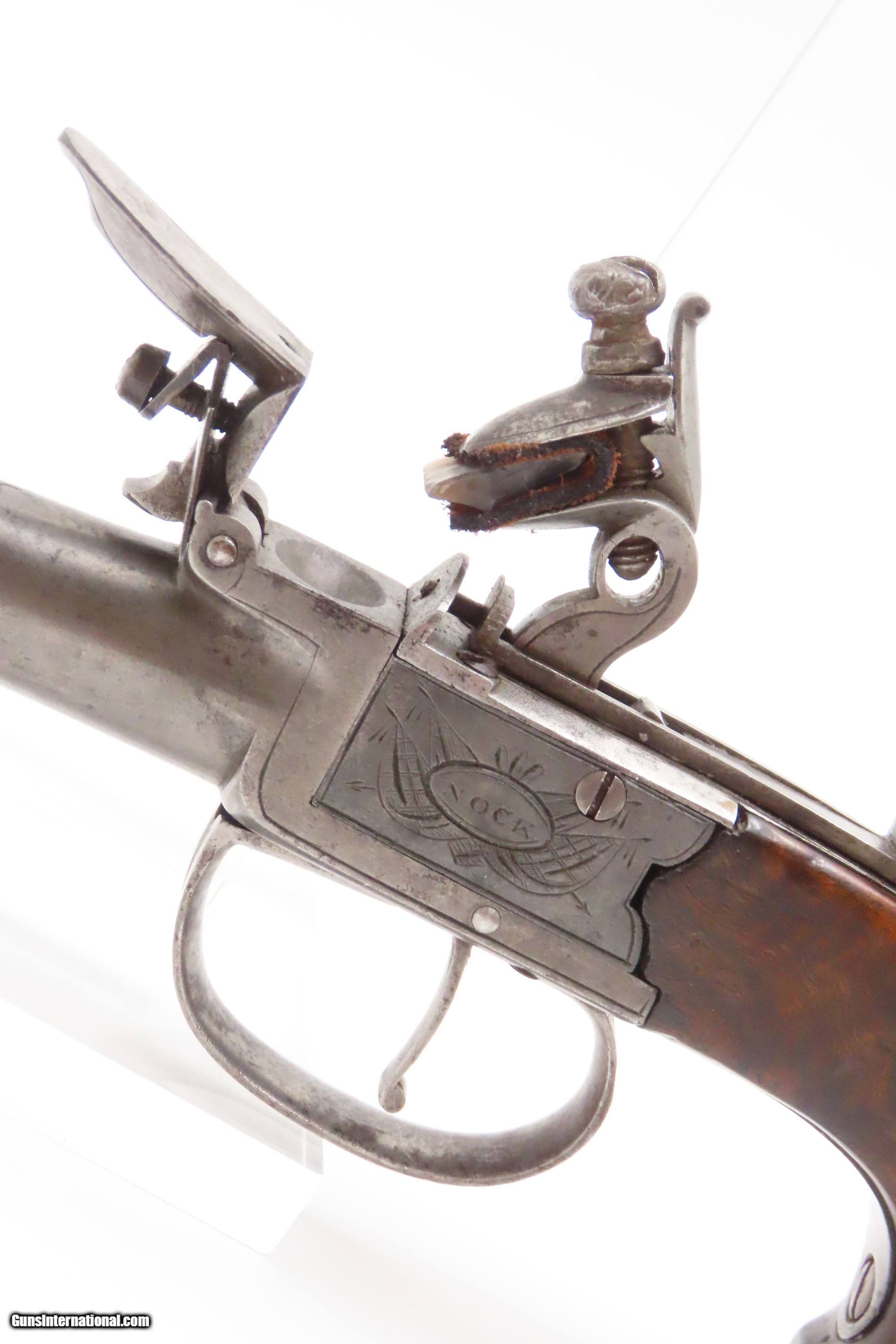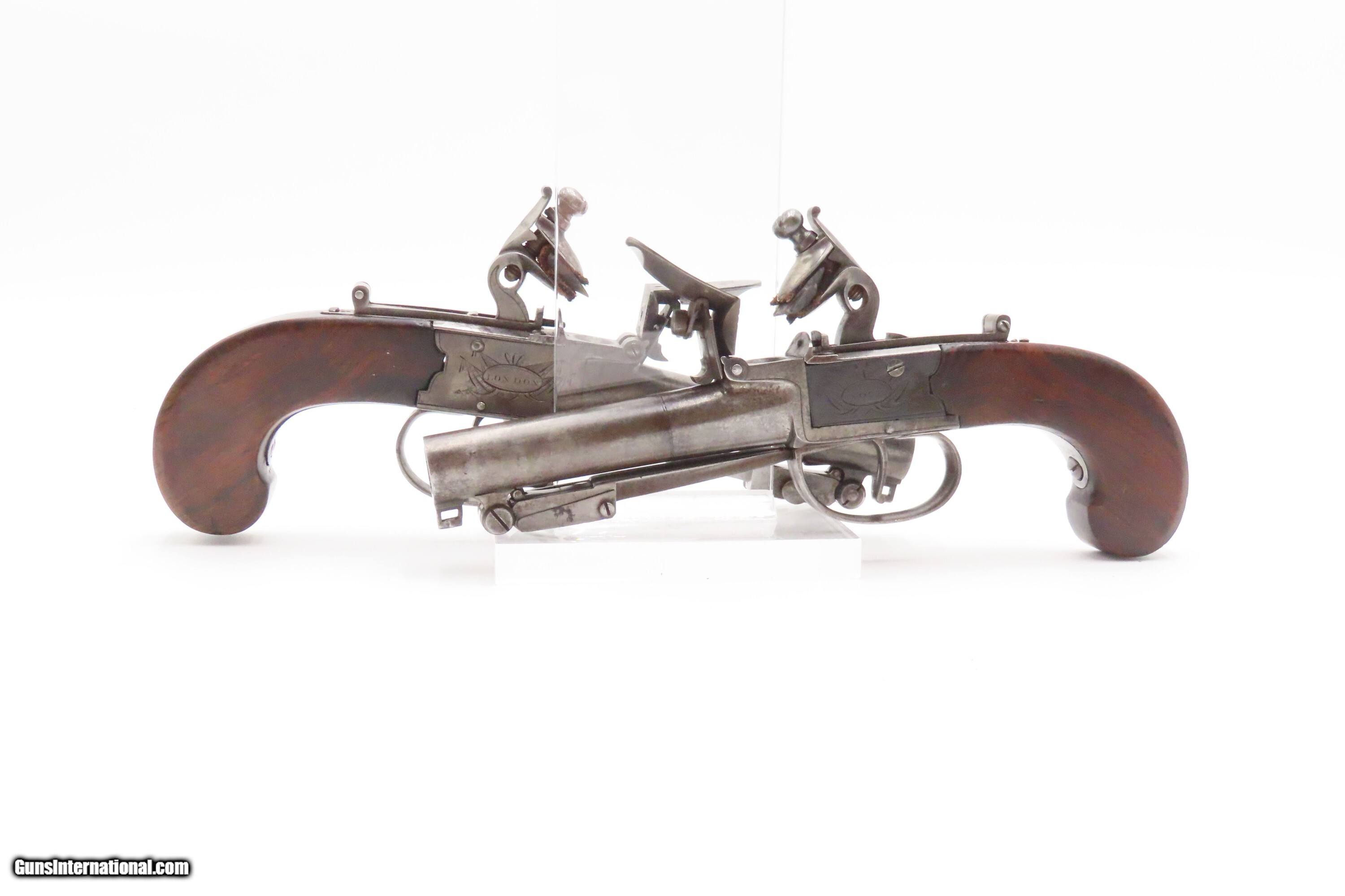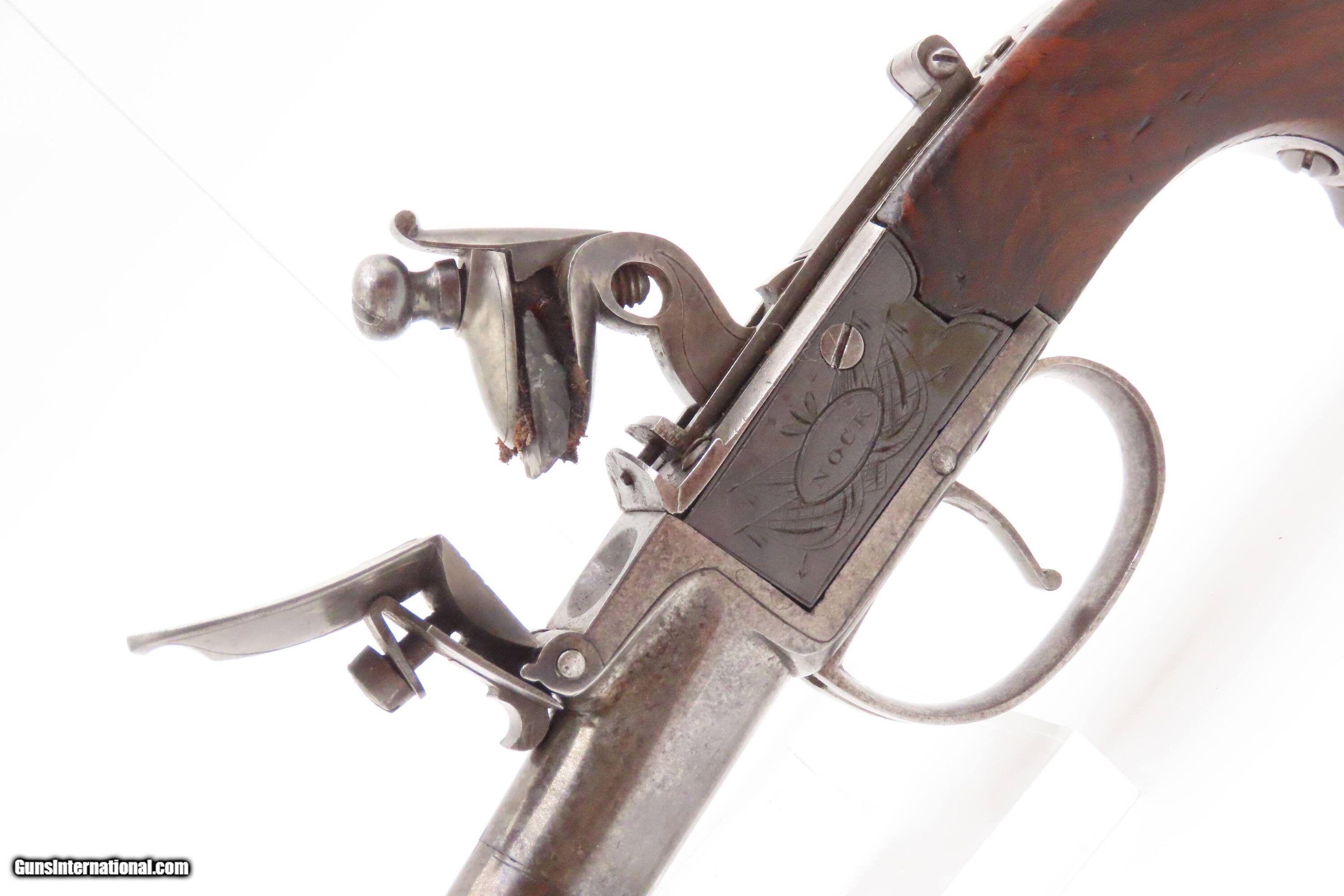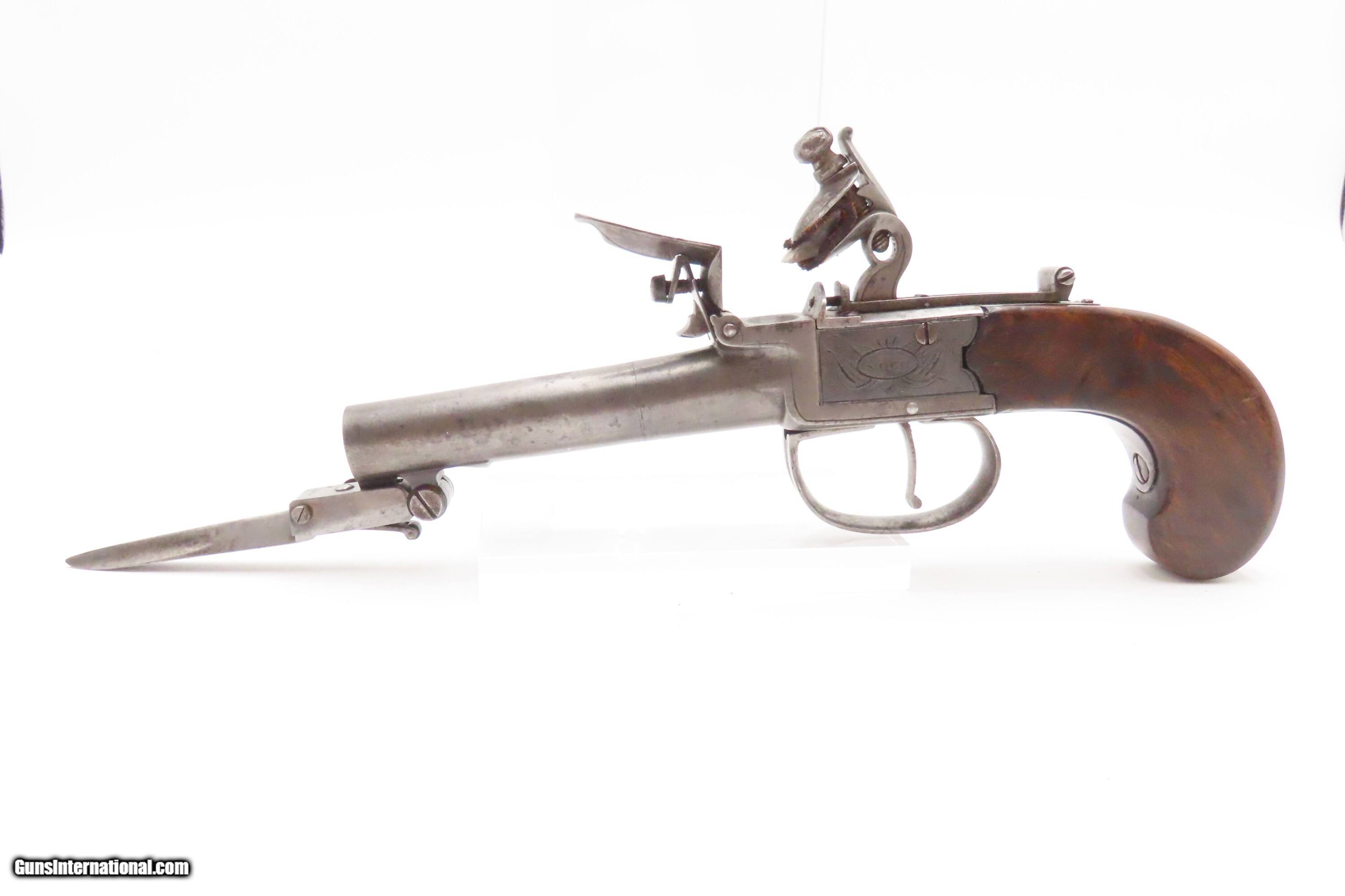 Description: ENGRAVED PAIR British Antique NOCK FLINTLOCK Boxlock Pistols SNAP BAYONETS LONDON Marked with PRE-1813 BIRMINGHAM PROOFS Here we present an antique Pair of Engraved Nock of London Flintlock Pocket Pistols, both with snap bayonets, made circa the early 1800 in London, England. These guns were manufactured by either Henry Nock or Samuel Nock, who was the nephew of famed innovative gunmaker Henry Nock and apprenticed under him. Samuel was first listed as a gunmaker in 1804 at Hawkesbury Place in London before moving to 180 Fleet Street between 1806 and 1822, and then between 1823 and 1852 he was in business at Regents Circus. After he died in 1851, the business was carried on by the executors from 1853 to 1858. He was also an accomplished gunmaker and worked through the transitional period from flintlocks to percussion systems. He served as a royal gunmaker to the English monarchy from King George III in 1805 up to Queen Victoria starting in 1837. These little self-defense pistols would have been most at home in the pocket of anyone in the busy cities of London, Paris and Liege during the early to mid-1800s. These style pistols are small, light and simple. The “Pocket Pistol” name says it all. They were the "Saturday Night Specials" of the 18th-19th century. Before the Deringer, they were "Gentleman's" or "Muff Pistols", typically, a smaller pistol that was easily concealed. They were favored among the gentry and women because of these traits. Men would carry them concealed in a waistcoat pocket and women would hide them in a hand muff. The overall condition is good. Various traces of original finish can be found, but mostly appear as a gray patina. Strong actions. Both bores have dimmed and remain smooth. Solid grips, both contain light handling evidence. Lightly engraved locks. The bayonets on both pistols “snap” and latch properly! Own the original! This is a legitimate antique and not a reproduction. Barrels are 2-3/8 inches. Calibers are both .45 Flintlock Overall condition as seen in photos. Very Fast. Very Safe. FREE SHIPPING WORLDWIDE. Delivered directly to your door by express mail! Guaranteed AUTHENTIC & Includes CERTIFICATE OF AUTHENTICITY. ancestryguns $3300 #250547 Antique: Yes Price: $3,300.00 Buy Now Pay with