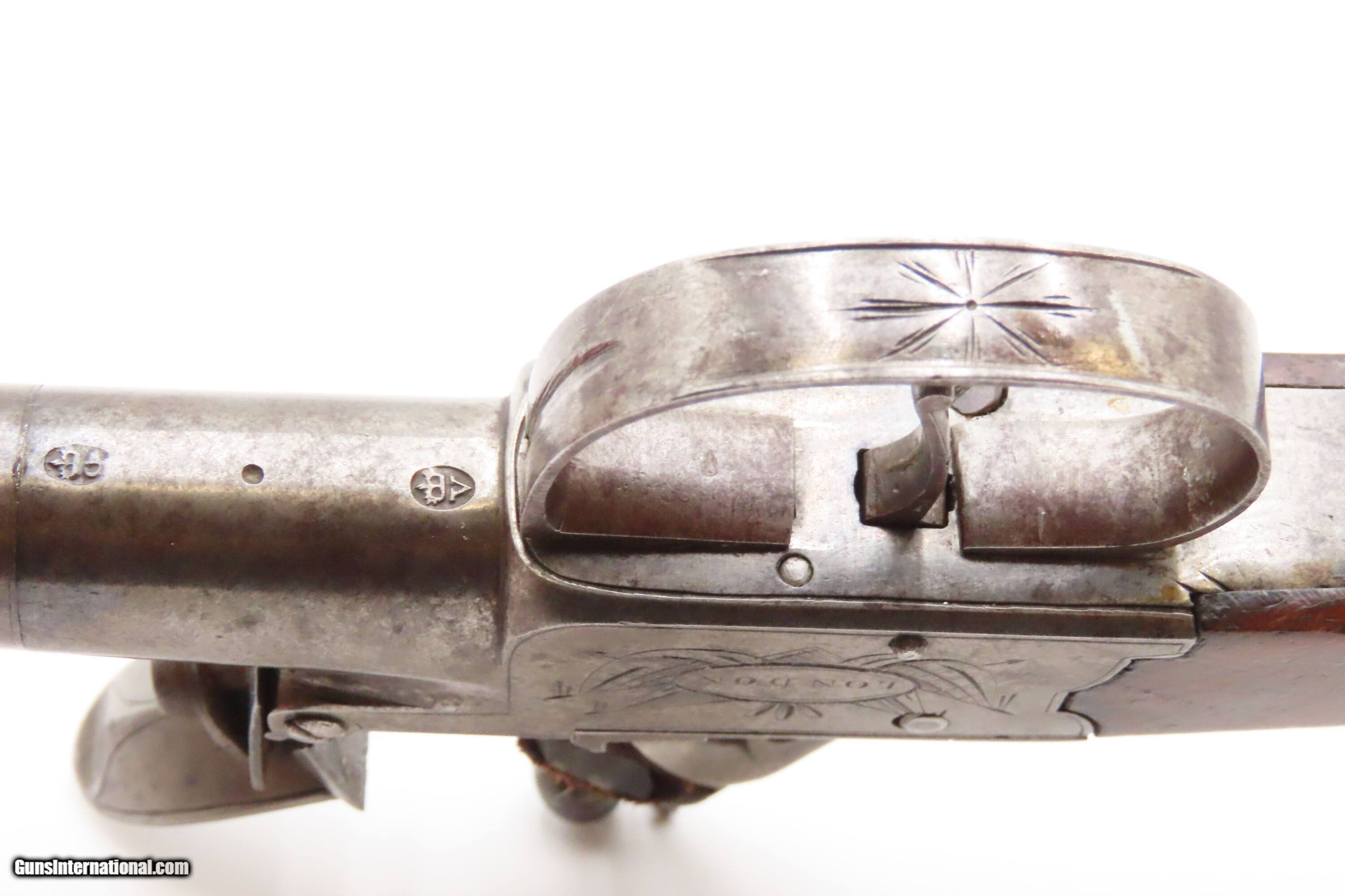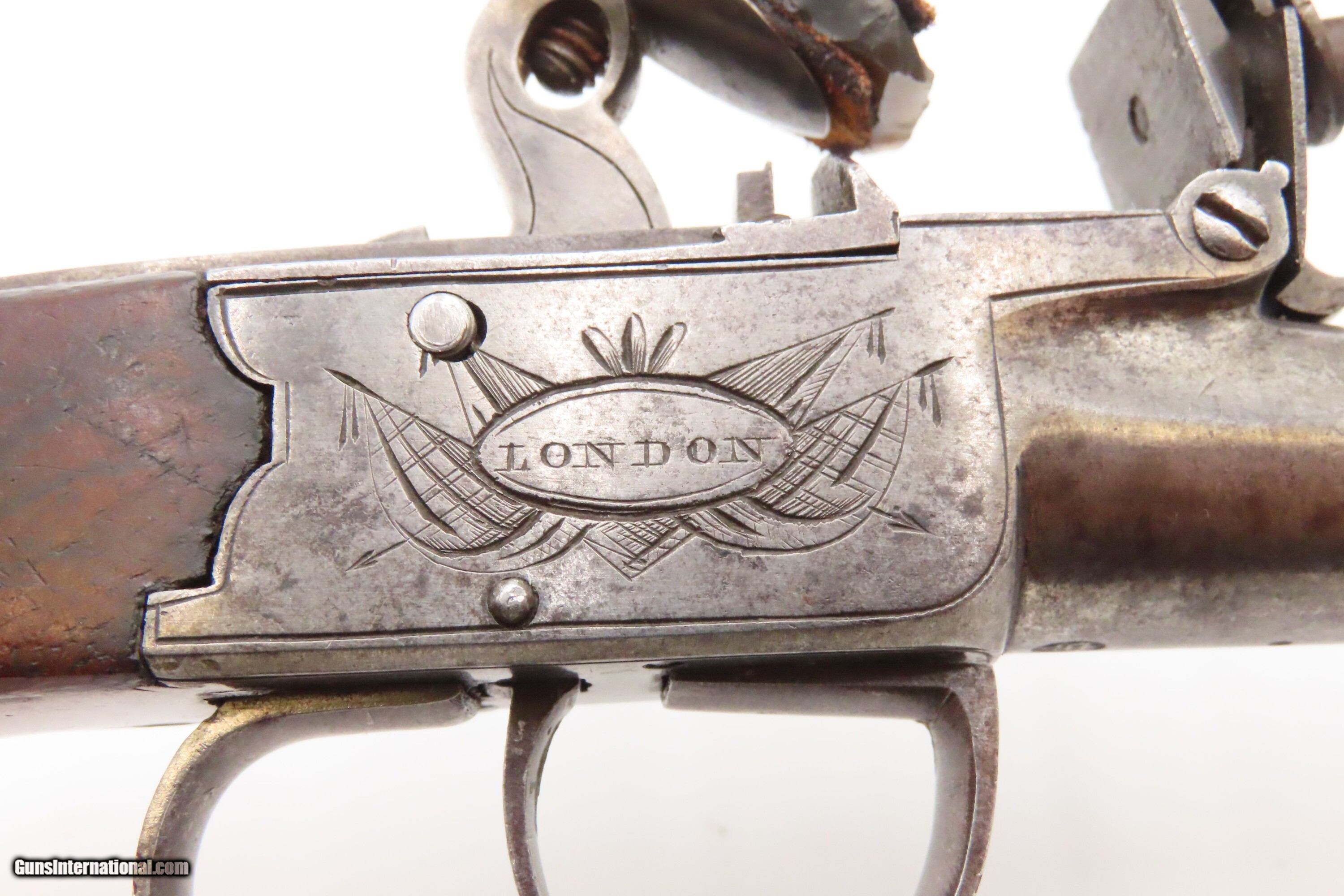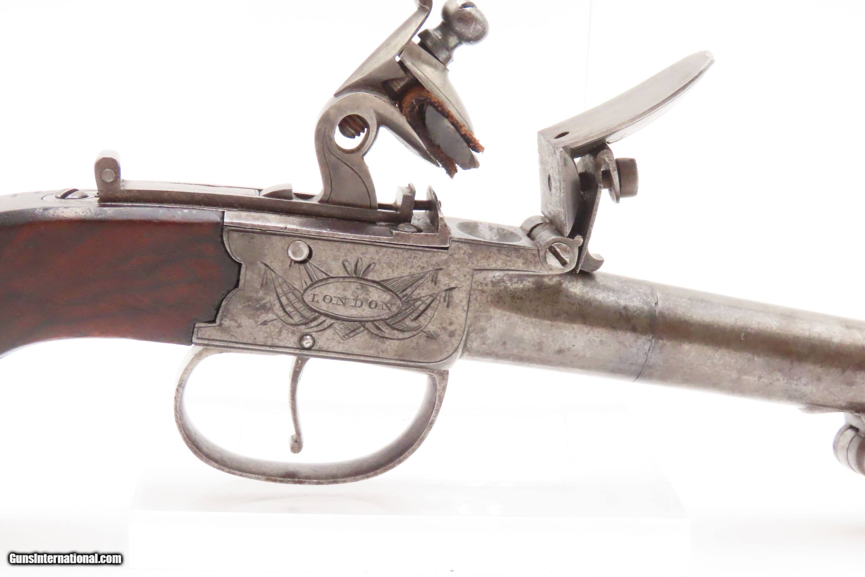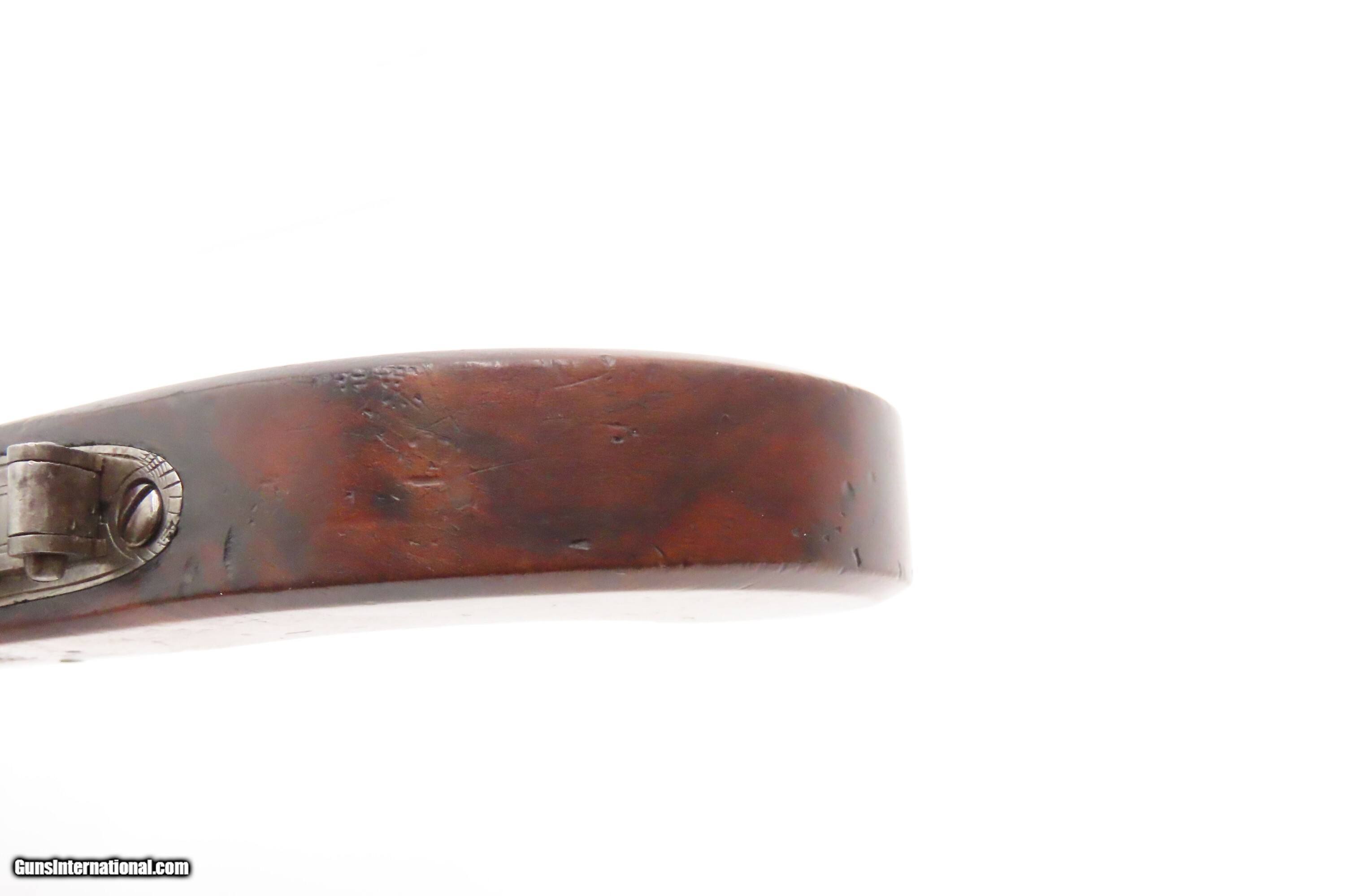 Description: ENGRAVED PAIR British Antique NOCK FLINTLOCK Boxlock Pistols SNAP BAYONETS LONDON Marked with PRE-1813 BIRMINGHAM PROOFS Here we present an antique Pair of Engraved Nock of London Flintlock Pocket Pistols, both with snap bayonets, made circa the early 1800 in London, England. These guns were manufactured by either Henry Nock or Samuel Nock, who was the nephew of famed innovative gunmaker Henry Nock and apprenticed under him. Samuel was first listed as a gunmaker in 1804 at Hawkesbury Place in London before moving to 180 Fleet Street between 1806 and 1822, and then between 1823 and 1852 he was in business at Regents Circus. After he died in 1851, the business was carried on by the executors from 1853 to 1858. He was also an accomplished gunmaker and worked through the transitional period from flintlocks to percussion systems. He served as a royal gunmaker to the English monarchy from King George III in 1805 up to Queen Victoria starting in 1837. These little self-defense pistols would have been most at home in the pocket of anyone in the busy cities of London, Paris and Liege during the early to mid-1800s. These style pistols are small, light and simple. The “Pocket Pistol” name says it all. They were the "Saturday Night Specials" of the 18th-19th century. Before the Deringer, they were "Gentleman's" or "Muff Pistols", typically, a smaller pistol that was easily concealed. They were favored among the gentry and women because of these traits. Men would carry them concealed in a waistcoat pocket and women would hide them in a hand muff. The overall condition is good. Various traces of original finish can be found, but mostly appear as a gray patina. Strong actions. Both bores have dimmed and remain smooth. Solid grips, both contain light handling evidence. Lightly engraved locks. The bayonets on both pistols “snap” and latch properly! Own the original! This is a legitimate antique and not a reproduction. Barrels are 2-3/8 inches. Calibers are both .45 Flintlock Overall condition as seen in photos. Very Fast. Very Safe. FREE SHIPPING WORLDWIDE. Delivered directly to your door by express mail! Guaranteed AUTHENTIC & Includes CERTIFICATE OF AUTHENTICITY. ancestryguns $3300 #250547 Antique: Yes Price: $3,300.00 Buy Now Pay with