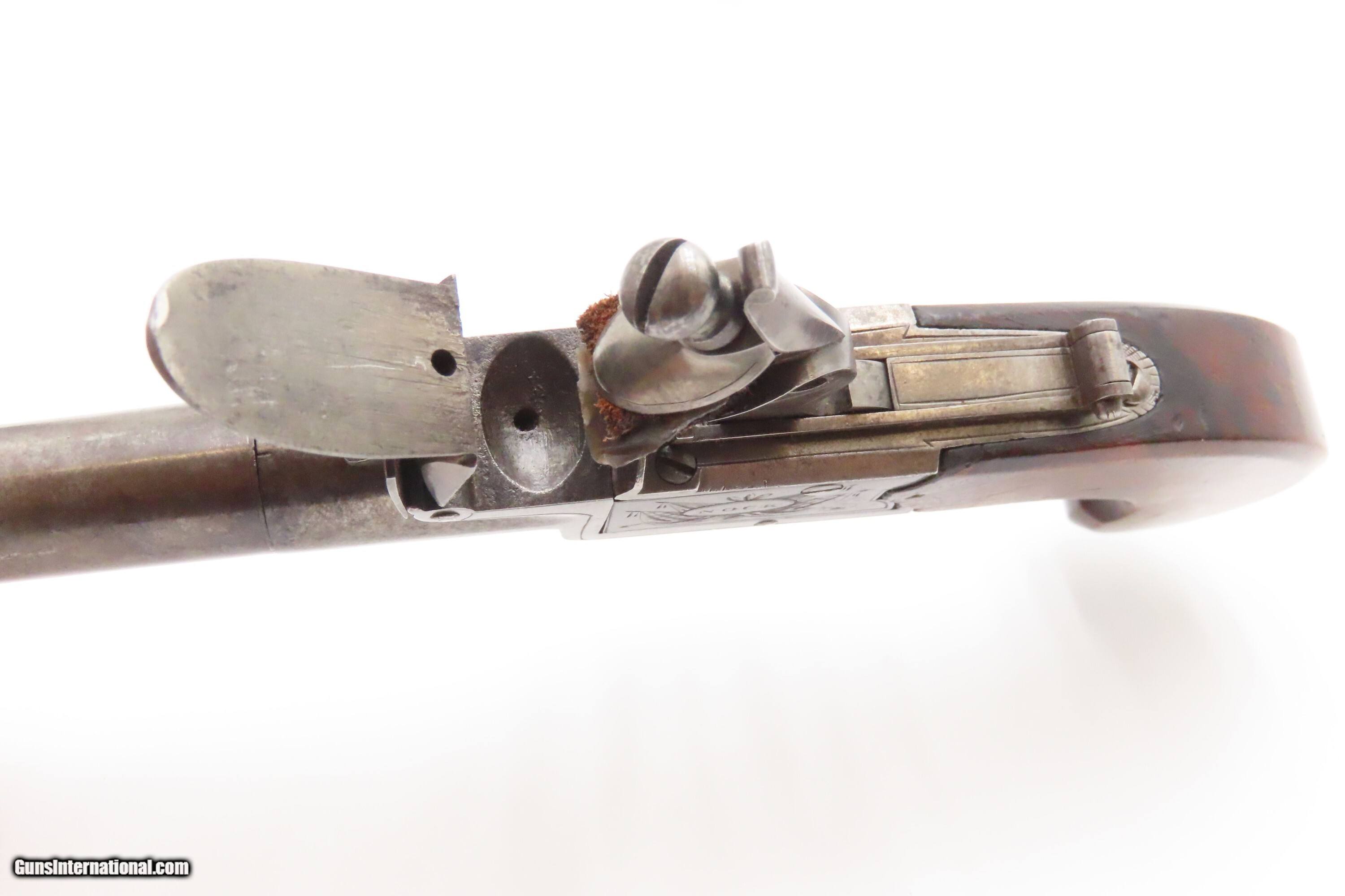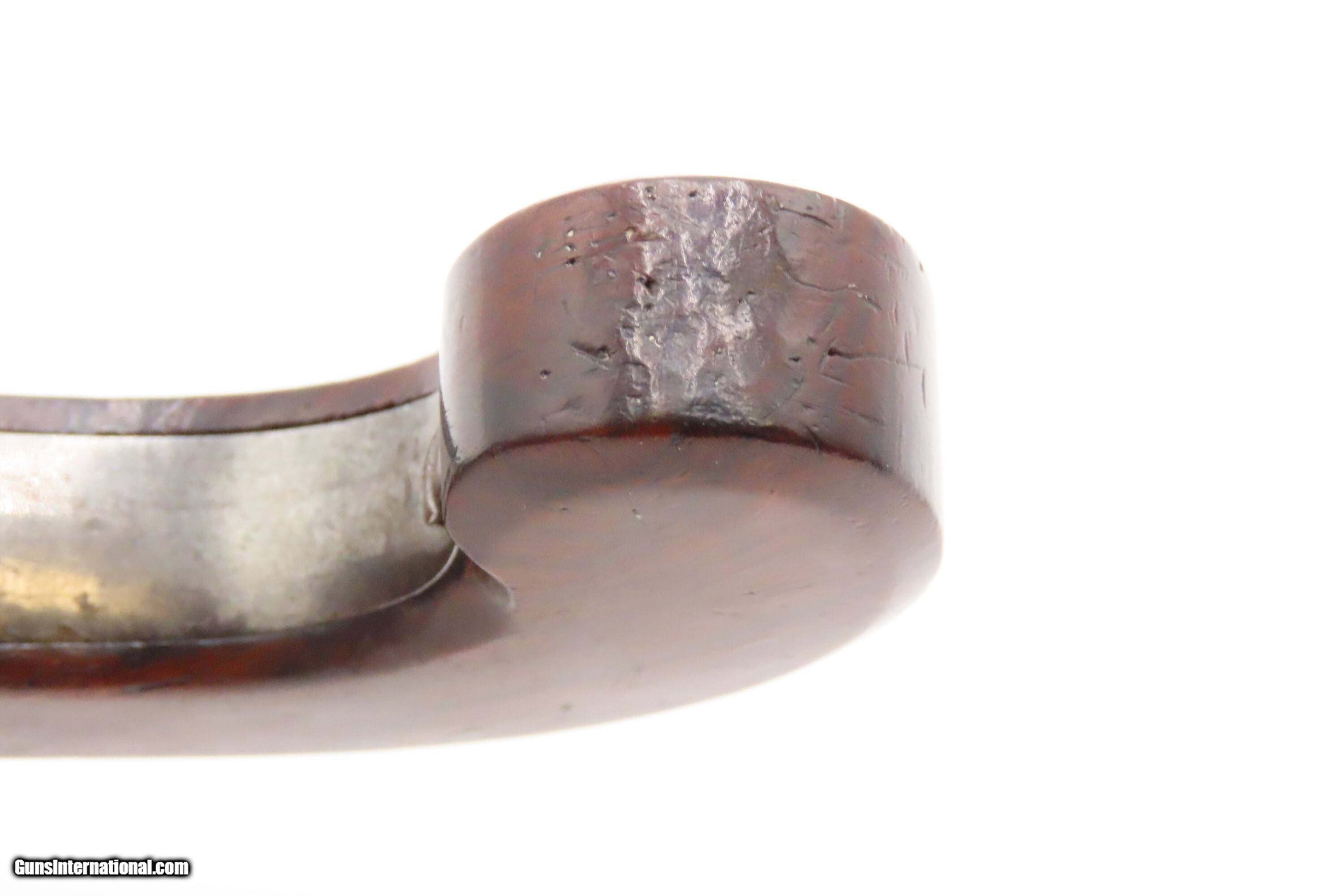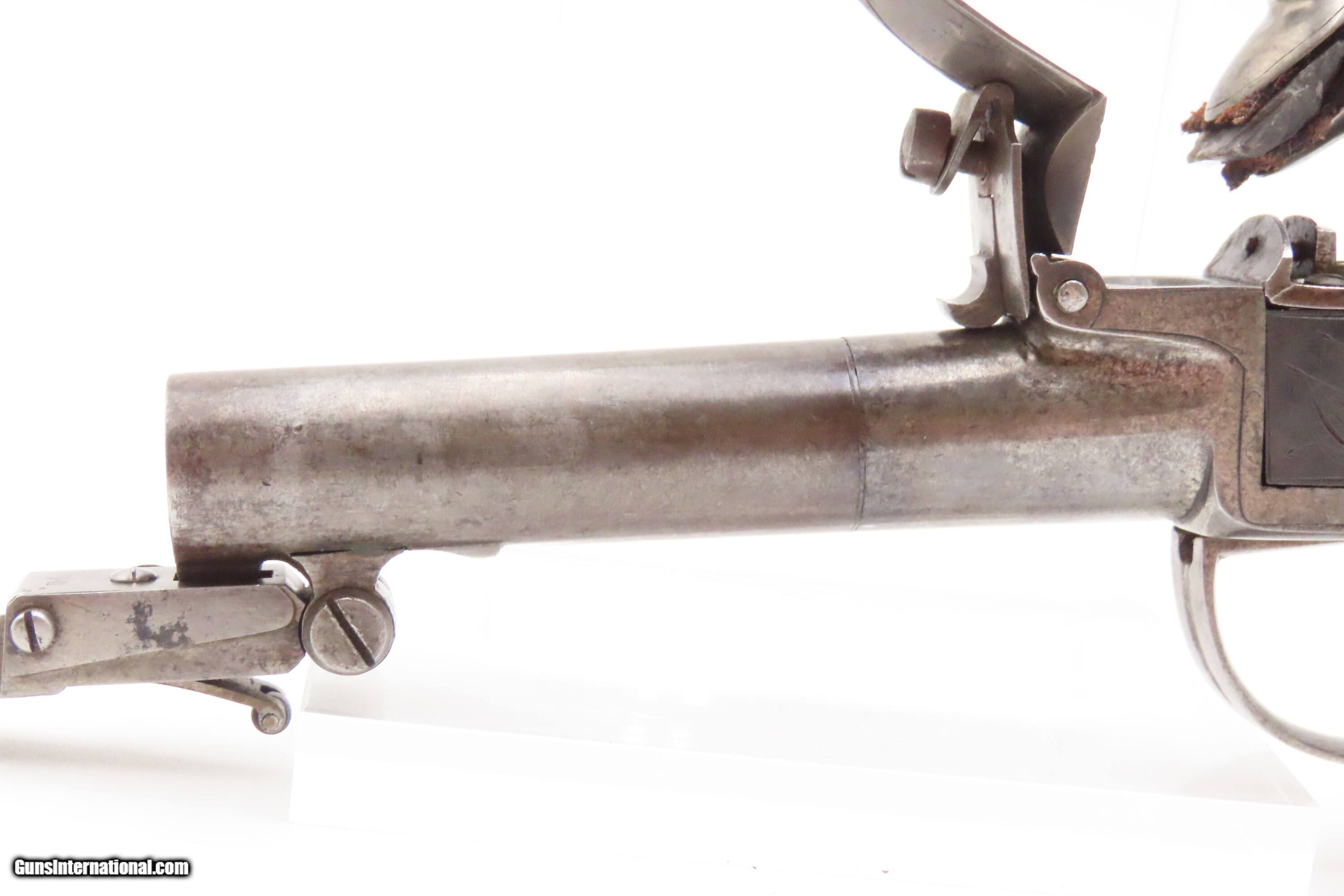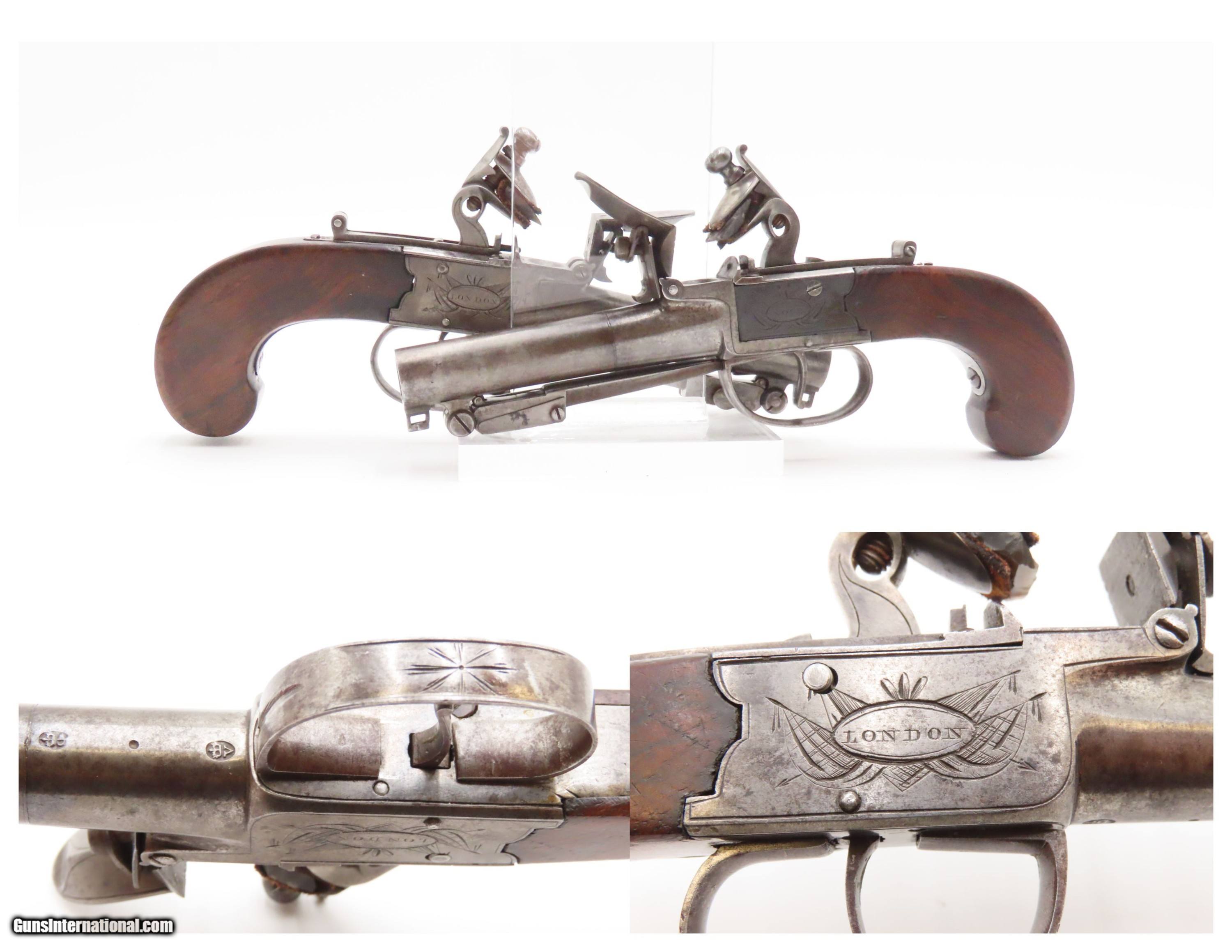 Description: ENGRAVED PAIR British Antique NOCK FLINTLOCK Boxlock Pistols SNAP BAYONETS LONDON Marked with PRE-1813 BIRMINGHAM PROOFS Here we present an antique Pair of Engraved Nock of London Flintlock Pocket Pistols, both with snap bayonets, made circa the early 1800 in London, England. These guns were manufactured by either Henry Nock or Samuel Nock, who was the nephew of famed innovative gunmaker Henry Nock and apprenticed under him. Samuel was first listed as a gunmaker in 1804 at Hawkesbury Place in London before moving to 180 Fleet Street between 1806 and 1822, and then between 1823 and 1852 he was in business at Regents Circus. After he died in 1851, the business was carried on by the executors from 1853 to 1858. He was also an accomplished gunmaker and worked through the transitional period from flintlocks to percussion systems. He served as a royal gunmaker to the English monarchy from King George III in 1805 up to Queen Victoria starting in 1837. These little self-defense pistols would have been most at home in the pocket of anyone in the busy cities of London, Paris and Liege during the early to mid-1800s. These style pistols are small, light and simple. The “Pocket Pistol” name says it all. They were the "Saturday Night Specials" of the 18th-19th century. Before the Deringer, they were "Gentleman's" or "Muff Pistols", typically, a smaller pistol that was easily concealed. They were favored among the gentry and women because of these traits. Men would carry them concealed in a waistcoat pocket and women would hide them in a hand muff. The overall condition is good. Various traces of original finish can be found, but mostly appear as a gray patina. Strong actions. Both bores have dimmed and remain smooth. Solid grips, both contain light handling evidence. Lightly engraved locks. The bayonets on both pistols “snap” and latch properly! Own the original! This is a legitimate antique and not a reproduction. Barrels are 2-3/8 inches. Calibers are both .45 Flintlock Overall condition as seen in photos. Very Fast. Very Safe. FREE SHIPPING WORLDWIDE. Delivered directly to your door by express mail! Guaranteed AUTHENTIC & Includes CERTIFICATE OF AUTHENTICITY. ancestryguns $3300 #250547 Antique: Yes Price: $3,300.00 Buy Now Pay with