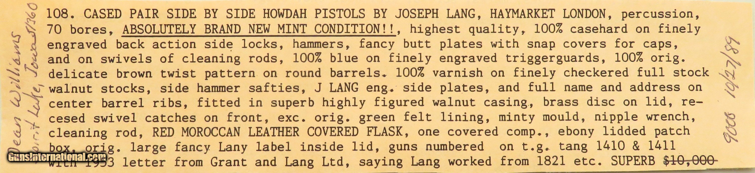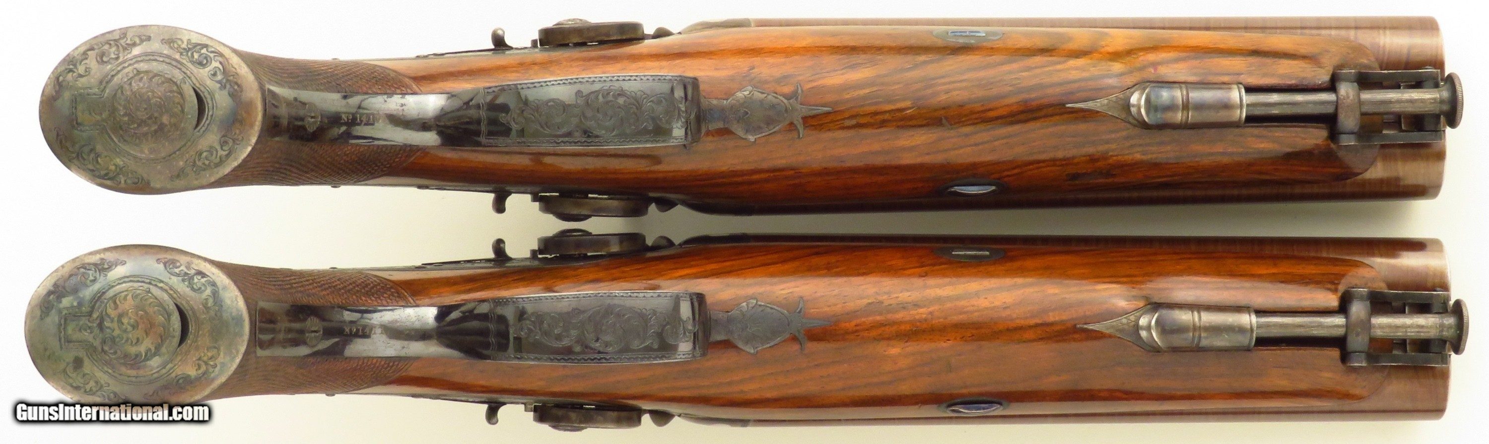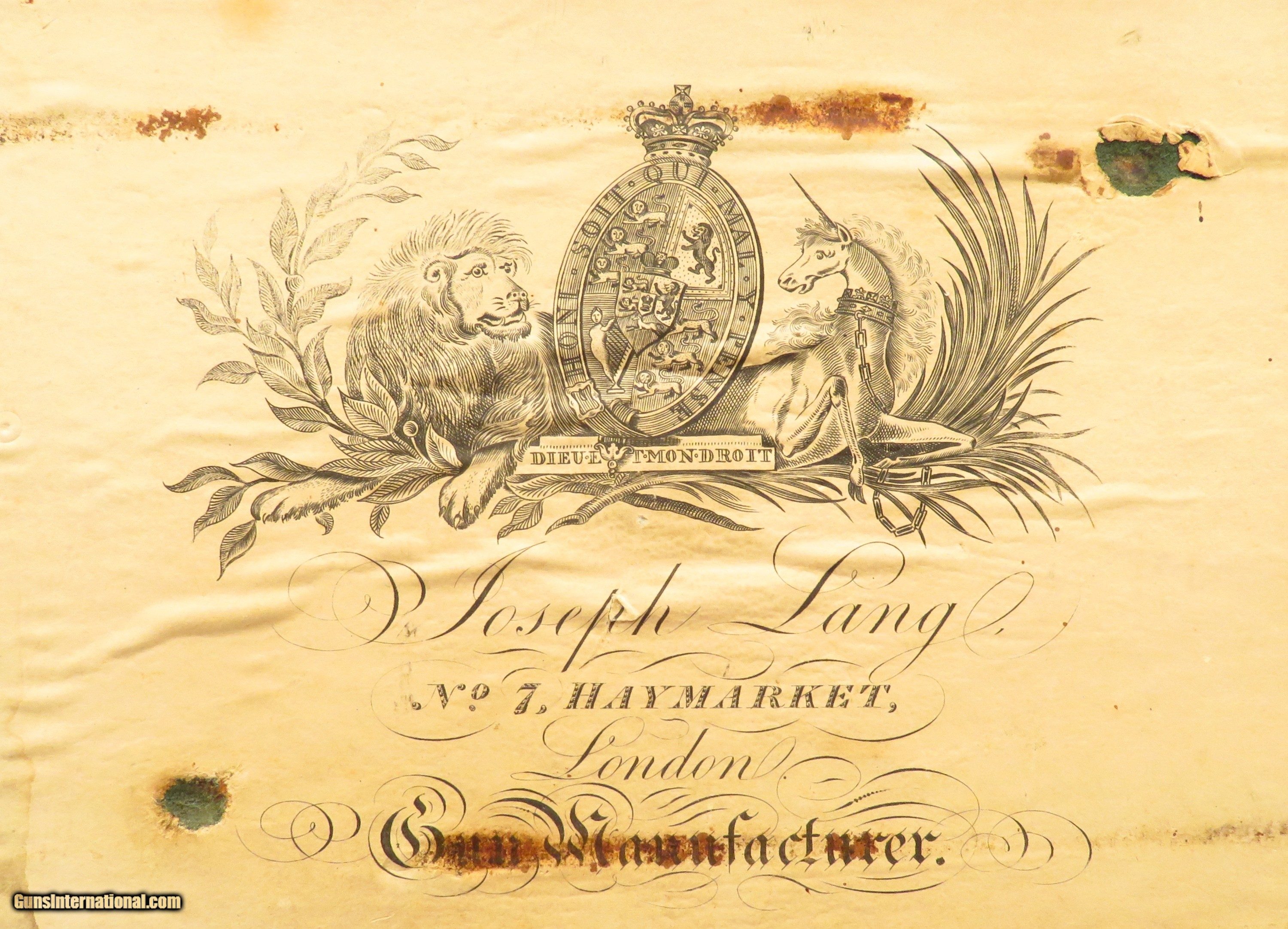 Pair Lang .70 bore percussion howdah pistols, London, cased, circa 1850, consecutive, safeties, engraved, layaway
