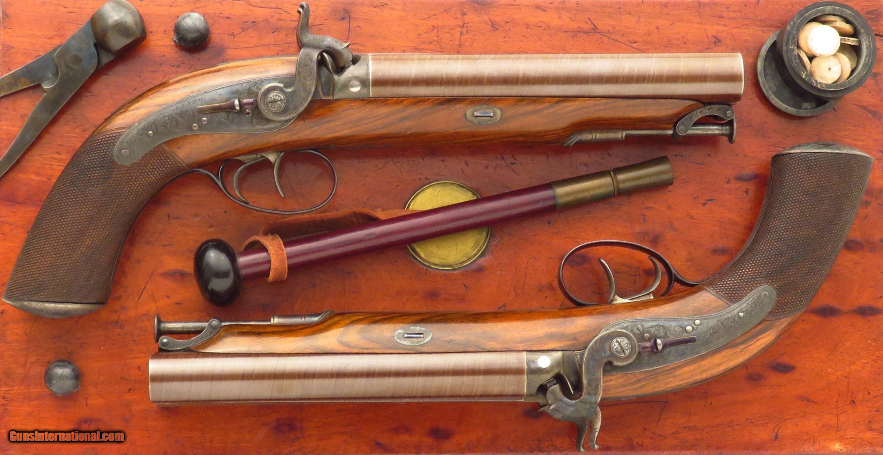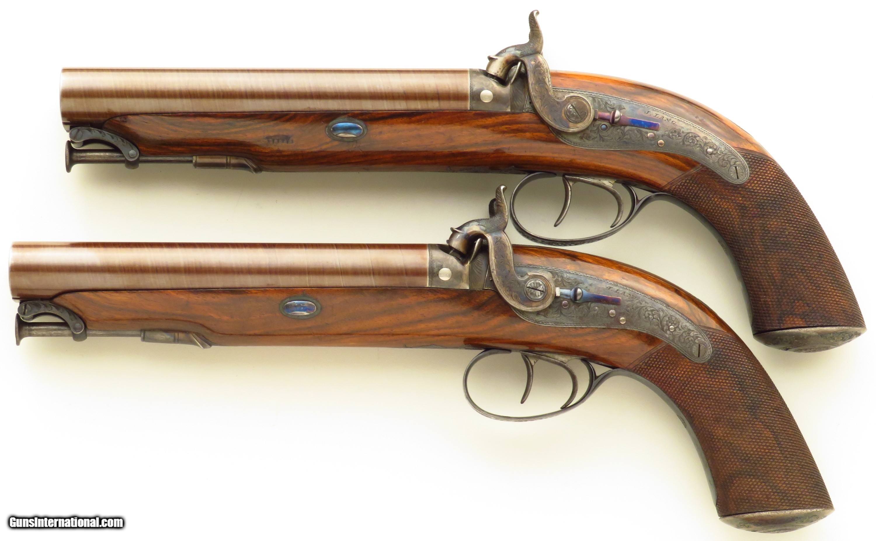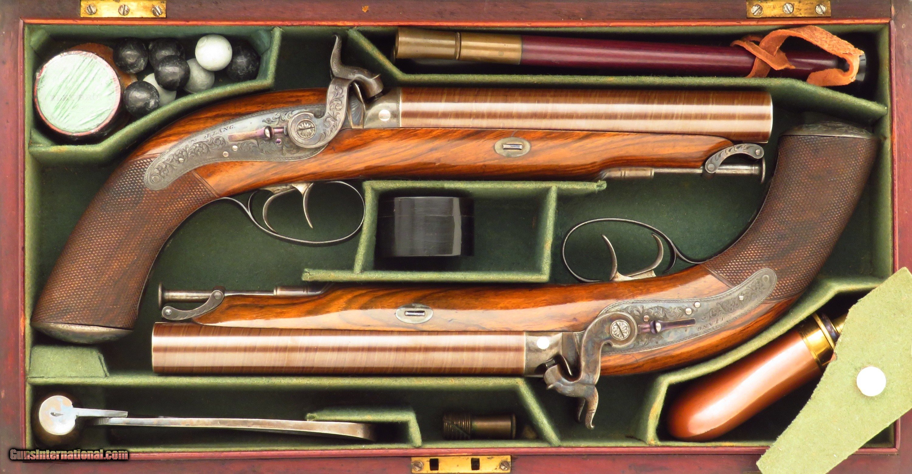 Pair Lang .70 bore percussion howdah pistols, London, cased, circa 1850, consecutive, safeties, engraved, layaway