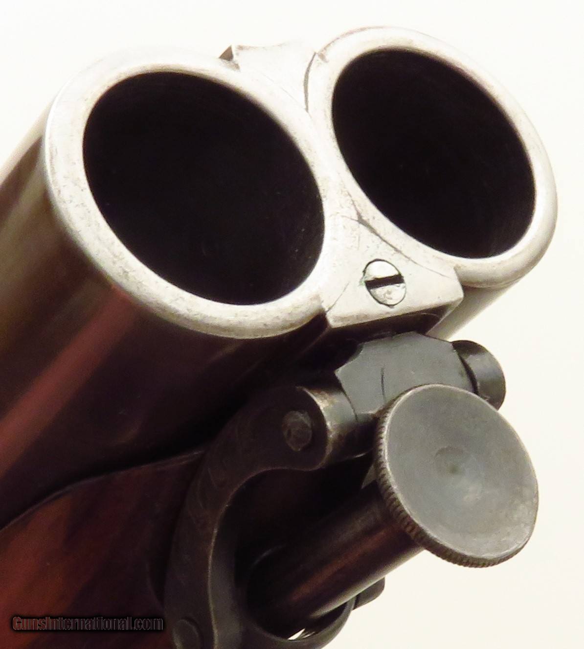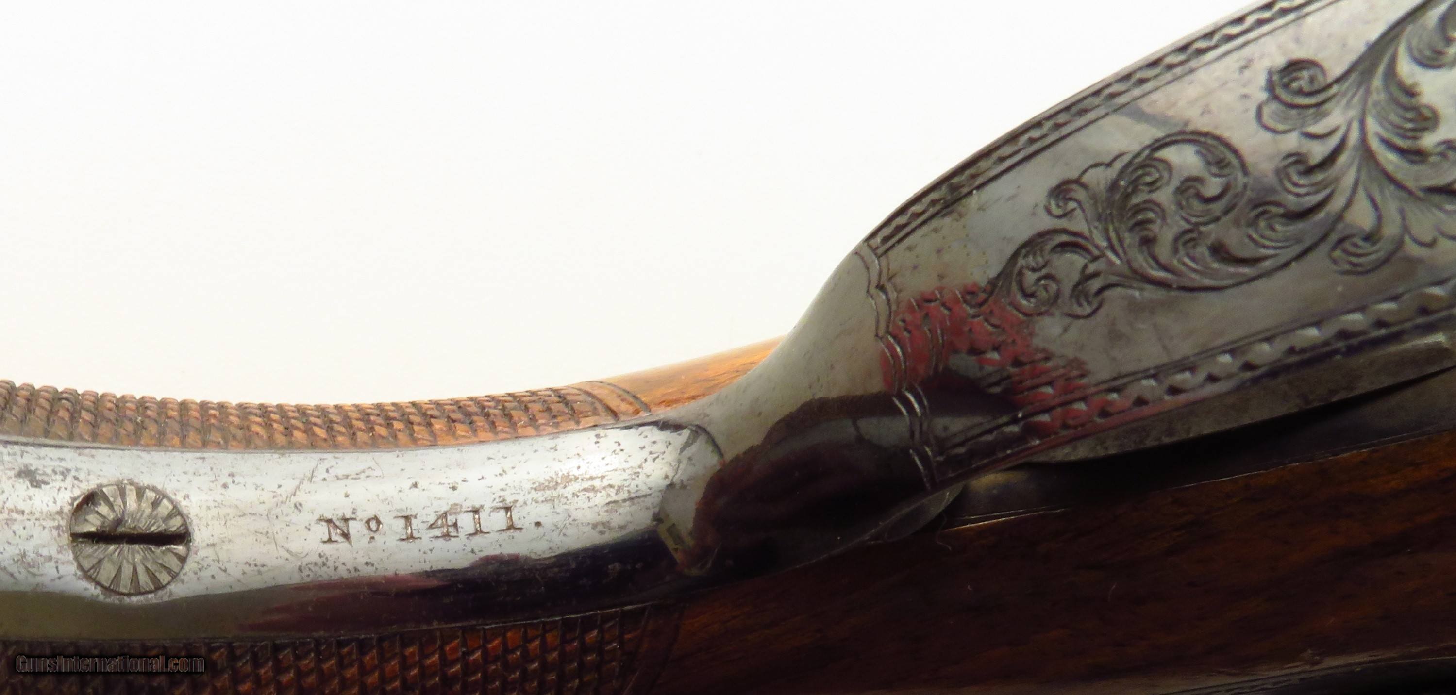 Description: Superlative pair of Lang .70 bore percussion howdah pistols. Made in London circa 1850, serials 1410 and 1411 have 6.5-inch Damascus barrels (smoothbore, ..895-inch muzzle diameter, .695-inch bore diameter, bead). Features include hammer safeties, brown/color case/polished blue/niter finishes and trapdoor grip caps. Individual weight is 2.8 pounds. ENGRAVING: Tangs, sides and trap are dressed with delicate scroll. Hammers take the form of trumpeting elephant. Engraving and markings are tack sharp. Initial plates are blank. CONDITION: Bores are smooth and bright with some areas of light superficial browning. Barrel brown is approximately 90 percent. Colors are approximately 60 percent with some tarnish on the sides, hammers and cap. Blue is approximately 70 percent. Niter is approximately 50 percent. Wood may have added finish and shows at approximately 85 percent. CASE: The case with maker's label, tools and bullet mold is in good condition. The price is firm and layaway is available. $6,750 plus shipping. Antique: Yes Price: $6,750.00 Shipping: $125.00 Contact Seller |