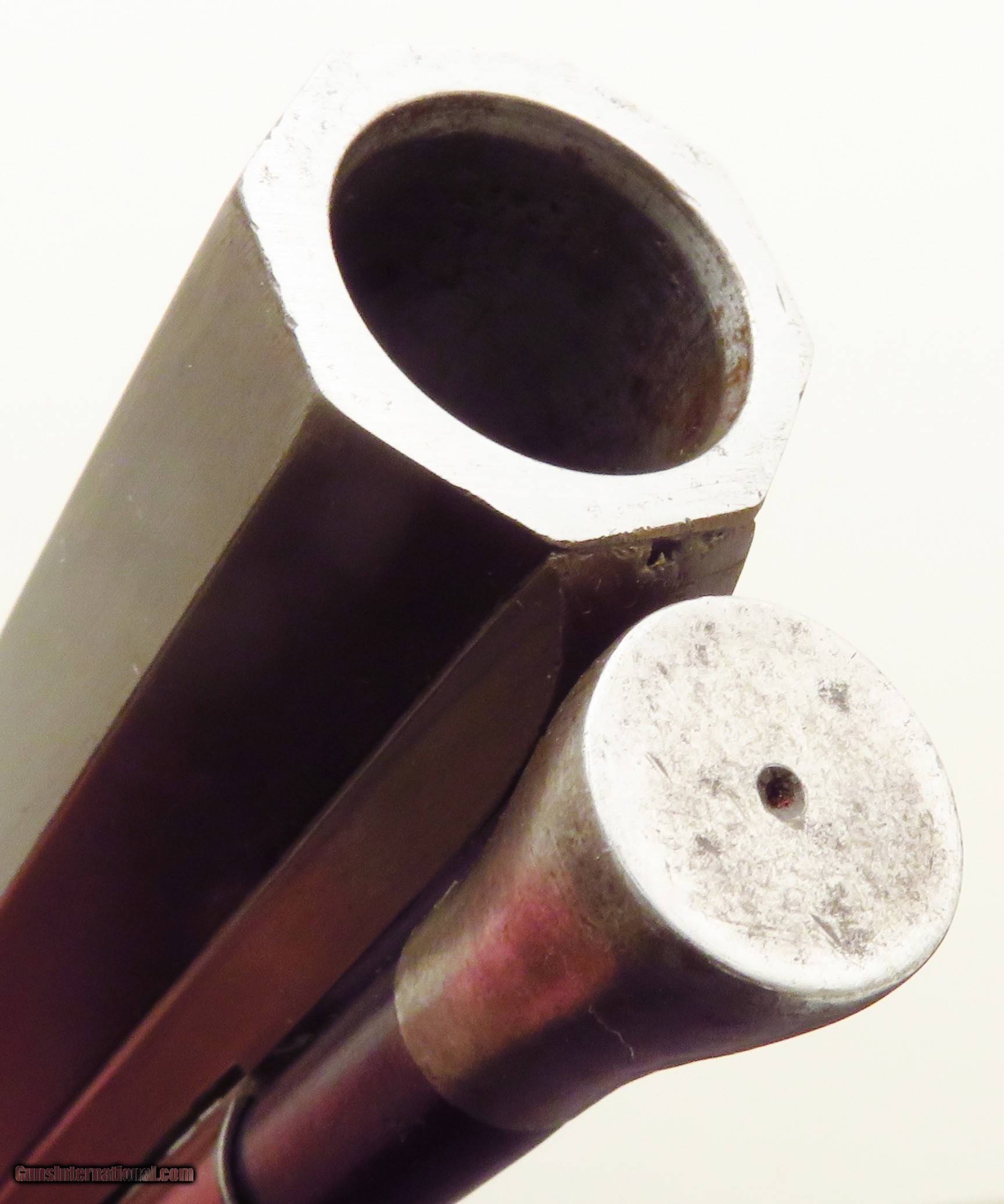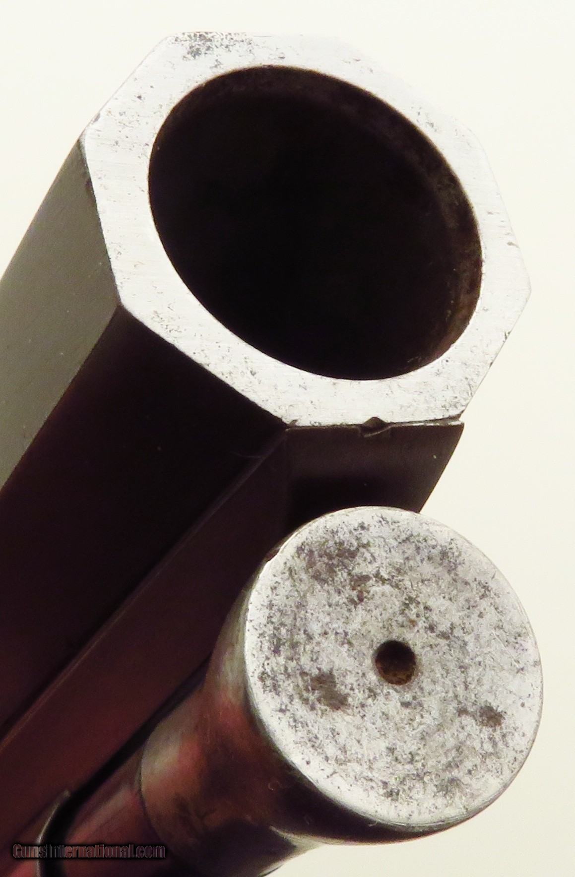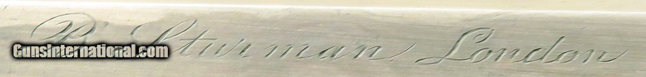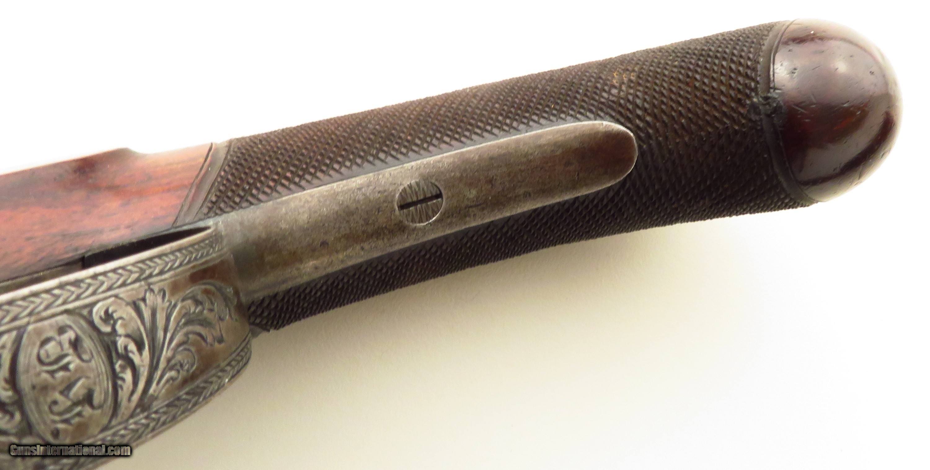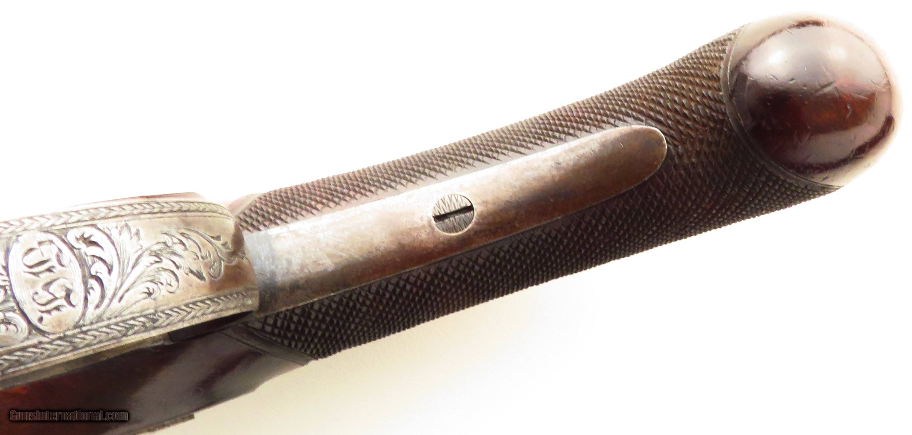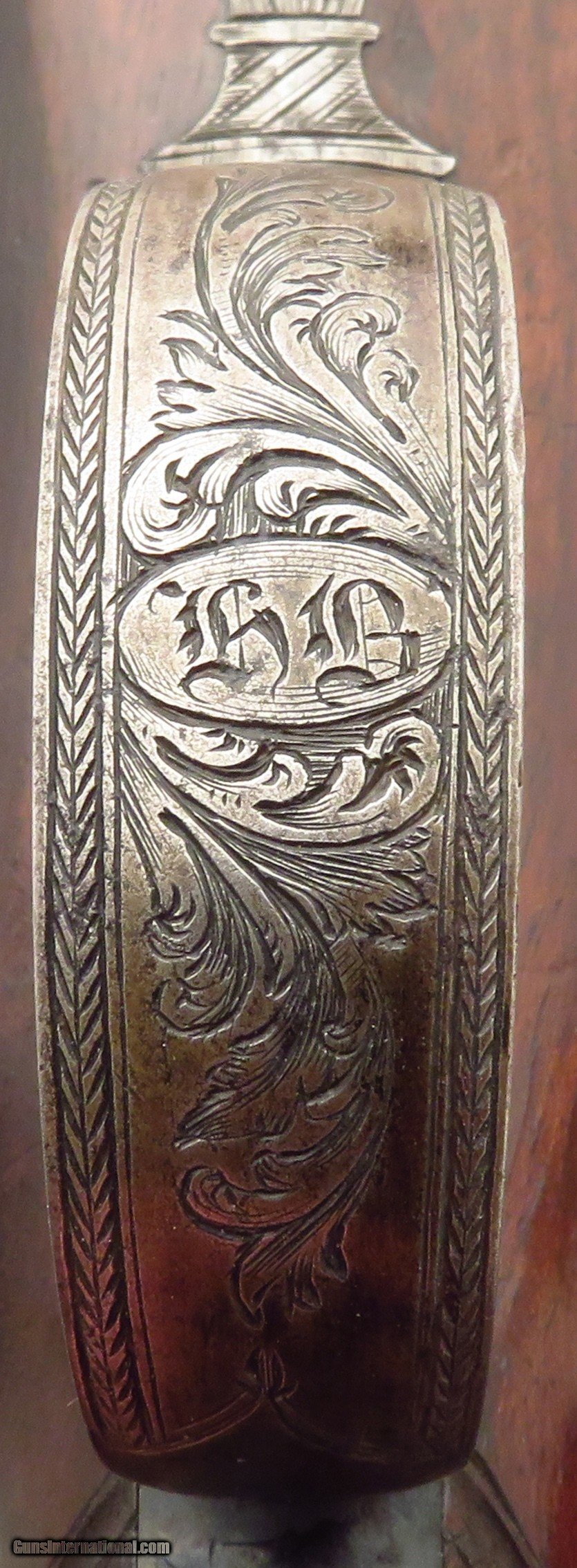Description: B. Sturman (London) pair of .60 caliber dueling pistols. Made circa 1815, features include 9.5-inch octagon barrels (smoothbore, .835-inch at the flats, .600-inch bore diameter, bead), engraving with gold bands and hammer safeties. Individual weight is 2.0 pounds. CONDITION: Bores are browned with moderate pitting. Mechanics are solid. As refinished, barrel brown is approximately 80 percent with instances of minor roughness. Colors have silvered with some tarnish. Wood is solid and approximately 70 percent. CASE: A vintage case (sans label) includes a mold, flask and other tools and shows in fair condition. The price is firm and layaway is available. $8,500 plus shipping. Price: $8,500.00 Shipping: $200.00 Contact Seller |
