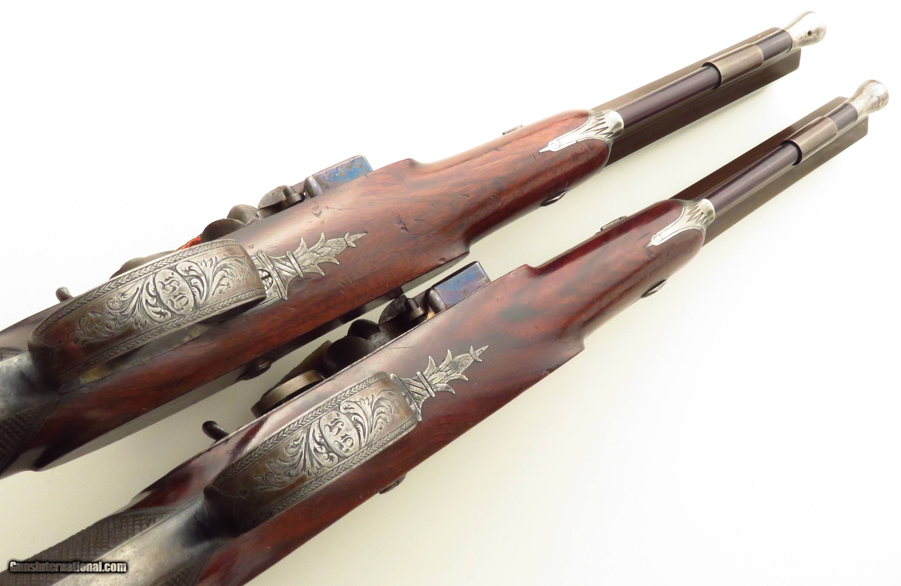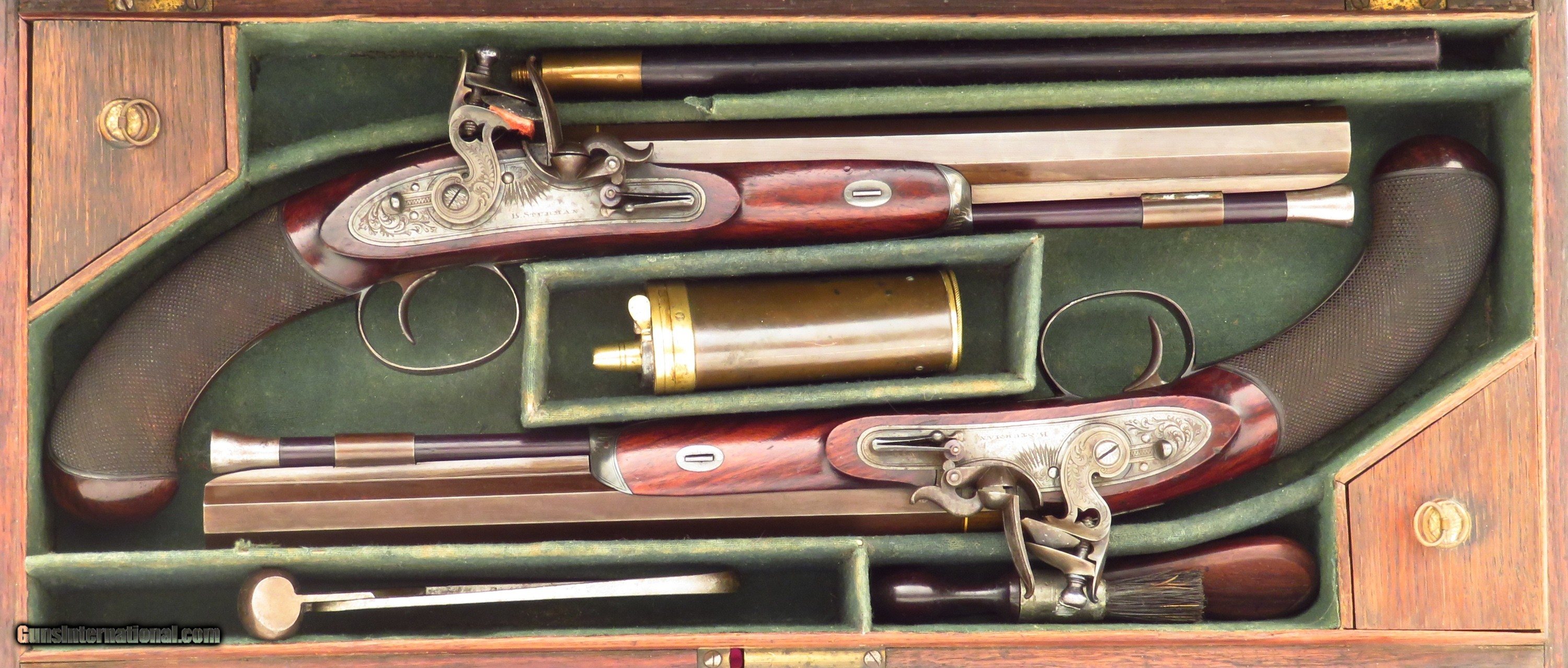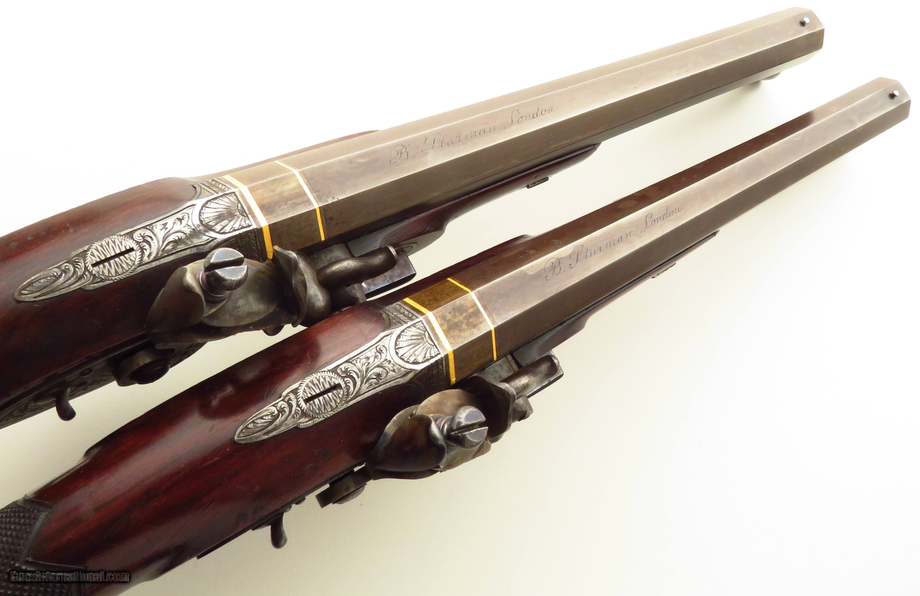 Pair Sturman (London) .60 caliber dueling pistols, engraved, cased, layaway