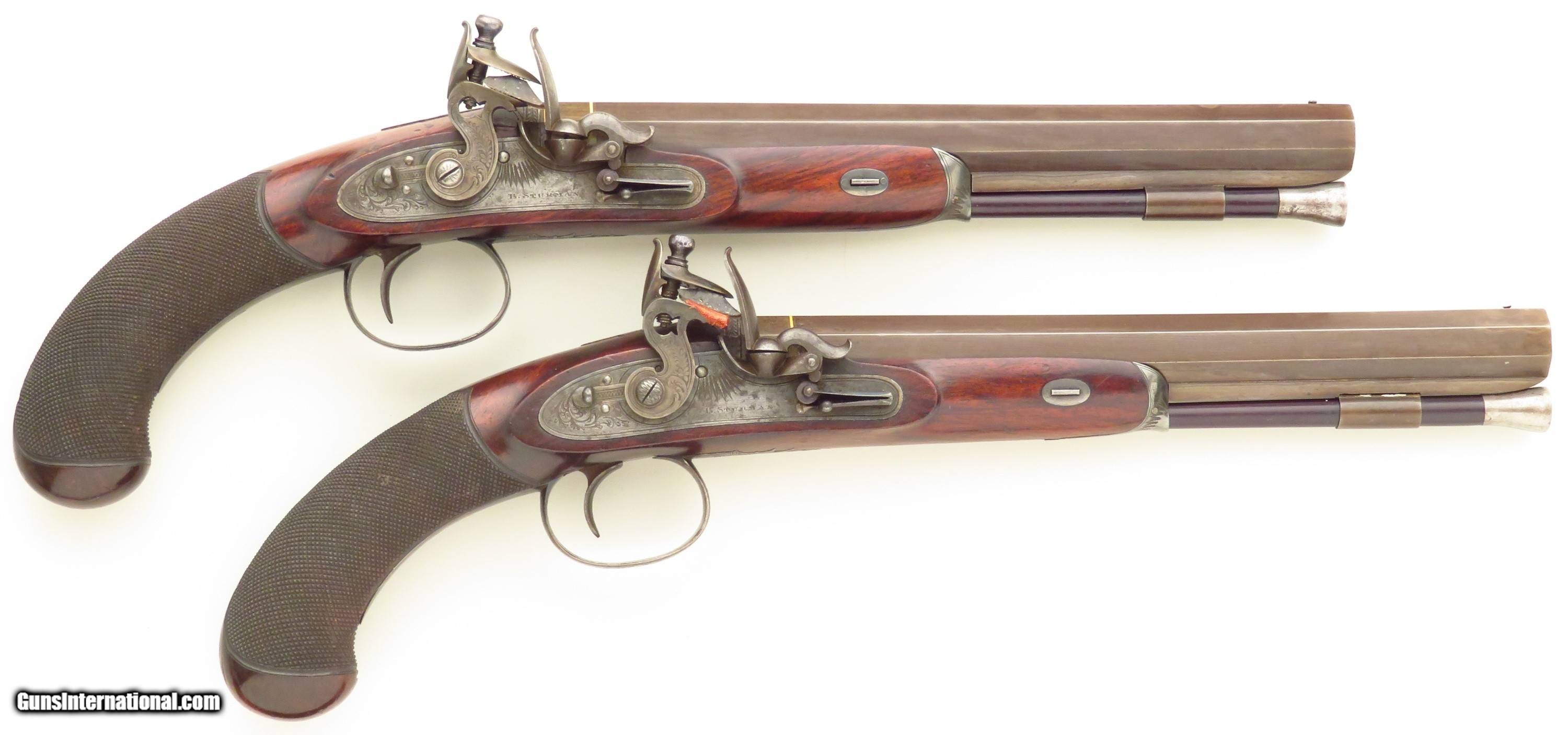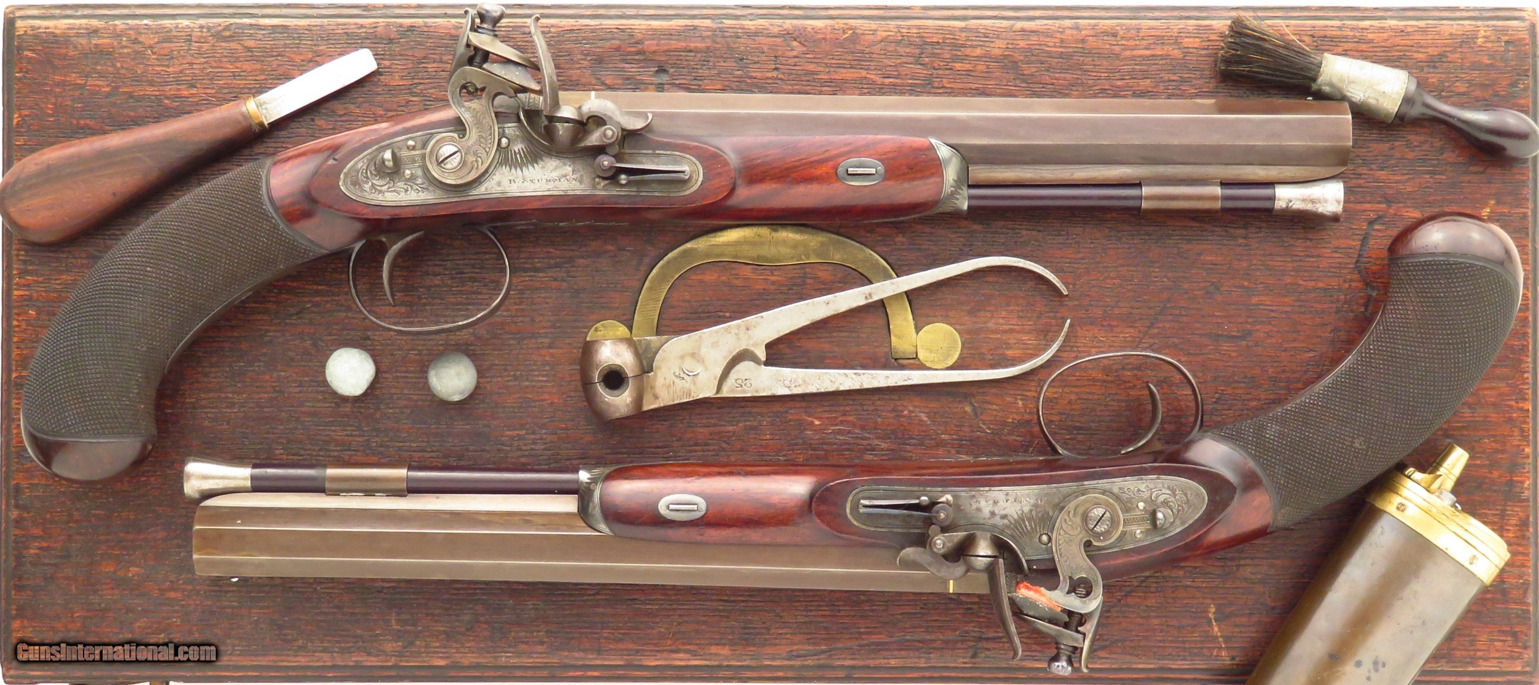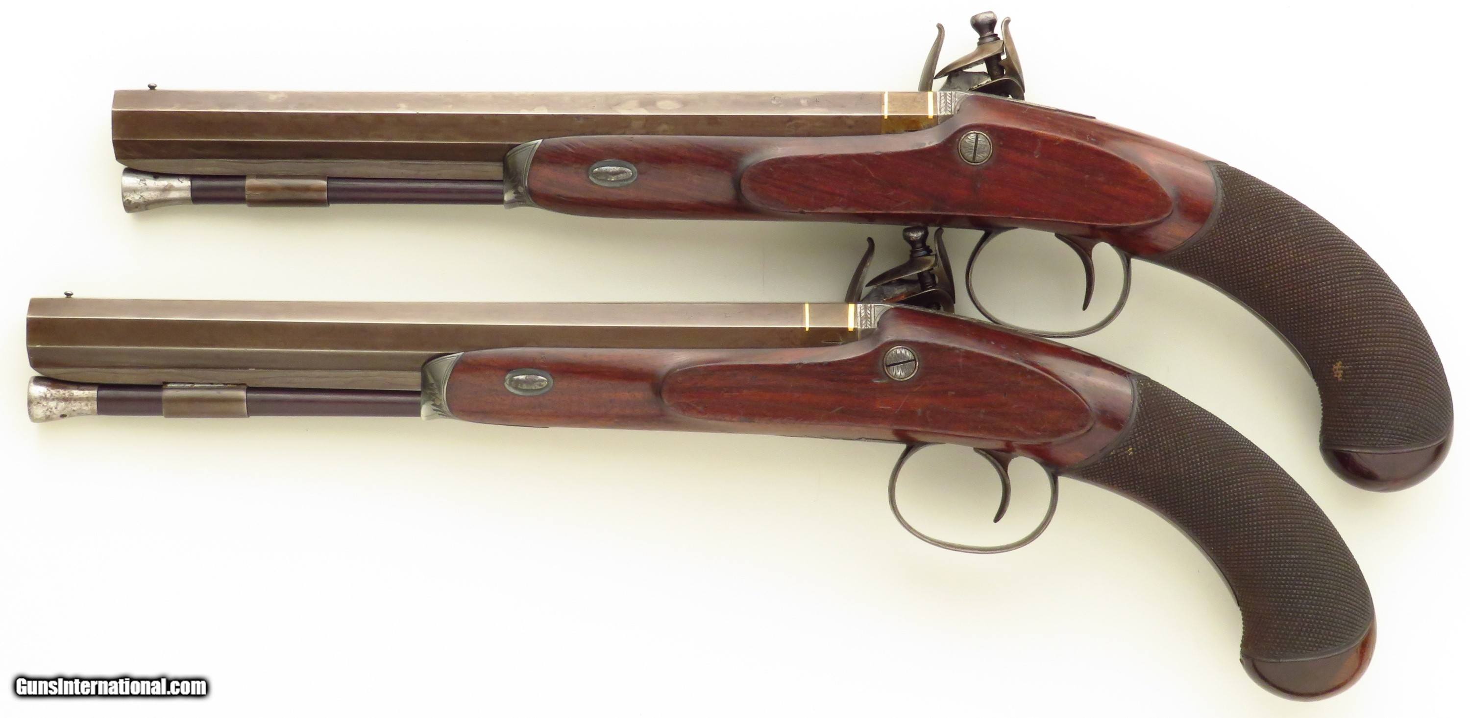 Pair Sturman (London) .60 caliber dueling pistols, engraved, cased, layaway