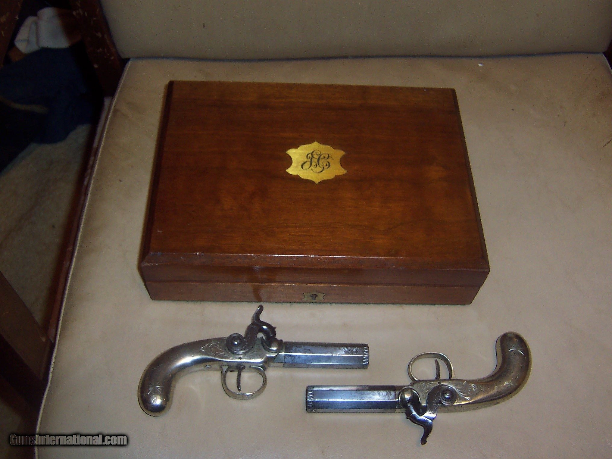 Description: nice guns .. but wont hold on cock,, 38 caliber smoth bore .. made by robert angell in perth scotland maker to prince albert,,,, 1782 -1857,,,, look like bermingham proofl marks,, ivory accessorys , all in ex condition ,, frame of pistols are made of non metalic metall may be silver dont see brass showing thruogh case is nice original SOLD Antique: Yes |