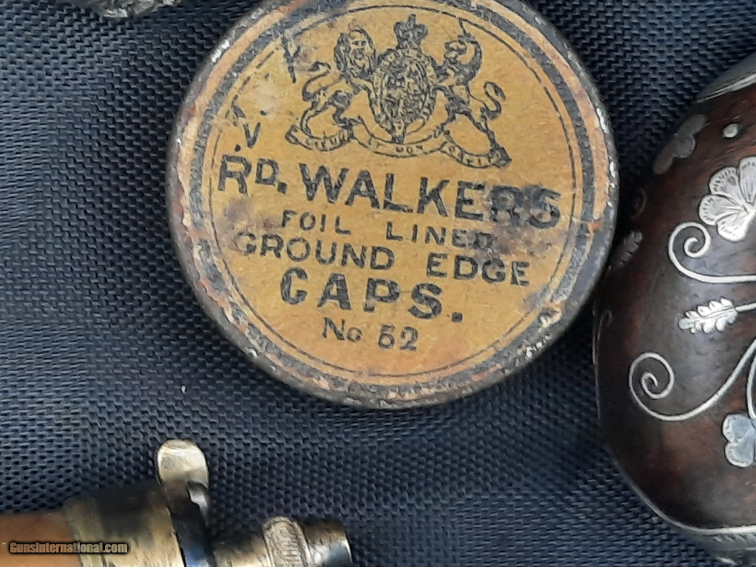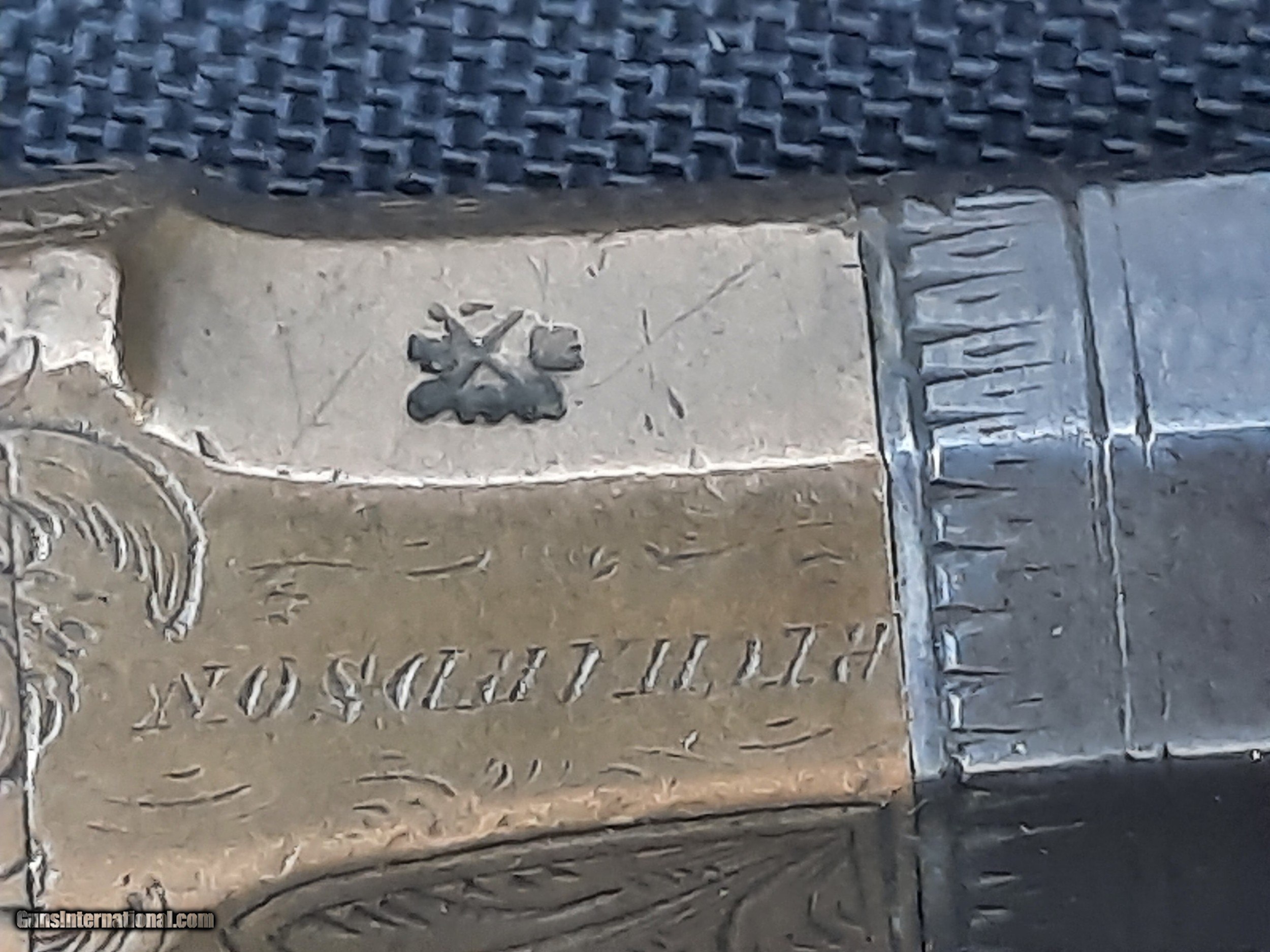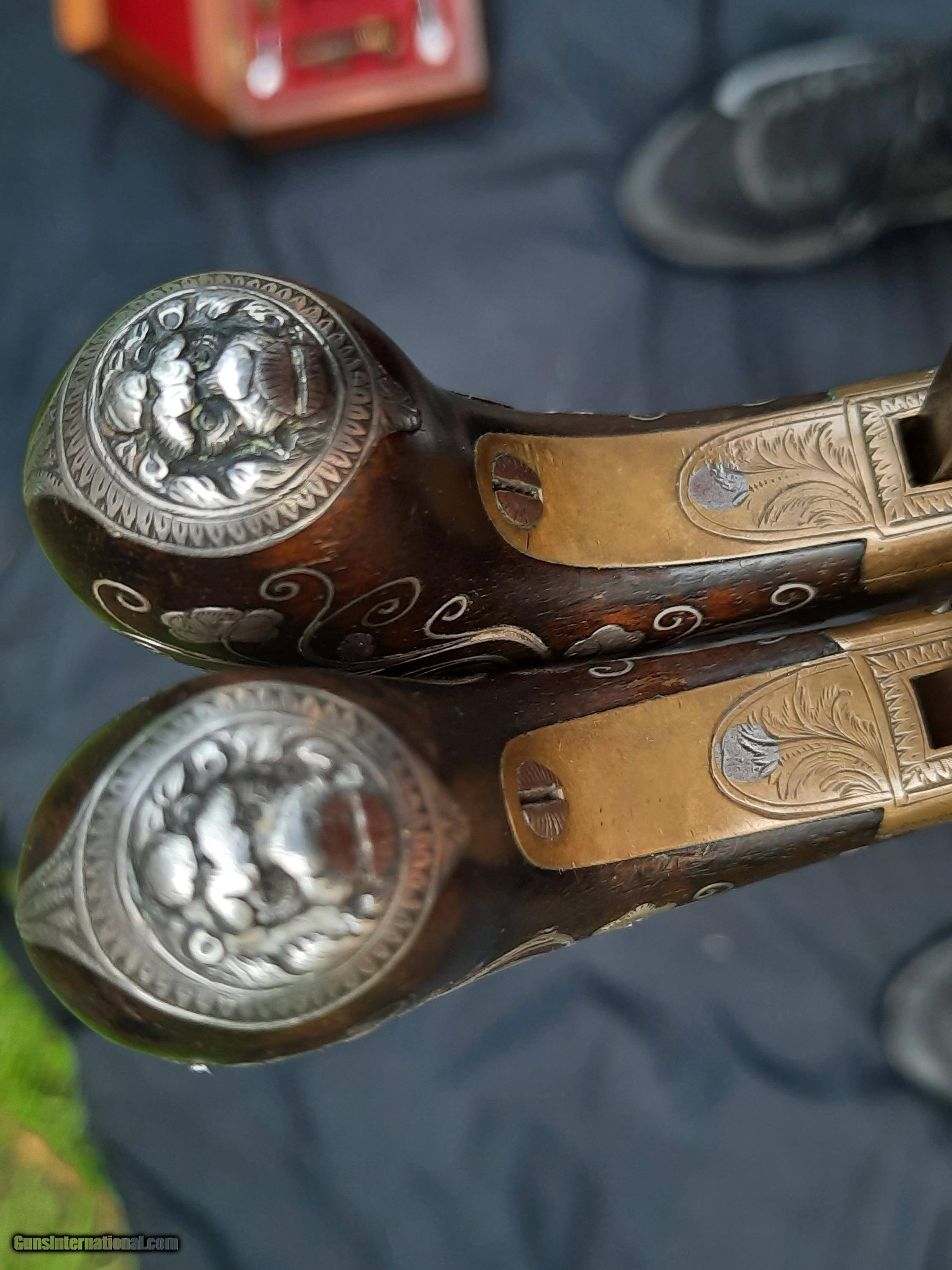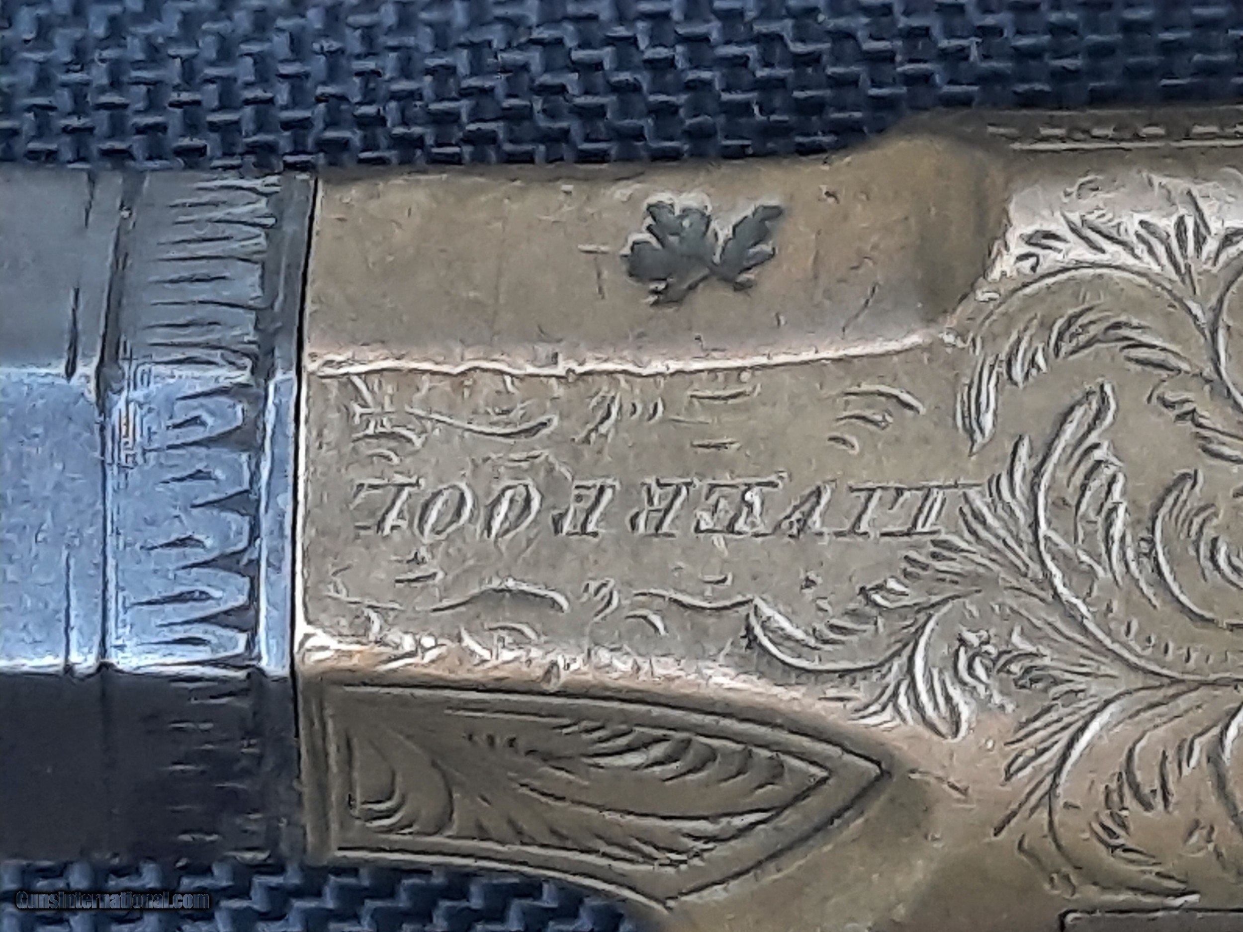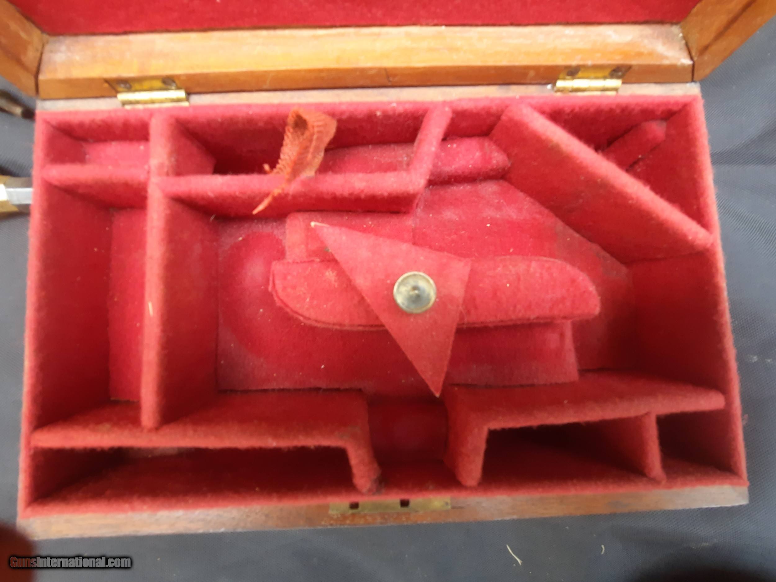 Description: I have e a beautiful original cased set of percussion pistols made by Richardson Liverpool about 1845.The matched pair have ornate silver wire inlay that is 100 percent intact.The pistols have a detailed sterling silver lion's head butt caps.The brass frames are finely engraved and the the makers name and city engraved into them.The octagon barrels unscrew with finger pressure and about 44 cal.The actions on both pistols work perfect very crisp. The trigger snaps down when in full cock position.The original case comes with the following accessories A very well made copper powder flask stamped SYKES,a dual purpose barrel wrench and mold,cap tin by R D WALKERS a brass cleaning rod with two attachments and the proper key to the case.A very attractive pair of pistols complete and all original.Shipping will be $45.00 in the lower 48 States actual cost everywhere else SOLD Antique: Yes |
