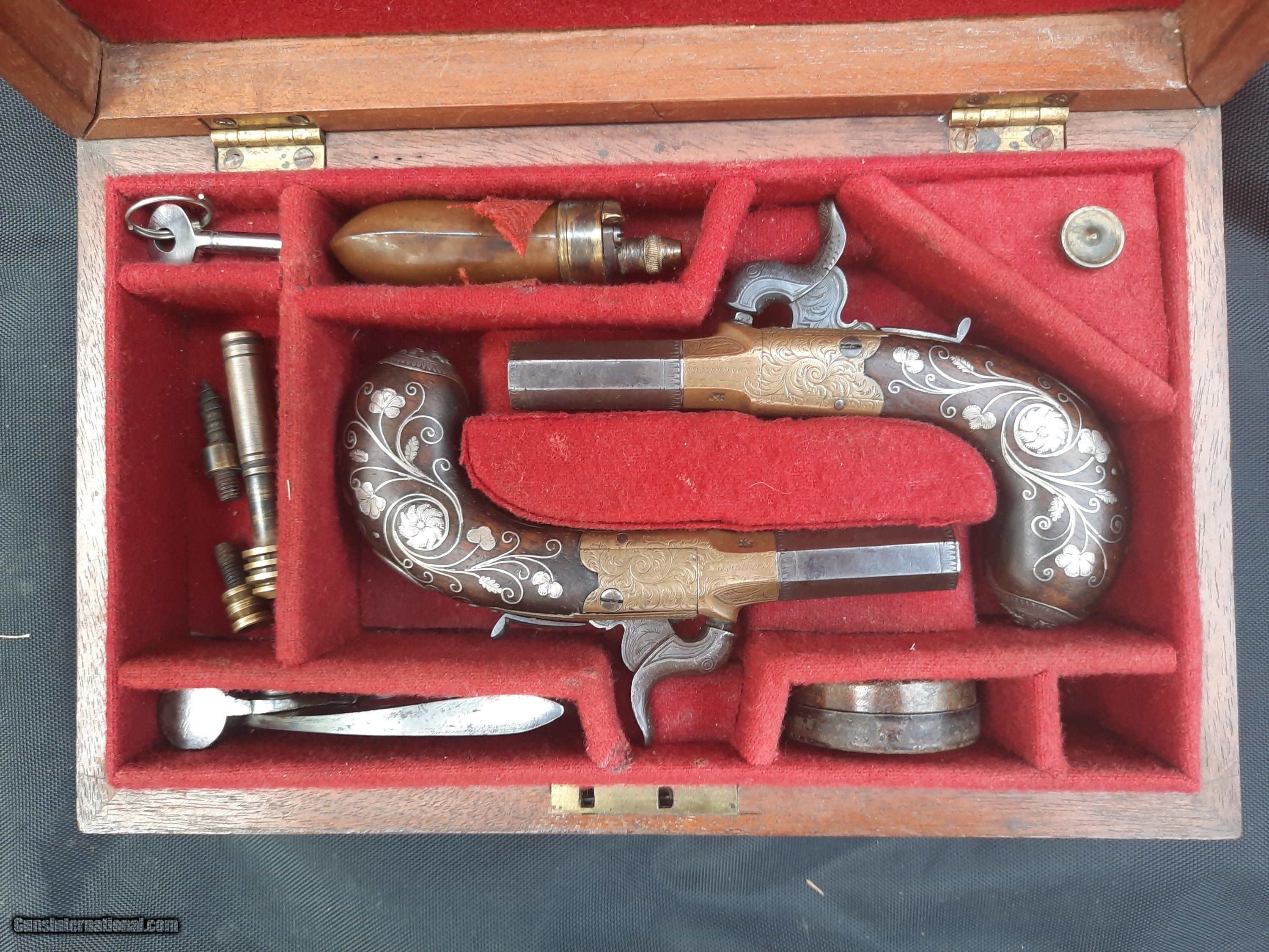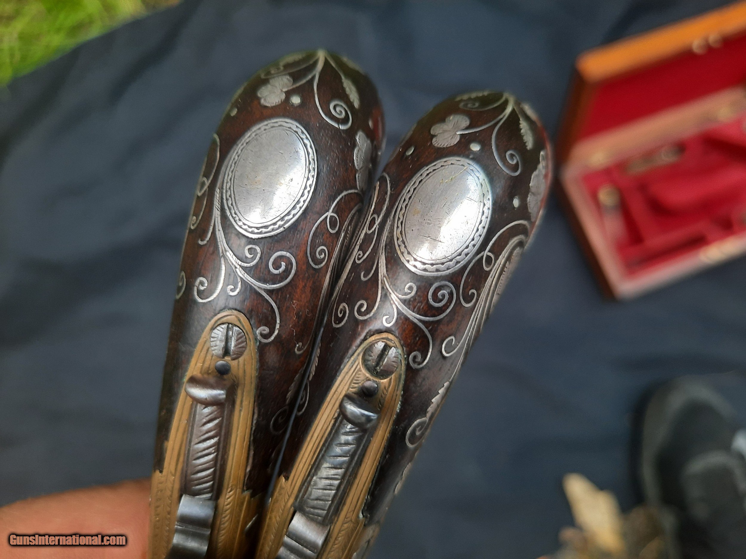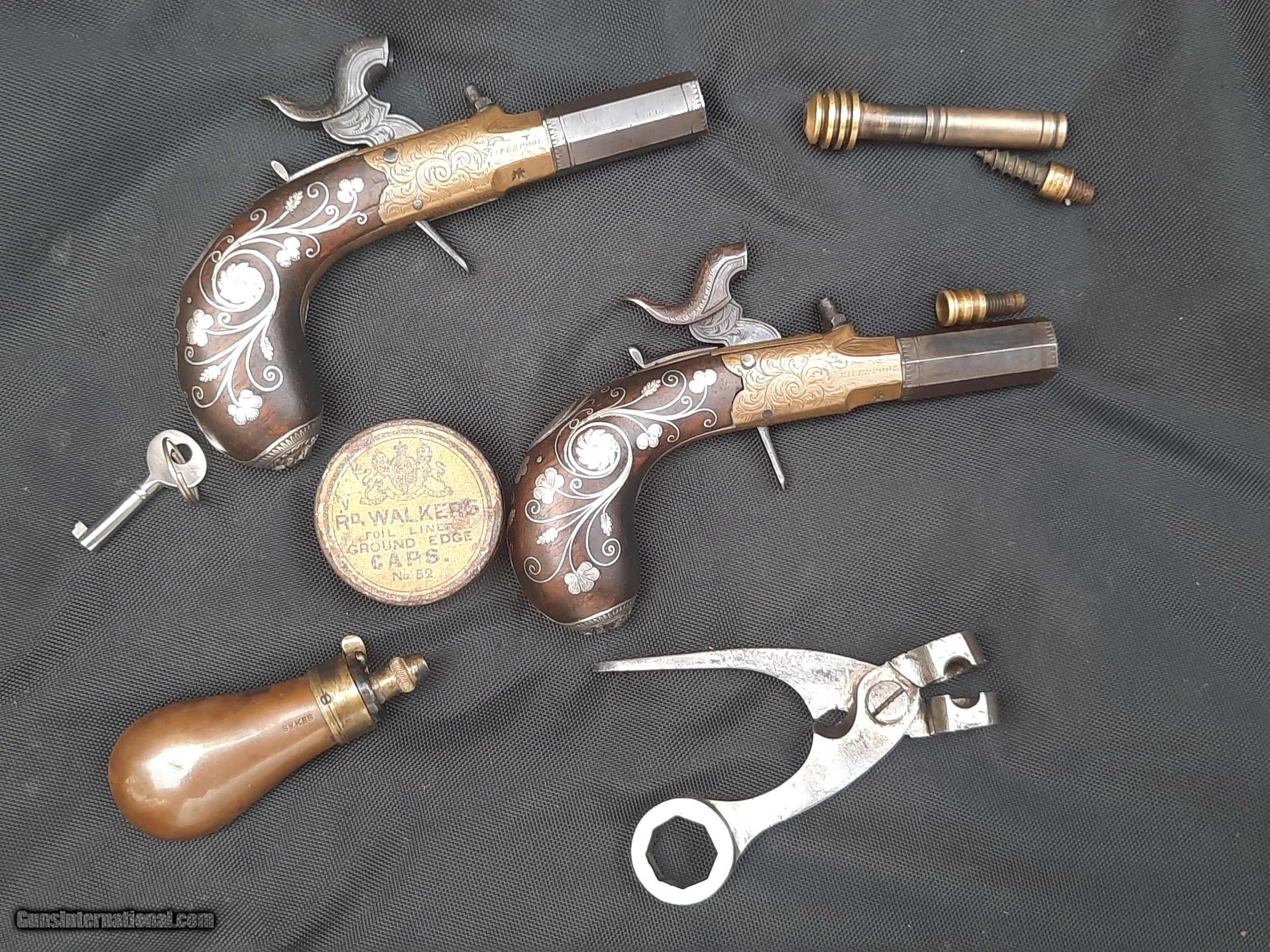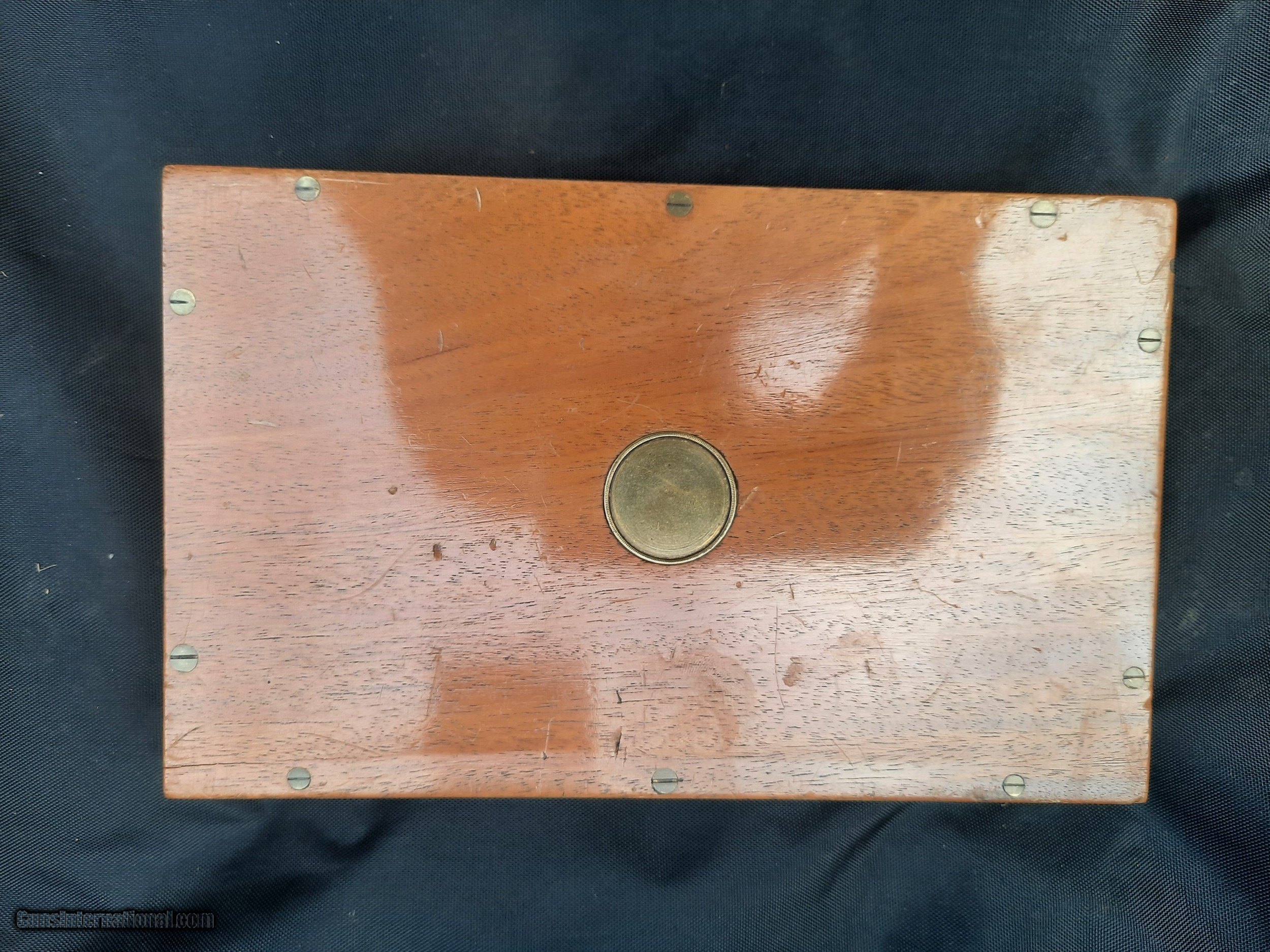 Description: I have e a beautiful original cased set of percussion pistols made by Richardson Liverpool about 1845.The matched pair have ornate silver wire inlay that is 100 percent intact.The pistols have a detailed sterling silver lion's head butt caps.The brass frames are finely engraved and the the makers name and city engraved into them.The octagon barrels unscrew with finger pressure and about 44 cal.The actions on both pistols work perfect very crisp. The trigger snaps down when in full cock position.The original case comes with the following accessories A very well made copper powder flask stamped SYKES,a dual purpose barrel wrench and mold,cap tin by R D WALKERS a brass cleaning rod with two attachments and the proper key to the case.A very attractive pair of pistols complete and all original.Shipping will be $45.00 in the lower 48 States actual cost everywhere else SOLD Antique: Yes |